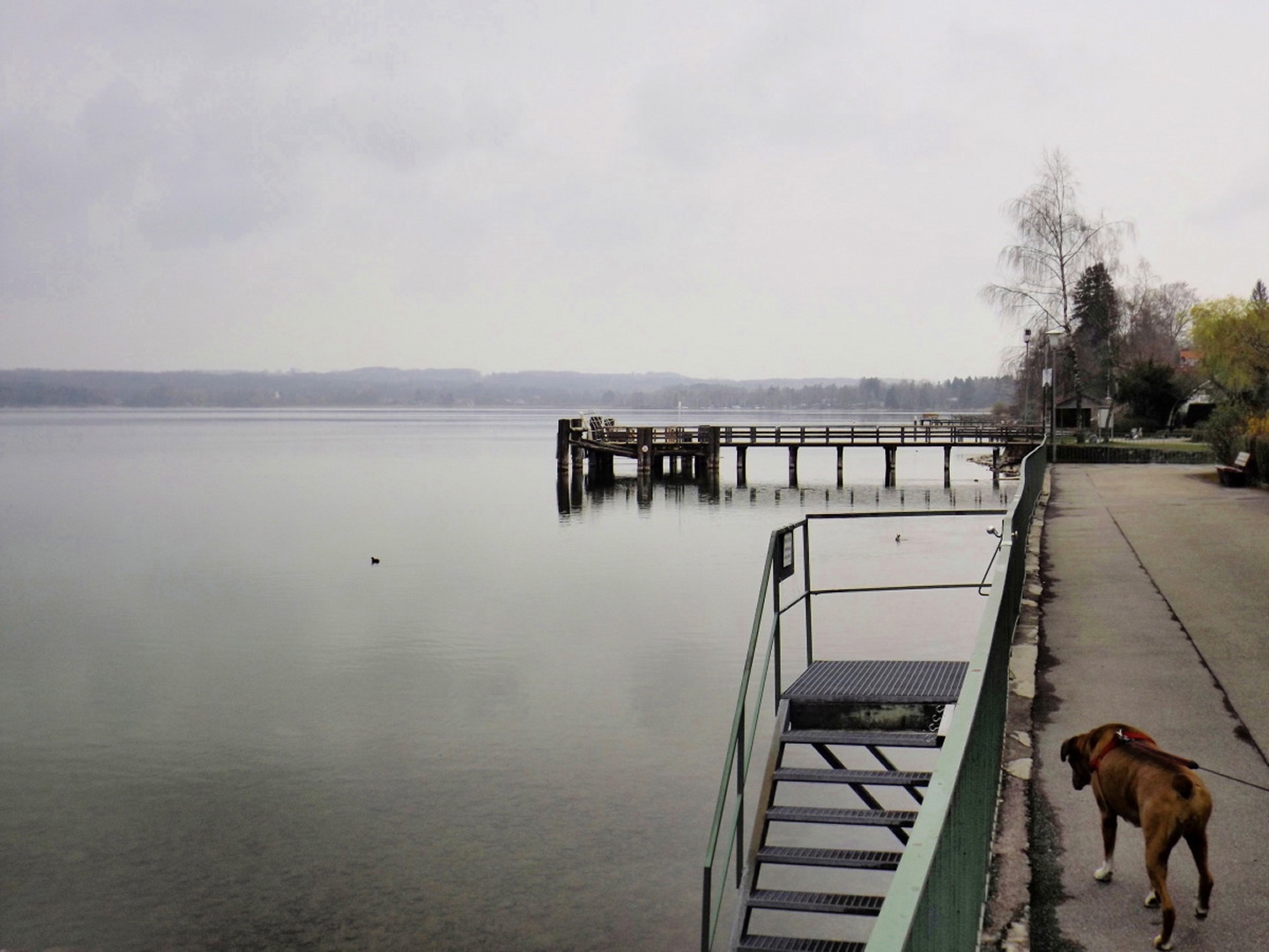 Da wir bei der Anreise etwas früher dran waren als erwartet, haben wir noch einen kleinen Abstecher nach Seeshaupt gemacht, weil wir dort auf ein Bärlauchfleckerl gehofft hatten und ich ein bisserl an den Würmsee, besser bekannt als Starnberger See, wollte. Anschließend ging es mit Madame nach Benediktbeuern, wo die Herrschaften das Kloster mit ihrer Anwesenheit beglückten und ich mit Coco etwas in die Moorlandschaft hinausging. Es war zum Glück relativ trocken, allerdings hab ich mich ziemlich verlaufen und war am Ende froh, auf dem Hinweg wieder zum Kloster zurückzufinden. Zur Abrundung des Tages fuhren wir noch nach Kochel und genehmigten uns im Grauen Bär auf der Seeterrasse einen Kaffee bzw. Grünen Tee und ein Stück Kuchen.