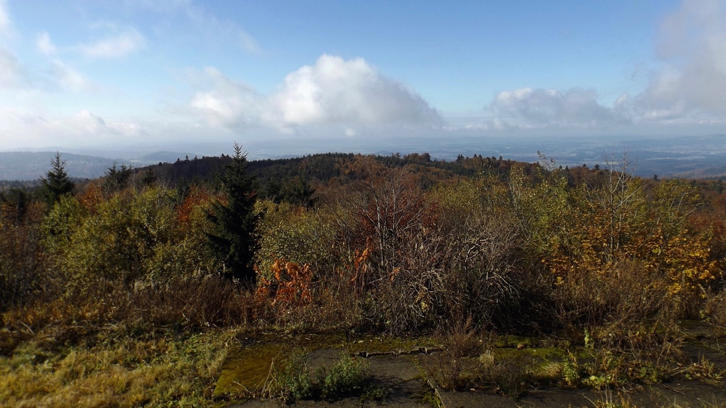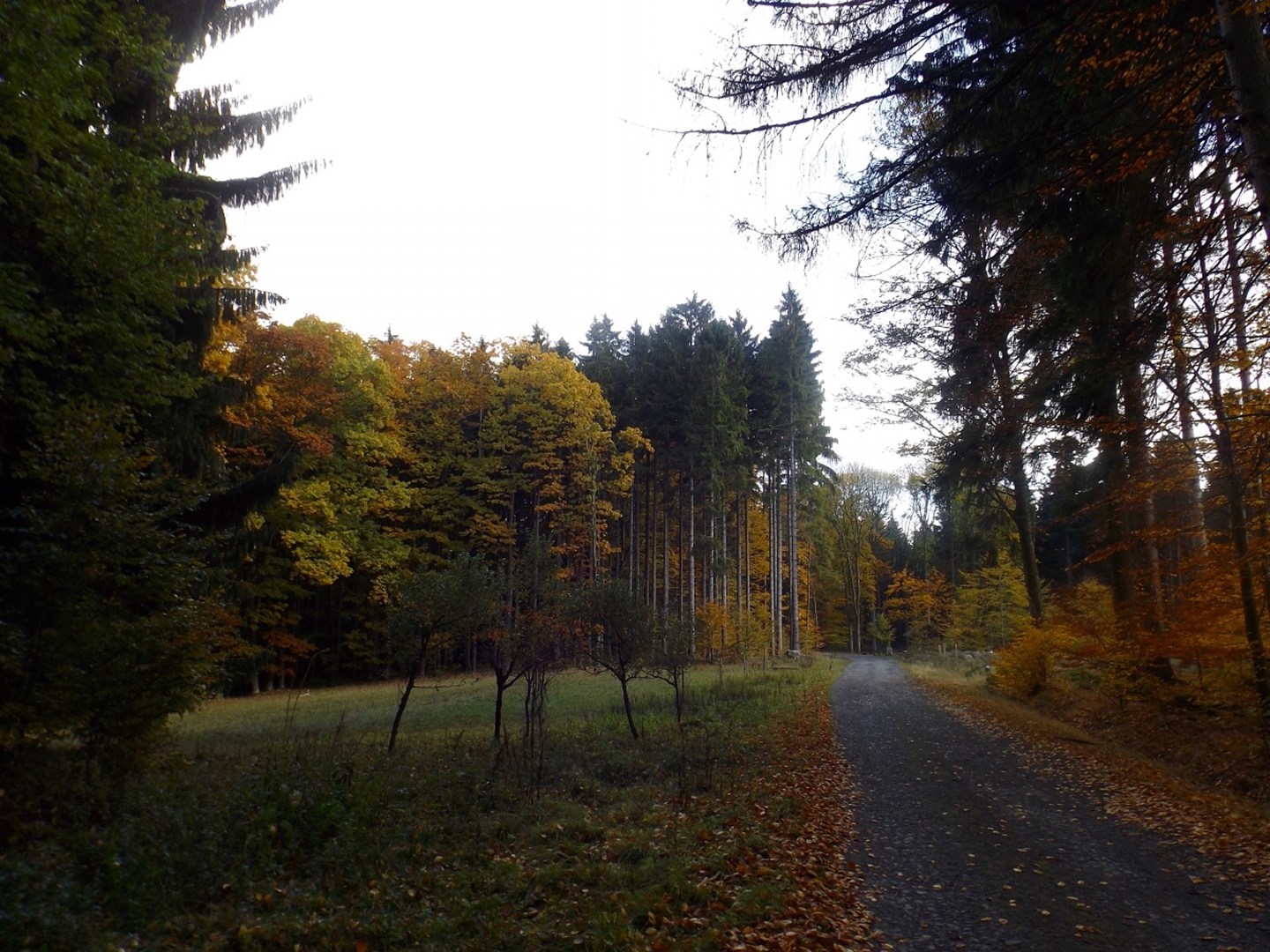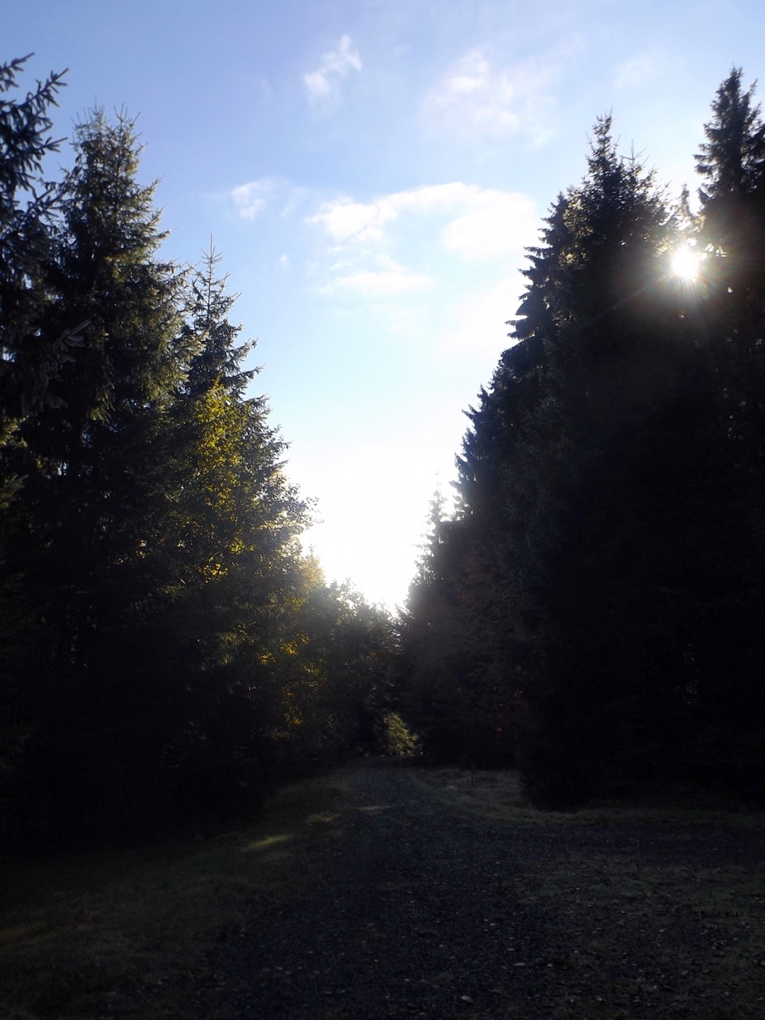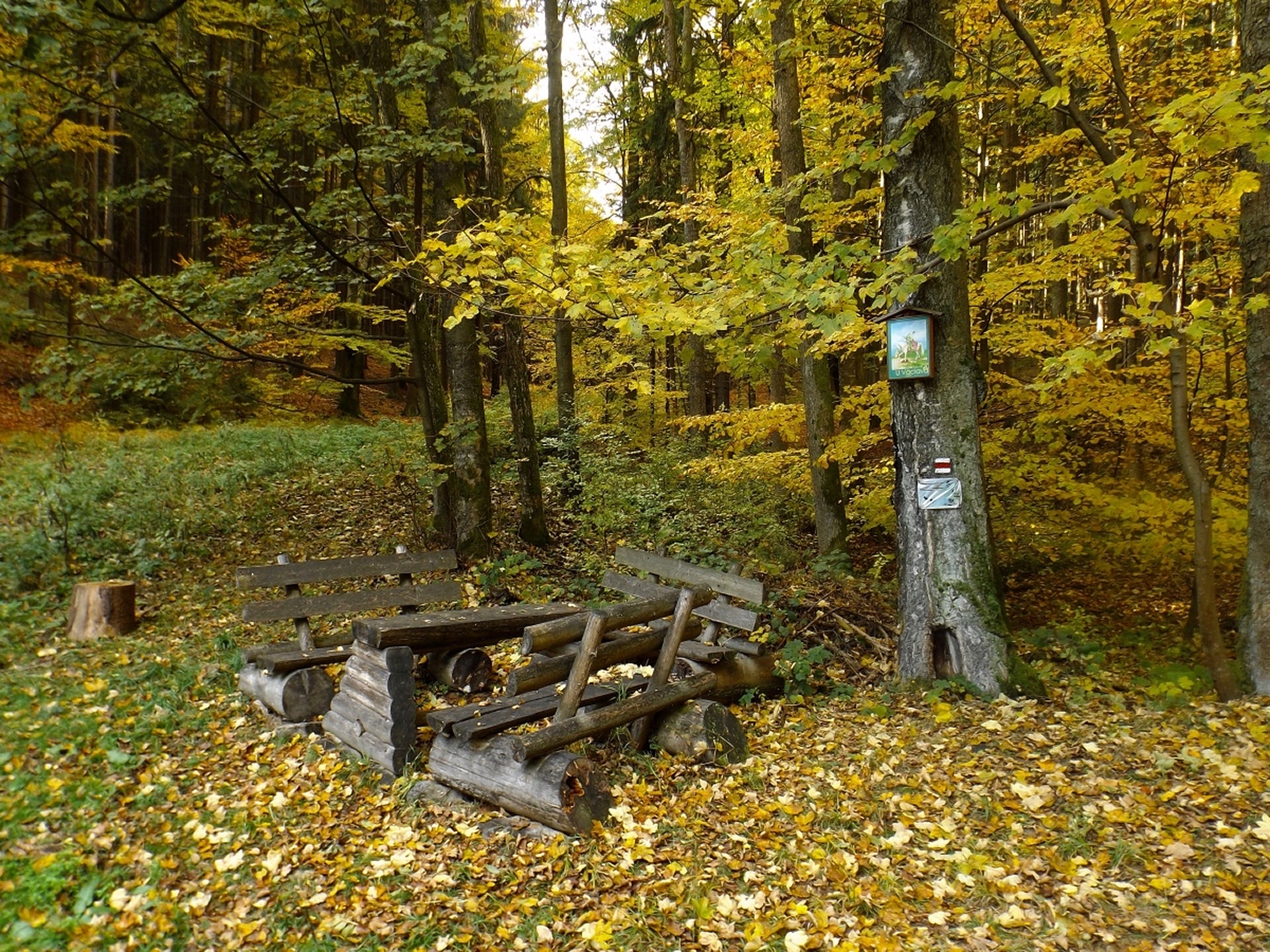Ich startete nicht beim Restaurace U Mlynáre, sondern in der Ortsmitte, weil ich damit erstens ein paar Meter Anfahrt sparen konnte und zweitens dort ein Wegweiser mit genauer Höhenangabe steht und ich so den Höhenmesser halbwegs exakt einrichten konnte. Außerdem kam ich auf die glorreiche Idee, die Runde umzudrehen, was sich als sehr sinnvoll erweisen sollte. Denn der Aufstiegsweg über die Hanová cesta ist doch etwas anspruchsvoller als die Variante über die Plzeňská cesta. Ich folgte also der gelben Markierung von der Ortsmitte hinunter zur Teplá Bystřice und dann hinauf zum Abzweig Nad Folmavou und weiter zur Česká studánka. Dieser Abschnitt ist teilweise auf Asphalt, aber auf weitaus längeren Abschnitten auf Forststraßen und am Ende auf einem angenehmen Waldsteig. An einer Gabelung muss man etwas aufpassen, weil dort der blaue Weg rechts weiterführt, während richtigerweise der gelbe Weg nach links genommen werden muss. An der Quelle rastete ich kurz und nahm das erste Birnenvierterl zu mir. Hier gibt es nämlich neben einer Überdachung für die Quelle auch ein Rastbankerl und einige nette Bräuche der Wandervereine aus Furth im Wald und Domažlice, außerdem ist die Česká studánka der Ausgangspunkt der Hanová cesta, worauf auch durch einen Stein neben dem Rastbankerl hingewiesen wird. Hatte es bis hierhin wirklich noch dauerhaft Nebel und zwischendurch sogar ein paar Minuten Nieselregen, änderte sich kurz nach der Rast das Wetter schlagartig. Es dauerte keine zwanzig Minuten und auf einmal war AKW. Kein Wölkchen über mir und nur über der Cham-Further Senke und Richtung Waldmünchen Spuren von weiß. Die Hanová cesta (deutsch Hanasteig) führt übrigens auf dem gesamten Weg bis zum Gipfel durch das Naturschutzgebiet Čerchovské Hvozdy und darf deswegen offiziell nicht verlassen werden. Stellenweise existiert sogar neben dem Weg ein Schutzzaun, um unbefugtes Betreten zu verhindern. Für mich hat es diesen nicht gebraucht, auf einem derart schönen Weg bin ich gerne geblieben. Definitiv der bisher schönste Steig auf den Čerchov, den ich gegangen bin. Eine gute Stunde nach der Quelle erreichte ich einen anderen Zaun, nämlich den immer noch bestehenden um das ehemalige Militärareal am Gipfel. Der Pfad führt hier nach rechts zum großen Einfahrtstor, welches aber heute verschlossen war. Das machte aber nicht viel, weil daneben für Fußgänger eine Lücke im Zaun ist, durch die ganz legal und ohne Hindernisse gegangen werden kann. Natürlich bedeutete das, dass weder das Bistro noch der Aussichtsturm geöffnet war, aber das war mir auch egal. Ich war ja schon mit Coco oben gewesen und so toll war die Aussicht auch wieder nicht, weil sich im Umland doch die Wolken gehalten oder aber wiedergebildet hatten. Weniger egal war die Folge meines kleinen Ausflugs auf den Gipfelstein: Ich rutschte aus und bremste mit der rechten Hand, die den Schlag an den Ellenbogen weitergab. Das Resultat war zwar „nur“ eine Bänderdehnung, aber es war etwas schmerzhaft und eben der rechte Ellenbogen. Dazu später mehr. Anschließend setzte ich mich an einen der Tische am Aussichtsturm und mampfte das Wurstbrot und ein zweites Birnenvierterl, bevor ich mich ohne weitere Verzögerung an den Abstieg machte. Dieser ging zunächst über die grüne Markierung, die etwa 5 Meter unterhalb des Endpunktes der Hanová cesta von der Fahrstraße nach rechts in den Wald abzweigt, auf einem breiten Waldweg hinunter zum Abzweig Plzeňská cesta, wo dieser Weg auf die Horizontálka trifft. Ab jetzt verläuft der restliche Abstieg auf Asphalt, was den Vorteil hat, dass mit wenig Unebenheiten zu rechnen ist, andererseits aber auch nicht das schönste Geherlebnis darstellt. Allerdings ist es möglich, noch etwa 500 Meter gleich neben der Forststraße auf der Langlaufloipe, im Sommer eine Grasschneise, weiterzugehen. Man kann diese entweder kurz vor einer Rechtsbiegung über eine winzige Spur verlassen oder ein paar Meter nach der Kurve auf einem Forstweg nach links hinübergehen. Hier zweigt auch die grüne Markierung nach Babylon ab, während ich auf dem rot markierten Weg Richtung Česká Kubice blieb. Auf diesem passierte ich die wohl an Wochenenden bewartete Hütte Zelená chýše, deren Heizung zumindest in Betrieb war und etwas weiter unten den Jubilejní hájek, von dem aber nur noch ein kleiner Nadelbaum inmitten von ihn um mindestens 100% überragenden Buchen übriggeblieben ist. Soweit ich die Erklärungstafel verstanden habe, wurde dieses Hainchen 1928 zum zehnjährigen Jubiläum der Tschechoslowakei angelegt. Vorbei an einem Rastbankerl mit Votivtafel für den heiligen Václav erreichte ich schnell die Abzweigung Česká Kubice – rozcesta, bog aber nicht auf dem blau markierten Weg nach Nad Folmavou ab, sondern erst 30 Meter später jenseits der Teplá Bystřice auf den Radweg. Auf diesem erreichte ich vorbei am Restaurace U Mlynáre wieder den Ausgangspunkt. Aufgrund der Schmerzen und vor allem des Gefühls, die rechte Hand nicht zum Essen benutzen zu können, verzichtete ich sowohl hier als auch beim Restaurace U Tomásu direkt am Ausgangspunkt auf eine Einkehr. Jetzt kam auch die Problematik des rechten Armes zu tragen: Ich konnte mangels Kraft im Arm weder Rückwärtsgang noch ersten oder fünften Gang einlegen und musste mich deshalb auf der Heimfahrt jedes Mal verrenken, um das mit der linken Hand zu bewerkstelligen. Deshalb verzichtete ich nach dem Tankstopp bei ONO in Havlovice auch auf den eigentlich angedachten Oblatenkauf im Grenzshop in Lískova und fuhr direkt nach Hause. Dabei stellte ich überrascht fest, dass es über Waldmünchen 13 Kilometer kürzer zur ONO-Tankstelle (und damit auch nach Domažlice) ist als über Cham und Furth im Wald.