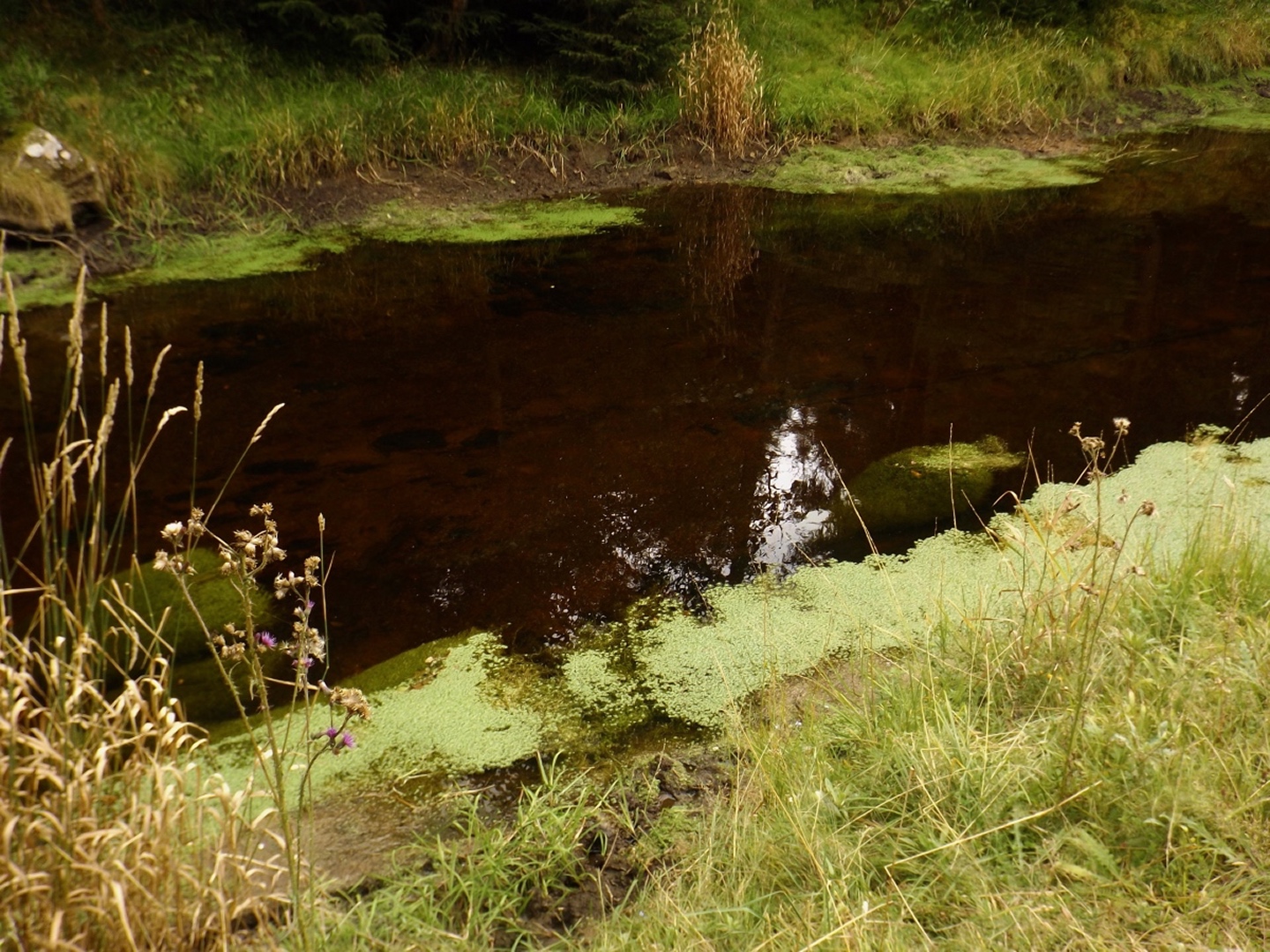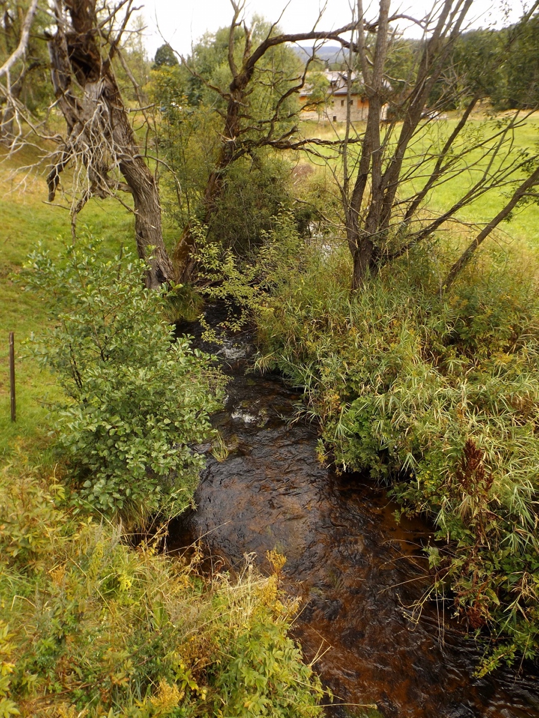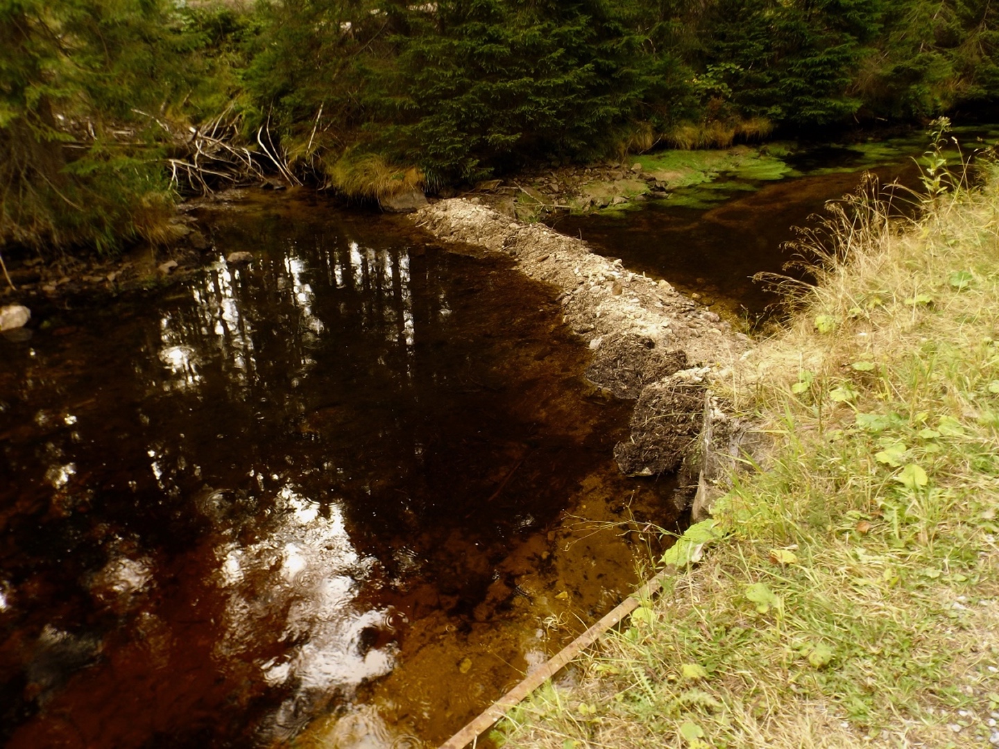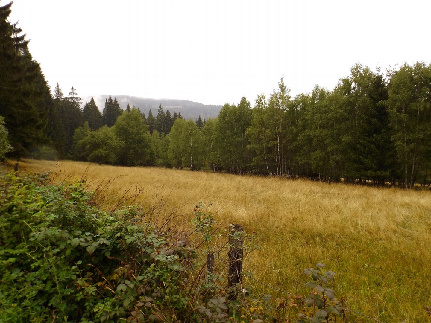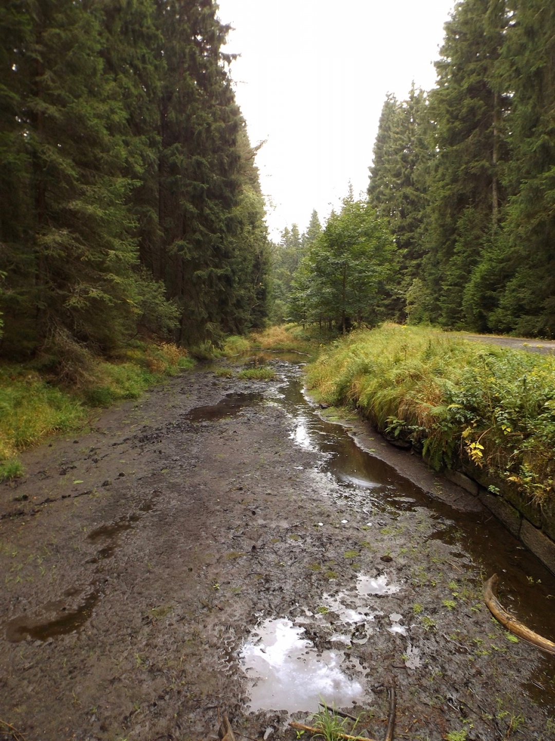 Manchmal laufen Sachen ziemlich entgegengesetzt zum Plan. Etwa so war es auch heute. Die Anfahrt nach Prášily verlief ja noch relativ normal bis positiv, mal davon abgesehen, dass ich im Nationalparkzentrum in Bayerisch Eisenstein wieder keinen tschechischen Mitarbeiter antraf und mir der sehr nette bayerische Ranger auch nicht sagen konnte, wie im Narodní park Šumava die Wegegebotsregeln genau sind. Dafür fand ich in Alžbětín eine tschechische Wechselstube, die deutlich seriöser aussieht als die beiden Asiaten, bei denen ich letztes Jahr war, auch wenn der Kurs dort deutlich schlechter ist als bei Kaufland oder TESCO. Das Wetter schien mich ebenfalls zu verarschen, während ich in Schwandorf bei AKW losfuhr, begann es in Bad Kötzting zu regnen, was sich bis in den Nachmittag hinein fortsetzte. Haarig wurde es dann in Prášily selbst: Die Penzion Škarda ist tatsächlich geschlossen. Nebenan bei Brücknerová wäre ein Zimmer frei gewesen, aber zum mehr als dem doppelten Preis. Nein danke. U Michala war komplett belegt, also musste ich in Srní schauen. Auf dem Weg dorthin liegt noch eine Unterkunft, aber dort war niemand anwesend. Der nächste Versuch war Mechovský dvorec am Ortseingang von Mechov, wo ich zumindest nur 520 Kronen pro Nacht mit Frühstück zahlen musste und abstieg. Vielleicht gibt es im Ortskern noch etwas günstigeres, aber sicher ist sicher, und die Unterkunft ist liebevoll eingerichtet und gut ausgestattet. Als Bonus ist Martin Leiš auch ziemlich gut drauf, er spricht zwar kein deutsch, aber ich kann ja ganz brauchbar englisch. Der ungeplante Unterkunftsort hatte außerdem zur Folge, dass sich die Reihenfolge der Touren gegenüber der Planung änderte und ich mit dem Vchynicko-Tetovský kanal bgeann. Außerdem startete ich nicht in Rokyta, sondern direkt ab der Unterkunft und hatte eben die geplante Einkehr kurz nach der Mitte.
