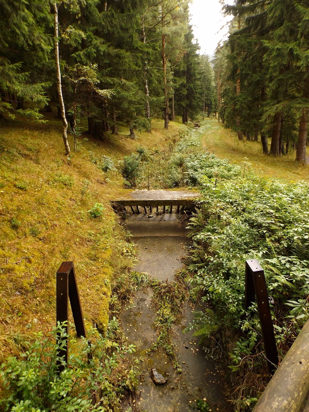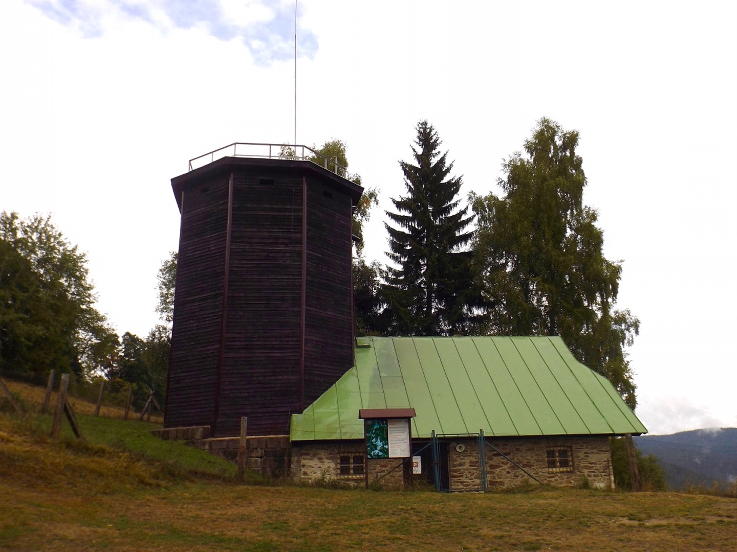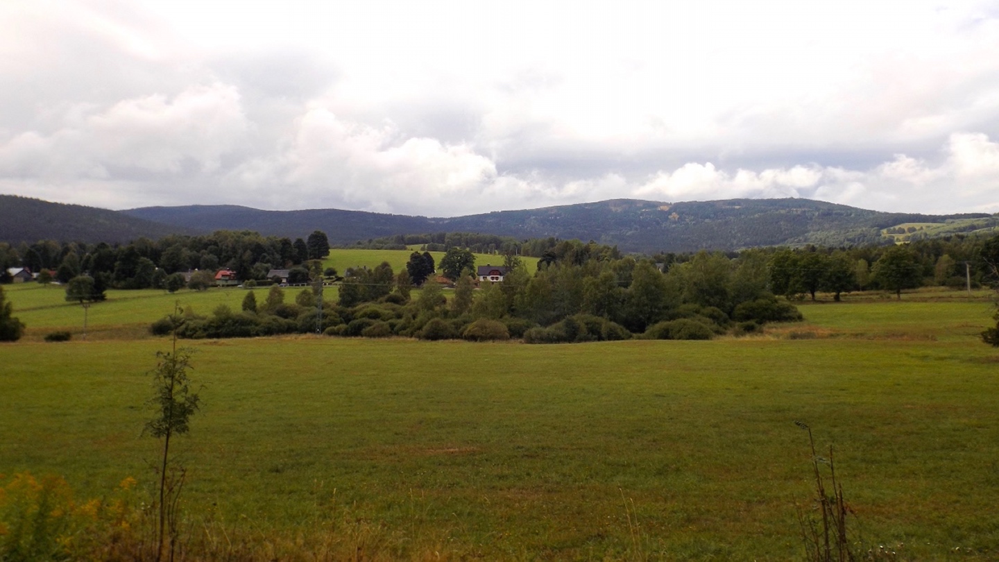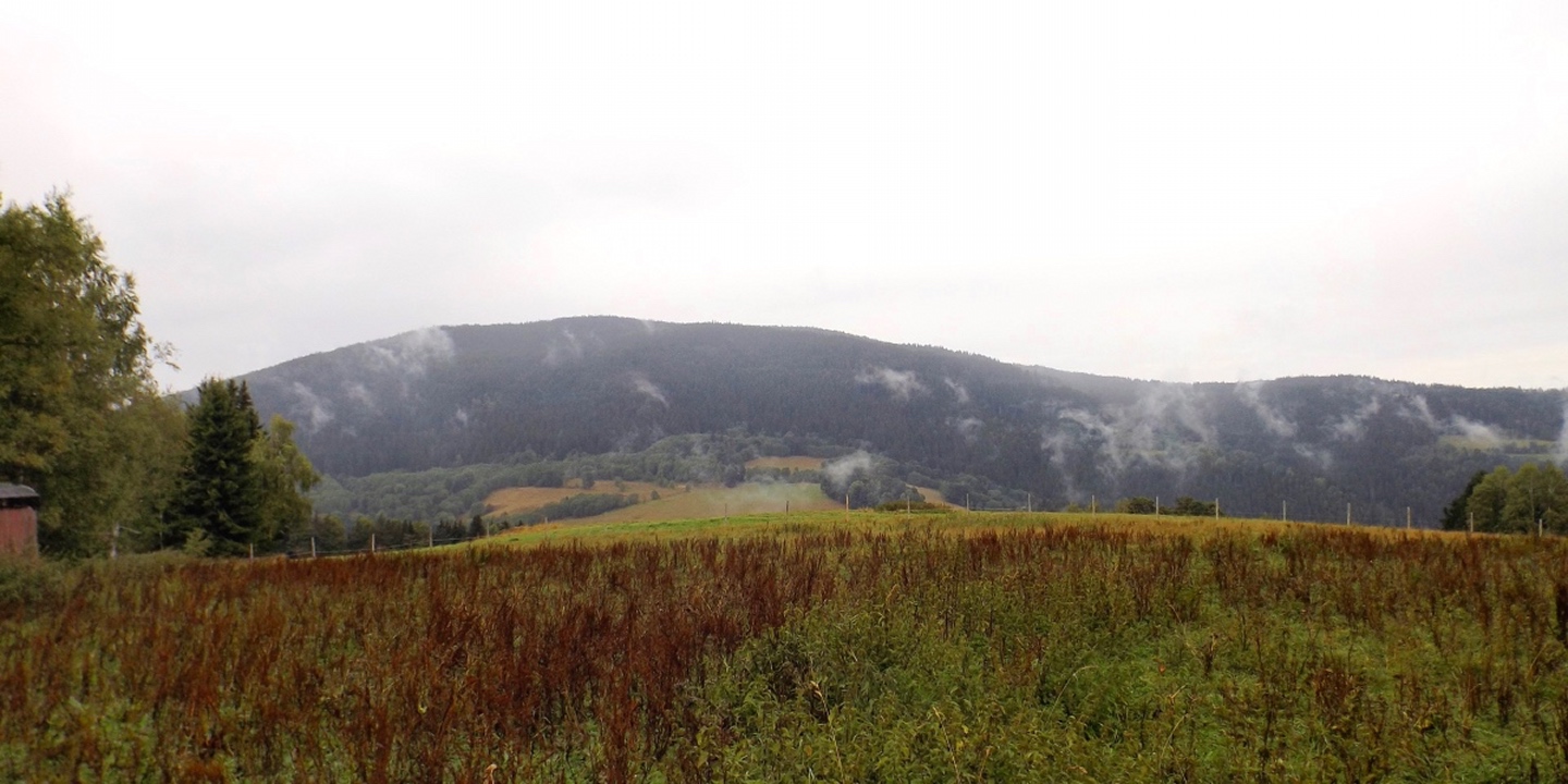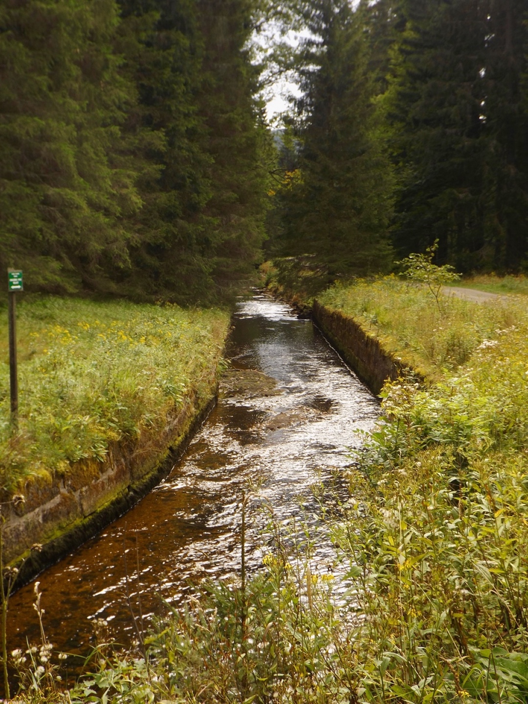 Vom Eingang der Unterkunft sind es nur etwa 50 Meter zum Parkplatz, an dem ich letztes Jahr zum Oblík gestartet war. Dieses Mal ging ich aber nicht nach Süden, sondern nach Norden, entlang des untersten Teils des Kanals, der im Gegensatz zum Vorjahr Wasser führte. Nicht viel, aber immerhin doch etwas. Die Gründe dafür sollten im Verlaufe der Runde noch klar werden. Vereinfacht gesagt folgte ich bis Srní der grünen Markierung. Diese verläuft erst einmal minimal abschüssig auf einer Forststraße neben dem Kanal, der je nach Bächen von oben oder nach unten mehr oder weniger Wasser führt. Beim Wegweiser U Sedla macht der Kanal einen Knick und führt steil hinunter zur Křemelná, während der Weg fast in einer Spitzkehre hinauf zum übriggebliebenen Teil der ehemaligen Gemeinde Sedlo hinaufzieht. Hier wird gerade ein altes Bauernhaus aufwändig saniert, mal sehen, was da in zwei, drei Jahren herauskommt. Außerdem gibt es hier einige stattliche Bäume der verschiedensten Sorten, bei besserem Wetter definitiv lohnende Fotomotive. Ich habe es natürlich auch trotz Regen versucht, aber die Ergebnisse sind bestenfalls mittelprächtig. Südlich der Baustelle steht ein scheinbar noch nicht bewohntes neues Bauernhaus in Holzbauweise, kann sich sehen lassen. Gleich dahinter biegt der Wanderweg links ab Richtung Vodný zámek, während die Radfahrer auf dem Fahrweg direkt zum Speichersee hinauffahren. Jetzt windet sich der Wanderweg entlang des Nordhanges des Sedelský vrch durch den Wald nach oben, ohne dabei ausgesprochen steil zu sein. Am Waldrand zweigt ein Steig ab zur Klostermannova vyhlídka, von der aus man theoretisch einige Größen jenseits der Vydra sehen kann, wenn sie sich nicht gerade hinter Regenwolken verstecken. Als extrafieser Akt der Verarschung hörte es genau in dem Moment auf zu regnen und der Nebel stieg etwas an, aber freie Sicht sieht immer noch anders aus. Vom Aussichtspunkt aus führt ein unmarkierten Pfad geradeaus weiter und mündet wohl am Wasserschloss wieder in der markierten Weg, ich ging aber brav zurück zum Abzweig und entlang des Osthanges dorthin, denn genau das ist die Übersetzung des Begriffs Vodný zámek. Mit einem Schloss hat der Bau allerdings wenig zu tun, es ist halt ein Betriebsgebäude des Elektrizitätswerks, das aus einem Turm und einem Anbau besteht. Auch hier dürfte die Aussicht bei schönem Wetter ziemlich ordentlich sein. 500 Meter weiter westlich erreichte ich den Speicherteich, in den das Wasser aus dem Kanal normalerweise gepumpt wird, aber er war trotz des vorangegangenen Schnürlregens absolut leer. Das hatte auch einen guten Grund, denn die Bretter in der südwestlichen Ecke sehen deutlich nach Baustelle aus. Deswegen also auch das Wasser in dem Abschnitt, der letztes Jahr total trocken war, weil alles hier raufgepumpt wurde. Hier machte ein Labrador leichte Avancen, die ich freudig erwidert hätte, wenn es Herrchen zugelassen hätte. Außerdem schob ich hier meine Stöcke zusammen und befestigte sie am Rucksack, weil die nächsten Kilometer auf Asphalt verliefen. Zunächst ging es hinunter nach Srní, vorbei am Hotel Vydra, dessen Speisekarte auch ganz ordentlich aussah, und am Eingang zu einem scheinbar ganz neu angelegten Wolfslehrpfad. Zumindest ist er noch nicht in mapy.cz verzeichnet. Aus diesem Grund verschob ich eine Erkundung auf einen späteren Termin und ging auf der geplanten Route weiter. Ebenso neu ist auch ein Wolfsgehege bei Horní Hrádky, zu dem man vom Klostermann-Lehrpfad aus gehen kann, was ich ebenfalls auf einen späteren Termin verschob. Im Ortszentrum von Srní wird die Markierung gelb und folgt erst einmal der Straße nach Modrava. Nach knapp einem Kilometer zweigt sie nach links in den Wald ab, also wurden die Stöcke wieder ausgefahren und eingesetzt. Der Waldweg ist zwar nicht lang, das folgende Teerstück bis Horní Hrádky aber auch nicht, und danach geht der Klostermann-Lehrpfad im Wald weiter. Hier wird auf insgesamt fünf zweisprachigen Schautafeln vieles über den in der Umgebung von Srní aufgewachsenen Heimatdichter beschrieben. Ein Bauernhof am Weg gehörte seiner Tante, etwas später führt ein kleiner Pfad zu einem Aussichtspunkt, an dem er sich gerne aufgehalten hatte. Heute ist die Aussicht ziemlich mittelprächtig, weil zugewachsen. Diese Tatsache störte deutlich mehr als die Wolken, und das heißt etwas. Jetzt war es nicht mehr weit nach Rokyta, wo gleich nach der Einmündung des Pfades in die Straße auf der linken Seite die Penzion Svata Florian mit Restaurace steht und auch geöffnet hatte. Wenigstens eine Sache, die nach Plan klappte. Hier wurde ich erneut von einem Hund und später auch von einer Katze hofiert, wobei letztere eher den Eindruck machte, dass sie nur etwas von meinem Essen haben wollte. Dieses war exzellent, ein Böhmerwälder Kartoffelauflauf mit Hühnerfleisch, Zwiebeln und natürlich Käse. Der kleine Negativpunkt war nur, dass es kein Černé pivo gab. Gut gestärkt marschierte ich eine knappe Stunde später wieder los, zunächst zur Nationalparkinfostelle mit der Absicht, endlich herauszufinden, wann ich wo welchen nicht markierten Weg gehen darf. Es standen auch Autos vor dem Haus, also könnte es klappen. Klarer Fall von Denkste, es war eine Dienstbesprechung und die Infostelle den ganzen Tag geschlossen. Also beschränkte ich mich notgedrungen auf ein paar Fotos von der geologischen Ausstellung vor dem Haus und machte mich auf den Weg zum Kanal, dem ich effektiv bis zum Parkplatz bei der Unterkunft folgte. Langweilig war es dabei allerdings nicht, denn der Kanal hat neben verschiedenen Infotafeln (wieder dankenswerterweise zweisprachig) zu seiner Geschichte und seiner Funktion noch einige kleine Dinge zu bieten, die auf jeden Fall erwähnenswert sind. Beispielsweise ist ein Abschnitt zwischen Schätzův les und Hakešická cesta etwas steiler, also statt 8 Promille knapp 2 Prozent Gefälle, und deswegen mit Betonplatten abgedeckt. Ob dies erst zur Sicherhei