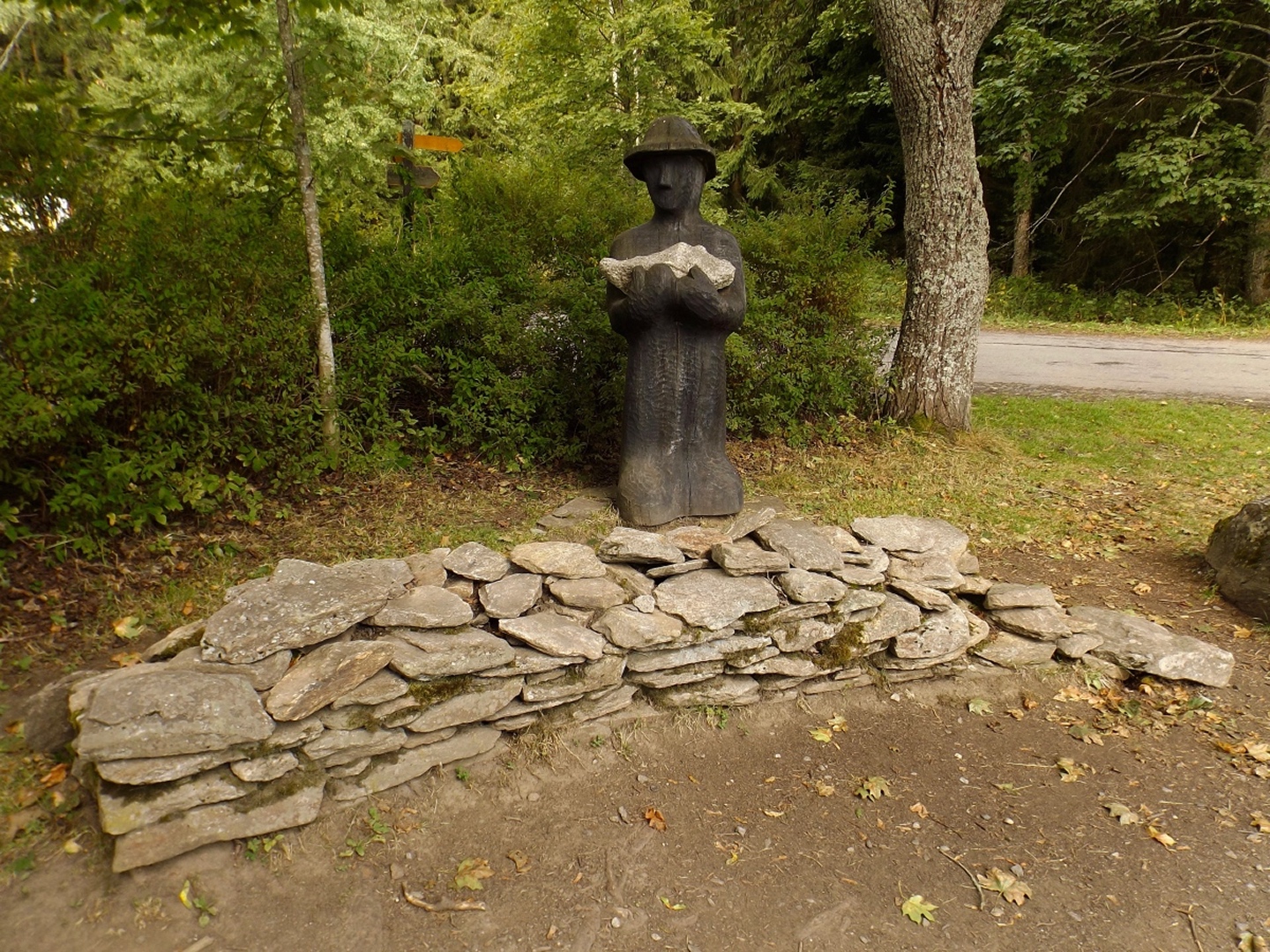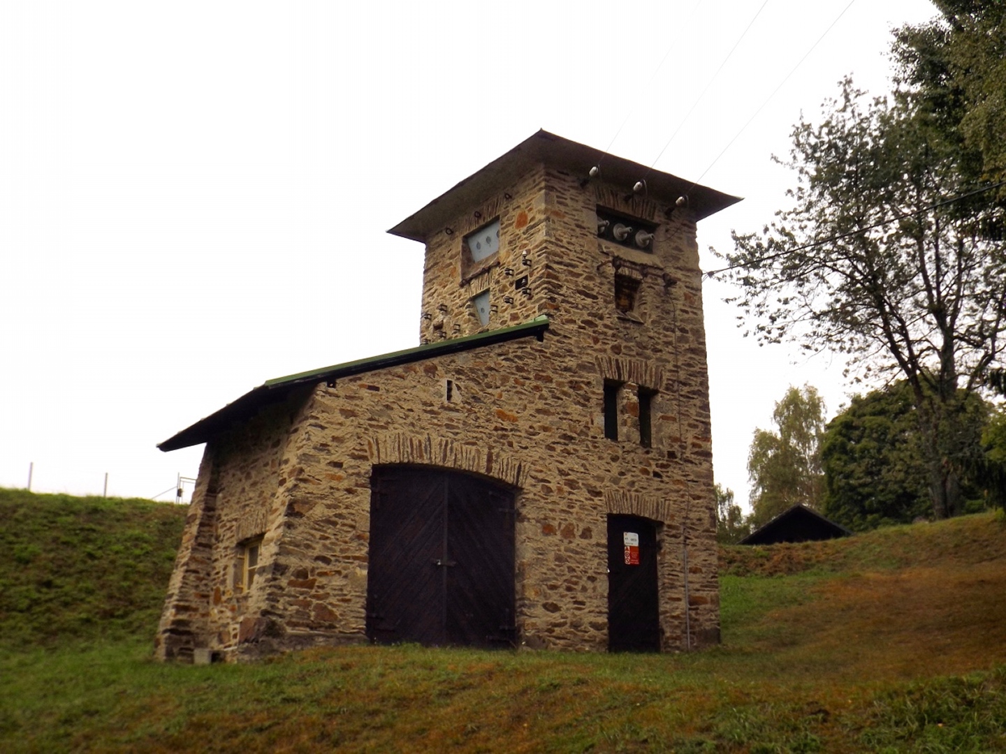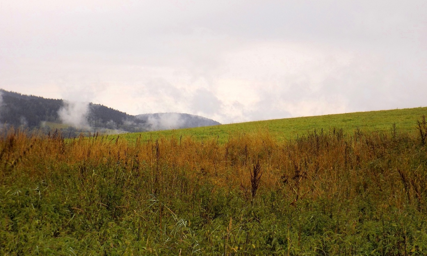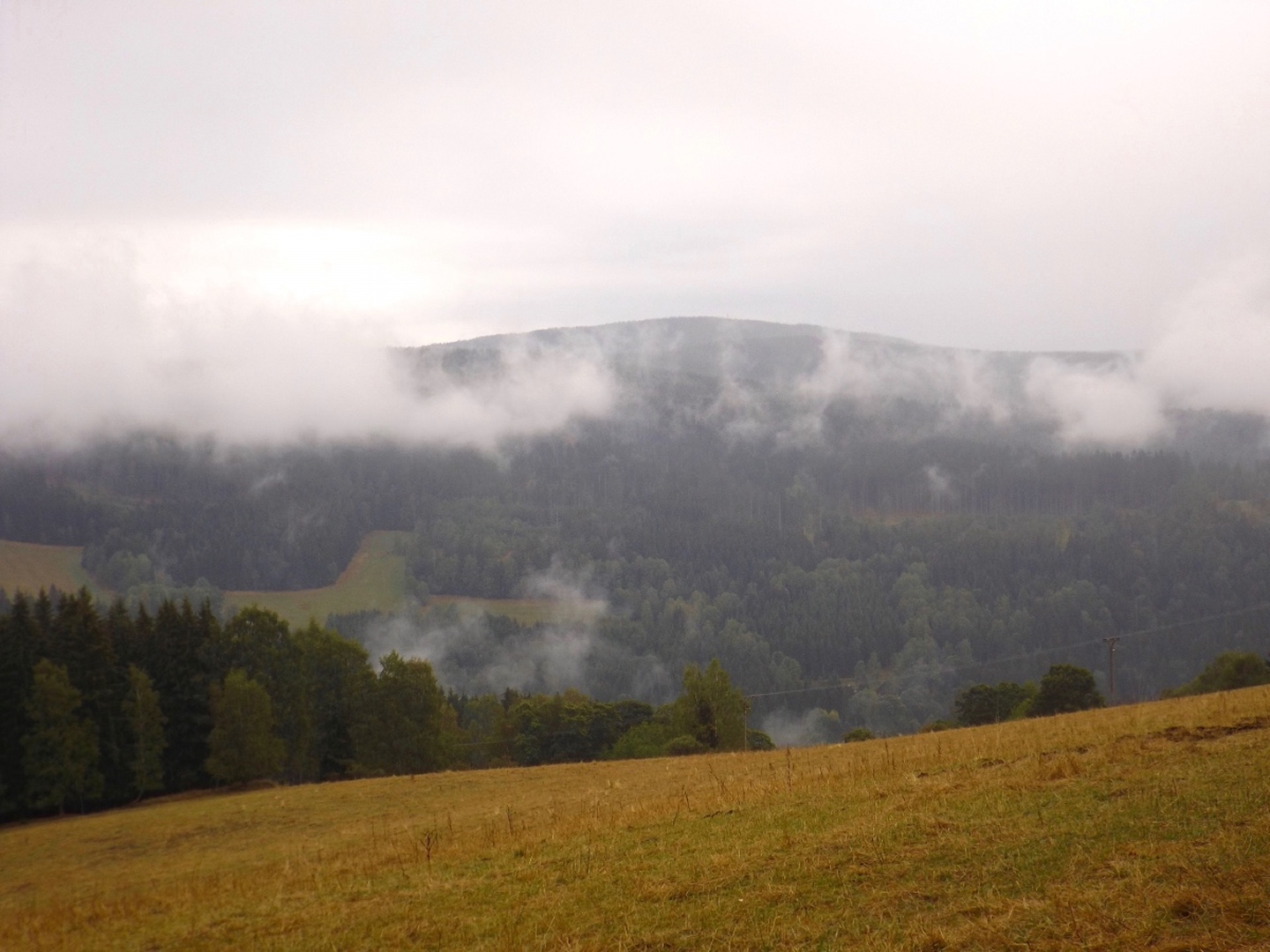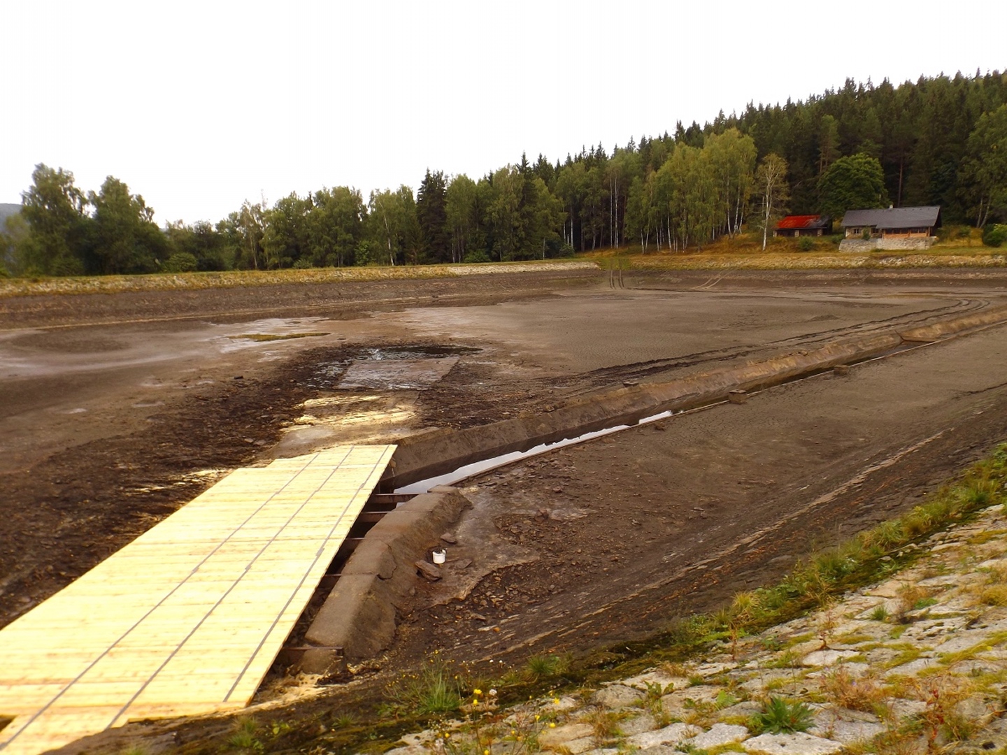 Vom Eingang der Unterkunft sind es nur etwa 50 Meter zum Parkplatz, an dem ich letztes Jahr zum Oblík gestartet war. Dieses Mal ging ich aber nicht nach Süden, sondern nach Norden, entlang des untersten Teils des Kanals, der im Gegensatz zum Vorjahr Wasser führte. Nicht viel, aber immerhin doch etwas. Die Gründe dafür sollten im Verlaufe der Runde noch klar werden. Vereinfacht gesagt folgte ich bis Srní der grünen Markierung. Diese verläuft erst einmal minimal abschüssig auf einer Forststraße neben dem Kanal, der je nach Bächen von oben oder nach unten mehr oder weniger Wasser führt. Beim Wegweiser U Sedla macht der Kanal einen Knick und führt steil hinunter zur Křemelná, während der Weg fast in einer Spitzkehre hinauf zum übriggebliebenen Teil der ehemaligen Gemeinde Sedlo hinaufzieht. Hier wird gerade ein altes Bauernhaus aufwändig saniert, mal sehen, was da in zwei, drei Jahren herauskommt. Außerdem gibt es hier einige stattliche Bäume der verschiedensten Sorten, bei besserem Wetter definitiv lohnende Fotomotive. Ich habe es natürlich auch trotz Regen versucht, aber die Ergebnisse sind bestenfalls mittelprächtig. Südlich der Baustelle steht ein scheinbar noch nicht bewohntes neues Bauernhaus in Holzbauweise, kann sich sehen lassen. Gleich dahinter biegt der Wanderweg links ab Richtung Vodný zámek, während die Radfahrer auf dem Fahrweg direkt zum Speichersee hinauffahren. Jetzt windet sich der Wanderweg entlang des Nordhanges des Sedelský vrch durch den Wald nach oben, ohne dabei ausgesprochen steil zu sein. Am Waldrand zweigt ein Steig ab zur Klostermannova vyhlídka, von der aus man theoretisch einige Größen jenseits der Vydra sehen kann, wenn sie sich nicht gerade hinter Regenwolken verstecken. Als extrafieser Akt der Verarschung hörte es genau in dem Moment auf zu regnen und der Nebel stieg etwas an, aber freie Sicht sieht immer noch anders aus. Vom Aussichtspunkt aus führt ein unmarkierten Pfad geradeaus weiter und mündet wohl am Wasserschloss wieder in der markierten Weg, ich ging aber brav zurück zum Abzweig und entlang des Osthanges dorthin, denn genau das ist die Übersetzung des Begriffs Vodný zámek. Mit einem Schloss hat der Bau allerdings wenig zu tun, es ist halt ein Betriebsgebäude des Elektrizitätswerks, das aus einem Turm und einem Anbau besteht. Auch hier dürfte die Aussicht bei schönem Wetter ziemlich ordentlich sein. 500 Meter weiter westlich erreichte ich den Speicherteich, in den das Wasser aus dem Kanal normalerweise gepumpt wird, aber er war trotz des vorangegangenen Schnürlregens absolut leer. Das hatte auch einen guten Grund, denn die Bretter in der südwestlichen Ecke sehen deutlich nach Baustelle aus. Deswegen also auch das Wasser in dem Abschnitt, der letztes Jahr total trocken war, weil alles hier raufgepumpt wurde. Hier machte ein Labrador leichte Avancen, die ich freudig erwidert hätte, wenn es Herrchen zugelassen hätte. Außerdem schob ich hier meine Stöcke zusammen und befestigte sie am Rucksack, weil die nächsten Kilometer auf Asphalt verliefen. Zunächst ging es hinunter nach Srní, vorbei am Hotel Vydra, dessen Speisekarte auch ganz ordentlich aussah, und am Eingang zu einem scheinbar ganz neu angelegten Wolfslehrpfad. Zumindest ist er noch nicht in mapy.cz verzeichnet. Aus diesem Grund verschob ich eine Erkundung auf einen späteren Termin und ging auf der geplanten Route weiter. Ebenso neu ist auch ein Wolfsgehege bei Horní Hrádky, zu dem man vom Klostermann-Lehrpfad aus gehen kann, was ich ebenfalls auf einen späteren Termin verschob. Im Ortszentrum von Srní wird die Markierung gelb und folgt erst einmal der Straße nach Modrava. Nach knapp einem Kilometer zweigt sie nach links in den Wald ab, also wurden die Stöcke wieder ausgefahren und eingesetzt. Der Waldweg ist zwar nicht lang, das folgende Teerstück bis Horní Hrádky aber auch nicht, und danach geht der Klostermann-Lehrpfad im Wald weiter. Hier wird auf insgesamt fünf zweisprachigen Schautafeln vieles über den in der Umgebung von Srní aufgewachsenen Heimatdichter beschrieben. Ein Bauernhof am Weg gehörte seiner Tante, etwas später führt ein kleiner Pfad zu einem Aussichtspunkt, an dem er sich gerne aufgehalten hatte. Heute ist die Aussicht ziemlich mittelprächtig, weil zugewachsen. Diese Tatsache störte deutlich mehr als die Wolken, und das heißt etwas. Jetzt war es nicht mehr weit nach Rokyta, wo gleich nach der Einmündung des Pfades in die Straße auf der linken Seite die Penzion Svata Florian mit Restaurace steht und auch geöffnet hatte. Wenigstens eine Sache, die nach Plan klappte. Hier wurde ich erneut von einem Hund und später auch von einer Katze hofiert, wobei letztere eher den Eindruck machte, dass sie nur etwas von meinem Essen haben wollte. Dieses war exzellent, ein Böhmerwälder Kartoffelauflauf mit Hühnerfleisch, Zwiebeln und natürlich Käse. Der kleine Negativpunkt war nur, dass es kein Černé pivo gab. Gut gestärkt marschierte ich eine knappe Stunde später wieder los, zunächst zur Nationalparkinfostelle mit der Absicht, endlich herauszufinden, wann ich wo welchen nicht markierten Weg gehen darf. Es standen auch Autos vor dem Haus, also könnte es klappen. Klarer Fall von Denkste, es war eine Dienstbesprechung und die Infostelle den ganzen Tag geschlossen. Also beschränkte ich mich notgedrungen auf ein paar Fotos von der geologischen Ausstellung vor dem Haus und machte mich auf den Weg zum Kanal, dem ich effektiv bis zum Parkplatz bei der Unterkunft folgte. Langweilig war es dabei allerdings nicht, denn der Kanal hat neben verschiedenen Infotafeln (wieder dankenswerterweise zweisprachig) zu seiner Geschichte und seiner Funktion noch einige kleine Dinge zu bieten, die auf jeden Fall erwähnenswert sind. Beispielsweise ist ein Abschnitt zwischen Schätzův les und Hakešická cesta etwas steiler, also statt 8 Promille knapp 2 Prozent Gefälle, und deswegen mit Betonplatten abgedeckt. Ob dies erst zur Sicherhei