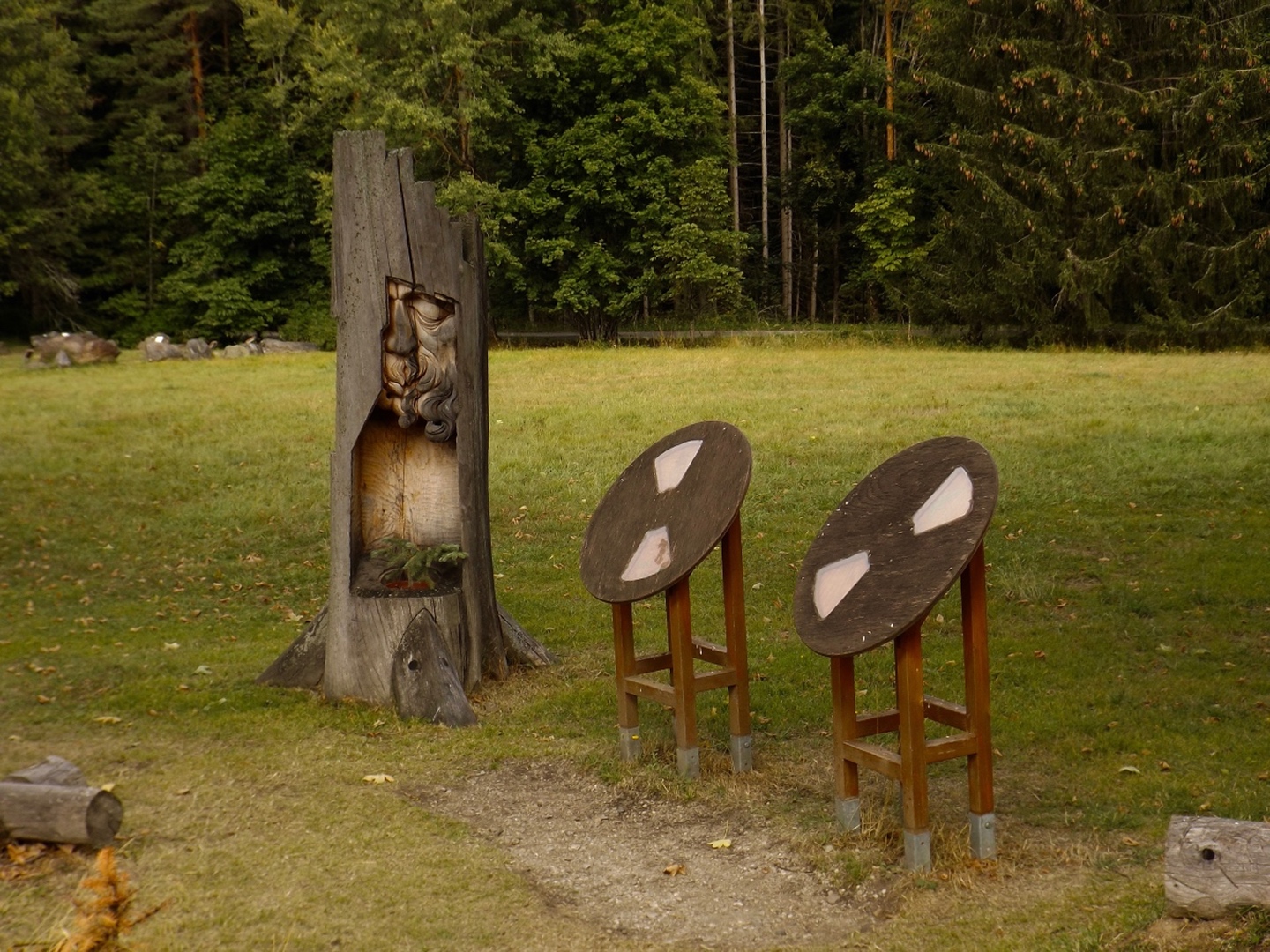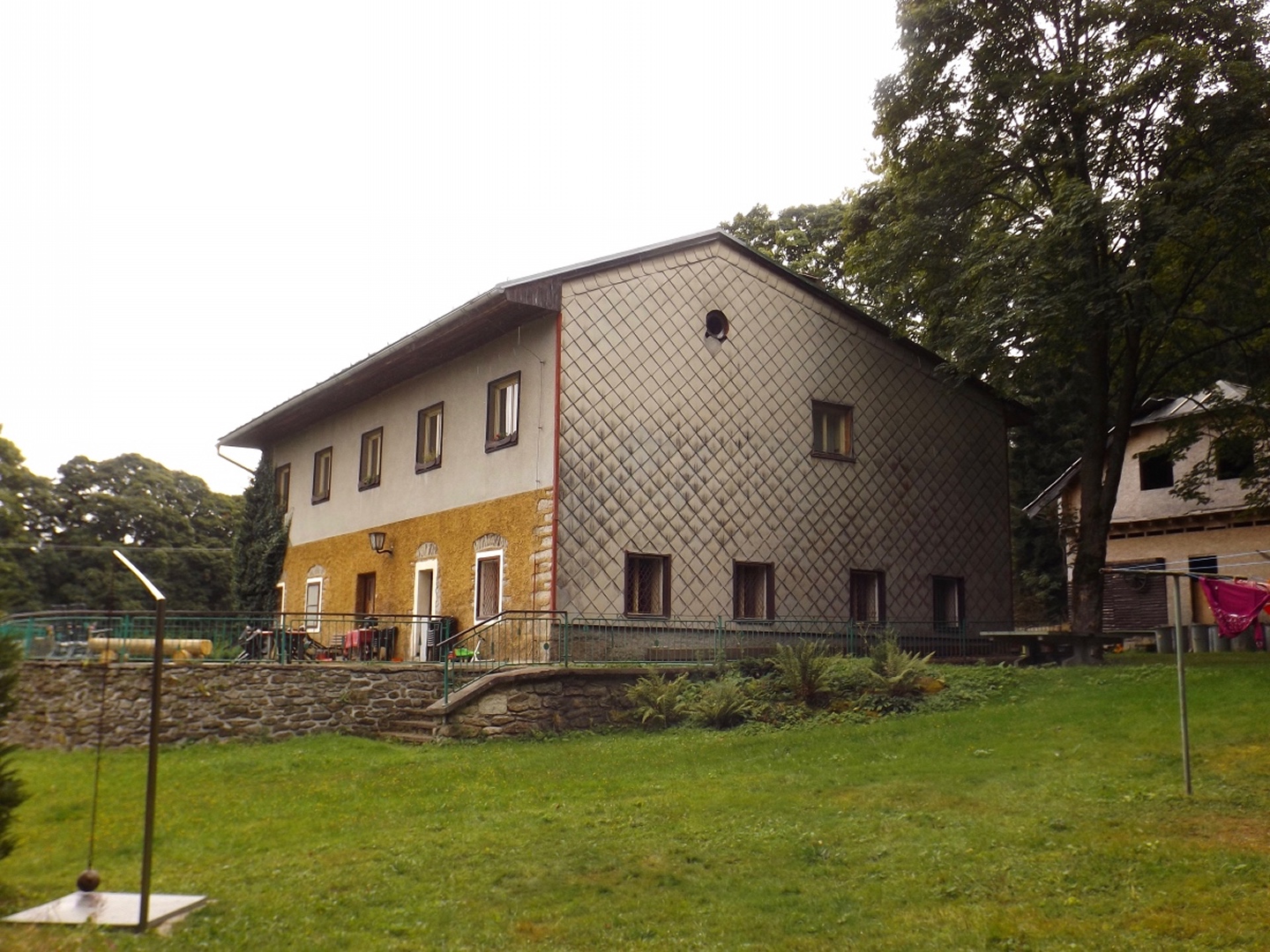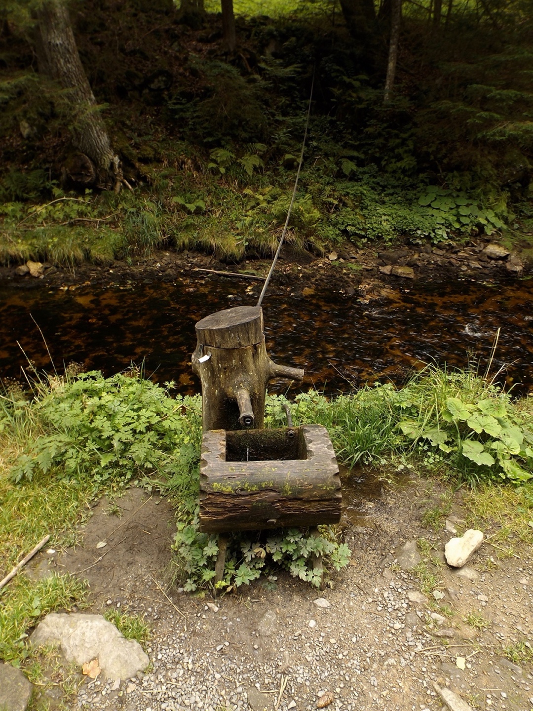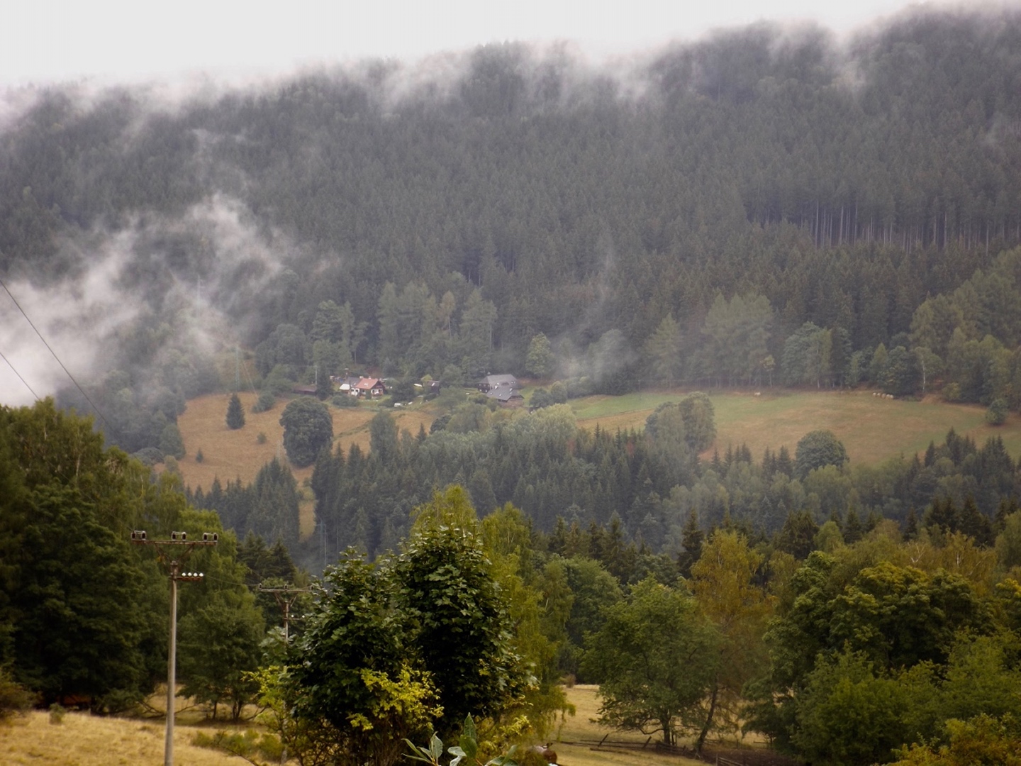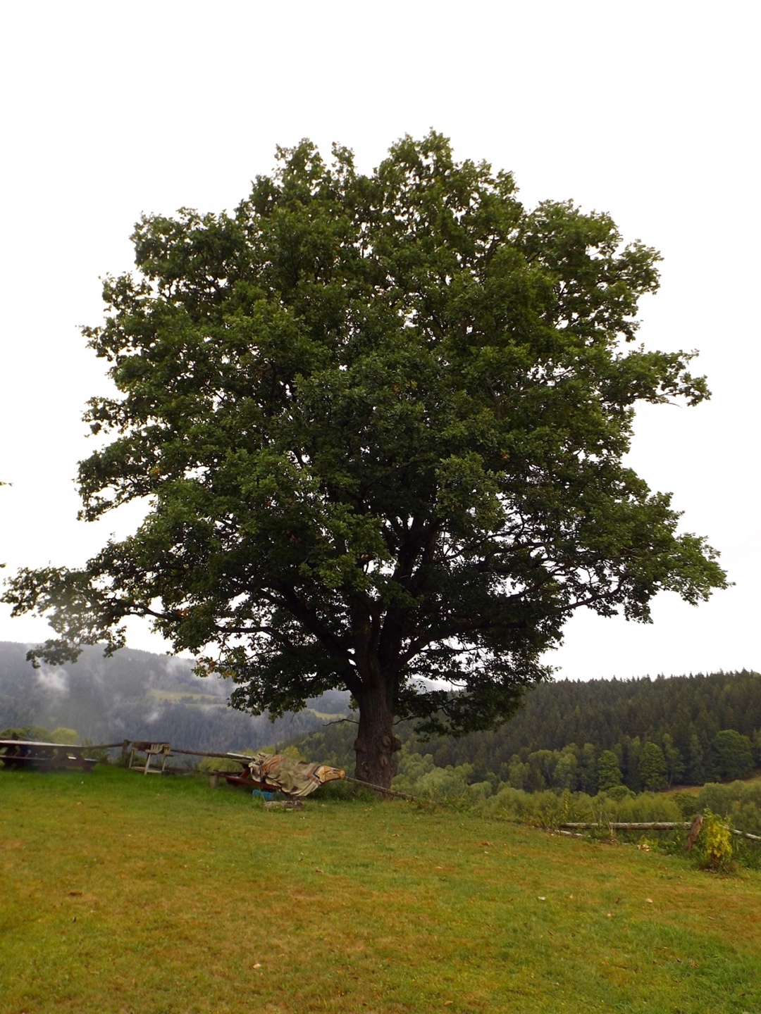 Vom Eingang der Unterkunft sind es nur etwa 50 Meter zum Parkplatz, an dem ich letztes Jahr zum Oblík gestartet war. Dieses Mal ging ich aber nicht nach Süden, sondern nach Norden, entlang des untersten Teils des Kanals, der im Gegensatz zum Vorjahr Wasser führte. Nicht viel, aber immerhin doch etwas. Die Gründe dafür sollten im Verlaufe der Runde noch klar werden. Vereinfacht gesagt folgte ich bis Srní der grünen Markierung. Diese verläuft erst einmal minimal abschüssig auf einer Forststraße neben dem Kanal, der je nach Bächen von oben oder nach unten mehr oder weniger Wasser führt. Beim Wegweiser U Sedla macht der Kanal einen Knick und führt steil hinunter zur Křemelná, während der Weg fast in einer Spitzkehre hinauf zum übriggebliebenen Teil der ehemaligen Gemeinde Sedlo hinaufzieht. Hier wird gerade ein altes Bauernhaus aufwändig saniert, mal sehen, was da in zwei, drei Jahren herauskommt. Außerdem gibt es hier einige stattliche Bäume der verschiedensten Sorten, bei besserem Wetter definitiv lohnende Fotomotive. Ich habe es natürlich auch trotz Regen versucht, aber die Ergebnisse sind bestenfalls mittelprächtig. Südlich der Baustelle steht ein scheinbar noch nicht bewohntes neues Bauernhaus in Holzbauweise, kann sich sehen lassen. Gleich dahinter biegt der Wanderweg links ab Richtung Vodný zámek, während die Radfahrer auf dem Fahrweg direkt zum Speichersee hinauffahren. Jetzt windet sich der Wanderweg entlang des Nordhanges des Sedelský vrch durch den Wald nach oben, ohne dabei ausgesprochen steil zu sein. Am Waldrand zweigt ein Steig ab zur Klostermannova vyhlídka, von der aus man theoretisch einige Größen jenseits der Vydra sehen kann, wenn sie sich nicht gerade hinter Regenwolken verstecken. Als extrafieser Akt der Verarschung hörte es genau in dem Moment auf zu regnen und der Nebel stieg etwas an, aber freie Sicht sieht immer noch anders aus. Vom Aussichtspunkt aus führt ein unmarkierten Pfad geradeaus weiter und mündet wohl am Wasserschloss wieder in der markierten Weg, ich ging aber brav zurück zum Abzweig und entlang des Osthanges dorthin, denn genau das ist die Übersetzung des Begriffs Vodný zámek. Mit einem Schloss hat der Bau allerdings wenig zu tun, es ist halt ein Betriebsgebäude des Elektrizitätswerks, das aus einem Turm und einem Anbau besteht. Auch hier dürfte die Aussicht bei schönem Wetter ziemlich ordentlich sein. 500 Meter weiter westlich erreichte ich den Speicherteich, in den das Wasser aus dem Kanal normalerweise gepumpt wird, aber er war trotz des vorangegangenen Schnürlregens absolut leer. Das hatte auch einen guten Grund, denn die Bretter in der südwestlichen Ecke sehen deutlich nach Baustelle aus. Deswegen also auch das Wasser in dem Abschnitt, der letztes Jahr total trocken war, weil alles hier raufgepumpt wurde. Hier machte ein Labrador leichte Avancen, die ich freudig erwidert hätte, wenn es Herrchen zugelassen hätte. Außerdem schob ich hier meine Stöcke zusammen und befestigte sie am Rucksack, weil die nächsten Kilometer auf Asphalt verliefen. Zunächst ging es hinunter nach Srní, vorbei am Hotel Vydra, dessen Speisekarte auch ganz ordentlich aussah, und am Eingang zu einem scheinbar ganz neu angelegten Wolfslehrpfad. Zumindest ist er noch nicht in mapy.cz verzeichnet. Aus diesem Grund verschob ich eine Erkundung auf einen späteren Termin und ging auf der geplanten Route weiter. Ebenso neu ist auch ein Wolfsgehege bei Horní Hrádky, zu dem man vom Klostermann-Lehrpfad aus gehen kann, was ich ebenfalls auf einen späteren Termin verschob. Im Ortszentrum von Srní wird die Markierung gelb und folgt erst einmal der Straße nach Modrava. Nach knapp einem Kilometer zweigt sie nach links in den Wald ab, also wurden die Stöcke wieder ausgefahren und eingesetzt. Der Waldweg ist zwar nicht lang, das folgende Teerstück bis Horní Hrádky aber auch nicht, und danach geht der Klostermann-Lehrpfad im Wald weiter. Hier wird auf insgesamt fünf zweisprachigen Schautafeln vieles über den in der Umgebung von Srní aufgewachsenen Heimatdichter beschrieben. Ein Bauernhof am Weg gehörte seiner Tante, etwas später führt ein kleiner Pfad zu einem Aussichtspunkt, an dem er sich gerne aufgehalten hatte. Heute ist die Aussicht ziemlich mittelprächtig, weil zugewachsen. Diese Tatsache störte deutlich mehr als die Wolken, und das heißt etwas. Jetzt war es nicht mehr weit nach Rokyta, wo gleich nach der Einmündung des Pfades in die Straße auf der linken Seite die Penzion Svata Florian mit Restaurace steht und auch geöffnet hatte. Wenigstens eine Sache, die nach Plan klappte. Hier wurde ich erneut von einem Hund und später auch von einer Katze hofiert, wobei letztere eher den Eindruck machte, dass sie nur etwas von meinem Essen haben wollte. Dieses war exzellent, ein Böhmerwälder Kartoffelauflauf mit Hühnerfleisch, Zwiebeln und natürlich Käse. Der kleine Negativpunkt war nur, dass es kein Černé pivo gab. Gut gestärkt marschierte ich eine knappe Stunde später wieder los, zunächst zur Nationalparkinfostelle mit der Absicht, endlich herauszufinden, wann ich wo welchen nicht markierten Weg gehen darf. Es standen auch Autos vor dem Haus, also könnte es klappen. Klarer Fall von Denkste, es war eine Dienstbesprechung und die Infostelle den ganzen Tag geschlossen. Also beschränkte ich mich notgedrungen auf ein paar Fotos von der geologischen Ausstellung vor dem Haus und machte mich auf den Weg zum Kanal, dem ich effektiv bis zum Parkplatz bei der Unterkunft folgte. Langweilig war es dabei allerdings nicht, denn der Kanal hat neben verschiedenen Infotafeln (wieder dankenswerterweise zweisprachig) zu seiner Geschichte und seiner Funktion noch einige kleine Dinge zu bieten, die auf jeden Fall erwähnenswert sind. Beispielsweise ist ein Abschnitt zwischen Schätzův les und Hakešická cesta etwas steiler, also statt 8 Promille knapp 2 Prozent Gefälle, und deswegen mit Betonplatten abgedeckt. Ob dies erst zur Sicherhei