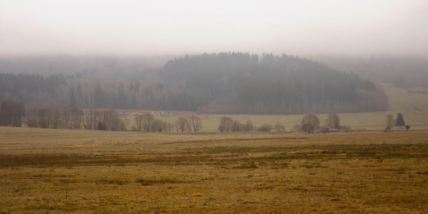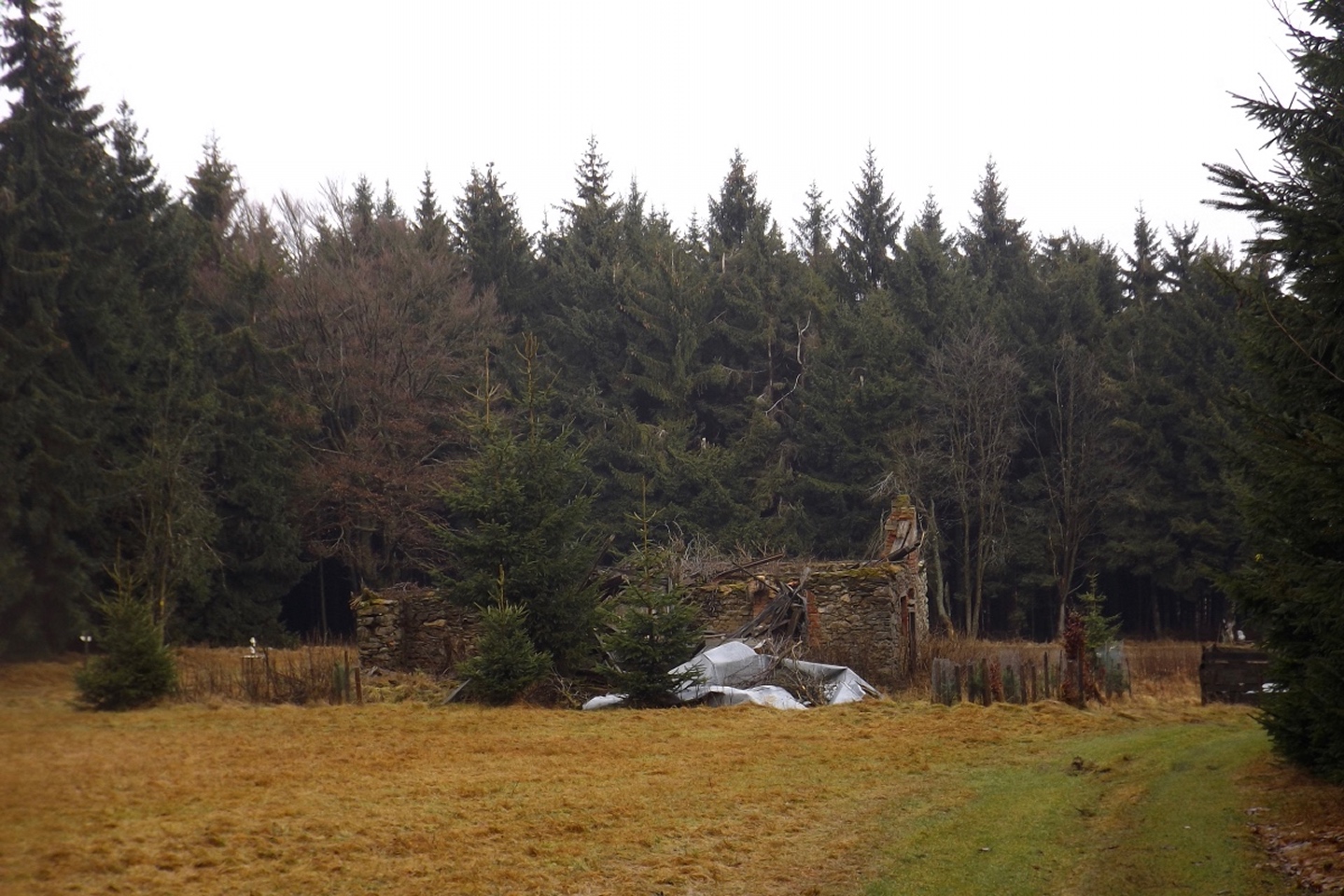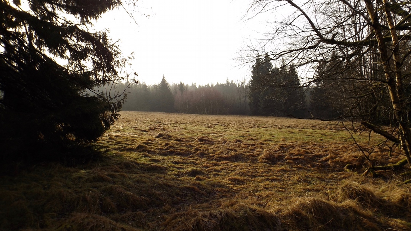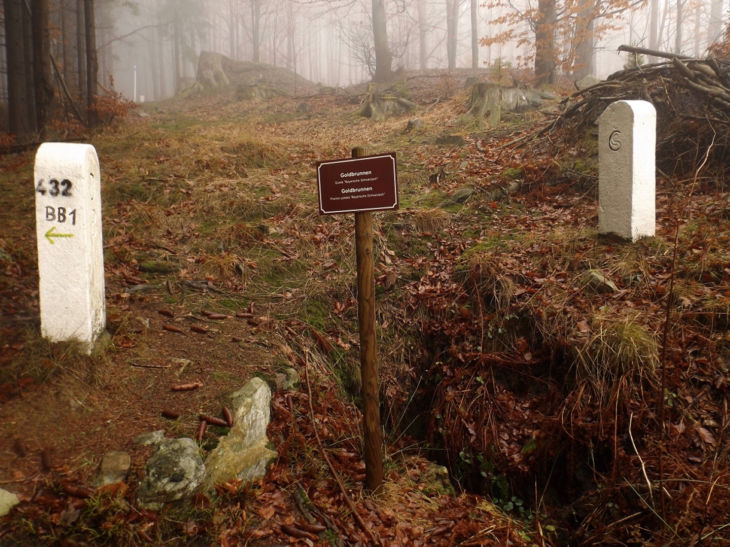 Zunächst ging es auf der Fahrstraße Richtung Waldhäuser, die ich aber nach etwa einem Kilometer verlassen und über eine Wiese nahe der Grenze aufsteigen konnte. Dort traf ich einen jungen Mann, der ein paar Leckereien für Rehe und Hirschen auslegte und mir erklärte, dass der Grenzsteig bis zur Schwarzachquelle recht moorig ist und es besser wäre, nach Waldhäuser hinaufzuqueren und von dort aus auf dem markierten Wanderweg weiterzugehen. Diesem Rat folgte ich und stand nach einer kurzen Unterbrechung unterhalb des ehemaligen Skilifts zum Auspacken der Stöcke relativ bald an besagter Quelle, die auch Goldbrunnen genannt wird. Ganz nebenbei stellte ich fest, dass ich auf dem BB1 (Bayerisch-böhmischer Wanderweg) unterwegs war, der mich auch ohne Probleme nach Bügellohe brachte. Voriges Jahr hatte ich mich ja auf das besterhaltene Haus am westlichen Rand der Wüstung beschränkt, heute kam ich von Osten und überquerte deshalb die gesamte temporäre Siedlung. Auch nahm ich mir die paar Minuten, um die Dokumentation im Schuppen jenes Hauses anzuschauen. Anschließend folgte ich dem bereits bekannten Weg hinunter nach Vacláv, wo ich endlich die erste Wurstsemmel zu mir nahm. Allerdings folgte ich hier der roten tschechischen Markierung, die mich zwar nicht in die Irre führte, aber dazu führte, dass ich nicht wieder an der Gedenkstätte für das frühere Wenzelsdorf vorbeikam, sondern die ebenfalls bereits verfallenden Militärgebäude oberhalb passierte. Hier war bereits Endstation für die Stöcke, da erwartungsgemäß der böhmische Teil der Tour auf Asphalt oder einem ihm ähnelnden Schotterbelag stattfand. Ich merkte hier bereits, dass meine Längenschätzung etwas zu kurz ausgefallen war, machte mir aber keine Sorgen wegen der Tea time, ich war überraschend gut in der Zeit und hatte außerdem noch eine Einkehr in Rybník eingeplant, die ich zur Not auch verkürzen konnte. Dort kam ich kurz vor ein Uhr an, ich war zwar zügig unterwegs, weil es durchgehend bergab ging, hatte aber genug Zeit gefunden, das eine oder andere Bild von der Umgebung und den Wüstungen zwischen Pleš und Rybník zu machen. In Rybník hatte das erste Restaurace geschlossen, was aber letztendlich gut war, weil das, welches mir empfohlen worden war, erst 200 Meter später kommt. Eine halbe Stunde reicht für eine Suppe und ein Bier, also kehrte ich ein. Das Bier war ein Kostel, also gehobene böhmische Dunkelqualität, und die Hühnersuppe richtig lecker. Ich kann also wie geplant nächstes oder übernächstes Jahr mit dem OWV hier losmarschieren und einkehren, denn man akzeptiert Euro zu einem halbwegs ehrlichen Kurs, und Parkplätze gibt es auch auf der anderen Straßenseite. Auch spricht der Wirt deutsch, was mir aber heute egal war, denn ich schaffte es, alles auf tschechisch zu erledigen. Begrüßung, Bestellung, Bezahlen, Frage nach den Euro (die nur für den OWV, denn ich hatte noch ausreichend Kronen von Srní her übrig) und Verabschiedung. Lediglich bei seiner Antwort zum Wechselkurs stand ich kurz auf dem Schlauch, weil er nicht Dvacet pět, sondern Pětdvacet sagte. Aber das war auch egal. Auf den letzten dreieinhalb Kilometern zurück nach Schwarzach kam mir noch ein deutscher Spaziergänger entgegen, den ich trotzdem mit Dobrý den grüßte, denn ich war ja noch in Tschechien. Den Gedenkstein für einen 1938 ermordeten Grenzbeamten nahm ich dieses Mal mit, ich hatte ja noch genug Zeit.