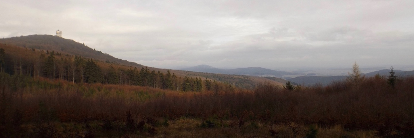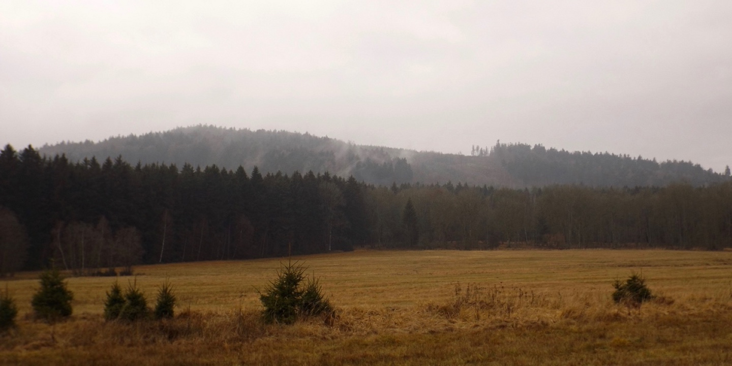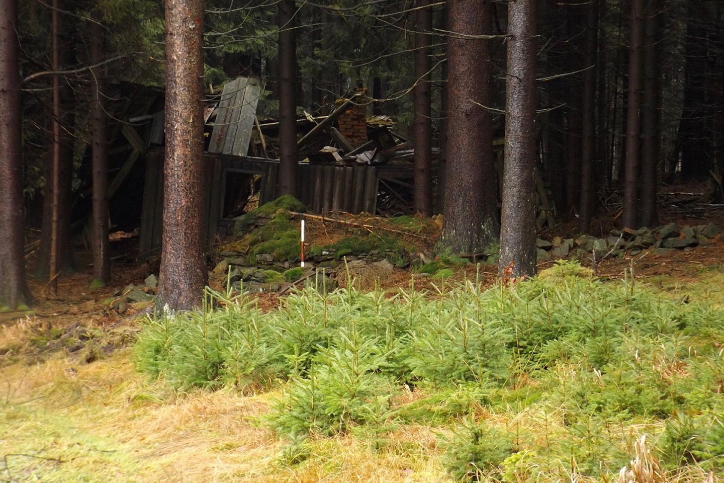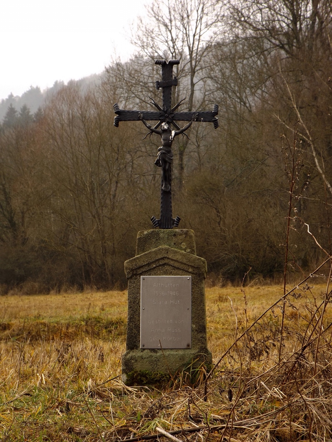 Zunächst ging es auf der Fahrstraße Richtung Waldhäuser, die ich aber nach etwa einem Kilometer verlassen und über eine Wiese nahe der Grenze aufsteigen konnte. Dort traf ich einen jungen Mann, der ein paar Leckereien für Rehe und Hirschen auslegte und mir erklärte, dass der Grenzsteig bis zur Schwarzachquelle recht moorig ist und es besser wäre, nach Waldhäuser hinaufzuqueren und von dort aus auf dem markierten Wanderweg weiterzugehen. Diesem Rat folgte ich und stand nach einer kurzen Unterbrechung unterhalb des ehemaligen Skilifts zum Auspacken der Stöcke relativ bald an besagter Quelle, die auch Goldbrunnen genannt wird. Ganz nebenbei stellte ich fest, dass ich auf dem BB1 (Bayerisch-böhmischer Wanderweg) unterwegs war, der mich auch ohne Probleme nach Bügellohe brachte. Voriges Jahr hatte ich mich ja auf das besterhaltene Haus am westlichen Rand der Wüstung beschränkt, heute kam ich von Osten und überquerte deshalb die gesamte temporäre Siedlung. Auch nahm ich mir die paar Minuten, um die Dokumentation im Schuppen jenes Hauses anzuschauen. Anschließend folgte ich dem bereits bekannten Weg hinunter nach Vacláv, wo ich endlich die erste Wurstsemmel zu mir nahm. Allerdings folgte ich hier der roten tschechischen Markierung, die mich zwar nicht in die Irre führte, aber dazu führte, dass ich nicht wieder an der Gedenkstätte für das frühere Wenzelsdorf vorbeikam, sondern die ebenfalls bereits verfallenden Militärgebäude oberhalb passierte. Hier war bereits Endstation für die Stöcke, da erwartungsgemäß der böhmische Teil der Tour auf Asphalt oder einem ihm ähnelnden Schotterbelag stattfand. Ich merkte hier bereits, dass meine Längenschätzung etwas zu kurz ausgefallen war, machte mir aber keine Sorgen wegen der Tea time, ich war überraschend gut in der Zeit und hatte außerdem noch eine Einkehr in Rybník eingeplant, die ich zur Not auch verkürzen konnte. Dort kam ich kurz vor ein Uhr an, ich war zwar zügig unterwegs, weil es durchgehend bergab ging, hatte aber genug Zeit gefunden, das eine oder andere Bild von der Umgebung und den Wüstungen zwischen Pleš und Rybník zu machen. In Rybník hatte das erste Restaurace geschlossen, was aber letztendlich gut war, weil das, welches mir empfohlen worden war, erst 200 Meter später kommt. Eine halbe Stunde reicht für eine Suppe und ein Bier, also kehrte ich ein. Das Bier war ein Kostel, also gehobene böhmische Dunkelqualität, und die Hühnersuppe richtig lecker. Ich kann also wie geplant nächstes oder übernächstes Jahr mit dem OWV hier losmarschieren und einkehren, denn man akzeptiert Euro zu einem halbwegs ehrlichen Kurs, und Parkplätze gibt es auch auf der anderen Straßenseite. Auch spricht der Wirt deutsch, was mir aber heute egal war, denn ich schaffte es, alles auf tschechisch zu erledigen. Begrüßung, Bestellung, Bezahlen, Frage nach den Euro (die nur für den OWV, denn ich hatte noch ausreichend Kronen von Srní her übrig) und Verabschiedung. Lediglich bei seiner Antwort zum Wechselkurs stand ich kurz auf dem Schlauch, weil er nicht Dvacet pět, sondern Pětdvacet sagte. Aber das war auch egal. Auf den letzten dreieinhalb Kilometern zurück nach Schwarzach kam mir noch ein deutscher Spaziergänger entgegen, den ich trotzdem mit Dobrý den grüßte, denn ich war ja noch in Tschechien. Den Gedenkstein für einen 1938 ermordeten Grenzbeamten nahm ich dieses Mal mit, ich hatte ja noch genug Zeit.