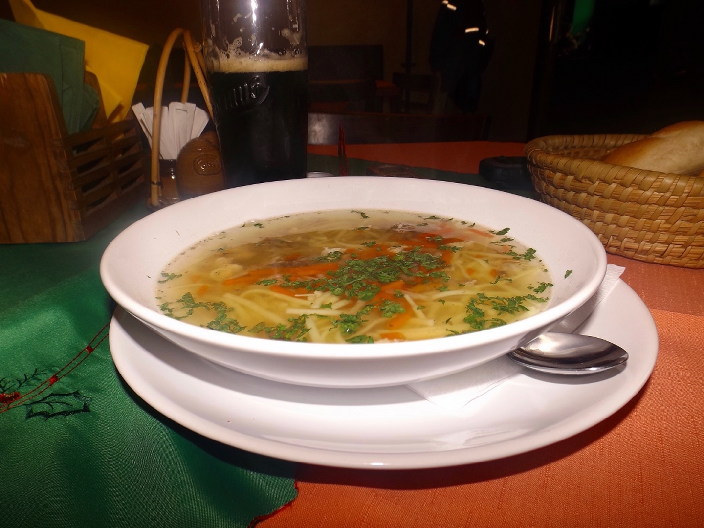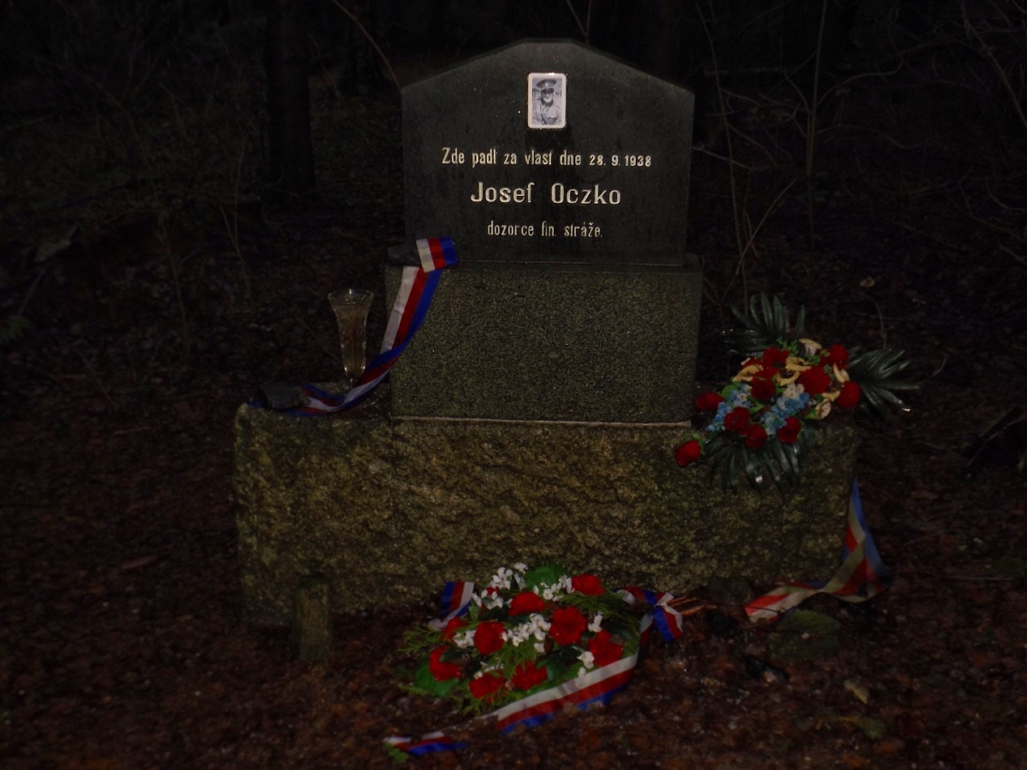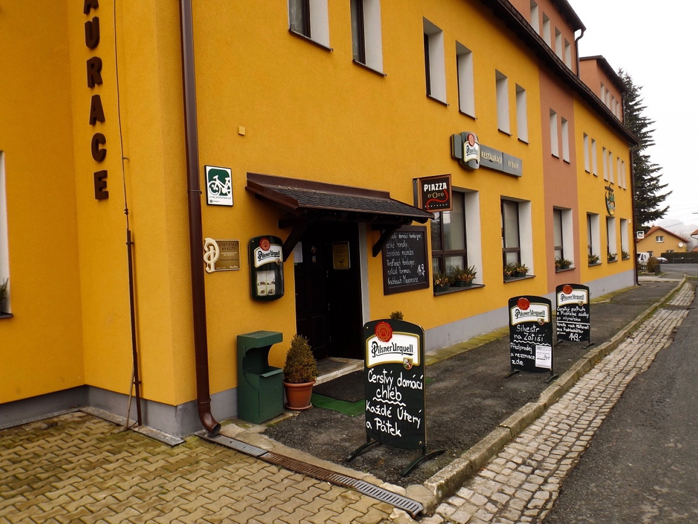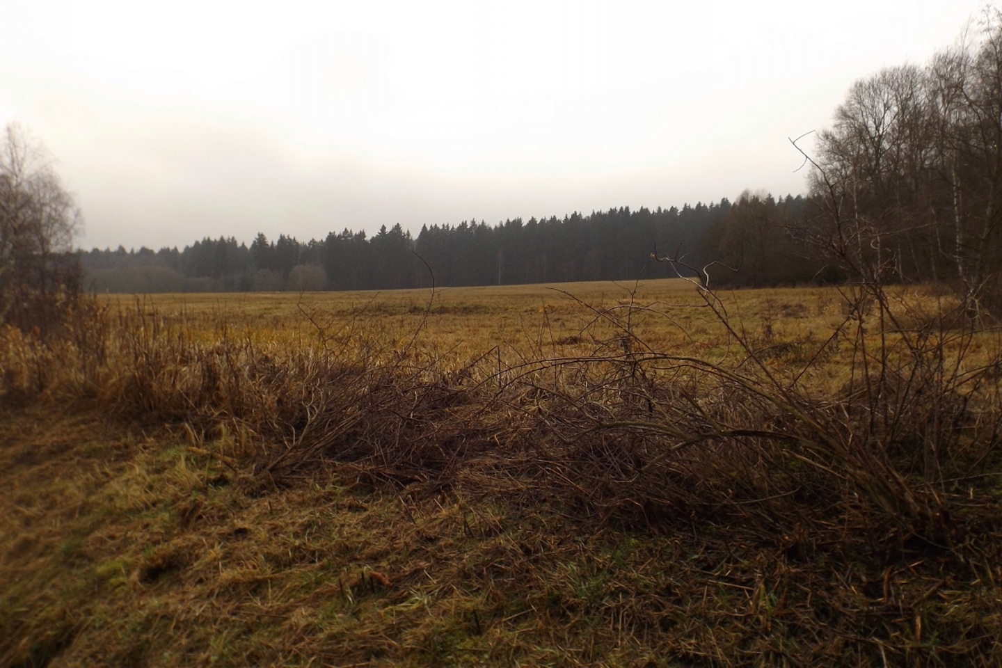 Zunächst ging es auf der Fahrstraße Richtung Waldhäuser, die ich aber nach etwa einem Kilometer verlassen und über eine Wiese nahe der Grenze aufsteigen konnte. Dort traf ich einen jungen Mann, der ein paar Leckereien für Rehe und Hirschen auslegte und mir erklärte, dass der Grenzsteig bis zur Schwarzachquelle recht moorig ist und es besser wäre, nach Waldhäuser hinaufzuqueren und von dort aus auf dem markierten Wanderweg weiterzugehen. Diesem Rat folgte ich und stand nach einer kurzen Unterbrechung unterhalb des ehemaligen Skilifts zum Auspacken der Stöcke relativ bald an besagter Quelle, die auch Goldbrunnen genannt wird. Ganz nebenbei stellte ich fest, dass ich auf dem BB1 (Bayerisch-böhmischer Wanderweg) unterwegs war, der mich auch ohne Probleme nach Bügellohe brachte. Voriges Jahr hatte ich mich ja auf das besterhaltene Haus am westlichen Rand der Wüstung beschränkt, heute kam ich von Osten und überquerte deshalb die gesamte temporäre Siedlung. Auch nahm ich mir die paar Minuten, um die Dokumentation im Schuppen jenes Hauses anzuschauen. Anschließend folgte ich dem bereits bekannten Weg hinunter nach Vacláv, wo ich endlich die erste Wurstsemmel zu mir nahm. Allerdings folgte ich hier der roten tschechischen Markierung, die mich zwar nicht in die Irre führte, aber dazu führte, dass ich nicht wieder an der Gedenkstätte für das frühere Wenzelsdorf vorbeikam, sondern die ebenfalls bereits verfallenden Militärgebäude oberhalb passierte. Hier war bereits Endstation für die Stöcke, da erwartungsgemäß der böhmische Teil der Tour auf Asphalt oder einem ihm ähnelnden Schotterbelag stattfand. Ich merkte hier bereits, dass meine Längenschätzung etwas zu kurz ausgefallen war, machte mir aber keine Sorgen wegen der Tea time, ich war überraschend gut in der Zeit und hatte außerdem noch eine Einkehr in Rybník eingeplant, die ich zur Not auch verkürzen konnte. Dort kam ich kurz vor ein Uhr an, ich war zwar zügig unterwegs, weil es durchgehend bergab ging, hatte aber genug Zeit gefunden, das eine oder andere Bild von der Umgebung und den Wüstungen zwischen Pleš und Rybník zu machen. In Rybník hatte das erste Restaurace geschlossen, was aber letztendlich gut war, weil das, welches mir empfohlen worden war, erst 200 Meter später kommt. Eine halbe Stunde reicht für eine Suppe und ein Bier, also kehrte ich ein. Das Bier war ein Kostel, also gehobene böhmische Dunkelqualität, und die Hühnersuppe richtig lecker. Ich kann also wie geplant nächstes oder übernächstes Jahr mit dem OWV hier losmarschieren und einkehren, denn man akzeptiert Euro zu einem halbwegs ehrlichen Kurs, und Parkplätze gibt es auch auf der anderen Straßenseite. Auch spricht der Wirt deutsch, was mir aber heute egal war, denn ich schaffte es, alles auf tschechisch zu erledigen. Begrüßung, Bestellung, Bezahlen, Frage nach den Euro (die nur für den OWV, denn ich hatte noch ausreichend Kronen von Srní her übrig) und Verabschiedung. Lediglich bei seiner Antwort zum Wechselkurs stand ich kurz auf dem Schlauch, weil er nicht Dvacet pět, sondern Pětdvacet sagte. Aber das war auch egal. Auf den letzten dreieinhalb Kilometern zurück nach Schwarzach kam mir noch ein deutscher Spaziergänger entgegen, den ich trotzdem mit Dobrý den grüßte, denn ich war ja noch in Tschechien. Den Gedenkstein für einen 1938 ermordeten Grenzbeamten nahm ich dieses Mal mit, ich hatte ja noch genug Zeit.