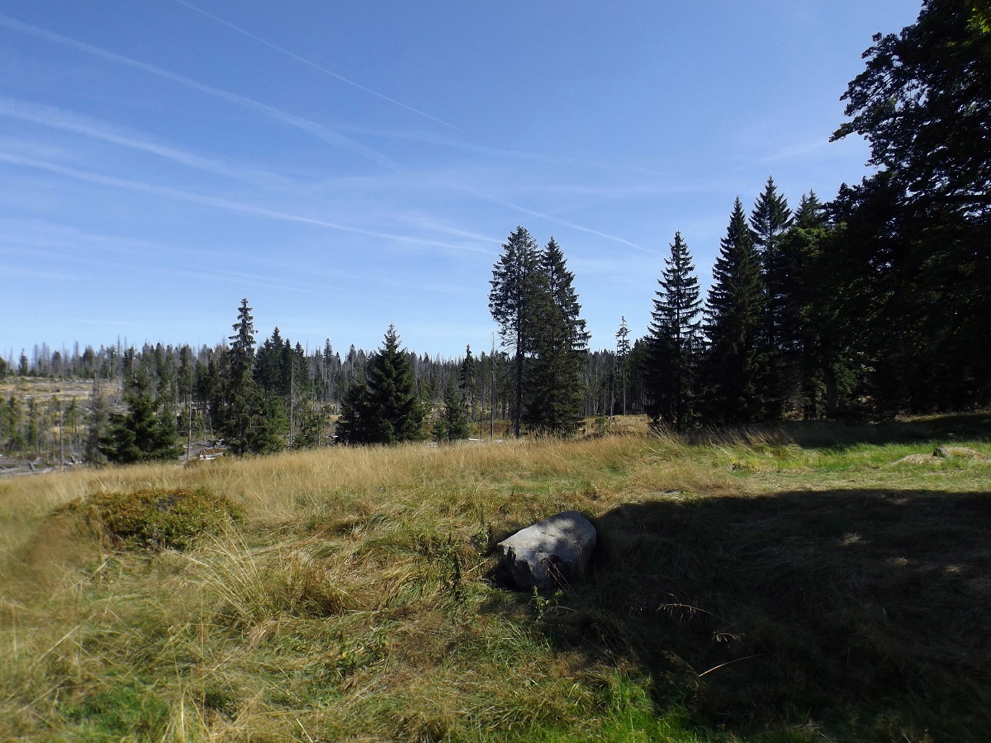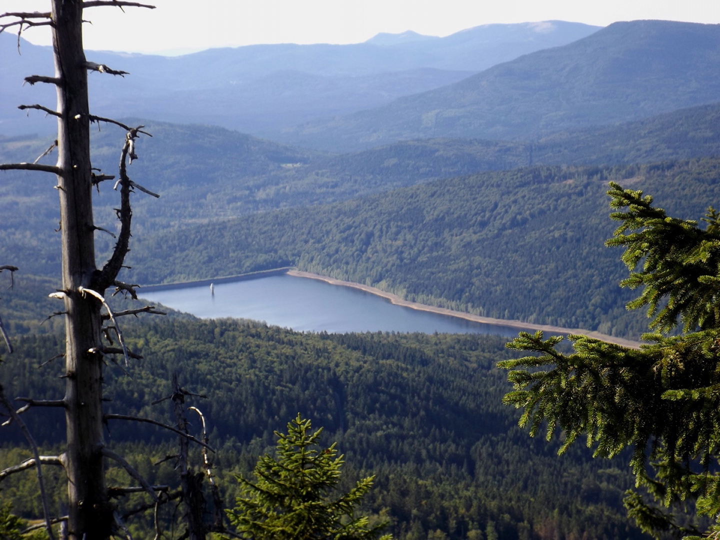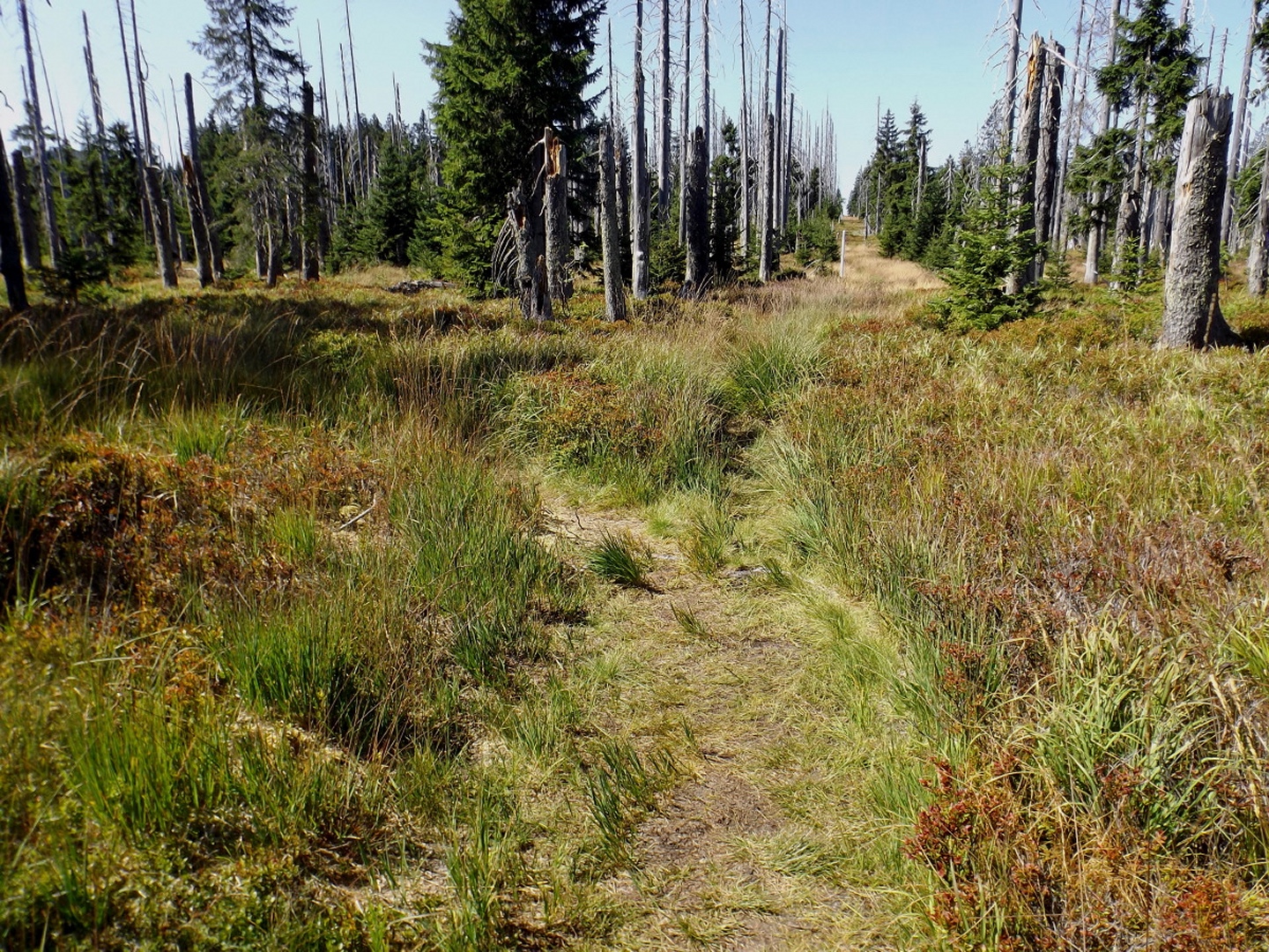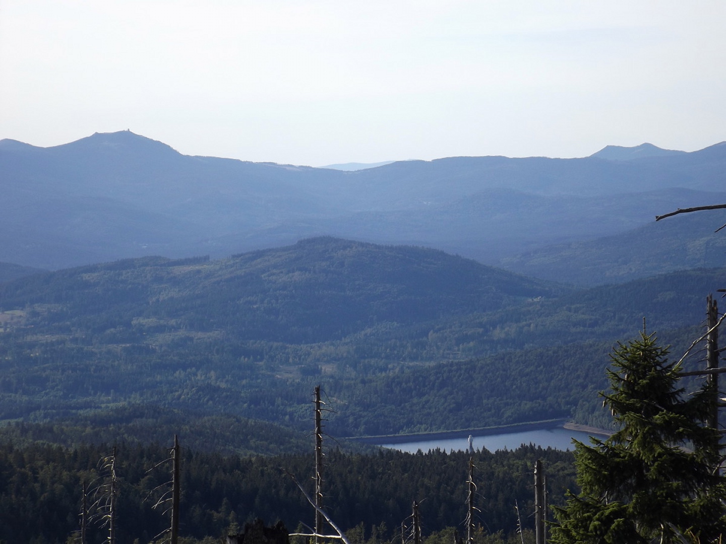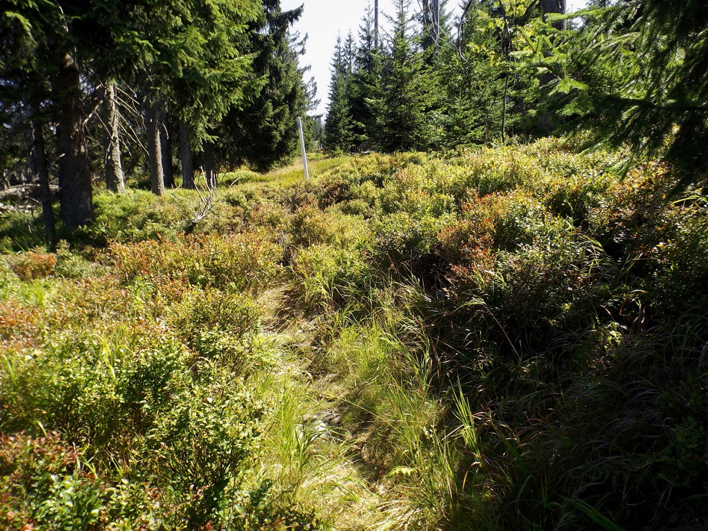 Am Parkplatz unterhalb der Trinkwassertalsperre Frauenau war überraschend wenig Betrieb, so dass ich ganz vorne beim Infopavillion parken konnte. Von dort ging es erst einmal auf einem wurzeligen Waldsteig vorbei an Betriebsgebäuden hinauf zur Dammkrone. Laut Infotafel war der Staudamm bei seiner Errichtung 1984 der höchste in Deutschland, ob er es jetzt noch ist, weiß ich nicht, und ich bin auch zu faul, jetzt während des Schreibens nachzuschauen. Man könnte von hier aus geradeaus weitergehen und auf einem markierten wohl Waldsteig entlang der Südseite zum östlichen Ende und zur Schachtenstraße kommen, ich versprach mir aber von der Nordseite (und auch der Staumauer selbst) aus interessante Blicke auf den Rachel und seine nördlichen Kämme. Von der Mauer aus gab es die auch, dazu kamen sehr schöne Blicke Richtung Zwiesel und ins Arbergebiet. Details können den Fotos entnommen werden. Während der 20 Minuten, die ich für die nicht mal soooooo lange Strecke über die Mauer brauchte, wurde ich nicht nur von Radfahrern, sondern auch von einem leeren Holztransporter überholt, die Nordseite gehört scheinbar nicht ganz zur Nationalpark-Kernzone. Leider setzt sich die Asphaltstraße nach der Staumauer noch eine ganze Weile fort, ich war bis weit hinter dem Ende des Stausees auf diesem ungeliebten Untergrund unterwegs. Naja, wenigstens konnte ich die meiste Strecke auf dem breiten Grasstreifen neben der Fahrstraße gehen, also war es nicht ganz so schlimm. Die Aussicht von der Nordseite war dann auch nicht so überragend, weil zwischen Straße und See ein doch etwa zehn Meter breiter Waldstreifen steht, der nicht vom Borkenkäfer zerfressen wurde. Am einen oder anderen Seitenbach gibt es eine kleine Schneise, die aber selten gute Fotomotive erlaubte. Ganz hinten stand früher einmal die kleine Siedlung Hirschbach, von der nicht mal mehr Grundmauern oder Brennesselfelder übrig sind. Dafür steht an dieser Stelle ein Unterstandshütterl, eine Infotafel und zwei Rastbänke. Die Wiese zum See hin war frisch gemäht, eigentlich Betreten verboten, aber für ein paar Fotos habe ich mich jeweils einen Meter hinter die Verbotsschilder gewagt. An der Südostecke des Sees kommt schließlich der Kleine Regen herunter, den ich im Laufe der Tour noch mehrere Male überqueren sollte. Bis zum Schachten (ohne differenzierenden Beinamen), an dessen unterem Ende der direkte Steig zum Rachel rechts abzweigt, ging es jetzt sanft bergauf, der Belag wechselte zu Schotter, ich wurde weiterhin von Radfahrern und einem Auto des Nationalparks überholt. Auch am Schachten war das Gras ziemlich kurz, aber zumindest weggeräumt, oder gehört dieser Schachten zu denjenigen, die in diesem Sommer wieder beweidet wurden? Zumindest ist die Diensthütte in einem sehr guten Zustand und am Nebengebäude standen Gerätschaften herum. Ich hielt mich aber nicht wirklich auf, sondern folgte weiterhin dem Wegweiser zum Verlorenen Schachten, dessen Zeitangabe wenig konsistent ist. Etwas oberhalb des Schachtens trennen sich Rad- und Fußweg und ich durfte auf einem sehr schönen breiten Waldpfad, der auch Judenweg genannt wird, weiter nach oben steigen. Auf diese Weise bekam ich zwar die Regenschwelle nicht zu Gesicht, aber das lässt sich ja einmal nachholen. Bald kreuzte der Fußweg den Radweg und vereinigte sich mit dem Goldsteig, der in der entgegengesetzten Richtung vom Hochschachten herunterkommt und hier zum Rachel abzweigt. Auf diesem blieb ich bis zum Verlorenen Schachten, einem der interessantesten Orte der Gegend. Er gehört nicht zum Nationalpark, sondern ist seit Jahrhunderten ununterbrochen im Besitz der gleichen (lokalen) Adelsfamilie, zieht sich hinüber bis zur Grenze (hinauf ist an dieser Stelle nicht ganz richtig, da das Gelände doch recht flach ist) und beheimatet die größte zusammenhängende Seegrasfläche aller Schachten im Bayerischen Wald. Was ich trotz intensiver Suche immer noch nicht herausgefunden habe, ist die Herkunft seines Namens. Daran, dass man hier verloren wäre, kann es nicht liegen, weil die Aussage so nicht stimmt. Immerhin steht hier eine kleine Hütte, die dem Bayerwaldverein Frauenau gehört und auch deutliche Signale einer gelegentlichen Nutzung zeigt. Hier machte ich meine erste größere Pause und genoss ein Wurst-Käse-Brot (die ersten beiden Apfelvierterln habe ich schon vorher gegessen, ich muss aber nicht jedes im Text notieren). Anschließend nahm ich den wieder einmal genussvollsten Teil der Wanderung unter die Füße, den Grenzsteig. Dieser führte mich zunächst etwa 80 Höhenmeter hinunter zur Brückerl über den Bach, der an dieser Stelle seinen Namen von Malá Řezná in Kleiner Regen ändert. Gleich nach der Überquerung begegnete ich zu meiner totalen Überraschung einem Wanderer, der vom Rachel herunterkam und den Steig unterhalb des Verlorenen Schachtens hinüber zum Goldsteig suchte. Ich hatte da nicht sonderlich aufgepasst und konnte ihm nicht wirklich weiterhelfen. Im weiteren Verlauf wechselte der Grenzsteig mehrfach seinen Charakter, es wurde mal trocken-moosig, mal richtig sumpfig (immerhin führt die Grenze in diesem Bereich mitten durch einige der schönsten Filze des Böhmerwaldes), dann musste wieder eine kleine Felsformation umgangen werden. An einer Stelle war der Grenzsteig übelst durch umgestürzte Bäume verlegt, aber auch hier fand ich eine Umgehung. Überraschenderweise, und hier unterscheidet sich dieser Abschnitt von dem, den ich vor fünf Wochen gegangen war, führten weite Strecken durch feinste Heidelbeersträucher, die auch noch gut mit sehr leckeren Früchten gefüllt waren. Ich habe zwar irgendwann mal in der Nationalparkverordnung gelesen, dass in der Kernzone nichts gepflückt werden darf, aber das bezieht sich eher auf Blumen. Außerdem habe ich ja nicht gesammelt, sondern nur genascht, und ich kann mir nicht vorstellen, dass mich ein Ranger zum Hungern zwingen würde, wenn mehr als genug Beeren für alle Vögel, Wildtiere und Wander