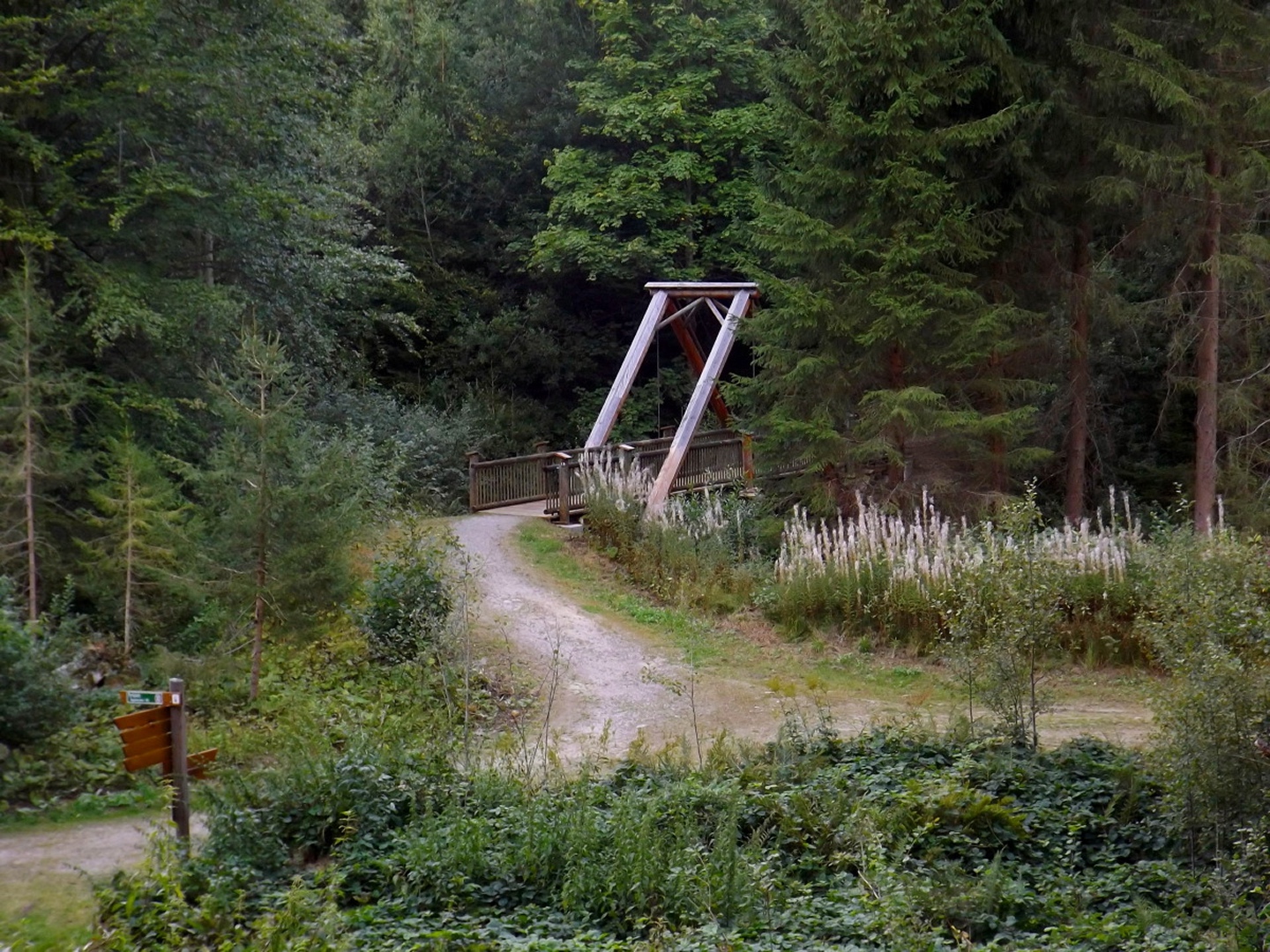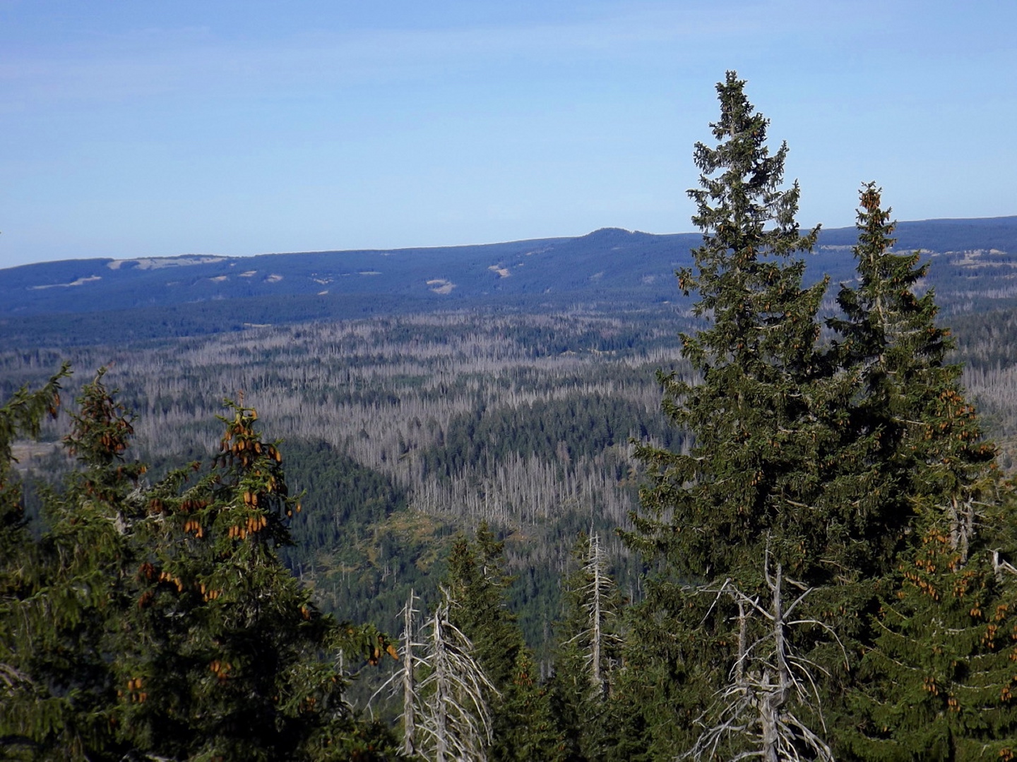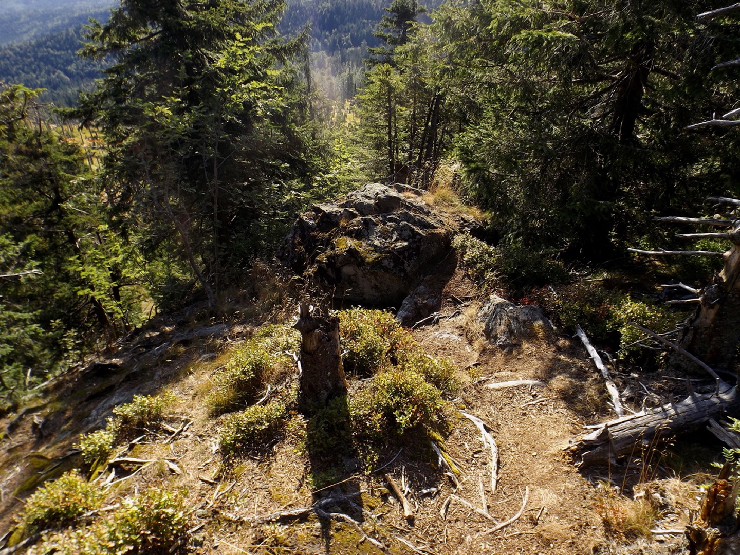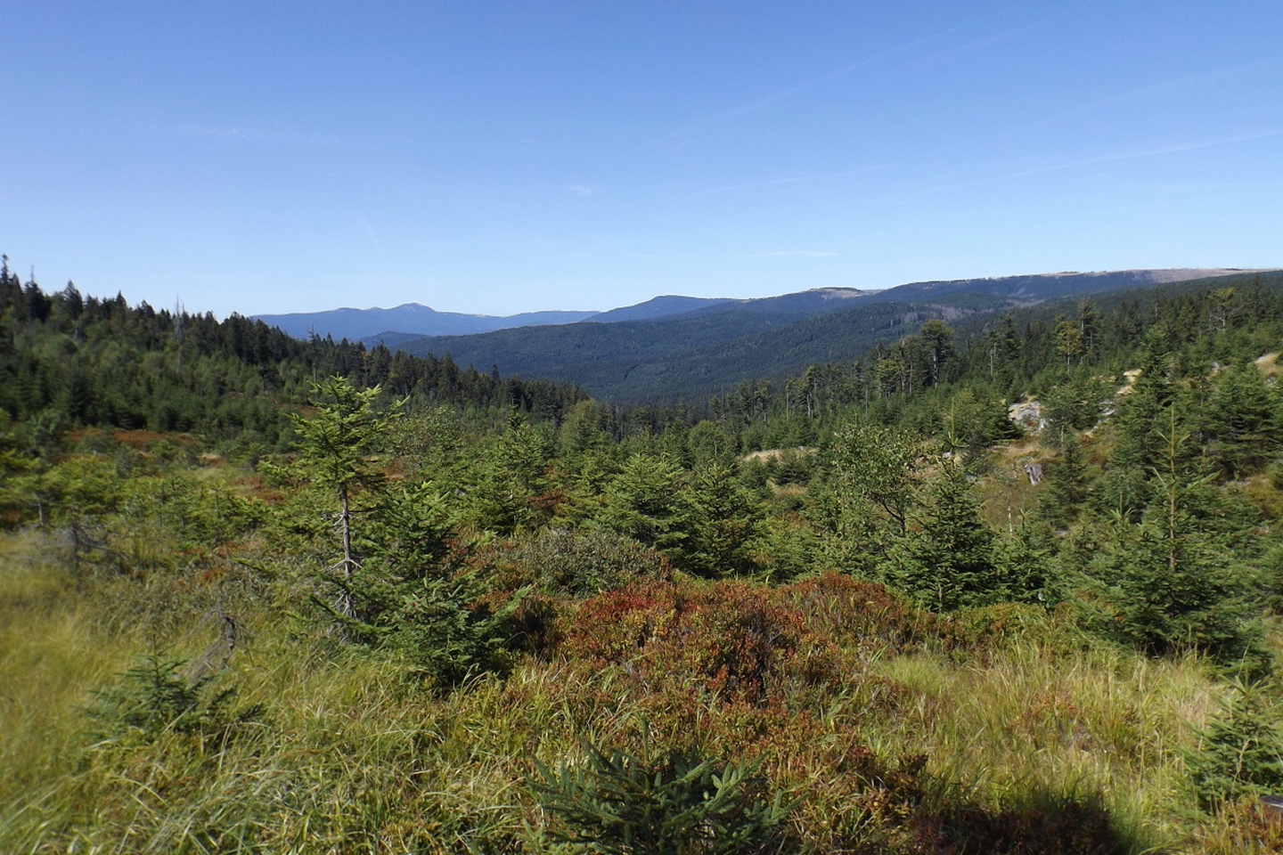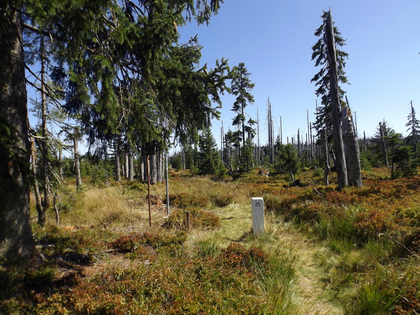 Am Parkplatz unterhalb der Trinkwassertalsperre Frauenau war überraschend wenig Betrieb, so dass ich ganz vorne beim Infopavillion parken konnte. Von dort ging es erst einmal auf einem wurzeligen Waldsteig vorbei an Betriebsgebäuden hinauf zur Dammkrone. Laut Infotafel war der Staudamm bei seiner Errichtung 1984 der höchste in Deutschland, ob er es jetzt noch ist, weiß ich nicht, und ich bin auch zu faul, jetzt während des Schreibens nachzuschauen. Man könnte von hier aus geradeaus weitergehen und auf einem markierten wohl Waldsteig entlang der Südseite zum östlichen Ende und zur Schachtenstraße kommen, ich versprach mir aber von der Nordseite (und auch der Staumauer selbst) aus interessante Blicke auf den Rachel und seine nördlichen Kämme. Von der Mauer aus gab es die auch, dazu kamen sehr schöne Blicke Richtung Zwiesel und ins Arbergebiet. Details können den Fotos entnommen werden. Während der 20 Minuten, die ich für die nicht mal soooooo lange Strecke über die Mauer brauchte, wurde ich nicht nur von Radfahrern, sondern auch von einem leeren Holztransporter überholt, die Nordseite gehört scheinbar nicht ganz zur Nationalpark-Kernzone. Leider setzt sich die Asphaltstraße nach der Staumauer noch eine ganze Weile fort, ich war bis weit hinter dem Ende des Stausees auf diesem ungeliebten Untergrund unterwegs. Naja, wenigstens konnte ich die meiste Strecke auf dem breiten Grasstreifen neben der Fahrstraße gehen, also war es nicht ganz so schlimm. Die Aussicht von der Nordseite war dann auch nicht so überragend, weil zwischen Straße und See ein doch etwa zehn Meter breiter Waldstreifen steht, der nicht vom Borkenkäfer zerfressen wurde. Am einen oder anderen Seitenbach gibt es eine kleine Schneise, die aber selten gute Fotomotive erlaubte. Ganz hinten stand früher einmal die kleine Siedlung Hirschbach, von der nicht mal mehr Grundmauern oder Brennesselfelder übrig sind. Dafür steht an dieser Stelle ein Unterstandshütterl, eine Infotafel und zwei Rastbänke. Die Wiese zum See hin war frisch gemäht, eigentlich Betreten verboten, aber für ein paar Fotos habe ich mich jeweils einen Meter hinter die Verbotsschilder gewagt. An der Südostecke des Sees kommt schließlich der Kleine Regen herunter, den ich im Laufe der Tour noch mehrere Male überqueren sollte. Bis zum Schachten (ohne differenzierenden Beinamen), an dessen unterem Ende der direkte Steig zum Rachel rechts abzweigt, ging es jetzt sanft bergauf, der Belag wechselte zu Schotter, ich wurde weiterhin von Radfahrern und einem Auto des Nationalparks überholt. Auch am Schachten war das Gras ziemlich kurz, aber zumindest weggeräumt, oder gehört dieser Schachten zu denjenigen, die in diesem Sommer wieder beweidet wurden? Zumindest ist die Diensthütte in einem sehr guten Zustand und am Nebengebäude standen Gerätschaften herum. Ich hielt mich aber nicht wirklich auf, sondern folgte weiterhin dem Wegweiser zum Verlorenen Schachten, dessen Zeitangabe wenig konsistent ist. Etwas oberhalb des Schachtens trennen sich Rad- und Fußweg und ich durfte auf einem sehr schönen breiten Waldpfad, der auch Judenweg genannt wird, weiter nach oben steigen. Auf diese Weise bekam ich zwar die Regenschwelle nicht zu Gesicht, aber das lässt sich ja einmal nachholen. Bald kreuzte der Fußweg den Radweg und vereinigte sich mit dem Goldsteig, der in der entgegengesetzten Richtung vom Hochschachten herunterkommt und hier zum Rachel abzweigt. Auf diesem blieb ich bis zum Verlorenen Schachten, einem der interessantesten Orte der Gegend. Er gehört nicht zum Nationalpark, sondern ist seit Jahrhunderten ununterbrochen im Besitz der gleichen (lokalen) Adelsfamilie, zieht sich hinüber bis zur Grenze (hinauf ist an dieser Stelle nicht ganz richtig, da das Gelände doch recht flach ist) und beheimatet die größte zusammenhängende Seegrasfläche aller Schachten im Bayerischen Wald. Was ich trotz intensiver Suche immer noch nicht herausgefunden habe, ist die Herkunft seines Namens. Daran, dass man hier verloren wäre, kann es nicht liegen, weil die Aussage so nicht stimmt. Immerhin steht hier eine kleine Hütte, die dem Bayerwaldverein Frauenau gehört und auch deutliche Signale einer gelegentlichen Nutzung zeigt. Hier machte ich meine erste größere Pause und genoss ein Wurst-Käse-Brot (die ersten beiden Apfelvierterln habe ich schon vorher gegessen, ich muss aber nicht jedes im Text notieren). Anschließend nahm ich den wieder einmal genussvollsten Teil der Wanderung unter die Füße, den Grenzsteig. Dieser führte mich zunächst etwa 80 Höhenmeter hinunter zur Brückerl über den Bach, der an dieser Stelle seinen Namen von Malá Řezná in Kleiner Regen ändert. Gleich nach der Überquerung begegnete ich zu meiner totalen Überraschung einem Wanderer, der vom Rachel herunterkam und den Steig unterhalb des Verlorenen Schachtens hinüber zum Goldsteig suchte. Ich hatte da nicht sonderlich aufgepasst und konnte ihm nicht wirklich weiterhelfen. Im weiteren Verlauf wechselte der Grenzsteig mehrfach seinen Charakter, es wurde mal trocken-moosig, mal richtig sumpfig (immerhin führt die Grenze in diesem Bereich mitten durch einige der schönsten Filze des Böhmerwaldes), dann musste wieder eine kleine Felsformation umgangen werden. An einer Stelle war der Grenzsteig übelst durch umgestürzte Bäume verlegt, aber auch hier fand ich eine Umgehung. Überraschenderweise, und hier unterscheidet sich dieser Abschnitt von dem, den ich vor fünf Wochen gegangen war, führten weite Strecken durch feinste Heidelbeersträucher, die auch noch gut mit sehr leckeren Früchten gefüllt waren. Ich habe zwar irgendwann mal in der Nationalparkverordnung gelesen, dass in der Kernzone nichts gepflückt werden darf, aber das bezieht sich eher auf Blumen. Außerdem habe ich ja nicht gesammelt, sondern nur genascht, und ich kann mir nicht vorstellen, dass mich ein Ranger zum Hungern zwingen würde, wenn mehr als genug Beeren für alle Vögel, Wildtiere und Wander