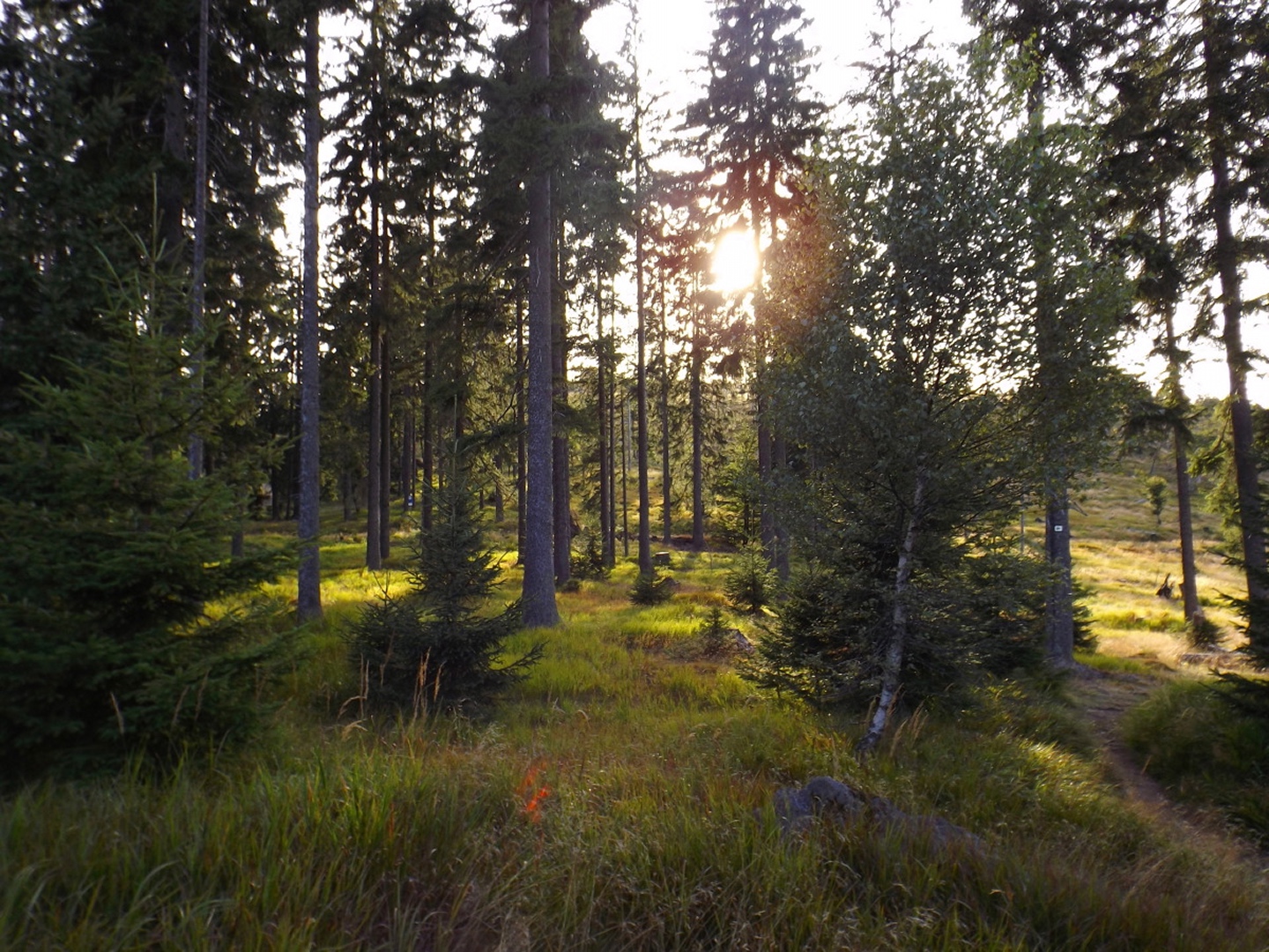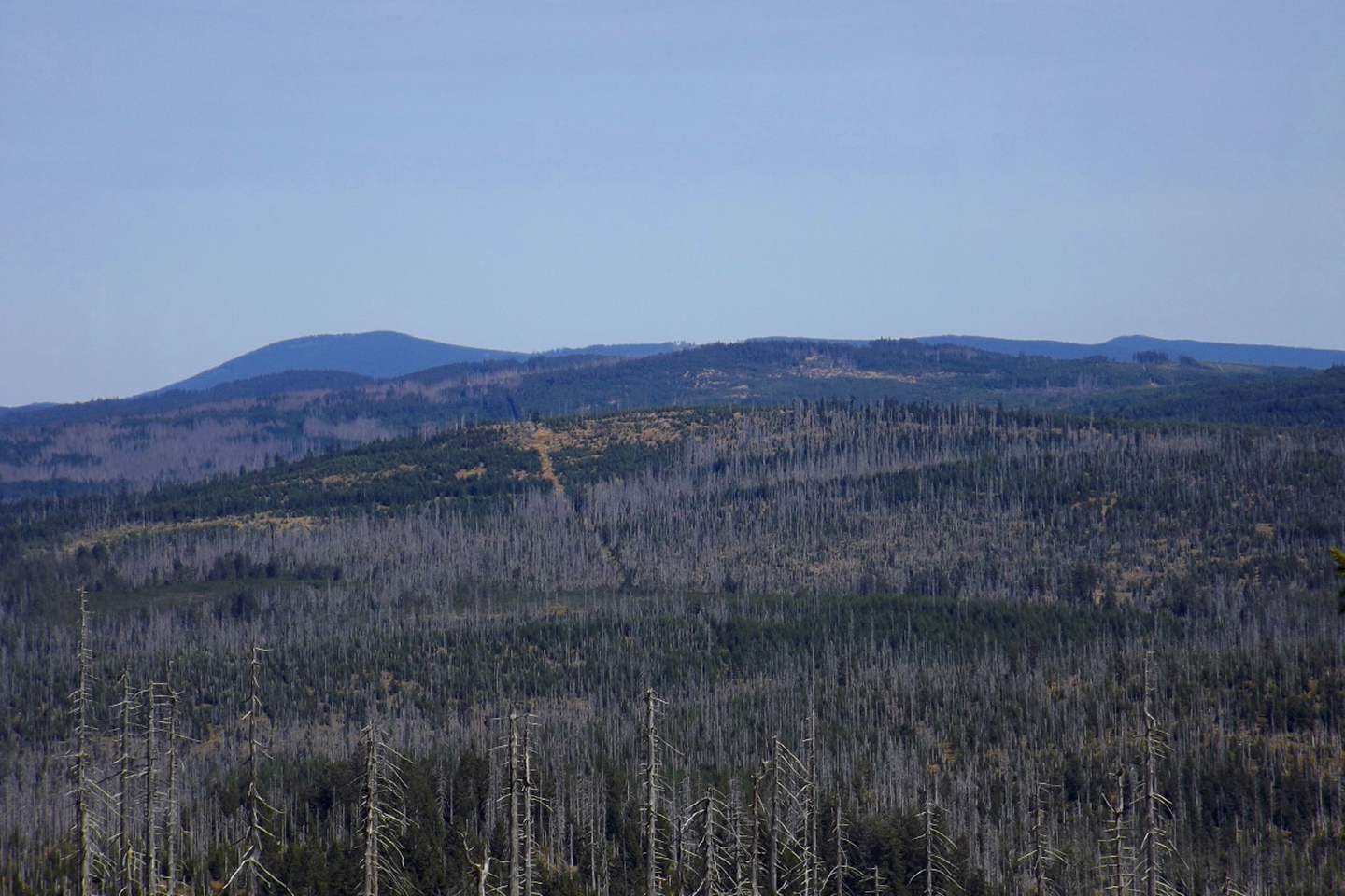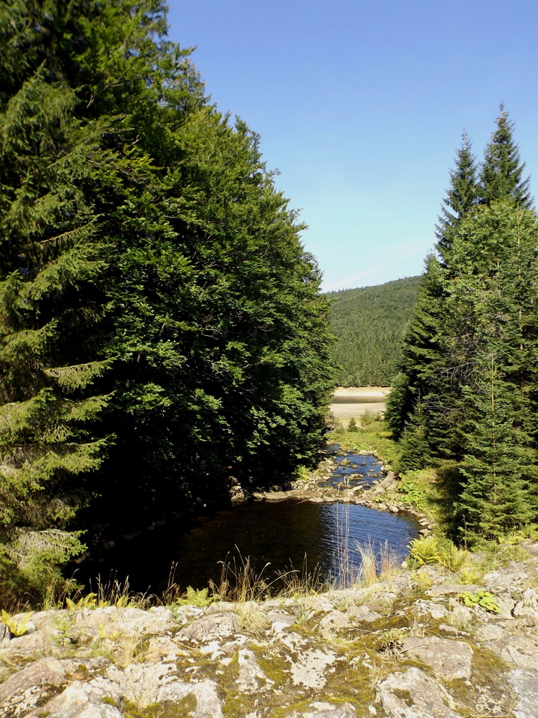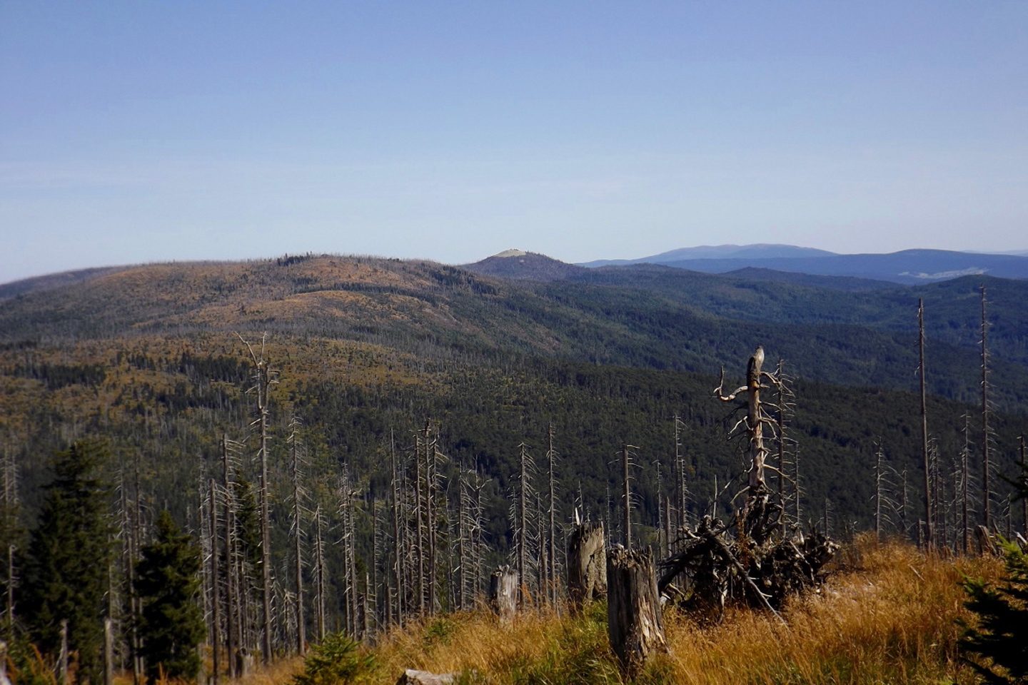 Am Parkplatz unterhalb der Trinkwassertalsperre Frauenau war überraschend wenig Betrieb, so dass ich ganz vorne beim Infopavillion parken konnte. Von dort ging es erst einmal auf einem wurzeligen Waldsteig vorbei an Betriebsgebäuden hinauf zur Dammkrone. Laut Infotafel war der Staudamm bei seiner Errichtung 1984 der höchste in Deutschland, ob er es jetzt noch ist, weiß ich nicht, und ich bin auch zu faul, jetzt während des Schreibens nachzuschauen. Man könnte von hier aus geradeaus weitergehen und auf einem markierten wohl Waldsteig entlang der Südseite zum östlichen Ende und zur Schachtenstraße kommen, ich versprach mir aber von der Nordseite (und auch der Staumauer selbst) aus interessante Blicke auf den Rachel und seine nördlichen Kämme. Von der Mauer aus gab es die auch, dazu kamen sehr schöne Blicke Richtung Zwiesel und ins Arbergebiet. Details können den Fotos entnommen werden. Während der 20 Minuten, die ich für die nicht mal soooooo lange Strecke über die Mauer brauchte, wurde ich nicht nur von Radfahrern, sondern auch von einem leeren Holztransporter überholt, die Nordseite gehört scheinbar nicht ganz zur Nationalpark-Kernzone. Leider setzt sich die Asphaltstraße nach der Staumauer noch eine ganze Weile fort, ich war bis weit hinter dem Ende des Stausees auf diesem ungeliebten Untergrund unterwegs. Naja, wenigstens konnte ich die meiste Strecke auf dem breiten Grasstreifen neben der Fahrstraße gehen, also war es nicht ganz so schlimm. Die Aussicht von der Nordseite war dann auch nicht so überragend, weil zwischen Straße und See ein doch etwa zehn Meter breiter Waldstreifen steht, der nicht vom Borkenkäfer zerfressen wurde. Am einen oder anderen Seitenbach gibt es eine kleine Schneise, die aber selten gute Fotomotive erlaubte. Ganz hinten stand früher einmal die kleine Siedlung Hirschbach, von der nicht mal mehr Grundmauern oder Brennesselfelder übrig sind. Dafür steht an dieser Stelle ein Unterstandshütterl, eine Infotafel und zwei Rastbänke. Die Wiese zum See hin war frisch gemäht, eigentlich Betreten verboten, aber für ein paar Fotos habe ich mich jeweils einen Meter hinter die Verbotsschilder gewagt. An der Südostecke des Sees kommt schließlich der Kleine Regen herunter, den ich im Laufe der Tour noch mehrere Male überqueren sollte. Bis zum Schachten (ohne differenzierenden Beinamen), an dessen unterem Ende der direkte Steig zum Rachel rechts abzweigt, ging es jetzt sanft bergauf, der Belag wechselte zu Schotter, ich wurde weiterhin von Radfahrern und einem Auto des Nationalparks überholt. Auch am Schachten war das Gras ziemlich kurz, aber zumindest weggeräumt, oder gehört dieser Schachten zu denjenigen, die in diesem Sommer wieder beweidet wurden? Zumindest ist die Diensthütte in einem sehr guten Zustand und am Nebengebäude standen Gerätschaften herum. Ich hielt mich aber nicht wirklich auf, sondern folgte weiterhin dem Wegweiser zum Verlorenen Schachten, dessen Zeitangabe wenig konsistent ist. Etwas oberhalb des Schachtens trennen sich Rad- und Fußweg und ich durfte auf einem sehr schönen breiten Waldpfad, der auch Judenweg genannt wird, weiter nach oben steigen. Auf diese Weise bekam ich zwar die Regenschwelle nicht zu Gesicht, aber das lässt sich ja einmal nachholen. Bald kreuzte der Fußweg den Radweg und vereinigte sich mit dem Goldsteig, der in der entgegengesetzten Richtung vom Hochschachten herunterkommt und hier zum Rachel abzweigt. Auf diesem blieb ich bis zum Verlorenen Schachten, einem der interessantesten Orte der Gegend. Er gehört nicht zum Nationalpark, sondern ist seit Jahrhunderten ununterbrochen im Besitz der gleichen (lokalen) Adelsfamilie, zieht sich hinüber bis zur Grenze (hinauf ist an dieser Stelle nicht ganz richtig, da das Gelände doch recht flach ist) und beheimatet die größte zusammenhängende Seegrasfläche aller Schachten im Bayerischen Wald. Was ich trotz intensiver Suche immer noch nicht herausgefunden habe, ist die Herkunft seines Namens. Daran, dass man hier verloren wäre, kann es nicht liegen, weil die Aussage so nicht stimmt. Immerhin steht hier eine kleine Hütte, die dem Bayerwaldverein Frauenau gehört und auch deutliche Signale einer gelegentlichen Nutzung zeigt. Hier machte ich meine erste größere Pause und genoss ein Wurst-Käse-Brot (die ersten beiden Apfelvierterln habe ich schon vorher gegessen, ich muss aber nicht jedes im Text notieren). Anschließend nahm ich den wieder einmal genussvollsten Teil der Wanderung unter die Füße, den Grenzsteig. Dieser führte mich zunächst etwa 80 Höhenmeter hinunter zur Brückerl über den Bach, der an dieser Stelle seinen Namen von Malá Řezná in Kleiner Regen ändert. Gleich nach der Überquerung begegnete ich zu meiner totalen Überraschung einem Wanderer, der vom Rachel herunterkam und den Steig unterhalb des Verlorenen Schachtens hinüber zum Goldsteig suchte. Ich hatte da nicht sonderlich aufgepasst und konnte ihm nicht wirklich weiterhelfen. Im weiteren Verlauf wechselte der Grenzsteig mehrfach seinen Charakter, es wurde mal trocken-moosig, mal richtig sumpfig (immerhin führt die Grenze in diesem Bereich mitten durch einige der schönsten Filze des Böhmerwaldes), dann musste wieder eine kleine Felsformation umgangen werden. An einer Stelle war der Grenzsteig übelst durch umgestürzte Bäume verlegt, aber auch hier fand ich eine Umgehung. Überraschenderweise, und hier unterscheidet sich dieser Abschnitt von dem, den ich vor fünf Wochen gegangen war, führten weite Strecken durch feinste Heidelbeersträucher, die auch noch gut mit sehr leckeren Früchten gefüllt waren. Ich habe zwar irgendwann mal in der Nationalparkverordnung gelesen, dass in der Kernzone nichts gepflückt werden darf, aber das bezieht sich eher auf Blumen. Außerdem habe ich ja nicht gesammelt, sondern nur genascht, und ich kann mir nicht vorstellen, dass mich ein Ranger zum Hungern zwingen würde, wenn mehr als genug Beeren für alle Vögel, Wildtiere und Wander