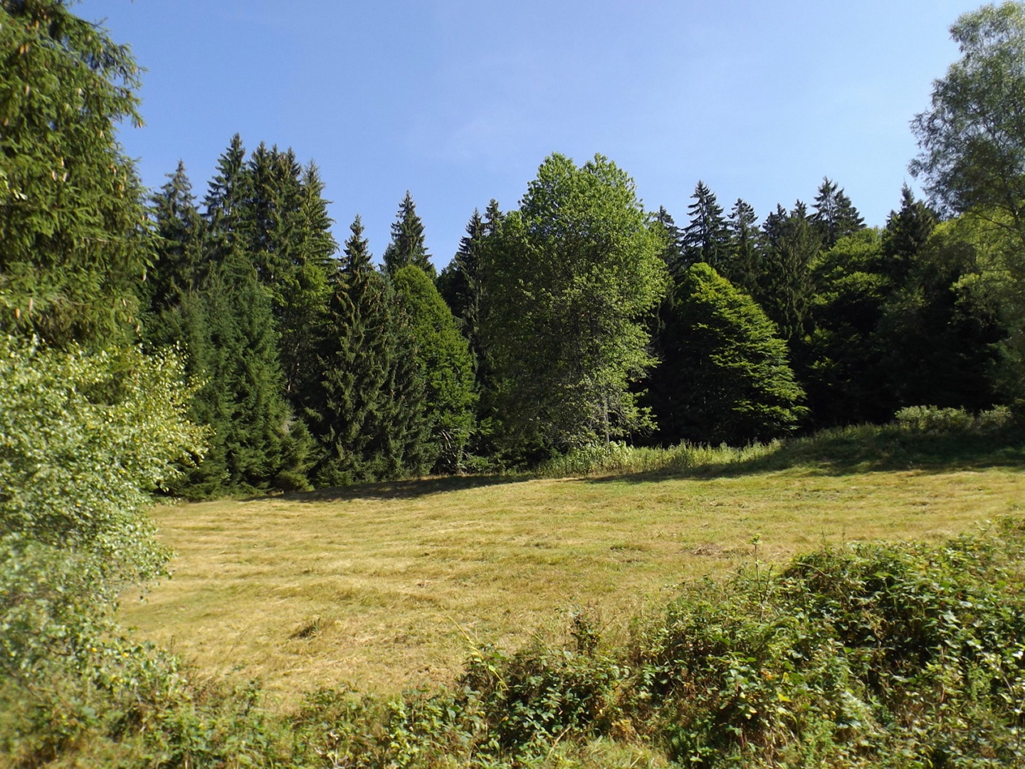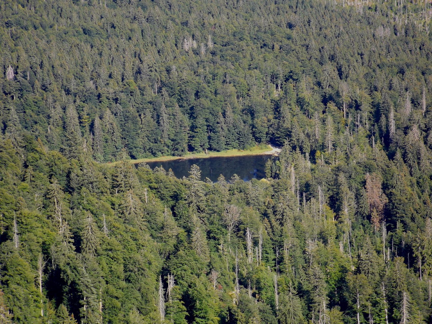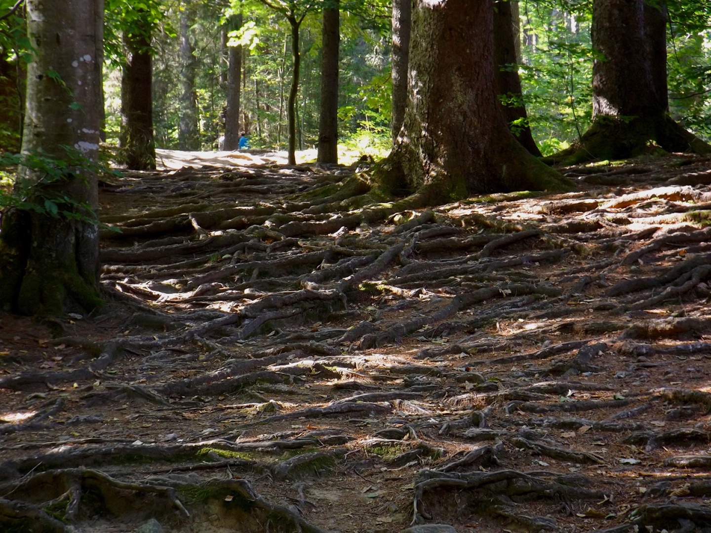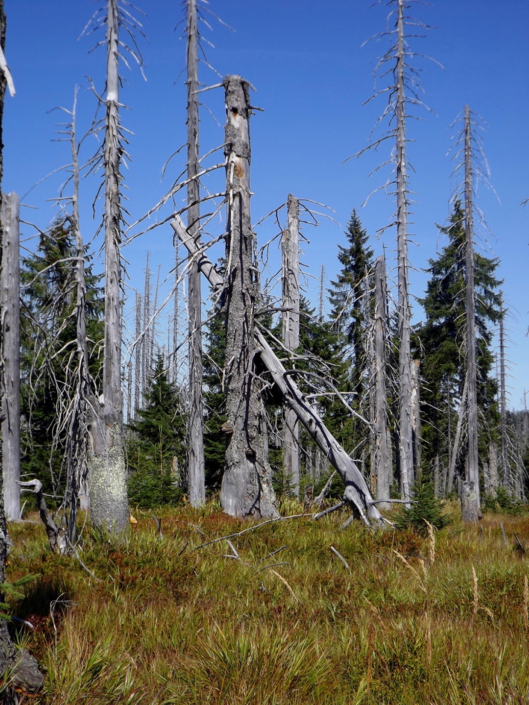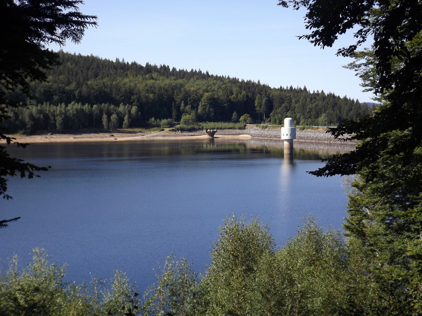 Am Parkplatz unterhalb der Trinkwassertalsperre Frauenau war überraschend wenig Betrieb, so dass ich ganz vorne beim Infopavillion parken konnte. Von dort ging es erst einmal auf einem wurzeligen Waldsteig vorbei an Betriebsgebäuden hinauf zur Dammkrone. Laut Infotafel war der Staudamm bei seiner Errichtung 1984 der höchste in Deutschland, ob er es jetzt noch ist, weiß ich nicht, und ich bin auch zu faul, jetzt während des Schreibens nachzuschauen. Man könnte von hier aus geradeaus weitergehen und auf einem markierten wohl Waldsteig entlang der Südseite zum östlichen Ende und zur Schachtenstraße kommen, ich versprach mir aber von der Nordseite (und auch der Staumauer selbst) aus interessante Blicke auf den Rachel und seine nördlichen Kämme. Von der Mauer aus gab es die auch, dazu kamen sehr schöne Blicke Richtung Zwiesel und ins Arbergebiet. Details können den Fotos entnommen werden. Während der 20 Minuten, die ich für die nicht mal soooooo lange Strecke über die Mauer brauchte, wurde ich nicht nur von Radfahrern, sondern auch von einem leeren Holztransporter überholt, die Nordseite gehört scheinbar nicht ganz zur Nationalpark-Kernzone. Leider setzt sich die Asphaltstraße nach der Staumauer noch eine ganze Weile fort, ich war bis weit hinter dem Ende des Stausees auf diesem ungeliebten Untergrund unterwegs. Naja, wenigstens konnte ich die meiste Strecke auf dem breiten Grasstreifen neben der Fahrstraße gehen, also war es nicht ganz so schlimm. Die Aussicht von der Nordseite war dann auch nicht so überragend, weil zwischen Straße und See ein doch etwa zehn Meter breiter Waldstreifen steht, der nicht vom Borkenkäfer zerfressen wurde. Am einen oder anderen Seitenbach gibt es eine kleine Schneise, die aber selten gute Fotomotive erlaubte. Ganz hinten stand früher einmal die kleine Siedlung Hirschbach, von der nicht mal mehr Grundmauern oder Brennesselfelder übrig sind. Dafür steht an dieser Stelle ein Unterstandshütterl, eine Infotafel und zwei Rastbänke. Die Wiese zum See hin war frisch gemäht, eigentlich Betreten verboten, aber für ein paar Fotos habe ich mich jeweils einen Meter hinter die Verbotsschilder gewagt. An der Südostecke des Sees kommt schließlich der Kleine Regen herunter, den ich im Laufe der Tour noch mehrere Male überqueren sollte. Bis zum Schachten (ohne differenzierenden Beinamen), an dessen unterem Ende der direkte Steig zum Rachel rechts abzweigt, ging es jetzt sanft bergauf, der Belag wechselte zu Schotter, ich wurde weiterhin von Radfahrern und einem Auto des Nationalparks überholt. Auch am Schachten war das Gras ziemlich kurz, aber zumindest weggeräumt, oder gehört dieser Schachten zu denjenigen, die in diesem Sommer wieder beweidet wurden? Zumindest ist die Diensthütte in einem sehr guten Zustand und am Nebengebäude standen Gerätschaften herum. Ich hielt mich aber nicht wirklich auf, sondern folgte weiterhin dem Wegweiser zum Verlorenen Schachten, dessen Zeitangabe wenig konsistent ist. Etwas oberhalb des Schachtens trennen sich Rad- und Fußweg und ich durfte auf einem sehr schönen breiten Waldpfad, der auch Judenweg genannt wird, weiter nach oben steigen. Auf diese Weise bekam ich zwar die Regenschwelle nicht zu Gesicht, aber das lässt sich ja einmal nachholen. Bald kreuzte der Fußweg den Radweg und vereinigte sich mit dem Goldsteig, der in der entgegengesetzten Richtung vom Hochschachten herunterkommt und hier zum Rachel abzweigt. Auf diesem blieb ich bis zum Verlorenen Schachten, einem der interessantesten Orte der Gegend. Er gehört nicht zum Nationalpark, sondern ist seit Jahrhunderten ununterbrochen im Besitz der gleichen (lokalen) Adelsfamilie, zieht sich hinüber bis zur Grenze (hinauf ist an dieser Stelle nicht ganz richtig, da das Gelände doch recht flach ist) und beheimatet die größte zusammenhängende Seegrasfläche aller Schachten im Bayerischen Wald. Was ich trotz intensiver Suche immer noch nicht herausgefunden habe, ist die Herkunft seines Namens. Daran, dass man hier verloren wäre, kann es nicht liegen, weil die Aussage so nicht stimmt. Immerhin steht hier eine kleine Hütte, die dem Bayerwaldverein Frauenau gehört und auch deutliche Signale einer gelegentlichen Nutzung zeigt. Hier machte ich meine erste größere Pause und genoss ein Wurst-Käse-Brot (die ersten beiden Apfelvierterln habe ich schon vorher gegessen, ich muss aber nicht jedes im Text notieren). Anschließend nahm ich den wieder einmal genussvollsten Teil der Wanderung unter die Füße, den Grenzsteig. Dieser führte mich zunächst etwa 80 Höhenmeter hinunter zur Brückerl über den Bach, der an dieser Stelle seinen Namen von Malá Řezná in Kleiner Regen ändert. Gleich nach der Überquerung begegnete ich zu meiner totalen Überraschung einem Wanderer, der vom Rachel herunterkam und den Steig unterhalb des Verlorenen Schachtens hinüber zum Goldsteig suchte. Ich hatte da nicht sonderlich aufgepasst und konnte ihm nicht wirklich weiterhelfen. Im weiteren Verlauf wechselte der Grenzsteig mehrfach seinen Charakter, es wurde mal trocken-moosig, mal richtig sumpfig (immerhin führt die Grenze in diesem Bereich mitten durch einige der schönsten Filze des Böhmerwaldes), dann musste wieder eine kleine Felsformation umgangen werden. An einer Stelle war der Grenzsteig übelst durch umgestürzte Bäume verlegt, aber auch hier fand ich eine Umgehung. Überraschenderweise, und hier unterscheidet sich dieser Abschnitt von dem, den ich vor fünf Wochen gegangen war, führten weite Strecken durch feinste Heidelbeersträucher, die auch noch gut mit sehr leckeren Früchten gefüllt waren. Ich habe zwar irgendwann mal in der Nationalparkverordnung gelesen, dass in der Kernzone nichts gepflückt werden darf, aber das bezieht sich eher auf Blumen. Außerdem habe ich ja nicht gesammelt, sondern nur genascht, und ich kann mir nicht vorstellen, dass mich ein Ranger zum Hungern zwingen würde, wenn mehr als genug Beeren für alle Vögel, Wildtiere und Wander