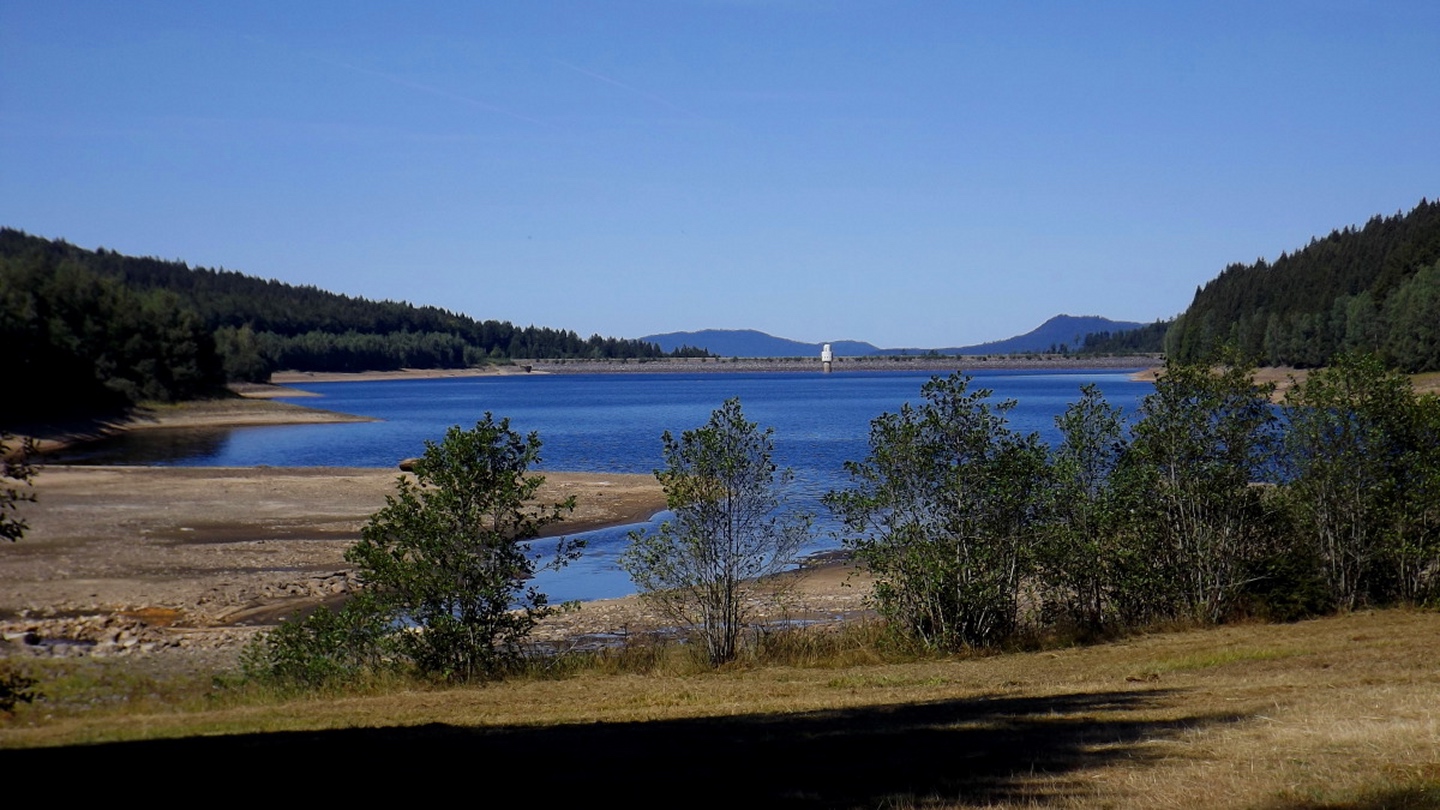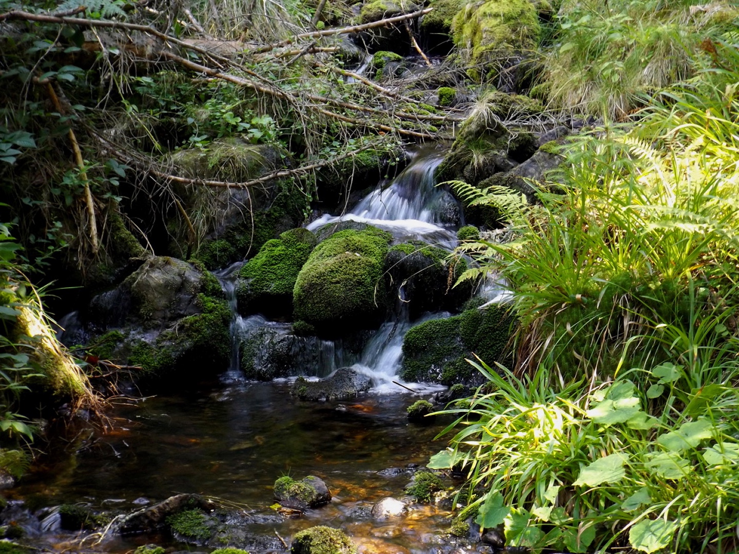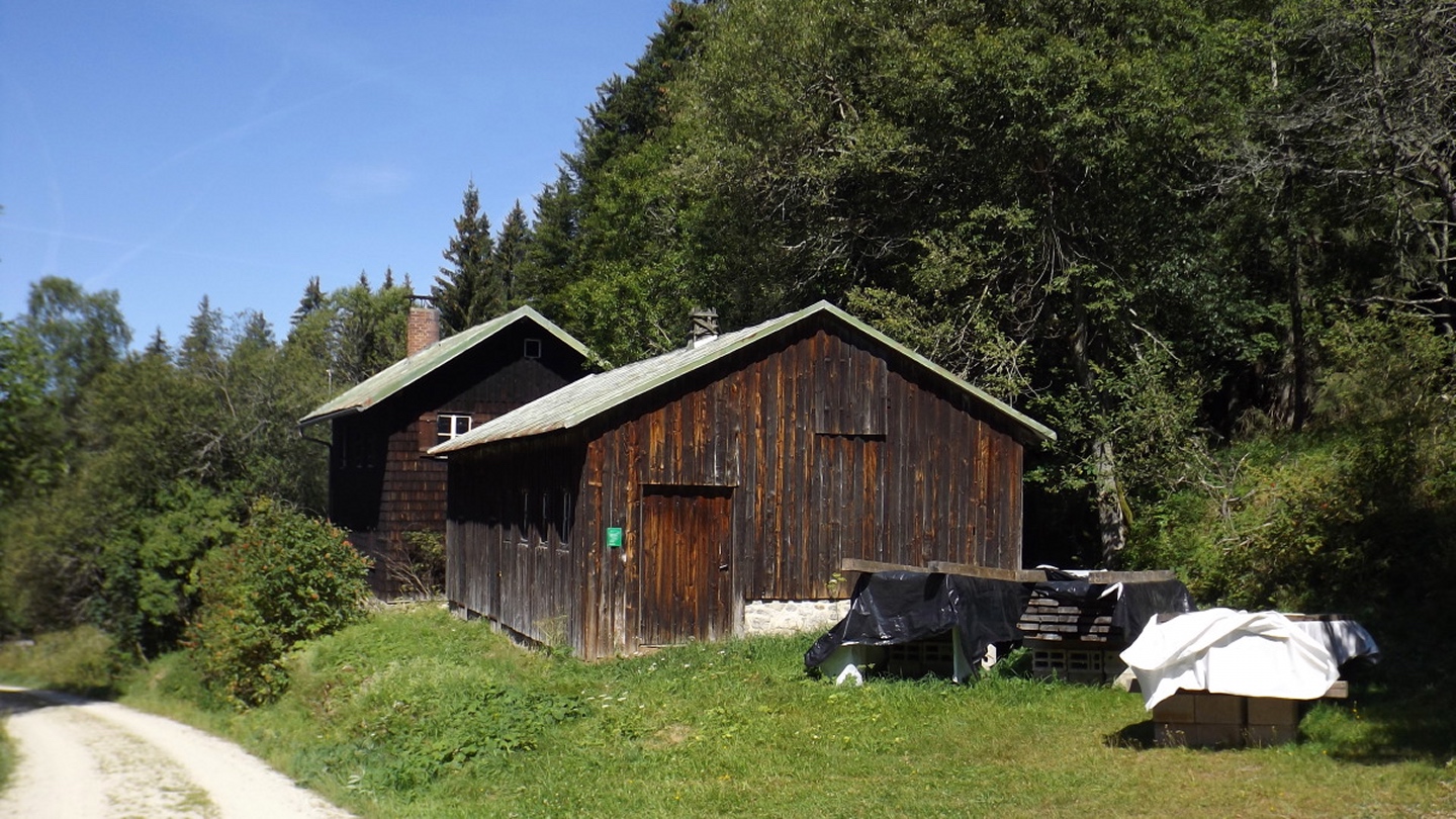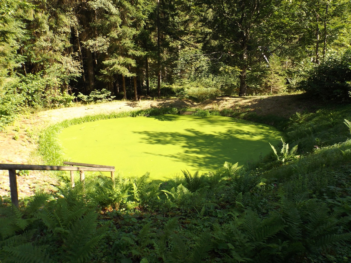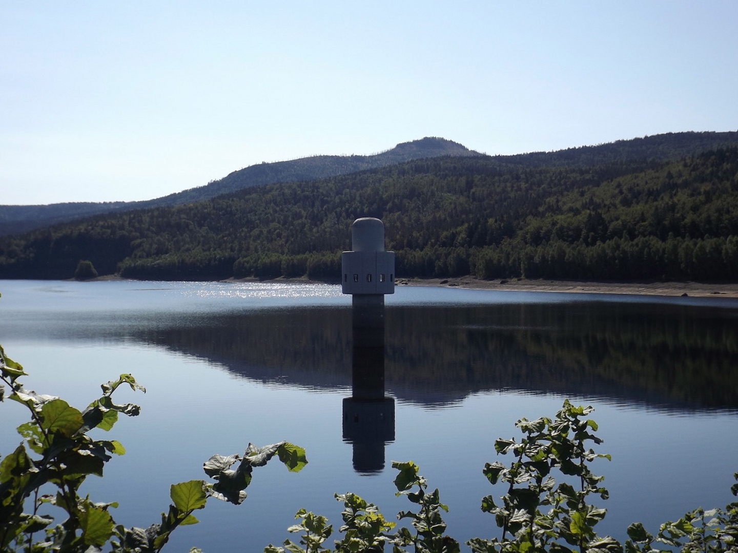 Am Parkplatz unterhalb der Trinkwassertalsperre Frauenau war überraschend wenig Betrieb, so dass ich ganz vorne beim Infopavillion parken konnte. Von dort ging es erst einmal auf einem wurzeligen Waldsteig vorbei an Betriebsgebäuden hinauf zur Dammkrone. Laut Infotafel war der Staudamm bei seiner Errichtung 1984 der höchste in Deutschland, ob er es jetzt noch ist, weiß ich nicht, und ich bin auch zu faul, jetzt während des Schreibens nachzuschauen. Man könnte von hier aus geradeaus weitergehen und auf einem markierten wohl Waldsteig entlang der Südseite zum östlichen Ende und zur Schachtenstraße kommen, ich versprach mir aber von der Nordseite (und auch der Staumauer selbst) aus interessante Blicke auf den Rachel und seine nördlichen Kämme. Von der Mauer aus gab es die auch, dazu kamen sehr schöne Blicke Richtung Zwiesel und ins Arbergebiet. Details können den Fotos entnommen werden. Während der 20 Minuten, die ich für die nicht mal soooooo lange Strecke über die Mauer brauchte, wurde ich nicht nur von Radfahrern, sondern auch von einem leeren Holztransporter überholt, die Nordseite gehört scheinbar nicht ganz zur Nationalpark-Kernzone. Leider setzt sich die Asphaltstraße nach der Staumauer noch eine ganze Weile fort, ich war bis weit hinter dem Ende des Stausees auf diesem ungeliebten Untergrund unterwegs. Naja, wenigstens konnte ich die meiste Strecke auf dem breiten Grasstreifen neben der Fahrstraße gehen, also war es nicht ganz so schlimm. Die Aussicht von der Nordseite war dann auch nicht so überragend, weil zwischen Straße und See ein doch etwa zehn Meter breiter Waldstreifen steht, der nicht vom Borkenkäfer zerfressen wurde. Am einen oder anderen Seitenbach gibt es eine kleine Schneise, die aber selten gute Fotomotive erlaubte. Ganz hinten stand früher einmal die kleine Siedlung Hirschbach, von der nicht mal mehr Grundmauern oder Brennesselfelder übrig sind. Dafür steht an dieser Stelle ein Unterstandshütterl, eine Infotafel und zwei Rastbänke. Die Wiese zum See hin war frisch gemäht, eigentlich Betreten verboten, aber für ein paar Fotos habe ich mich jeweils einen Meter hinter die Verbotsschilder gewagt. An der Südostecke des Sees kommt schließlich der Kleine Regen herunter, den ich im Laufe der Tour noch mehrere Male überqueren sollte. Bis zum Schachten (ohne differenzierenden Beinamen), an dessen unterem Ende der direkte Steig zum Rachel rechts abzweigt, ging es jetzt sanft bergauf, der Belag wechselte zu Schotter, ich wurde weiterhin von Radfahrern und einem Auto des Nationalparks überholt. Auch am Schachten war das Gras ziemlich kurz, aber zumindest weggeräumt, oder gehört dieser Schachten zu denjenigen, die in diesem Sommer wieder beweidet wurden? Zumindest ist die Diensthütte in einem sehr guten Zustand und am Nebengebäude standen Gerätschaften herum. Ich hielt mich aber nicht wirklich auf, sondern folgte weiterhin dem Wegweiser zum Verlorenen Schachten, dessen Zeitangabe wenig konsistent ist. Etwas oberhalb des Schachtens trennen sich Rad- und Fußweg und ich durfte auf einem sehr schönen breiten Waldpfad, der auch Judenweg genannt wird, weiter nach oben steigen. Auf diese Weise bekam ich zwar die Regenschwelle nicht zu Gesicht, aber das lässt sich ja einmal nachholen. Bald kreuzte der Fußweg den Radweg und vereinigte sich mit dem Goldsteig, der in der entgegengesetzten Richtung vom Hochschachten herunterkommt und hier zum Rachel abzweigt. Auf diesem blieb ich bis zum Verlorenen Schachten, einem der interessantesten Orte der Gegend. Er gehört nicht zum Nationalpark, sondern ist seit Jahrhunderten ununterbrochen im Besitz der gleichen (lokalen) Adelsfamilie, zieht sich hinüber bis zur Grenze (hinauf ist an dieser Stelle nicht ganz richtig, da das Gelände doch recht flach ist) und beheimatet die größte zusammenhängende Seegrasfläche aller Schachten im Bayerischen Wald. Was ich trotz intensiver Suche immer noch nicht herausgefunden habe, ist die Herkunft seines Namens. Daran, dass man hier verloren wäre, kann es nicht liegen, weil die Aussage so nicht stimmt. Immerhin steht hier eine kleine Hütte, die dem Bayerwaldverein Frauenau gehört und auch deutliche Signale einer gelegentlichen Nutzung zeigt. Hier machte ich meine erste größere Pause und genoss ein Wurst-Käse-Brot (die ersten beiden Apfelvierterln habe ich schon vorher gegessen, ich muss aber nicht jedes im Text notieren). Anschließend nahm ich den wieder einmal genussvollsten Teil der Wanderung unter die Füße, den Grenzsteig. Dieser führte mich zunächst etwa 80 Höhenmeter hinunter zur Brückerl über den Bach, der an dieser Stelle seinen Namen von Malá Řezná in Kleiner Regen ändert. Gleich nach der Überquerung begegnete ich zu meiner totalen Überraschung einem Wanderer, der vom Rachel herunterkam und den Steig unterhalb des Verlorenen Schachtens hinüber zum Goldsteig suchte. Ich hatte da nicht sonderlich aufgepasst und konnte ihm nicht wirklich weiterhelfen. Im weiteren Verlauf wechselte der Grenzsteig mehrfach seinen Charakter, es wurde mal trocken-moosig, mal richtig sumpfig (immerhin führt die Grenze in diesem Bereich mitten durch einige der schönsten Filze des Böhmerwaldes), dann musste wieder eine kleine Felsformation umgangen werden. An einer Stelle war der Grenzsteig übelst durch umgestürzte Bäume verlegt, aber auch hier fand ich eine Umgehung. Überraschenderweise, und hier unterscheidet sich dieser Abschnitt von dem, den ich vor fünf Wochen gegangen war, führten weite Strecken durch feinste Heidelbeersträucher, die auch noch gut mit sehr leckeren Früchten gefüllt waren. Ich habe zwar irgendwann mal in der Nationalparkverordnung gelesen, dass in der Kernzone nichts gepflückt werden darf, aber das bezieht sich eher auf Blumen. Außerdem habe ich ja nicht gesammelt, sondern nur genascht, und ich kann mir nicht vorstellen, dass mich ein Ranger zum Hungern zwingen würde, wenn mehr als genug Beeren für alle Vögel, Wildtiere und Wander