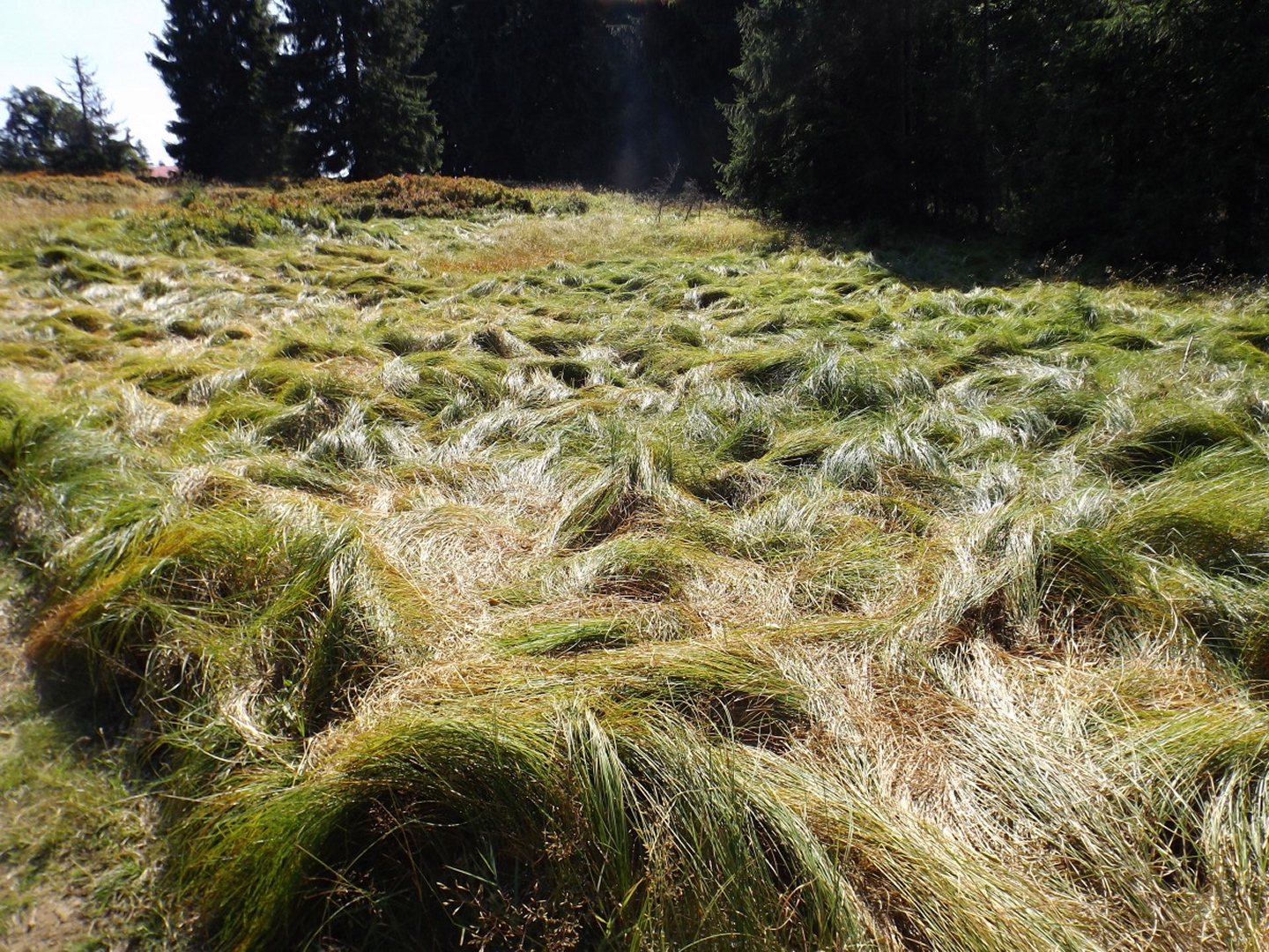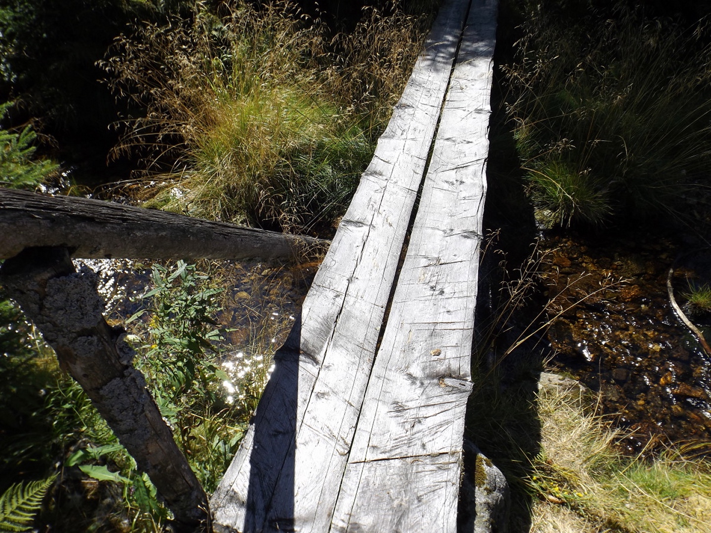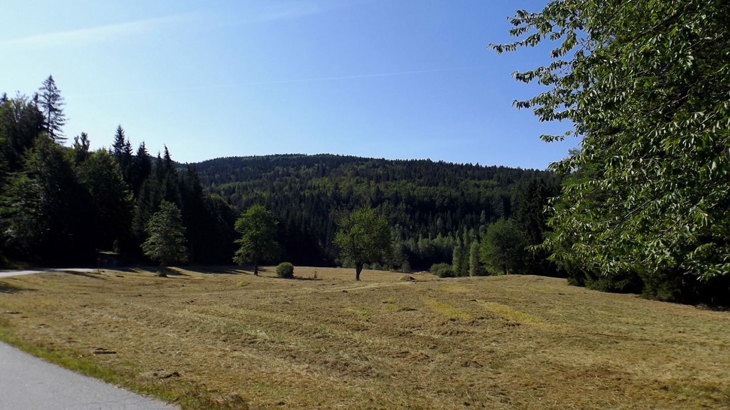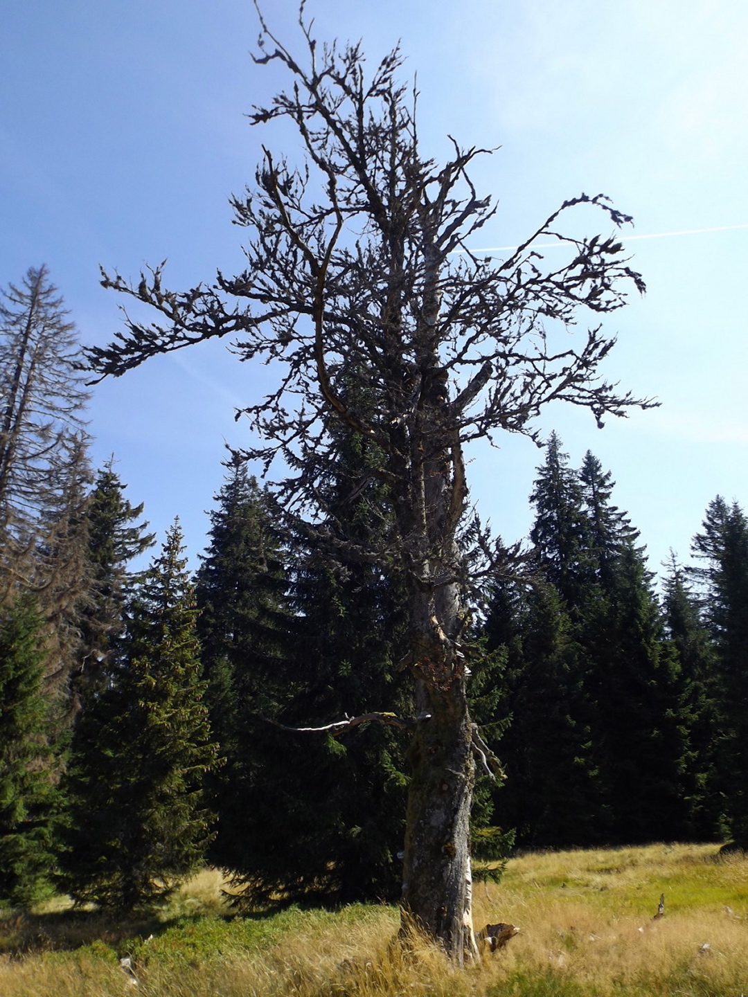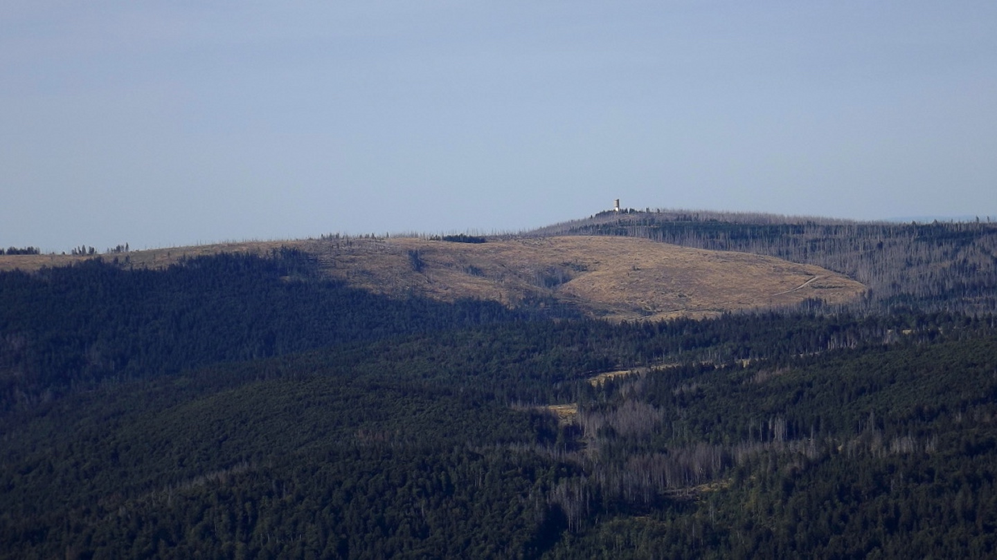 Am Parkplatz unterhalb der Trinkwassertalsperre Frauenau war überraschend wenig Betrieb, so dass ich ganz vorne beim Infopavillion parken konnte. Von dort ging es erst einmal auf einem wurzeligen Waldsteig vorbei an Betriebsgebäuden hinauf zur Dammkrone. Laut Infotafel war der Staudamm bei seiner Errichtung 1984 der höchste in Deutschland, ob er es jetzt noch ist, weiß ich nicht, und ich bin auch zu faul, jetzt während des Schreibens nachzuschauen. Man könnte von hier aus geradeaus weitergehen und auf einem markierten wohl Waldsteig entlang der Südseite zum östlichen Ende und zur Schachtenstraße kommen, ich versprach mir aber von der Nordseite (und auch der Staumauer selbst) aus interessante Blicke auf den Rachel und seine nördlichen Kämme. Von der Mauer aus gab es die auch, dazu kamen sehr schöne Blicke Richtung Zwiesel und ins Arbergebiet. Details können den Fotos entnommen werden. Während der 20 Minuten, die ich für die nicht mal soooooo lange Strecke über die Mauer brauchte, wurde ich nicht nur von Radfahrern, sondern auch von einem leeren Holztransporter überholt, die Nordseite gehört scheinbar nicht ganz zur Nationalpark-Kernzone. Leider setzt sich die Asphaltstraße nach der Staumauer noch eine ganze Weile fort, ich war bis weit hinter dem Ende des Stausees auf diesem ungeliebten Untergrund unterwegs. Naja, wenigstens konnte ich die meiste Strecke auf dem breiten Grasstreifen neben der Fahrstraße gehen, also war es nicht ganz so schlimm. Die Aussicht von der Nordseite war dann auch nicht so überragend, weil zwischen Straße und See ein doch etwa zehn Meter breiter Waldstreifen steht, der nicht vom Borkenkäfer zerfressen wurde. Am einen oder anderen Seitenbach gibt es eine kleine Schneise, die aber selten gute Fotomotive erlaubte. Ganz hinten stand früher einmal die kleine Siedlung Hirschbach, von der nicht mal mehr Grundmauern oder Brennesselfelder übrig sind. Dafür steht an dieser Stelle ein Unterstandshütterl, eine Infotafel und zwei Rastbänke. Die Wiese zum See hin war frisch gemäht, eigentlich Betreten verboten, aber für ein paar Fotos habe ich mich jeweils einen Meter hinter die Verbotsschilder gewagt. An der Südostecke des Sees kommt schließlich der Kleine Regen herunter, den ich im Laufe der Tour noch mehrere Male überqueren sollte. Bis zum Schachten (ohne differenzierenden Beinamen), an dessen unterem Ende der direkte Steig zum Rachel rechts abzweigt, ging es jetzt sanft bergauf, der Belag wechselte zu Schotter, ich wurde weiterhin von Radfahrern und einem Auto des Nationalparks überholt. Auch am Schachten war das Gras ziemlich kurz, aber zumindest weggeräumt, oder gehört dieser Schachten zu denjenigen, die in diesem Sommer wieder beweidet wurden? Zumindest ist die Diensthütte in einem sehr guten Zustand und am Nebengebäude standen Gerätschaften herum. Ich hielt mich aber nicht wirklich auf, sondern folgte weiterhin dem Wegweiser zum Verlorenen Schachten, dessen Zeitangabe wenig konsistent ist. Etwas oberhalb des Schachtens trennen sich Rad- und Fußweg und ich durfte auf einem sehr schönen breiten Waldpfad, der auch Judenweg genannt wird, weiter nach oben steigen. Auf diese Weise bekam ich zwar die Regenschwelle nicht zu Gesicht, aber das lässt sich ja einmal nachholen. Bald kreuzte der Fußweg den Radweg und vereinigte sich mit dem Goldsteig, der in der entgegengesetzten Richtung vom Hochschachten herunterkommt und hier zum Rachel abzweigt. Auf diesem blieb ich bis zum Verlorenen Schachten, einem der interessantesten Orte der Gegend. Er gehört nicht zum Nationalpark, sondern ist seit Jahrhunderten ununterbrochen im Besitz der gleichen (lokalen) Adelsfamilie, zieht sich hinüber bis zur Grenze (hinauf ist an dieser Stelle nicht ganz richtig, da das Gelände doch recht flach ist) und beheimatet die größte zusammenhängende Seegrasfläche aller Schachten im Bayerischen Wald. Was ich trotz intensiver Suche immer noch nicht herausgefunden habe, ist die Herkunft seines Namens. Daran, dass man hier verloren wäre, kann es nicht liegen, weil die Aussage so nicht stimmt. Immerhin steht hier eine kleine Hütte, die dem Bayerwaldverein Frauenau gehört und auch deutliche Signale einer gelegentlichen Nutzung zeigt. Hier machte ich meine erste größere Pause und genoss ein Wurst-Käse-Brot (die ersten beiden Apfelvierterln habe ich schon vorher gegessen, ich muss aber nicht jedes im Text notieren). Anschließend nahm ich den wieder einmal genussvollsten Teil der Wanderung unter die Füße, den Grenzsteig. Dieser führte mich zunächst etwa 80 Höhenmeter hinunter zur Brückerl über den Bach, der an dieser Stelle seinen Namen von Malá Řezná in Kleiner Regen ändert. Gleich nach der Überquerung begegnete ich zu meiner totalen Überraschung einem Wanderer, der vom Rachel herunterkam und den Steig unterhalb des Verlorenen Schachtens hinüber zum Goldsteig suchte. Ich hatte da nicht sonderlich aufgepasst und konnte ihm nicht wirklich weiterhelfen. Im weiteren Verlauf wechselte der Grenzsteig mehrfach seinen Charakter, es wurde mal trocken-moosig, mal richtig sumpfig (immerhin führt die Grenze in diesem Bereich mitten durch einige der schönsten Filze des Böhmerwaldes), dann musste wieder eine kleine Felsformation umgangen werden. An einer Stelle war der Grenzsteig übelst durch umgestürzte Bäume verlegt, aber auch hier fand ich eine Umgehung. Überraschenderweise, und hier unterscheidet sich dieser Abschnitt von dem, den ich vor fünf Wochen gegangen war, führten weite Strecken durch feinste Heidelbeersträucher, die auch noch gut mit sehr leckeren Früchten gefüllt waren. Ich habe zwar irgendwann mal in der Nationalparkverordnung gelesen, dass in der Kernzone nichts gepflückt werden darf, aber das bezieht sich eher auf Blumen. Außerdem habe ich ja nicht gesammelt, sondern nur genascht, und ich kann mir nicht vorstellen, dass mich ein Ranger zum Hungern zwingen würde, wenn mehr als genug Beeren für alle Vögel, Wildtiere und Wander