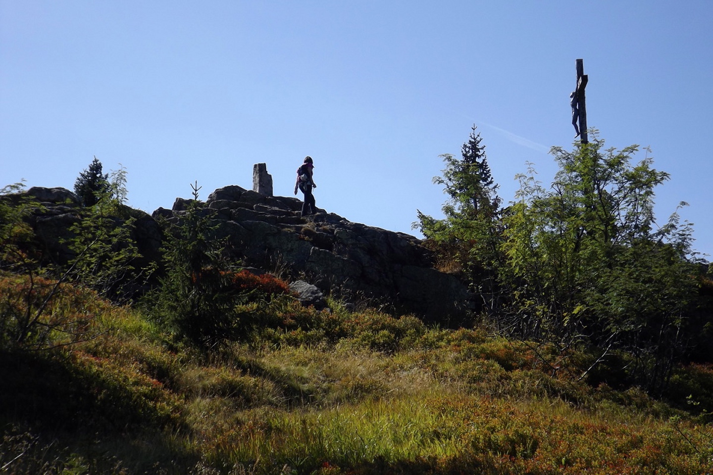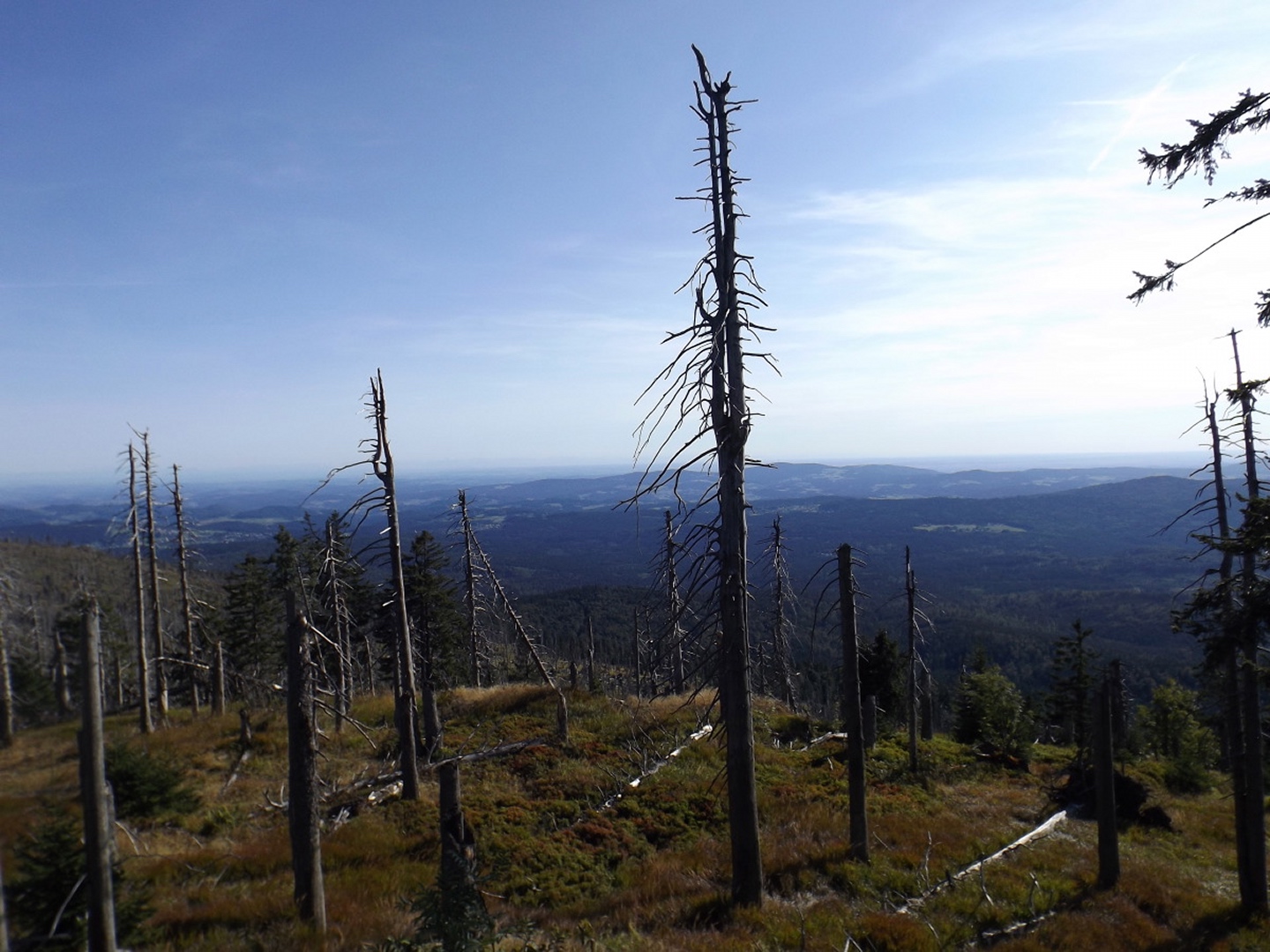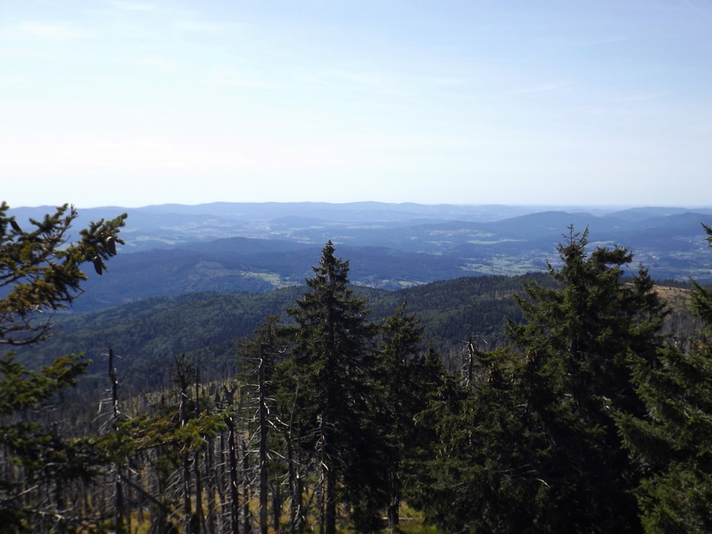 Ich habe ja vor fünf Wochen die Lusenüberschreitung vollmundig als meine Königstour für 2015 bezeichnet. Irgendwie stimmt das schon noch, aber weit entfernt war die Rachelüberschreitung genusstechnisch auch nicht. In einer Hinsicht war sie auf jeden Fall einfacher, nämlich vom Logistischen. Ich ging am gleichen Ort los, an den ich am Abend zurückkam, und konnte deshalb mit dem Auto direkt hinfahren und hatte keinen Stress mit Bussen. Zudem gibt es wohl keinen anderen Berg im Bayerischen Wald, der derart als Synonym für den Charakter des Nationalparks stehen könnte wie der Rachel: Doppelgipfelig, wild, weite Zustiegswege und ursprünglich geblieben. So ganz nebenbei gibt es dort auch keinen höheren, weil der Arber ja deutlich außerhalb der Nationalparkgrenzen liegt. Genussmindernd war hingegen die Tatsache, dass ich bei AKW und bis zu 25 Grad mein Kopftuch vergessen hatte und somit suboptimal vor der Sonne geschützt war. Aber dafür kann ja die Strecke nichts.