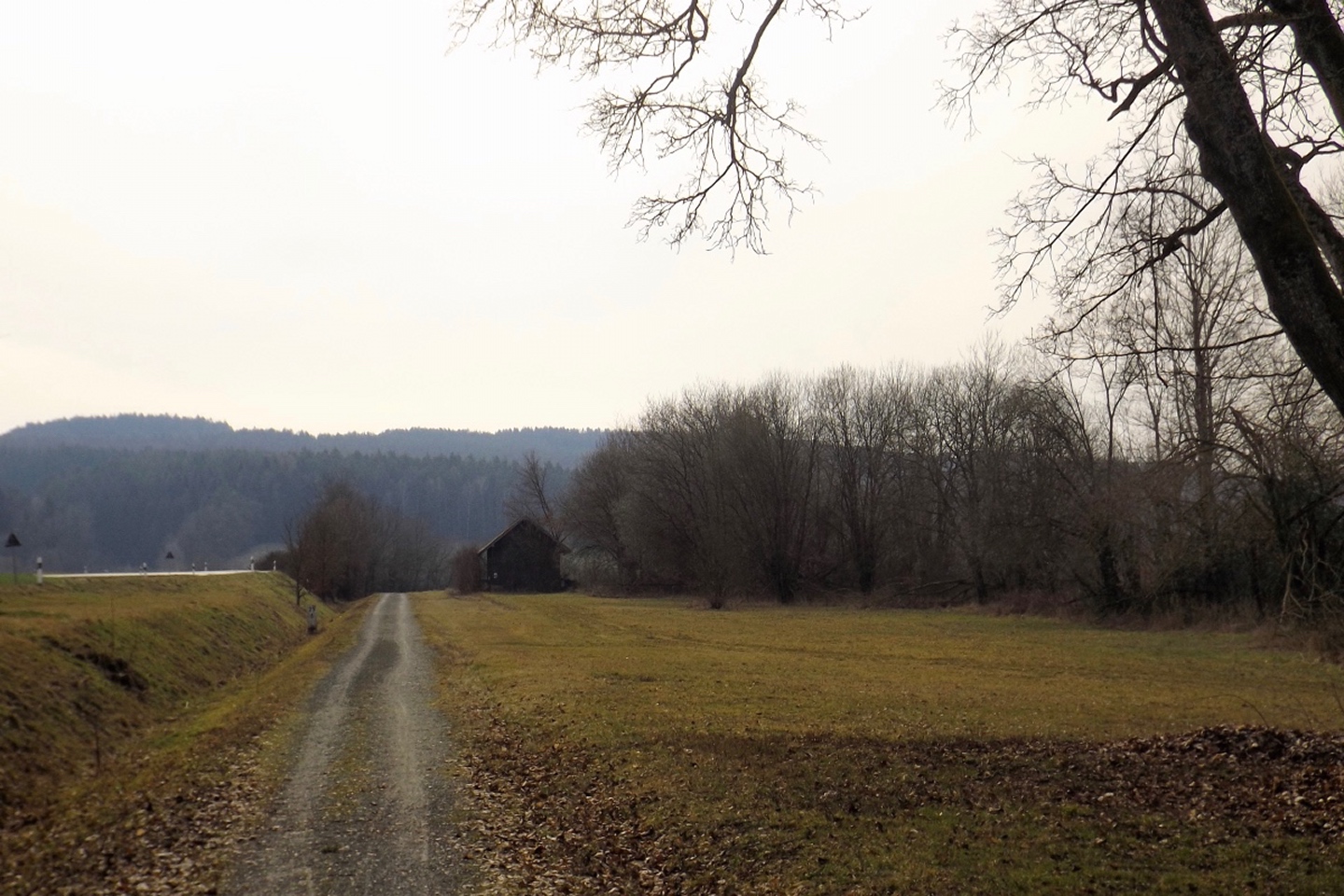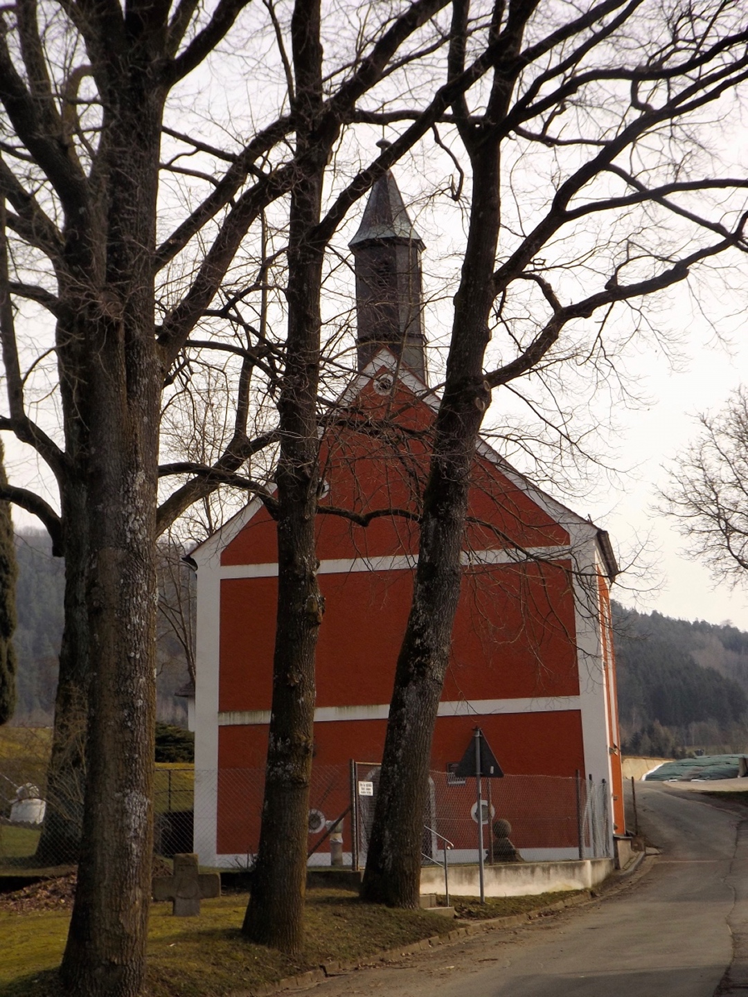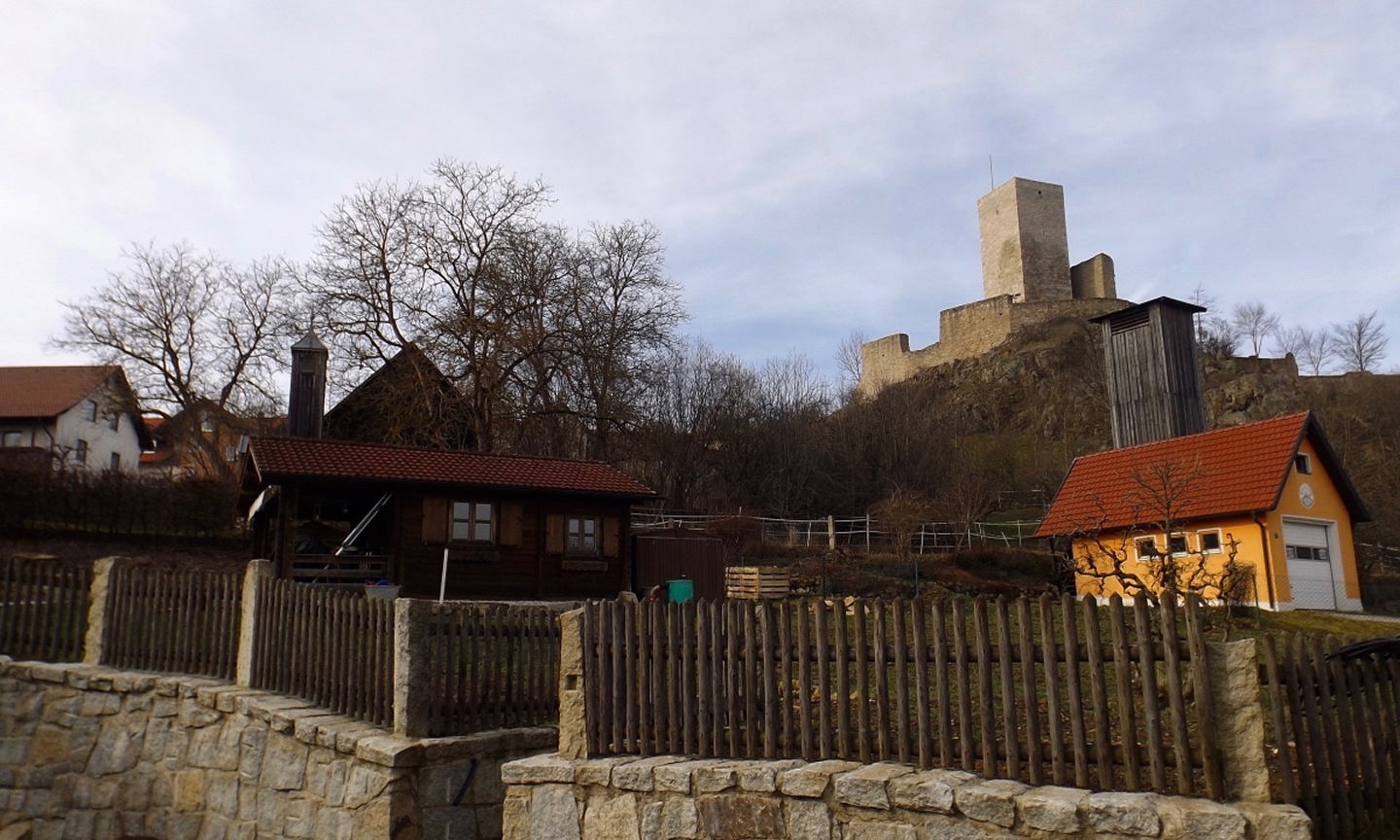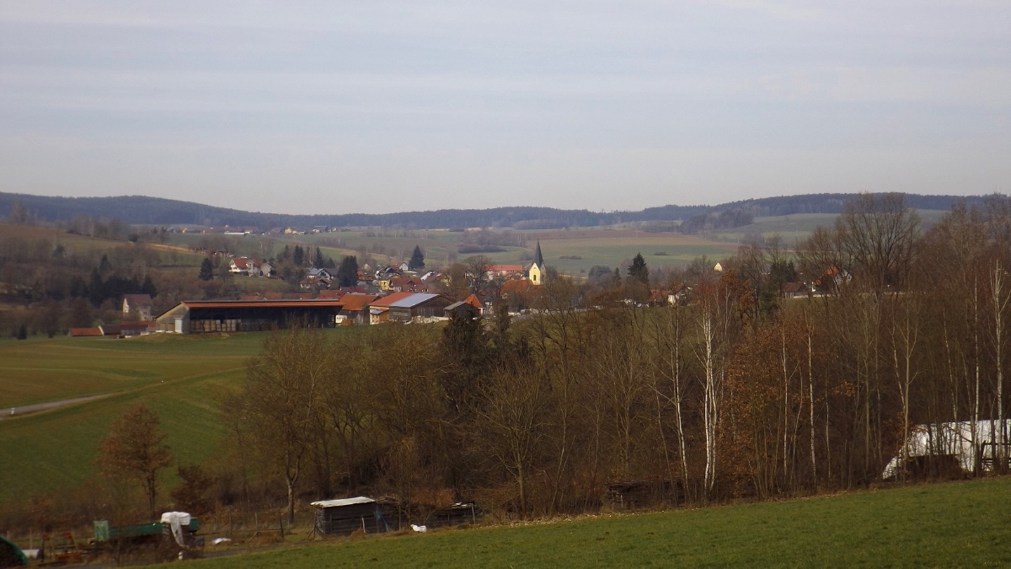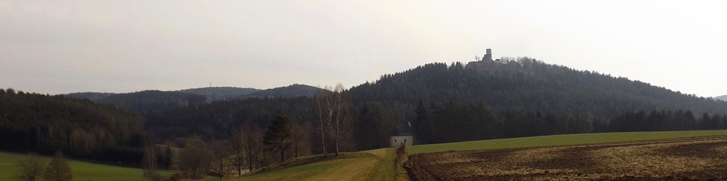 An der Kirche gibt es tatsächlich zwei Parkplätze, die auch frei waren, also konnte ich kurz nach halb eins losmarschieren. Der erste Abschnitt ist etwas kritisch, weil am Straßenrand der Kreisstraße Richtung Dieterskirchen entlang bis zum ehemaligen Bahnhof. Ab hier bewegte ich mich auf markierten Wegen, zunächst dem Karl-Krampol-Weg hinauf Richtung Obermurach. Dieser verlässt nach 100 Metern den Flurbereinigungsweg, was suboptimal markiert ist. Deshalb übersah ich auch den Abzweig und ging zu weit. Das war aber nicht weiter schlimm, weil es ein paar schöne Fotos ins untere Murachtal ergab und ich von einem Bankerl aus über eine Wiese zum markierten Weg, der mittlerweile im Wald verlief, zurückkehren konnte. Weiter oben unterlief mir noch eine Fehlinterpretation der Markierungen, die aber wenig problematisch war, weil ich nur einen parallelen Forstpfad aufstieg. Vielleicht entgingen mir dadurch zum Ausgleich wieder drei Fotos. In Obermurach angekommen, schaute ich bei jedem Haus genau auf die Hausnummer, es hätte ja der Burgwart mit dem Schlüssel sein können. Dieser wohnt jedoch fast am unteren Ortseingang von Oberviechtach her, also genau da, wo ich überhaupt nicht vobeikam. Folglich stand ich vor dem verschlossenen Burgtor und musste mich auf Bilder durch die Torstäbe beschränken. Ob sich der Bergfried rentiert hätte, war sowieso fraglich, zum AKW fehlte die klare Sicht. Zum nächsten Wegabschnitt ist ernsthafte Kritik an der Wanderabteilung des TSV Oberviechtach fällig: Der permanente Wanderweg ist zwar wunderbar markiert, nur stimmt leider der auf der Vereinsseite herunterladbare GPS-Track nicht (mehr) mit dem realen Wegverlauf überein. Ich verließ mich auf diesen Track und landete auf privatem Gartengrund. Gut, dass mich niemand dabei gesehen hat. Zurück auf dem richtigen Weg war ich auf dem Goldsteig angekommen und folgte diesem wieder hinunter ins Steinbachtal, wo ich einer Dame mit Hund begegnete, die Staatsstraße überquerte und die nächste Diskrepanz zwischen Markierung und Track feststellte. Nach einem Anstieg auf dem tatsächlich markierten Weg kreuzte der Sautreiberweg, auf dem ich über Antelsdorf nach Niedermurach zurückkehrte. Zwischendrin bog ich noch links zur Walburgakapelle ab, die auch wesentlich kürzer aus dem Tal erreichbar gewesen wäre, aber dann hätte ich etwa 200 Meter entlang der ordentlich befahrenen Straße gehen müssen, und darauf hatte ich wirklich keine Lust. Bei der Kapelle wiederholte sich die Szene vom Burgtor: verschlossen, und dieses Mal kein Hinweis auf eine Schlüsselabholstelle. Das war mir aber auch schon egal, weil ich so zwei Minuten mehr Zeit für den letzten Kilometer hinunter zum Auto hatte, die ich für ein paar schöne Panoramafotos nutzte.