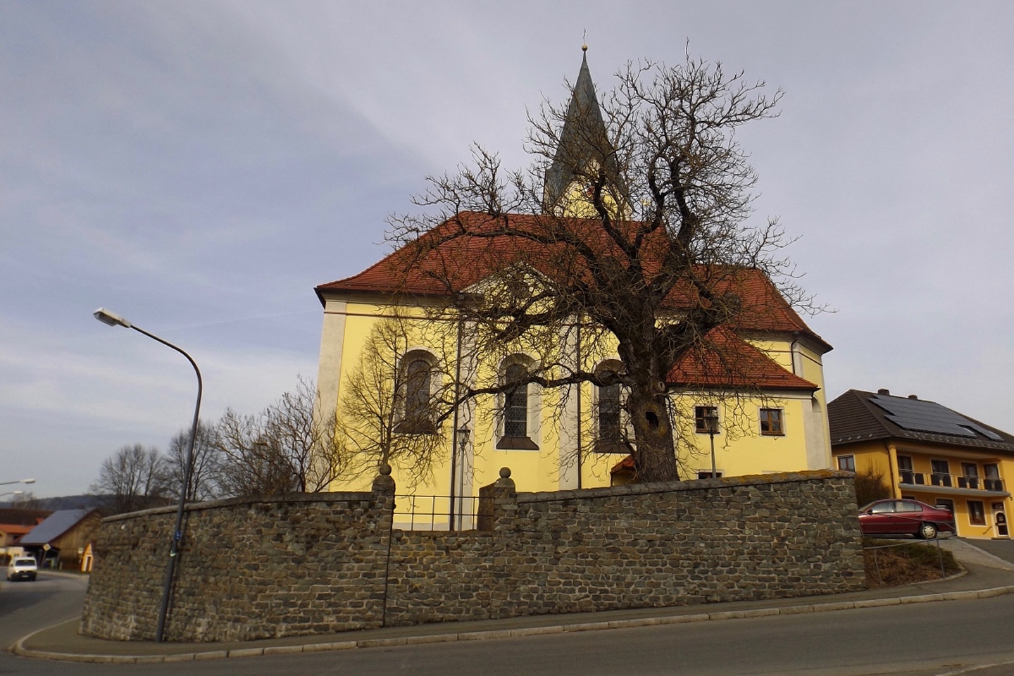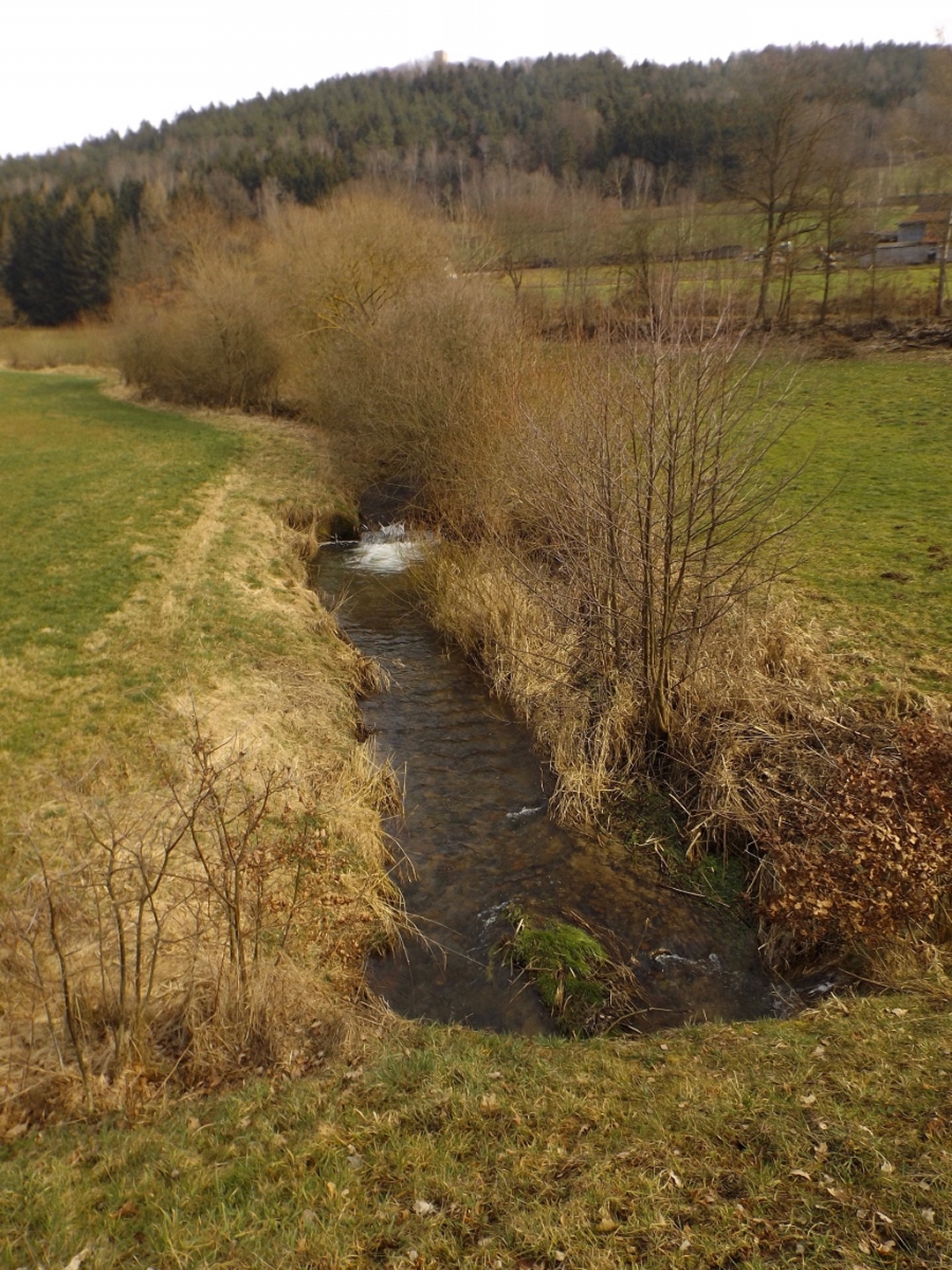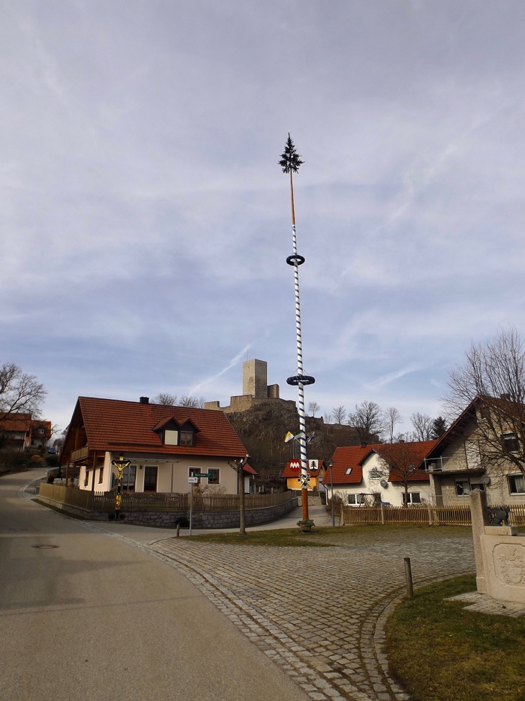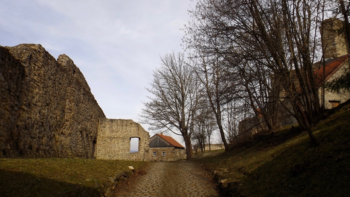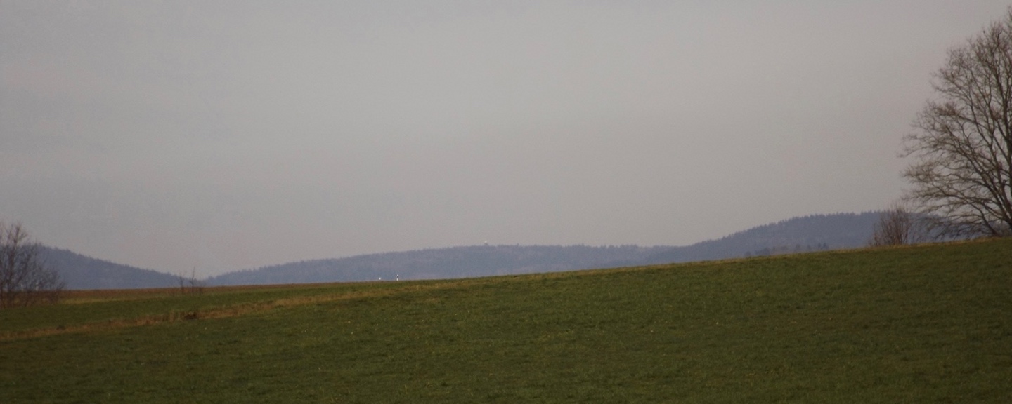 An der Kirche gibt es tatsächlich zwei Parkplätze, die auch frei waren, also konnte ich kurz nach halb eins losmarschieren. Der erste Abschnitt ist etwas kritisch, weil am Straßenrand der Kreisstraße Richtung Dieterskirchen entlang bis zum ehemaligen Bahnhof. Ab hier bewegte ich mich auf markierten Wegen, zunächst dem Karl-Krampol-Weg hinauf Richtung Obermurach. Dieser verlässt nach 100 Metern den Flurbereinigungsweg, was suboptimal markiert ist. Deshalb übersah ich auch den Abzweig und ging zu weit. Das war aber nicht weiter schlimm, weil es ein paar schöne Fotos ins untere Murachtal ergab und ich von einem Bankerl aus über eine Wiese zum markierten Weg, der mittlerweile im Wald verlief, zurückkehren konnte. Weiter oben unterlief mir noch eine Fehlinterpretation der Markierungen, die aber wenig problematisch war, weil ich nur einen parallelen Forstpfad aufstieg. Vielleicht entgingen mir dadurch zum Ausgleich wieder drei Fotos. In Obermurach angekommen, schaute ich bei jedem Haus genau auf die Hausnummer, es hätte ja der Burgwart mit dem Schlüssel sein können. Dieser wohnt jedoch fast am unteren Ortseingang von Oberviechtach her, also genau da, wo ich überhaupt nicht vobeikam. Folglich stand ich vor dem verschlossenen Burgtor und musste mich auf Bilder durch die Torstäbe beschränken. Ob sich der Bergfried rentiert hätte, war sowieso fraglich, zum AKW fehlte die klare Sicht. Zum nächsten Wegabschnitt ist ernsthafte Kritik an der Wanderabteilung des TSV Oberviechtach fällig: Der permanente Wanderweg ist zwar wunderbar markiert, nur stimmt leider der auf der Vereinsseite herunterladbare GPS-Track nicht (mehr) mit dem realen Wegverlauf überein. Ich verließ mich auf diesen Track und landete auf privatem Gartengrund. Gut, dass mich niemand dabei gesehen hat. Zurück auf dem richtigen Weg war ich auf dem Goldsteig angekommen und folgte diesem wieder hinunter ins Steinbachtal, wo ich einer Dame mit Hund begegnete, die Staatsstraße überquerte und die nächste Diskrepanz zwischen Markierung und Track feststellte. Nach einem Anstieg auf dem tatsächlich markierten Weg kreuzte der Sautreiberweg, auf dem ich über Antelsdorf nach Niedermurach zurückkehrte. Zwischendrin bog ich noch links zur Walburgakapelle ab, die auch wesentlich kürzer aus dem Tal erreichbar gewesen wäre, aber dann hätte ich etwa 200 Meter entlang der ordentlich befahrenen Straße gehen müssen, und darauf hatte ich wirklich keine Lust. Bei der Kapelle wiederholte sich die Szene vom Burgtor: verschlossen, und dieses Mal kein Hinweis auf eine Schlüsselabholstelle. Das war mir aber auch schon egal, weil ich so zwei Minuten mehr Zeit für den letzten Kilometer hinunter zum Auto hatte, die ich für ein paar schöne Panoramafotos nutzte.