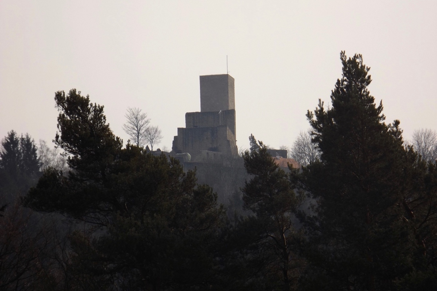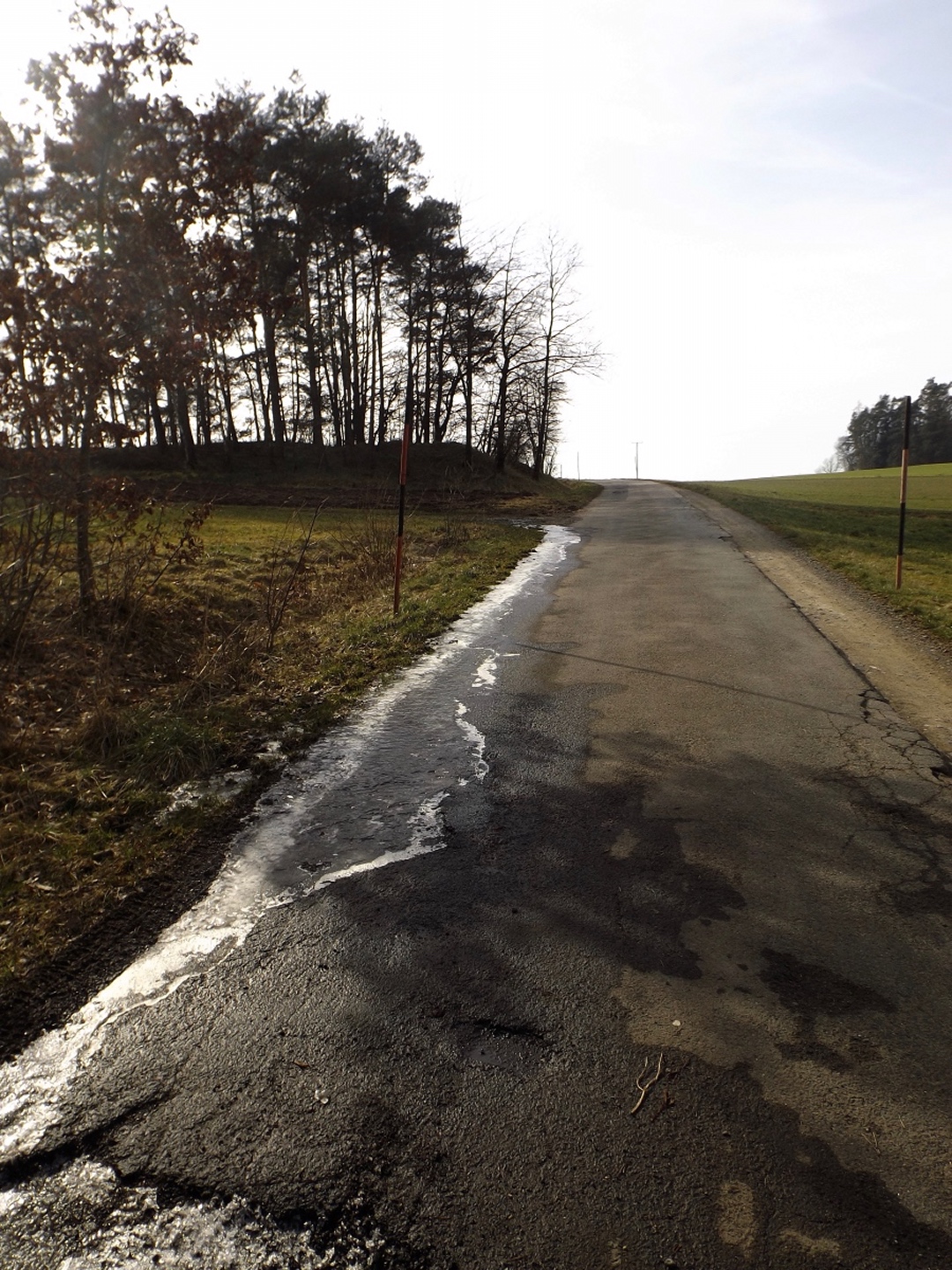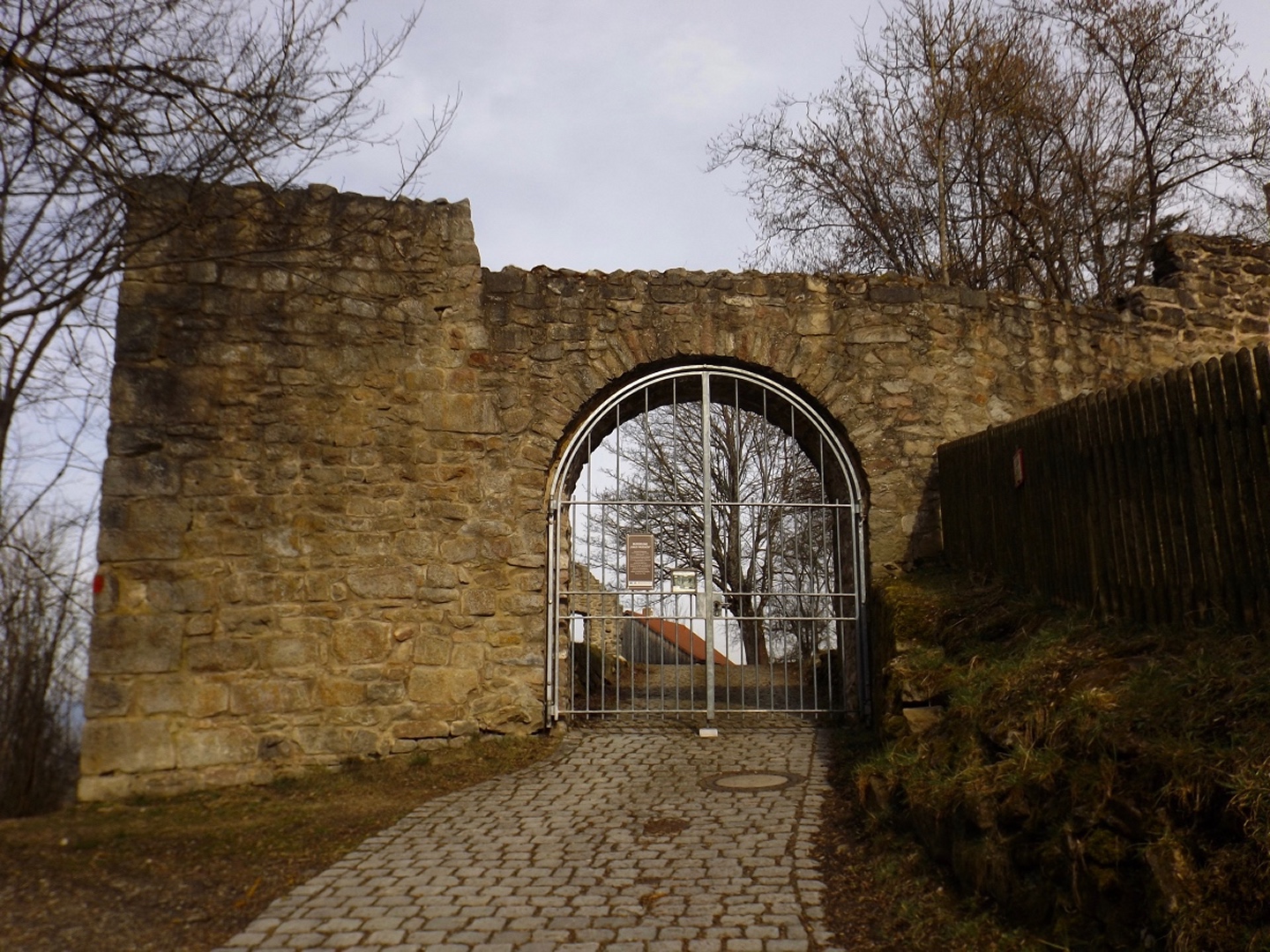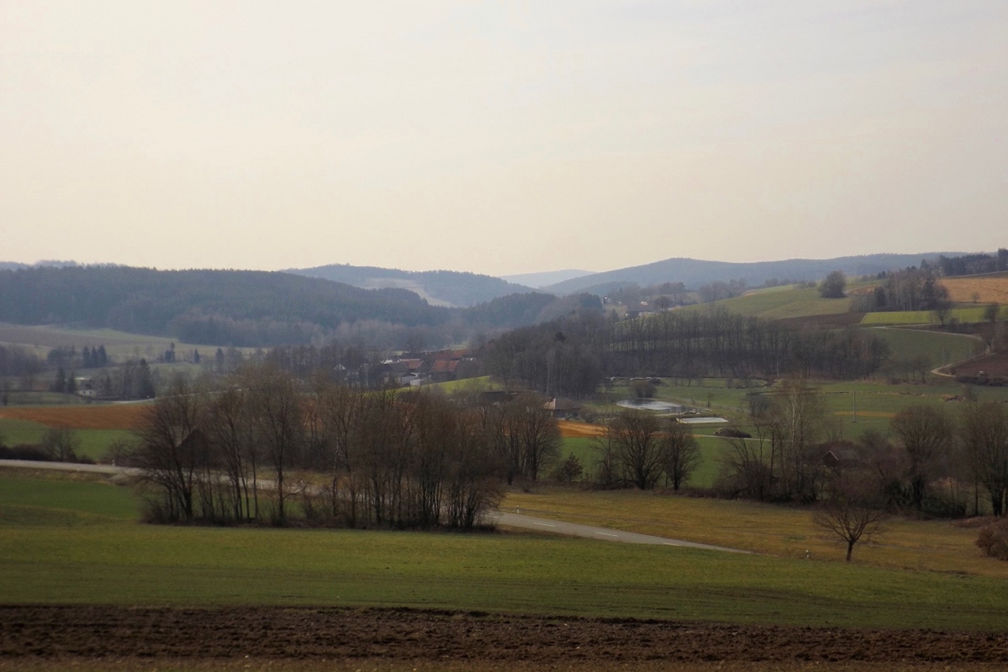 An der Kirche gibt es tatsächlich zwei Parkplätze, die auch frei waren, also konnte ich kurz nach halb eins losmarschieren. Der erste Abschnitt ist etwas kritisch, weil am Straßenrand der Kreisstraße Richtung Dieterskirchen entlang bis zum ehemaligen Bahnhof. Ab hier bewegte ich mich auf markierten Wegen, zunächst dem Karl-Krampol-Weg hinauf Richtung Obermurach. Dieser verlässt nach 100 Metern den Flurbereinigungsweg, was suboptimal markiert ist. Deshalb übersah ich auch den Abzweig und ging zu weit. Das war aber nicht weiter schlimm, weil es ein paar schöne Fotos ins untere Murachtal ergab und ich von einem Bankerl aus über eine Wiese zum markierten Weg, der mittlerweile im Wald verlief, zurückkehren konnte. Weiter oben unterlief mir noch eine Fehlinterpretation der Markierungen, die aber wenig problematisch war, weil ich nur einen parallelen Forstpfad aufstieg. Vielleicht entgingen mir dadurch zum Ausgleich wieder drei Fotos. In Obermurach angekommen, schaute ich bei jedem Haus genau auf die Hausnummer, es hätte ja der Burgwart mit dem Schlüssel sein können. Dieser wohnt jedoch fast am unteren Ortseingang von Oberviechtach her, also genau da, wo ich überhaupt nicht vobeikam. Folglich stand ich vor dem verschlossenen Burgtor und musste mich auf Bilder durch die Torstäbe beschränken. Ob sich der Bergfried rentiert hätte, war sowieso fraglich, zum AKW fehlte die klare Sicht. Zum nächsten Wegabschnitt ist ernsthafte Kritik an der Wanderabteilung des TSV Oberviechtach fällig: Der permanente Wanderweg ist zwar wunderbar markiert, nur stimmt leider der auf der Vereinsseite herunterladbare GPS-Track nicht (mehr) mit dem realen Wegverlauf überein. Ich verließ mich auf diesen Track und landete auf privatem Gartengrund. Gut, dass mich niemand dabei gesehen hat. Zurück auf dem richtigen Weg war ich auf dem Goldsteig angekommen und folgte diesem wieder hinunter ins Steinbachtal, wo ich einer Dame mit Hund begegnete, die Staatsstraße überquerte und die nächste Diskrepanz zwischen Markierung und Track feststellte. Nach einem Anstieg auf dem tatsächlich markierten Weg kreuzte der Sautreiberweg, auf dem ich über Antelsdorf nach Niedermurach zurückkehrte. Zwischendrin bog ich noch links zur Walburgakapelle ab, die auch wesentlich kürzer aus dem Tal erreichbar gewesen wäre, aber dann hätte ich etwa 200 Meter entlang der ordentlich befahrenen Straße gehen müssen, und darauf hatte ich wirklich keine Lust. Bei der Kapelle wiederholte sich die Szene vom Burgtor: verschlossen, und dieses Mal kein Hinweis auf eine Schlüsselabholstelle. Das war mir aber auch schon egal, weil ich so zwei Minuten mehr Zeit für den letzten Kilometer hinunter zum Auto hatte, die ich für ein paar schöne Panoramafotos nutzte.