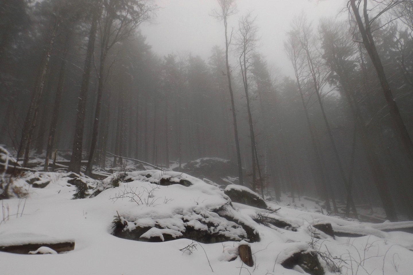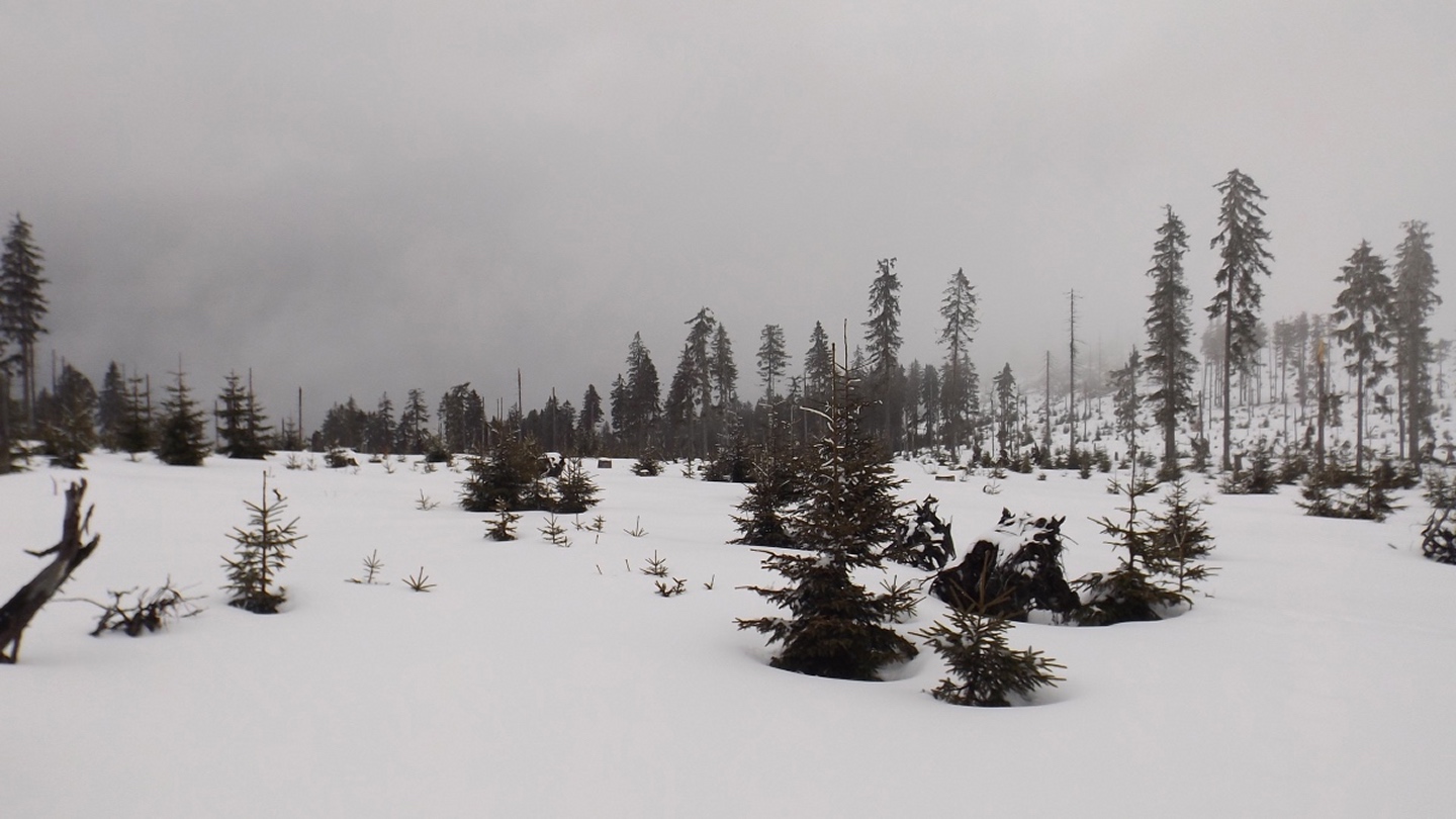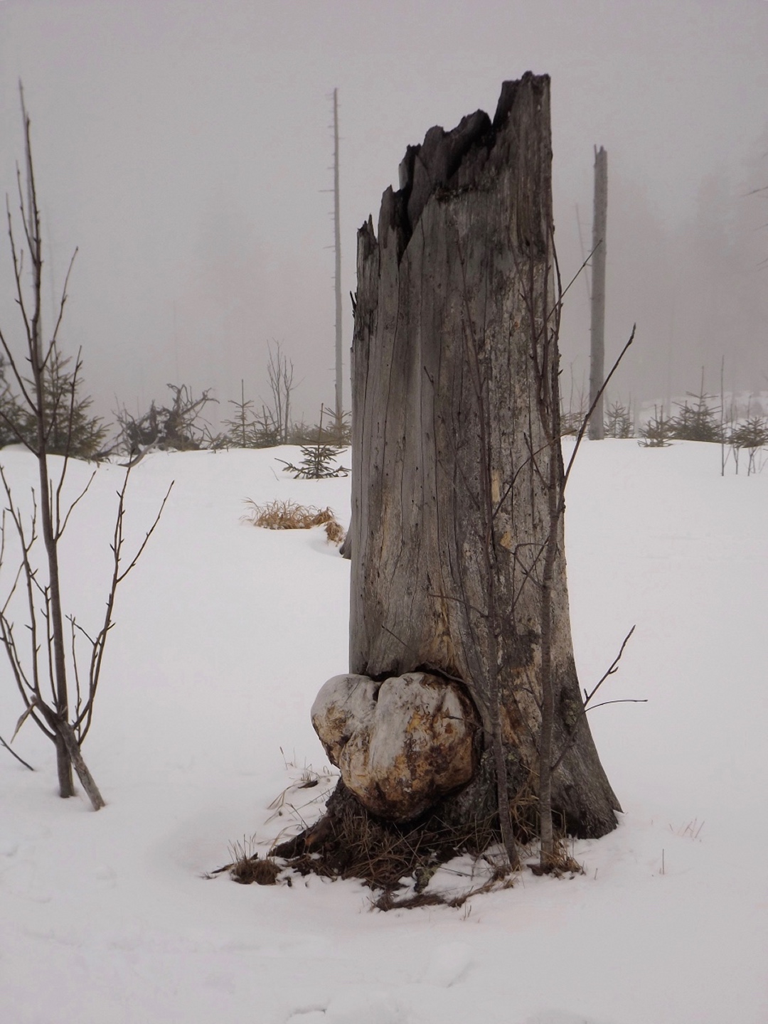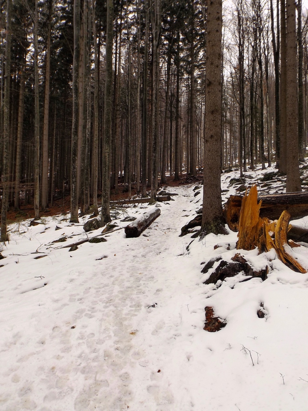 Los ging es kurz nach halb elf in Zwieslerwaldhaus von dem Parkplatz aus, der bereits im Oktober 2013 mein Startpunkt gewesen war. Seitdem ist der markierte Wanderweg von den Steinbachfällen weg auf den Adamsteig verlegt worden, so dass ich auch hier etwas Neues zu sehen bekam. Runterwärts ging es auf dem bekannten Weg über den Ruckowitzschachten und durch den Urwald Mittelsteighütte, allerdings ohne Abstecher durch das Höllbachgespreng, das erstens wegen der Wanderfalkenbrut gesperrt und zweitens bei Schnee im Abstieg kaum zu machen ist. Und Schnee hatte es genug, zwar nicht unten am Parkplatz, aber oberhalb von 900 Metern. War der Adamsteig noch gut ausgelatscht und dank des intakten Waldes auch nicht verweht, gestaltete sich die Sache in der Windwurfzone am Ruckwiesberg und auch weiter unten am Ruckowitzschachten ganz anders, 20 Zentimeter tiefe Einsinker waren keine Seltenheit. Wir waren aber gut ausgerüstet und auf die Verhältnisse vorbereitet und kamen exzellent zurecht. Weniger exzellent waren die Sichtverhältnisse, die Wolkenuntergrenze stieg zwar im Laufe des Tages leicht an, aber die umliegenden Gipfel waren ebenso wenig sichtbar wie der Zwieseler Winkel vom Gipfelkreuz aus. Dafür hatte Schutzhauswirt Michael wieder das üblich grandiose Pichelsteiner gekocht, welches wir uns alle vier herzhaft munden ließen. Milow musste mit einem Kauknochen vorlieb nehmen, tat dies aber ohne Murren und Betteln, da hat Karlie noch einen weiten Weg vor sich.