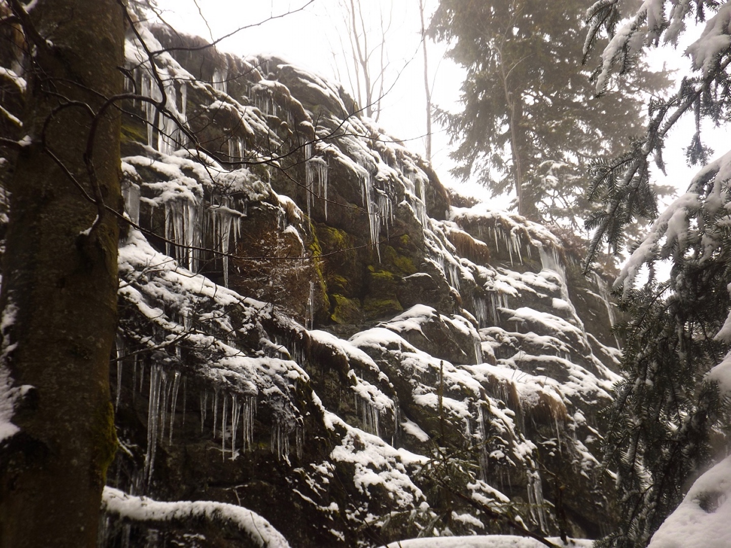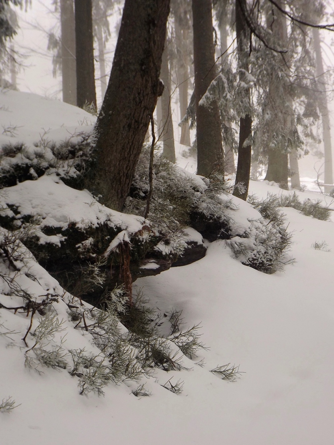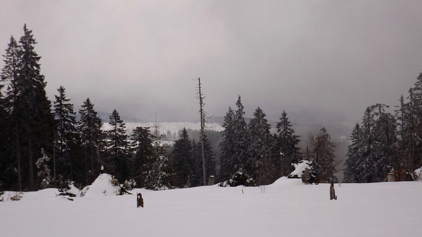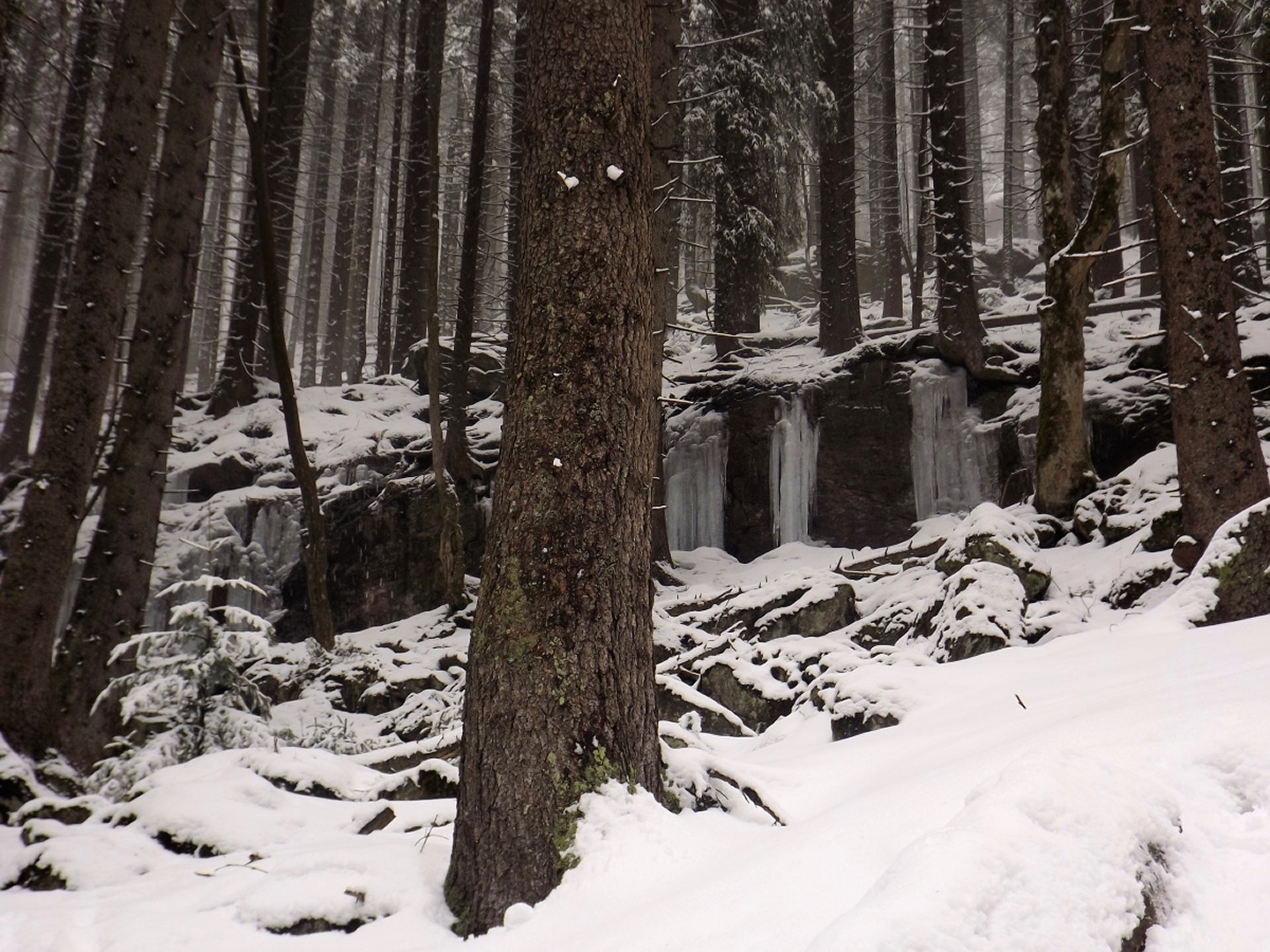 Los ging es kurz nach halb elf in Zwieslerwaldhaus von dem Parkplatz aus, der bereits im Oktober 2013 mein Startpunkt gewesen war. Seitdem ist der markierte Wanderweg von den Steinbachfällen weg auf den Adamsteig verlegt worden, so dass ich auch hier etwas Neues zu sehen bekam. Runterwärts ging es auf dem bekannten Weg über den Ruckowitzschachten und durch den Urwald Mittelsteighütte, allerdings ohne Abstecher durch das Höllbachgespreng, das erstens wegen der Wanderfalkenbrut gesperrt und zweitens bei Schnee im Abstieg kaum zu machen ist. Und Schnee hatte es genug, zwar nicht unten am Parkplatz, aber oberhalb von 900 Metern. War der Adamsteig noch gut ausgelatscht und dank des intakten Waldes auch nicht verweht, gestaltete sich die Sache in der Windwurfzone am Ruckwiesberg und auch weiter unten am Ruckowitzschachten ganz anders, 20 Zentimeter tiefe Einsinker waren keine Seltenheit. Wir waren aber gut ausgerüstet und auf die Verhältnisse vorbereitet und kamen exzellent zurecht. Weniger exzellent waren die Sichtverhältnisse, die Wolkenuntergrenze stieg zwar im Laufe des Tages leicht an, aber die umliegenden Gipfel waren ebenso wenig sichtbar wie der Zwieseler Winkel vom Gipfelkreuz aus. Dafür hatte Schutzhauswirt Michael wieder das üblich grandiose Pichelsteiner gekocht, welches wir uns alle vier herzhaft munden ließen. Milow musste mit einem Kauknochen vorlieb nehmen, tat dies aber ohne Murren und Betteln, da hat Karlie noch einen weiten Weg vor sich.