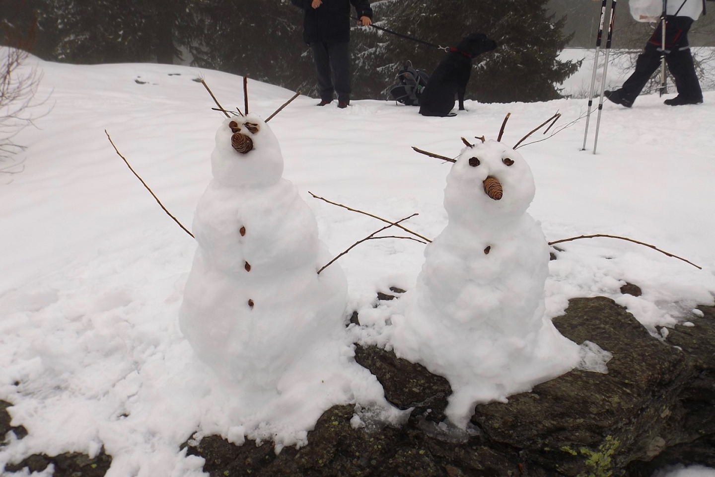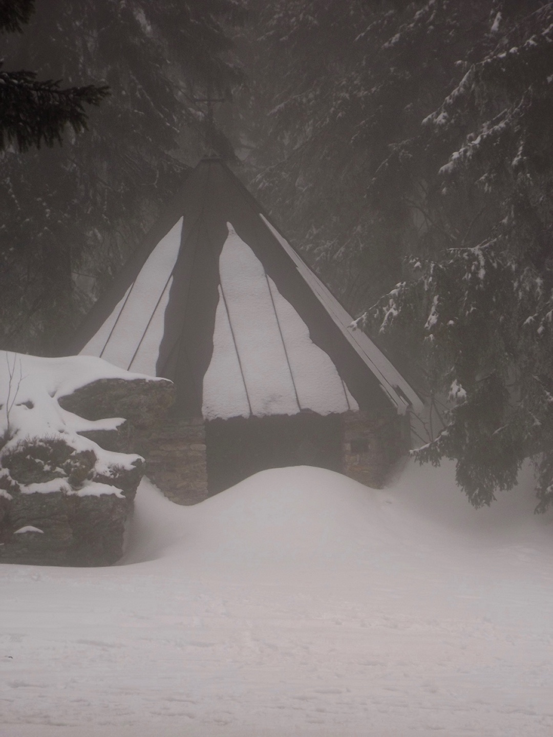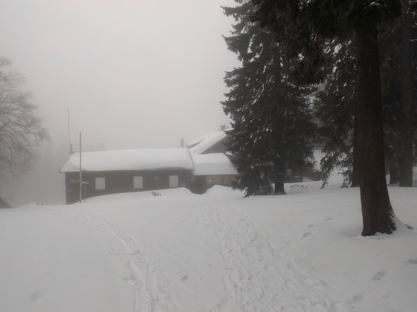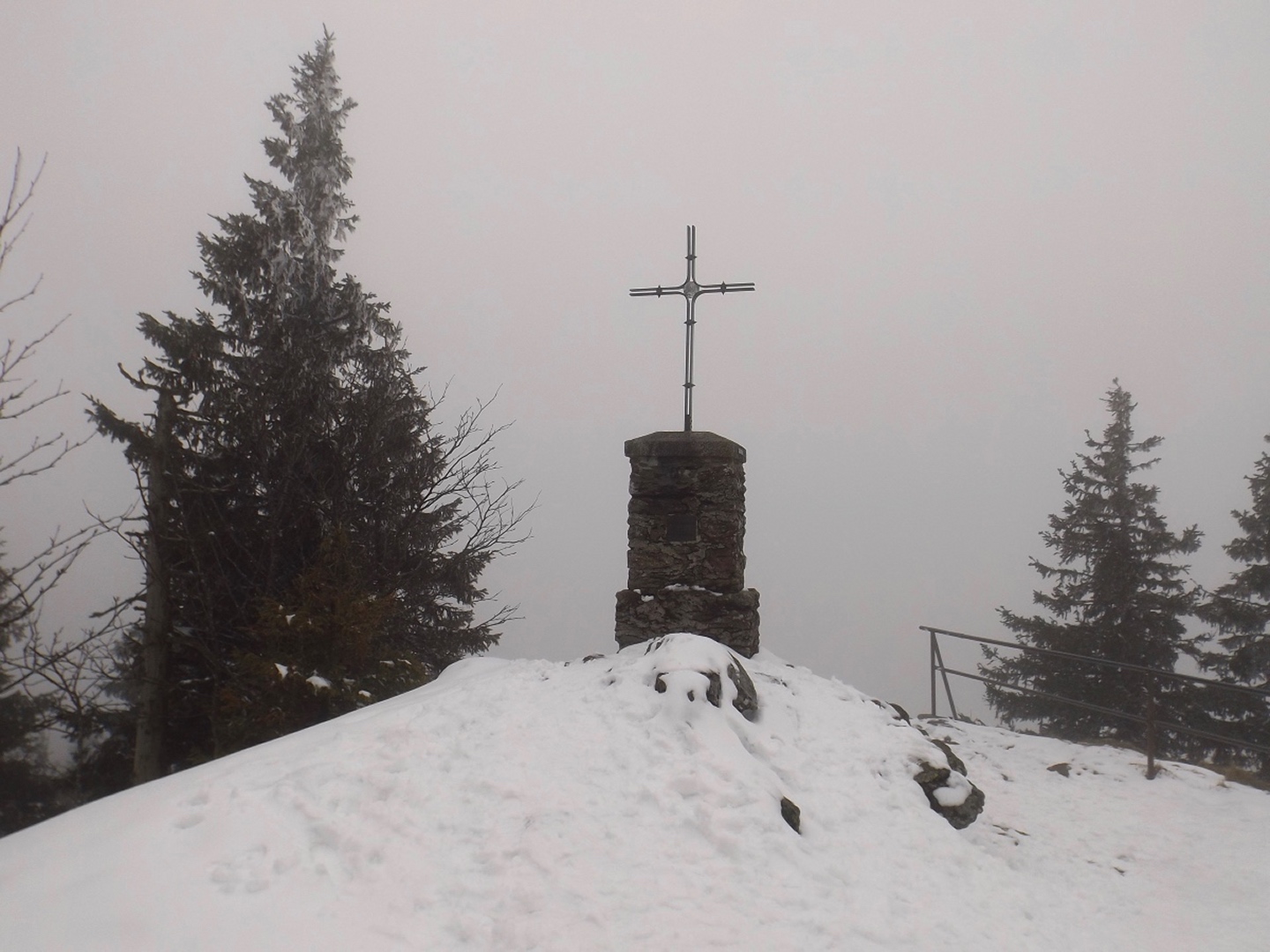Los ging es kurz nach halb elf in Zwieslerwaldhaus von dem Parkplatz aus, der bereits im Oktober 2013 mein Startpunkt gewesen war. Seitdem ist der markierte Wanderweg von den Steinbachfällen weg auf den Adamsteig verlegt worden, so dass ich auch hier etwas Neues zu sehen bekam. Runterwärts ging es auf dem bekannten Weg über den Ruckowitzschachten und durch den Urwald Mittelsteighütte, allerdings ohne Abstecher durch das Höllbachgespreng, das erstens wegen der Wanderfalkenbrut gesperrt und zweitens bei Schnee im Abstieg kaum zu machen ist. Und Schnee hatte es genug, zwar nicht unten am Parkplatz, aber oberhalb von 900 Metern. War der Adamsteig noch gut ausgelatscht und dank des intakten Waldes auch nicht verweht, gestaltete sich die Sache in der Windwurfzone am Ruckwiesberg und auch weiter unten am Ruckowitzschachten ganz anders, 20 Zentimeter tiefe Einsinker waren keine Seltenheit. Wir waren aber gut ausgerüstet und auf die Verhältnisse vorbereitet und kamen exzellent zurecht. Weniger exzellent waren die Sichtverhältnisse, die Wolkenuntergrenze stieg zwar im Laufe des Tages leicht an, aber die umliegenden Gipfel waren ebenso wenig sichtbar wie der Zwieseler Winkel vom Gipfelkreuz aus. Dafür hatte Schutzhauswirt Michael wieder das üblich grandiose Pichelsteiner gekocht, welches wir uns alle vier herzhaft munden ließen. Milow musste mit einem Kauknochen vorlieb nehmen, tat dies aber ohne Murren und Betteln, da hat Karlie noch einen weiten Weg vor sich.
