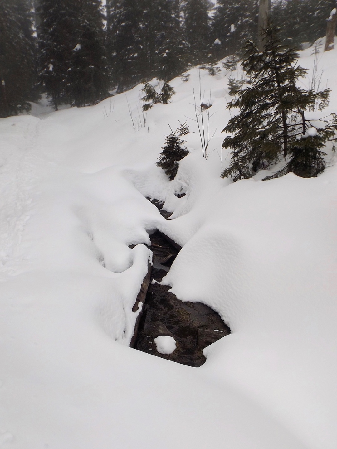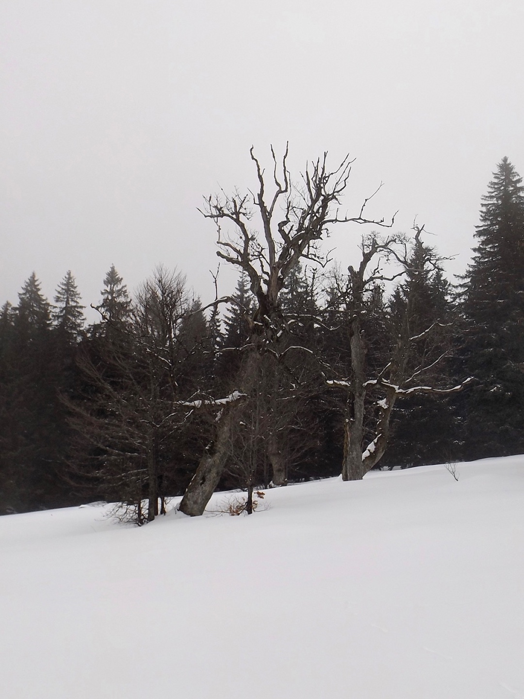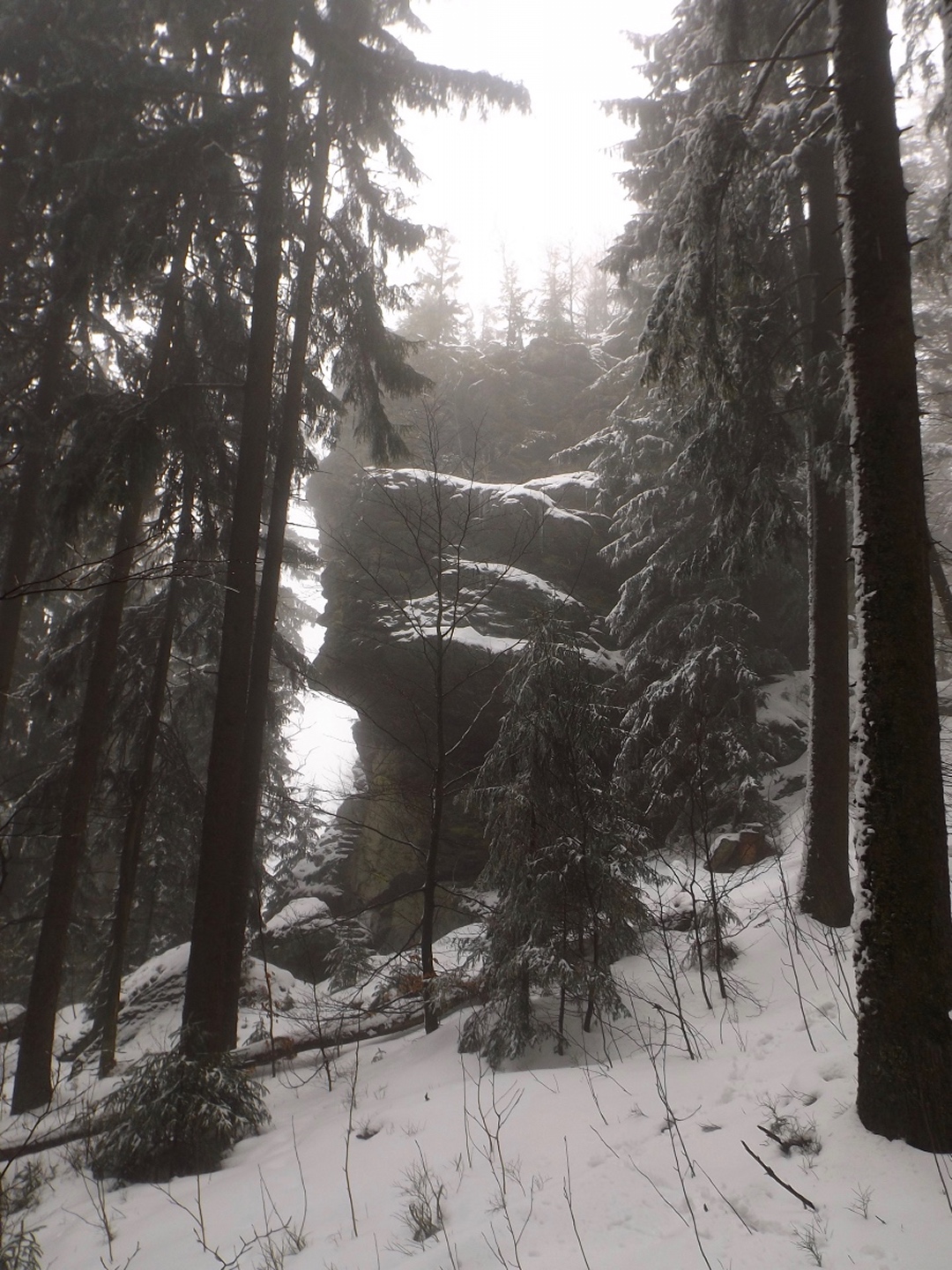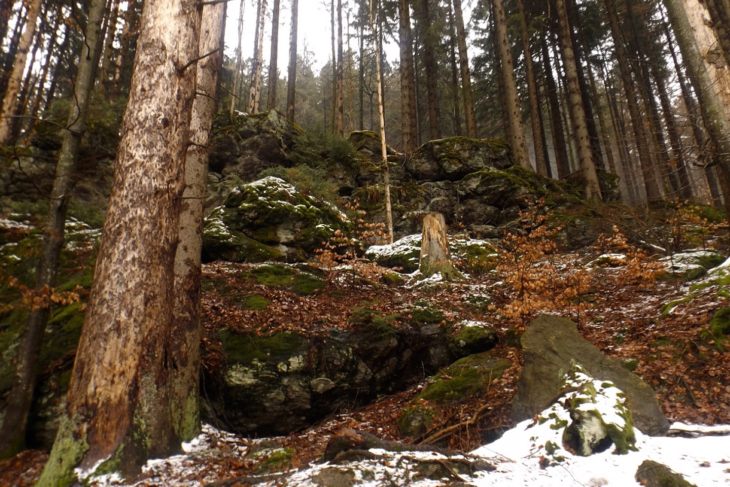 Los ging es kurz nach halb elf in Zwieslerwaldhaus von dem Parkplatz aus, der bereits im Oktober 2013 mein Startpunkt gewesen war. Seitdem ist der markierte Wanderweg von den Steinbachfällen weg auf den Adamsteig verlegt worden, so dass ich auch hier etwas Neues zu sehen bekam. Runterwärts ging es auf dem bekannten Weg über den Ruckowitzschachten und durch den Urwald Mittelsteighütte, allerdings ohne Abstecher durch das Höllbachgespreng, das erstens wegen der Wanderfalkenbrut gesperrt und zweitens bei Schnee im Abstieg kaum zu machen ist. Und Schnee hatte es genug, zwar nicht unten am Parkplatz, aber oberhalb von 900 Metern. War der Adamsteig noch gut ausgelatscht und dank des intakten Waldes auch nicht verweht, gestaltete sich die Sache in der Windwurfzone am Ruckwiesberg und auch weiter unten am Ruckowitzschachten ganz anders, 20 Zentimeter tiefe Einsinker waren keine Seltenheit. Wir waren aber gut ausgerüstet und auf die Verhältnisse vorbereitet und kamen exzellent zurecht. Weniger exzellent waren die Sichtverhältnisse, die Wolkenuntergrenze stieg zwar im Laufe des Tages leicht an, aber die umliegenden Gipfel waren ebenso wenig sichtbar wie der Zwieseler Winkel vom Gipfelkreuz aus. Dafür hatte Schutzhauswirt Michael wieder das üblich grandiose Pichelsteiner gekocht, welches wir uns alle vier herzhaft munden ließen. Milow musste mit einem Kauknochen vorlieb nehmen, tat dies aber ohne Murren und Betteln, da hat Karlie noch einen weiten Weg vor sich.