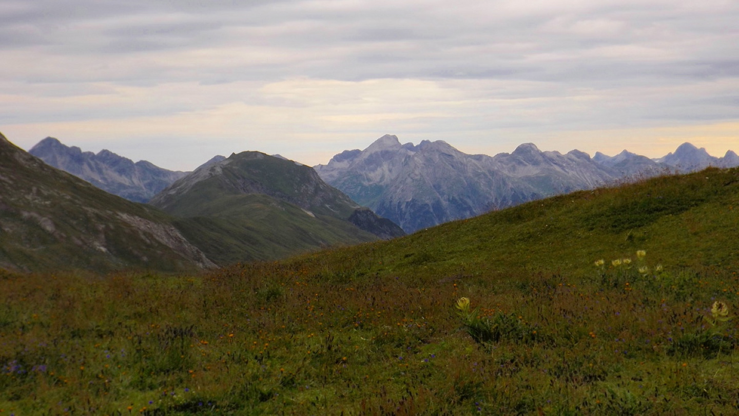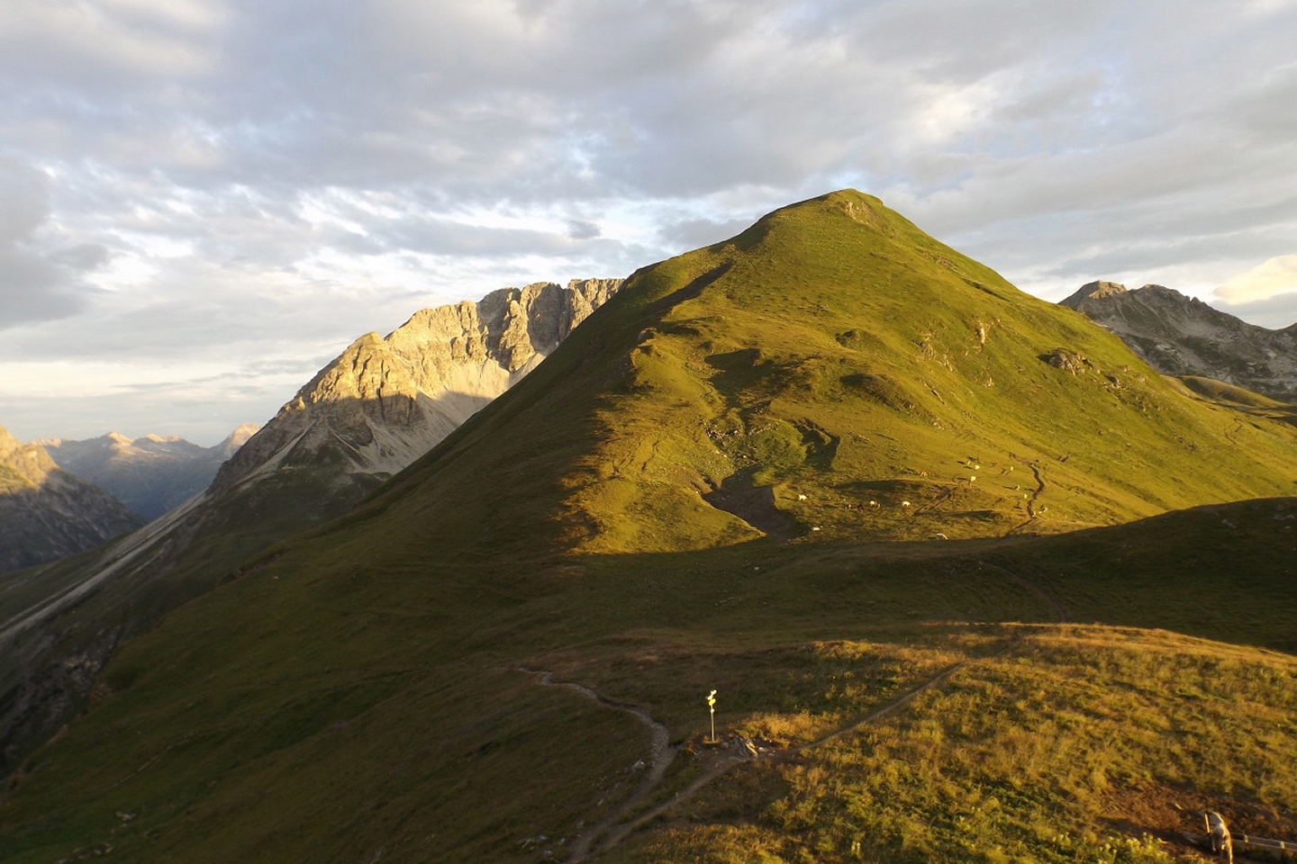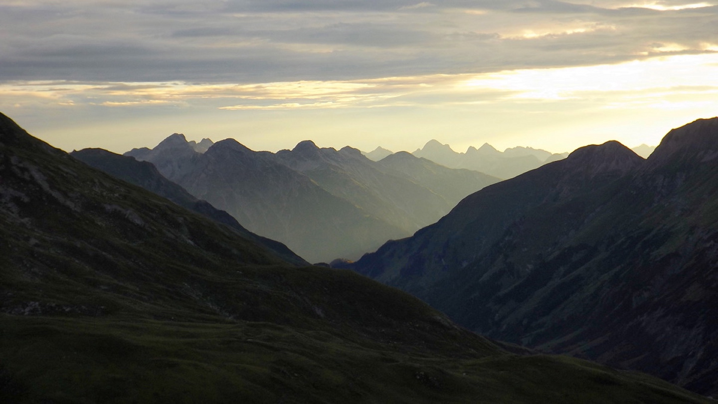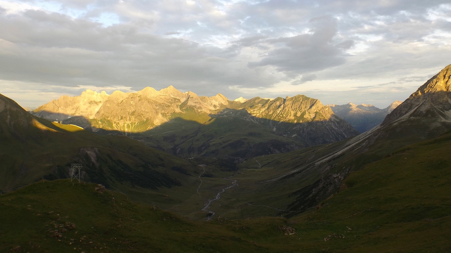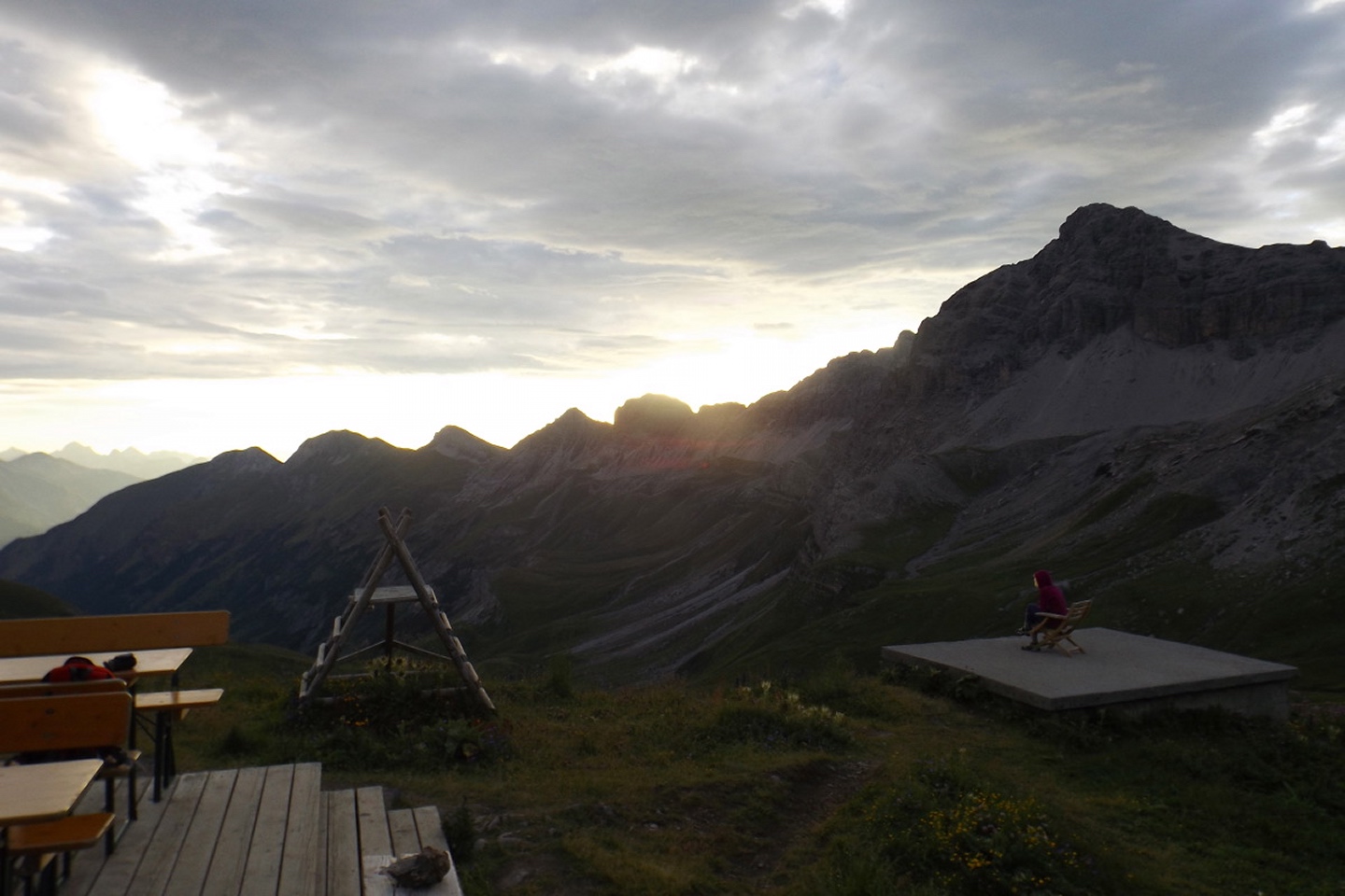 Die Nacht war stürmisch, aber wir konnten zumindest ein bisserl Sonnenaufgang genießen. Während des Frühstücks zog es bereits wieder zu, was uns aber nicht daran hinderte, loszuziehen. Das heißt, Petra und ich disponierten schon um und gingen nicht mit der Hauptgruppe Richtung Valluga, sondern nahmen erst einmal die Fanggekarspitze ins Visier, um beim Start des Pisswetters wieder bei der Hütte zu sein.