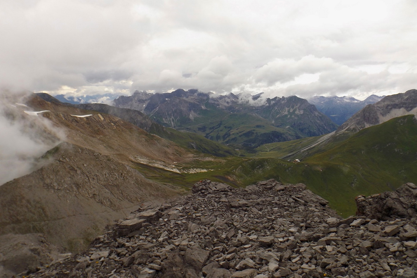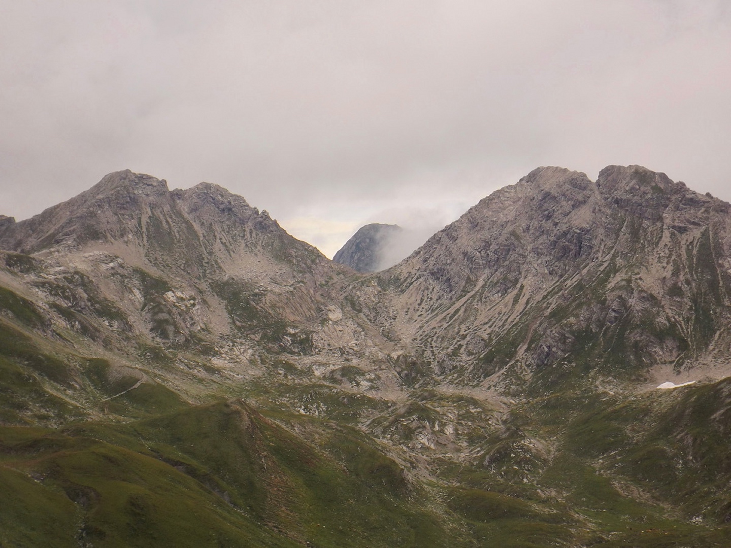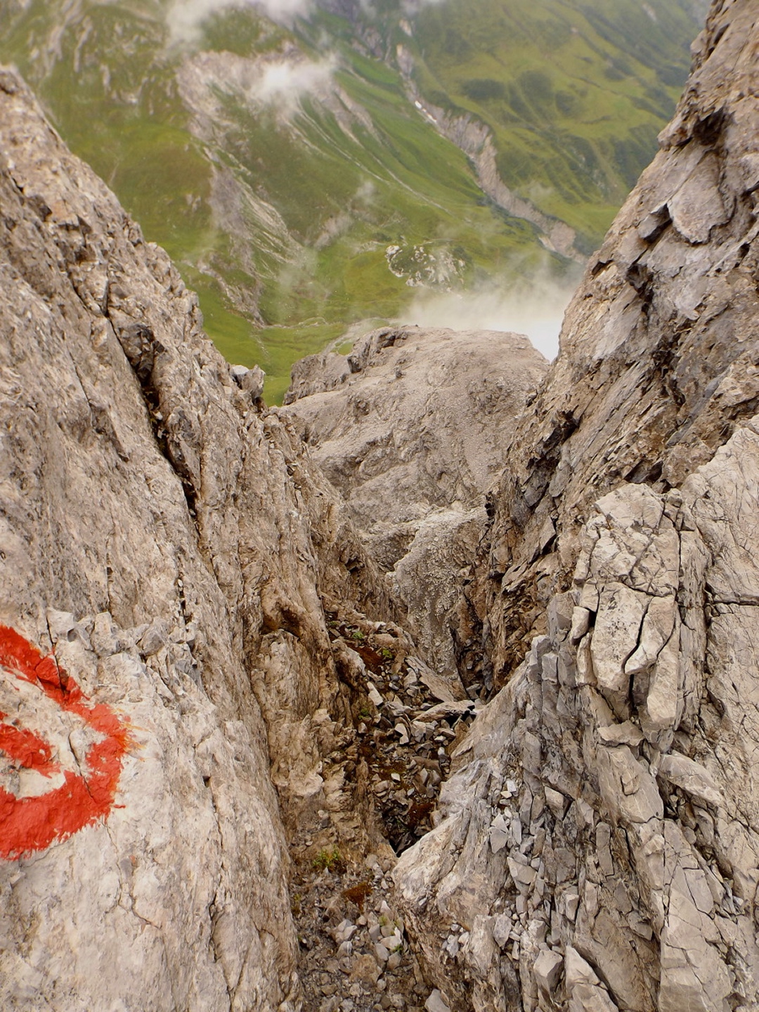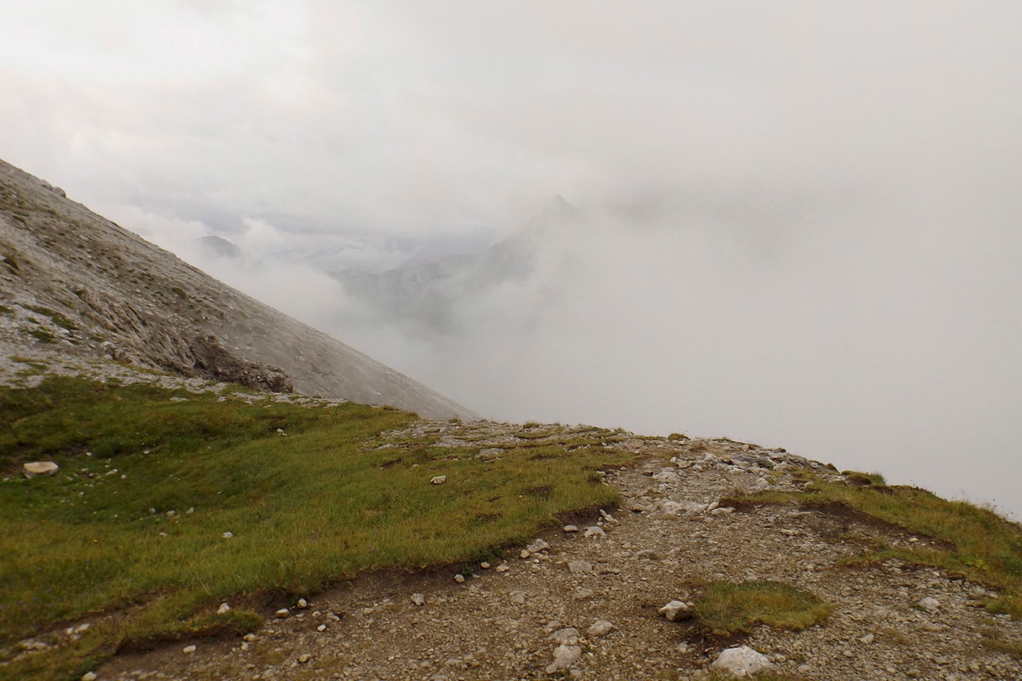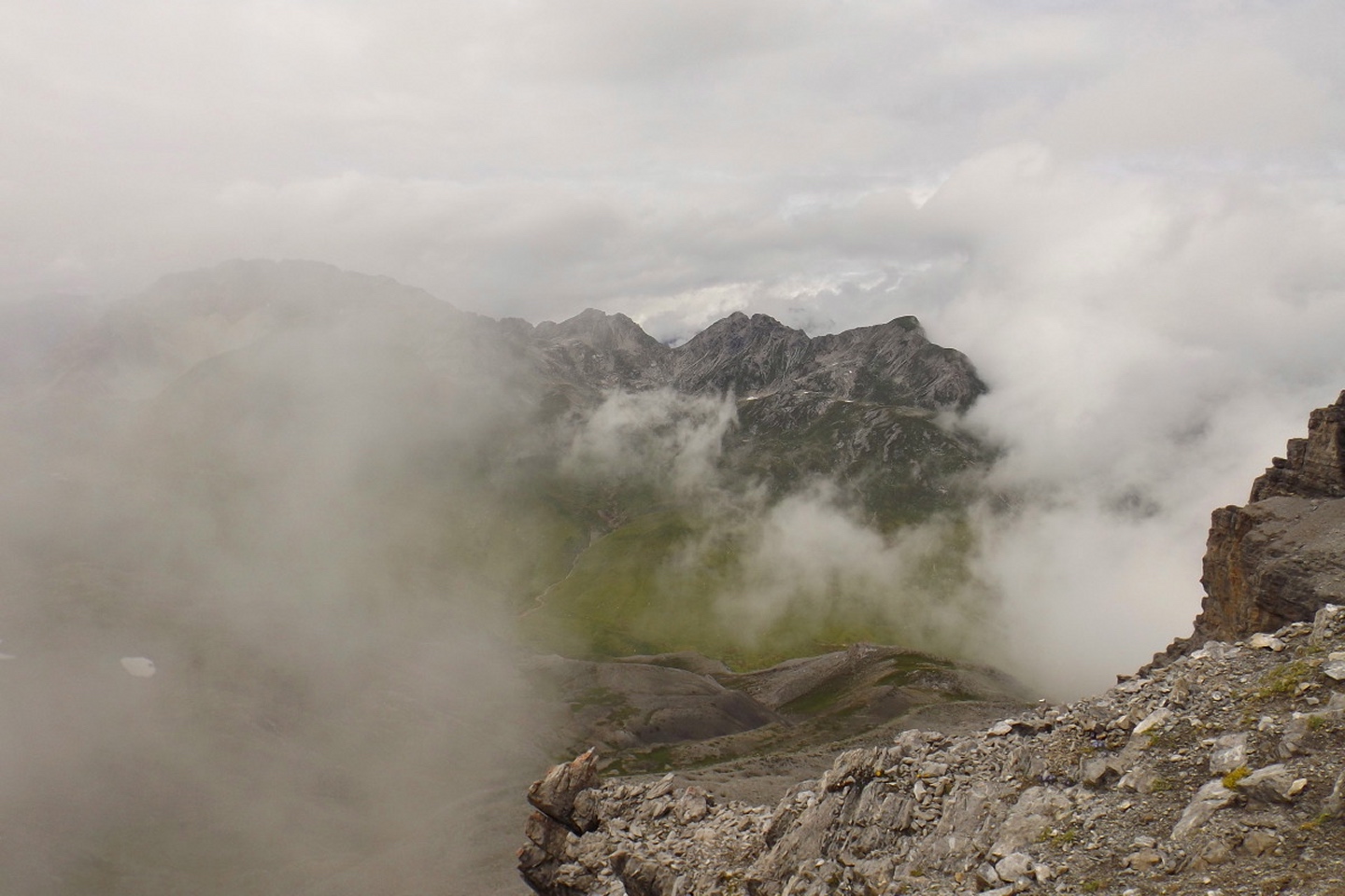 Dummerweise war dieser Start bereits um halb neun und wir gerade mal an der Fassung der Hüttenquelle angekommen. Also nix wie zurück, aber zumindest nicht wie beim Hinweg außen um den Fahnengupf herum, sondern oben drüber. Eine halbe Stunde nach uns kam auch die Vallugagruppe zurück. Kurze Zeit später hörte der Regen wieder auf, aber der Nebel blieb und ein paar Leute versuchten sich am Rauhen Kopf. Wir hingegen bestellten uns einen Liter Teewasser und warteten darauf, dass der Nebel sich vielleicht nach oben verziehen würde. Es wurde Mittag und der Nebel blieb und ich genehmigte mir eine Suppe. Den ganzen Tag nur Apfelvierterln ist doch etwas wenig. Die Geologiestudenten, die auf der Hütte auf Exkursion waren, kamen teilweise tropfnass von ihren Aufträgen zurück und besprachen ihre Erkenntnisse mit dem Professor, der es sich mit seinem Laptop im Gastraum gemütlich gemacht hatte. Zwischenurch gab es immer wieder Nebelinspektionen oder Streicheleinheiten für Lili. Um halb drei entschieden Wolfgang und Günther, dass der Nebel sich noch etwas lichten würde und wir es doch noch auf die Fanggekarspitze versuchen könnten. Auch dieses Mal gibt es wenig über den Weg zu schreiben, wir folgten dem Übergang Richtung Leutkircher Hütte bis zum Erlijoch, wo wir über der Wolke waren, und bogen dort links ab hinauf zum Gipfel. Kurz unterhalb eines Vorgipfels auf etwa 2500 Meter war eine kurze Felsquerung mit einer etwas rilligen Schrofe, an der sich Eugen nicht mehr weitergehen traute und zurückblieb. Kann passieren, wenn man zum ersten Mal in den Bergen unterwegs ist, und es ist in jedem Fall besser, abzubrechen als abzustürzen. Doris blieb ebenfalls zurück, um ihm Gesellschaft zu leisten. Ansonsten ist der Weg technisch unschwierig, allerdings kann der oberste Teil bei Nebel etwas haarig werden, weil es links fast senkrecht 400 Meter hinuntergeht und die eine oder andere Rinne recht knapp am Pfad beginnt. Oben gab es ein paar Fotos und einen Gruppeneintrag ins Gipfelbuch, bei dem mich Günther zur Simone machte. Naja, wer sich meinen ersten Vornamen nicht merken kann, der darf den zweiten verwenden… Zurück ging es auf dem gleichen Weg, der Nebel lichtete sich auch weiter und es gibt ein paar schöne Bilder. Siehe unten. Als Bergsteigeressen gab es dieses Mal Schweinegeschnetzeltes, sehr lecker, aber wieder etwas wenig. Pläne für den Sonntag wurden nicht gemacht, weil wir erst das Wetter abwarten wollten. Die Nacht war dann etwas unruhiger als die letzte, weil sich auf einmal ein paar Leute im Lager als Sägewerke entpuppten.