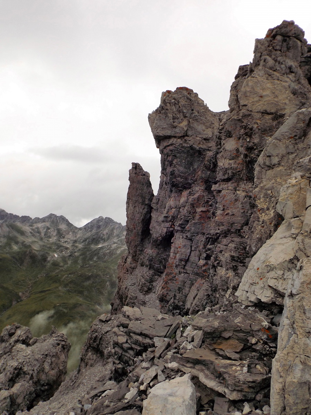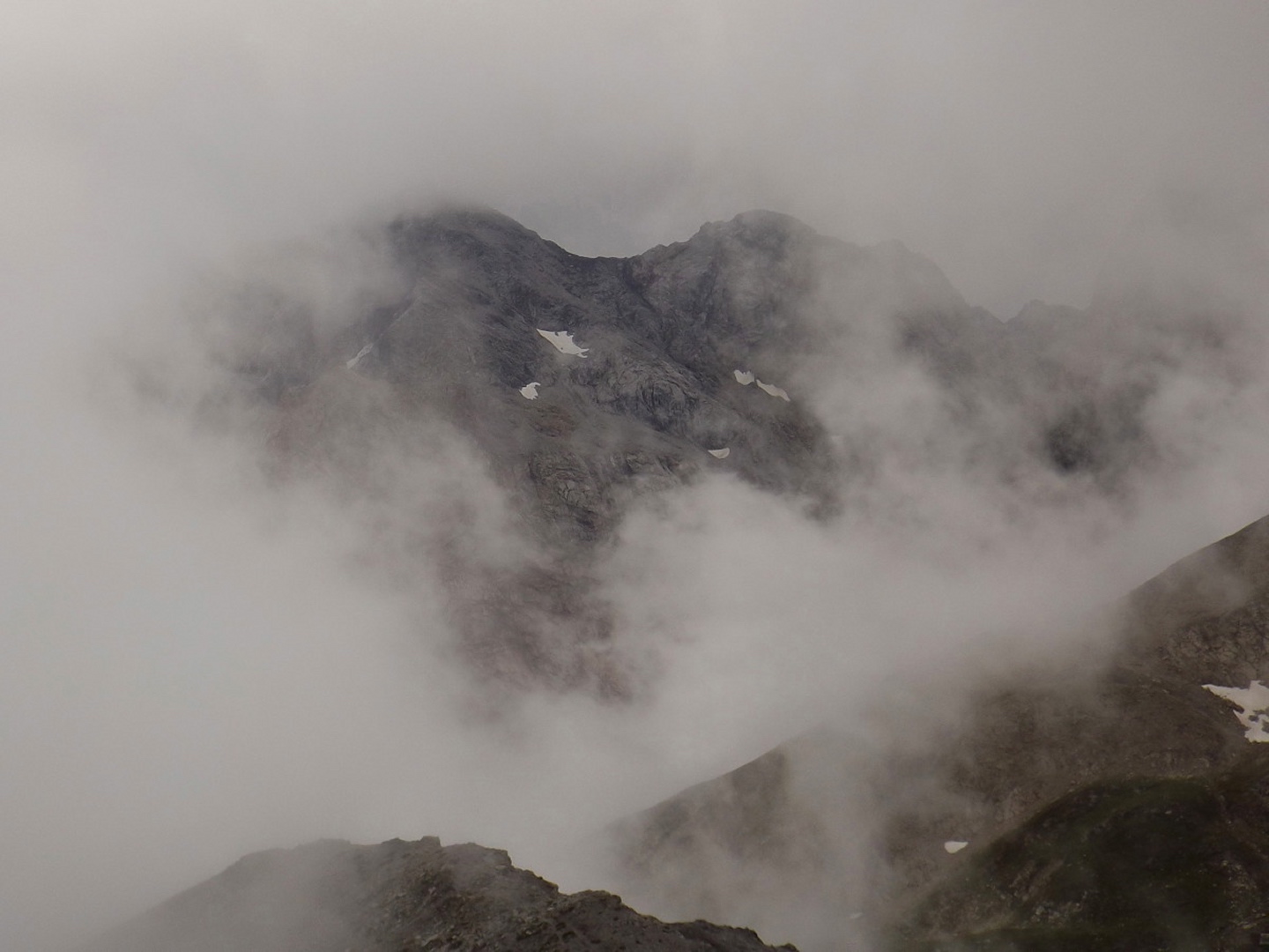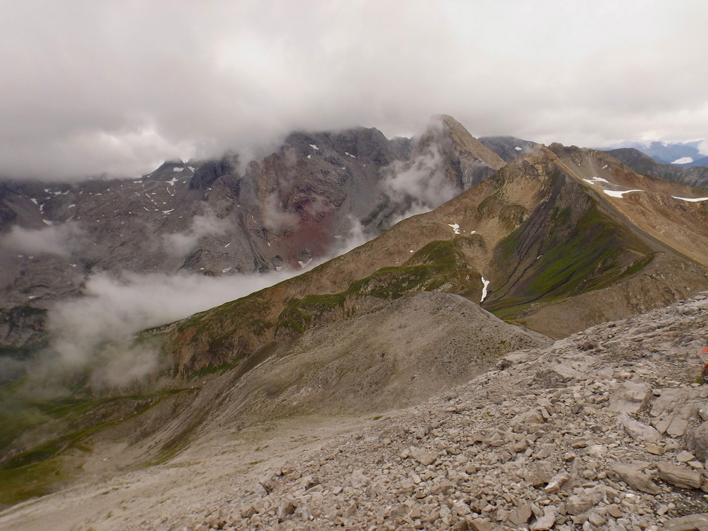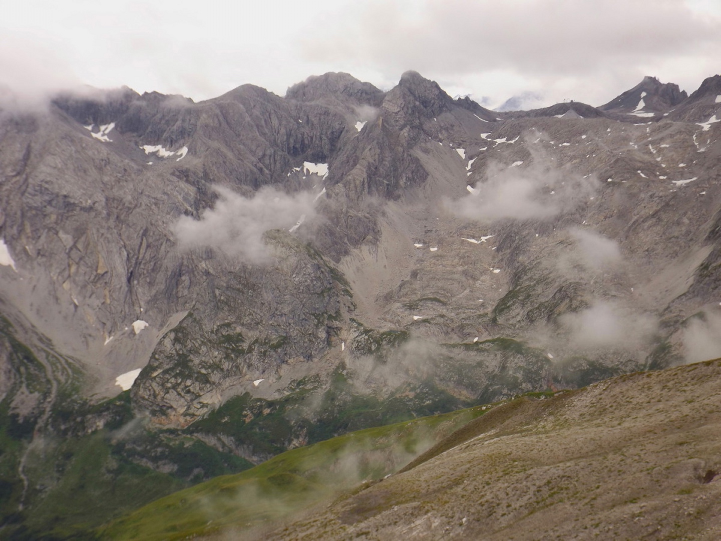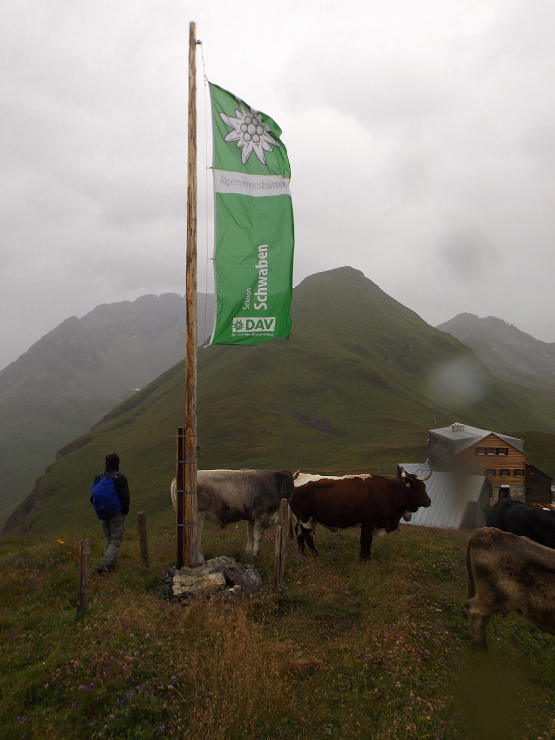 Dummerweise war dieser Start bereits um halb neun und wir gerade mal an der Fassung der Hüttenquelle angekommen. Also nix wie zurück, aber zumindest nicht wie beim Hinweg außen um den Fahnengupf herum, sondern oben drüber. Eine halbe Stunde nach uns kam auch die Vallugagruppe zurück. Kurze Zeit später hörte der Regen wieder auf, aber der Nebel blieb und ein paar Leute versuchten sich am Rauhen Kopf. Wir hingegen bestellten uns einen Liter Teewasser und warteten darauf, dass der Nebel sich vielleicht nach oben verziehen würde. Es wurde Mittag und der Nebel blieb und ich genehmigte mir eine Suppe. Den ganzen Tag nur Apfelvierterln ist doch etwas wenig. Die Geologiestudenten, die auf der Hütte auf Exkursion waren, kamen teilweise tropfnass von ihren Aufträgen zurück und besprachen ihre Erkenntnisse mit dem Professor, der es sich mit seinem Laptop im Gastraum gemütlich gemacht hatte. Zwischenurch gab es immer wieder Nebelinspektionen oder Streicheleinheiten für Lili. Um halb drei entschieden Wolfgang und Günther, dass der Nebel sich noch etwas lichten würde und wir es doch noch auf die Fanggekarspitze versuchen könnten. Auch dieses Mal gibt es wenig über den Weg zu schreiben, wir folgten dem Übergang Richtung Leutkircher Hütte bis zum Erlijoch, wo wir über der Wolke waren, und bogen dort links ab hinauf zum Gipfel. Kurz unterhalb eines Vorgipfels auf etwa 2500 Meter war eine kurze Felsquerung mit einer etwas rilligen Schrofe, an der sich Eugen nicht mehr weitergehen traute und zurückblieb. Kann passieren, wenn man zum ersten Mal in den Bergen unterwegs ist, und es ist in jedem Fall besser, abzubrechen als abzustürzen. Doris blieb ebenfalls zurück, um ihm Gesellschaft zu leisten. Ansonsten ist der Weg technisch unschwierig, allerdings kann der oberste Teil bei Nebel etwas haarig werden, weil es links fast senkrecht 400 Meter hinuntergeht und die eine oder andere Rinne recht knapp am Pfad beginnt. Oben gab es ein paar Fotos und einen Gruppeneintrag ins Gipfelbuch, bei dem mich Günther zur Simone machte. Naja, wer sich meinen ersten Vornamen nicht merken kann, der darf den zweiten verwenden… Zurück ging es auf dem gleichen Weg, der Nebel lichtete sich auch weiter und es gibt ein paar schöne Bilder. Siehe unten. Als Bergsteigeressen gab es dieses Mal Schweinegeschnetzeltes, sehr lecker, aber wieder etwas wenig. Pläne für den Sonntag wurden nicht gemacht, weil wir erst das Wetter abwarten wollten. Die Nacht war dann etwas unruhiger als die letzte, weil sich auf einmal ein paar Leute im Lager als Sägewerke entpuppten.