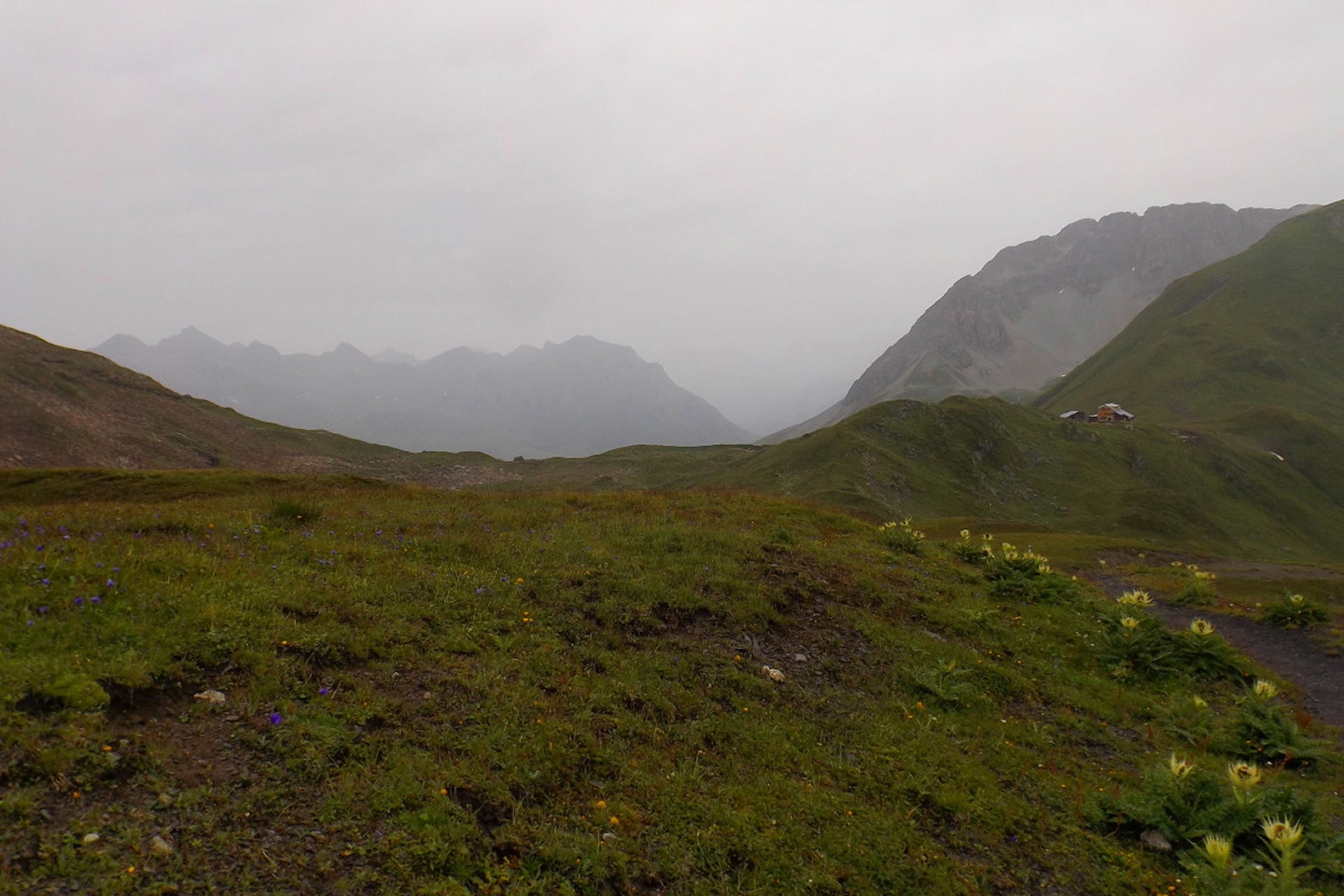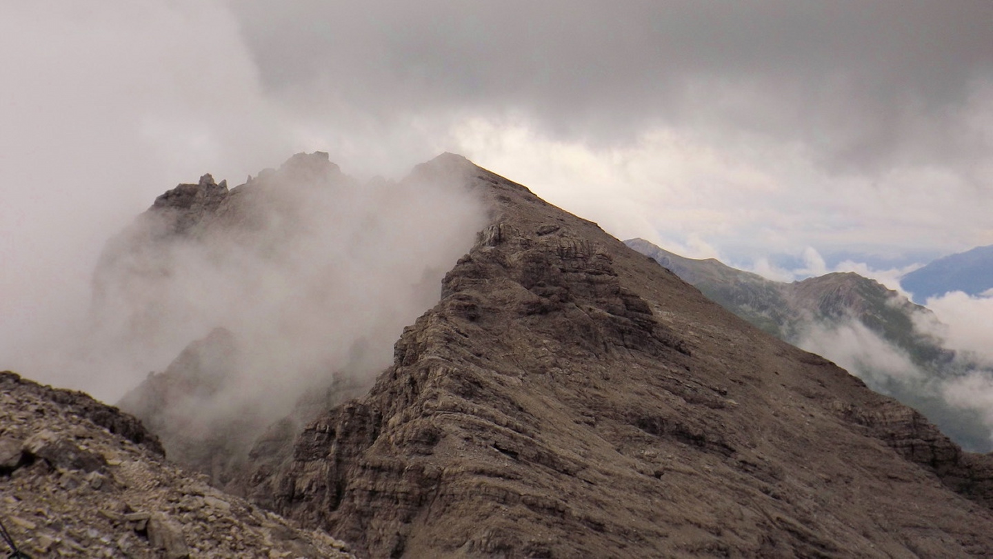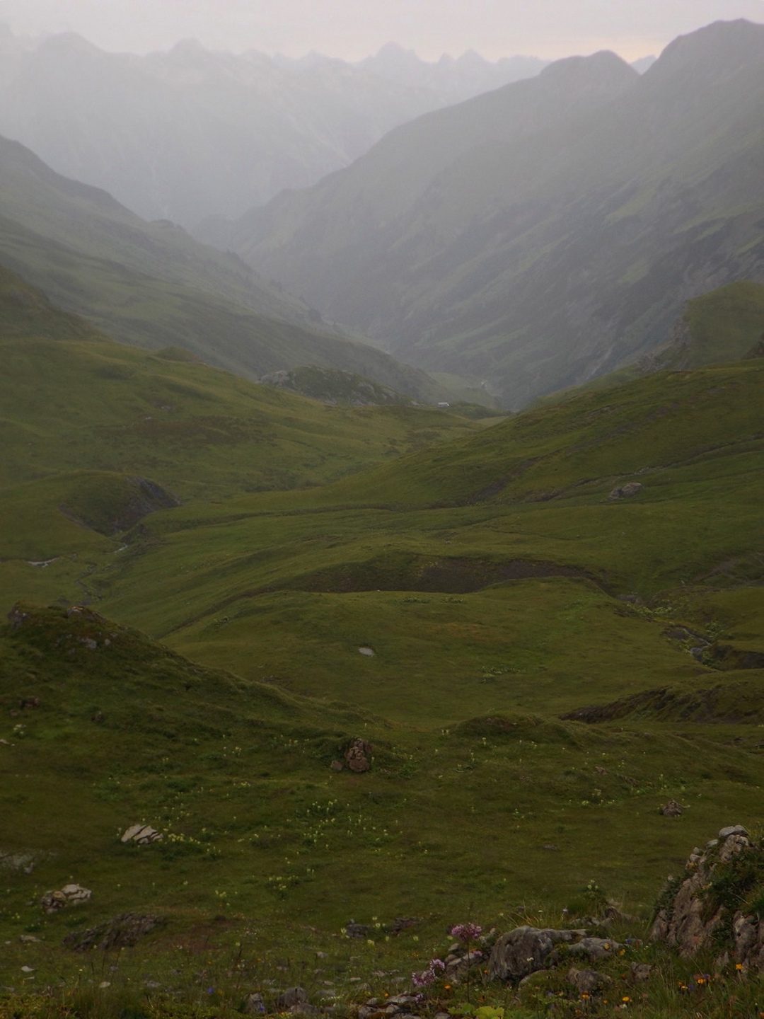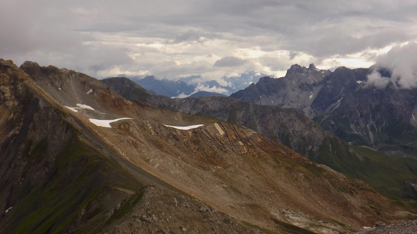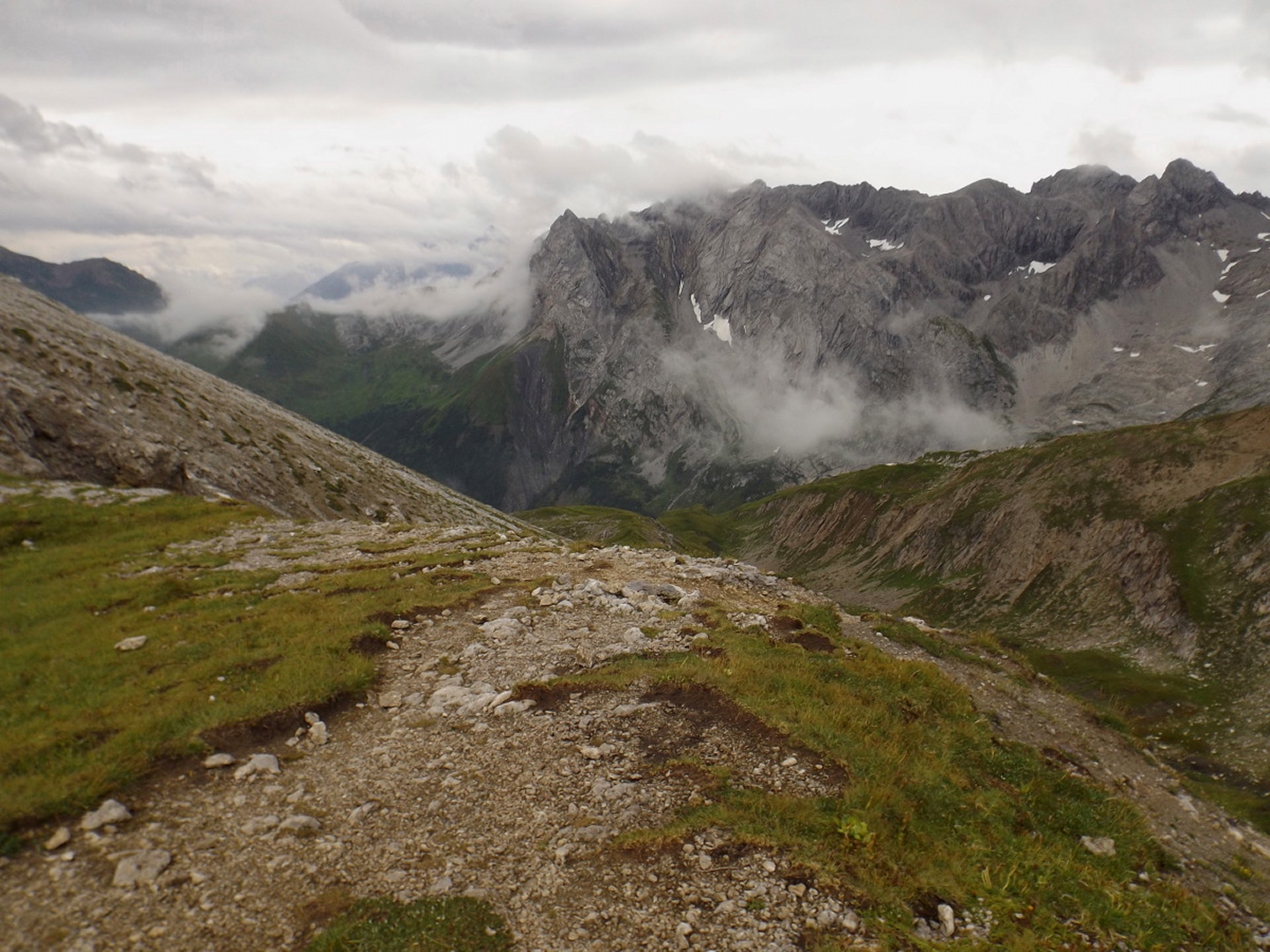 Dummerweise war dieser Start bereits um halb neun und wir gerade mal an der Fassung der Hüttenquelle angekommen. Also nix wie zurück, aber zumindest nicht wie beim Hinweg außen um den Fahnengupf herum, sondern oben drüber. Eine halbe Stunde nach uns kam auch die Vallugagruppe zurück. Kurze Zeit später hörte der Regen wieder auf, aber der Nebel blieb und ein paar Leute versuchten sich am Rauhen Kopf. Wir hingegen bestellten uns einen Liter Teewasser und warteten darauf, dass der Nebel sich vielleicht nach oben verziehen würde. Es wurde Mittag und der Nebel blieb und ich genehmigte mir eine Suppe. Den ganzen Tag nur Apfelvierterln ist doch etwas wenig. Die Geologiestudenten, die auf der Hütte auf Exkursion waren, kamen teilweise tropfnass von ihren Aufträgen zurück und besprachen ihre Erkenntnisse mit dem Professor, der es sich mit seinem Laptop im Gastraum gemütlich gemacht hatte. Zwischenurch gab es immer wieder Nebelinspektionen oder Streicheleinheiten für Lili. Um halb drei entschieden Wolfgang und Günther, dass der Nebel sich noch etwas lichten würde und wir es doch noch auf die Fanggekarspitze versuchen könnten. Auch dieses Mal gibt es wenig über den Weg zu schreiben, wir folgten dem Übergang Richtung Leutkircher Hütte bis zum Erlijoch, wo wir über der Wolke waren, und bogen dort links ab hinauf zum Gipfel. Kurz unterhalb eines Vorgipfels auf etwa 2500 Meter war eine kurze Felsquerung mit einer etwas rilligen Schrofe, an der sich Eugen nicht mehr weitergehen traute und zurückblieb. Kann passieren, wenn man zum ersten Mal in den Bergen unterwegs ist, und es ist in jedem Fall besser, abzubrechen als abzustürzen. Doris blieb ebenfalls zurück, um ihm Gesellschaft zu leisten. Ansonsten ist der Weg technisch unschwierig, allerdings kann der oberste Teil bei Nebel etwas haarig werden, weil es links fast senkrecht 400 Meter hinuntergeht und die eine oder andere Rinne recht knapp am Pfad beginnt. Oben gab es ein paar Fotos und einen Gruppeneintrag ins Gipfelbuch, bei dem mich Günther zur Simone machte. Naja, wer sich meinen ersten Vornamen nicht merken kann, der darf den zweiten verwenden… Zurück ging es auf dem gleichen Weg, der Nebel lichtete sich auch weiter und es gibt ein paar schöne Bilder. Siehe unten. Als Bergsteigeressen gab es dieses Mal Schweinegeschnetzeltes, sehr lecker, aber wieder etwas wenig. Pläne für den Sonntag wurden nicht gemacht, weil wir erst das Wetter abwarten wollten. Die Nacht war dann etwas unruhiger als die letzte, weil sich auf einmal ein paar Leute im Lager als Sägewerke entpuppten.