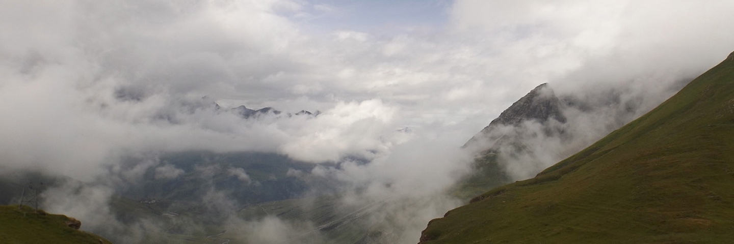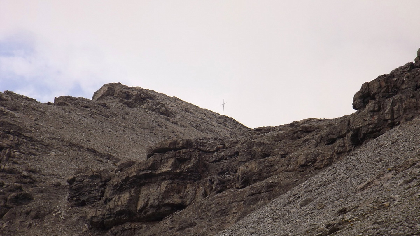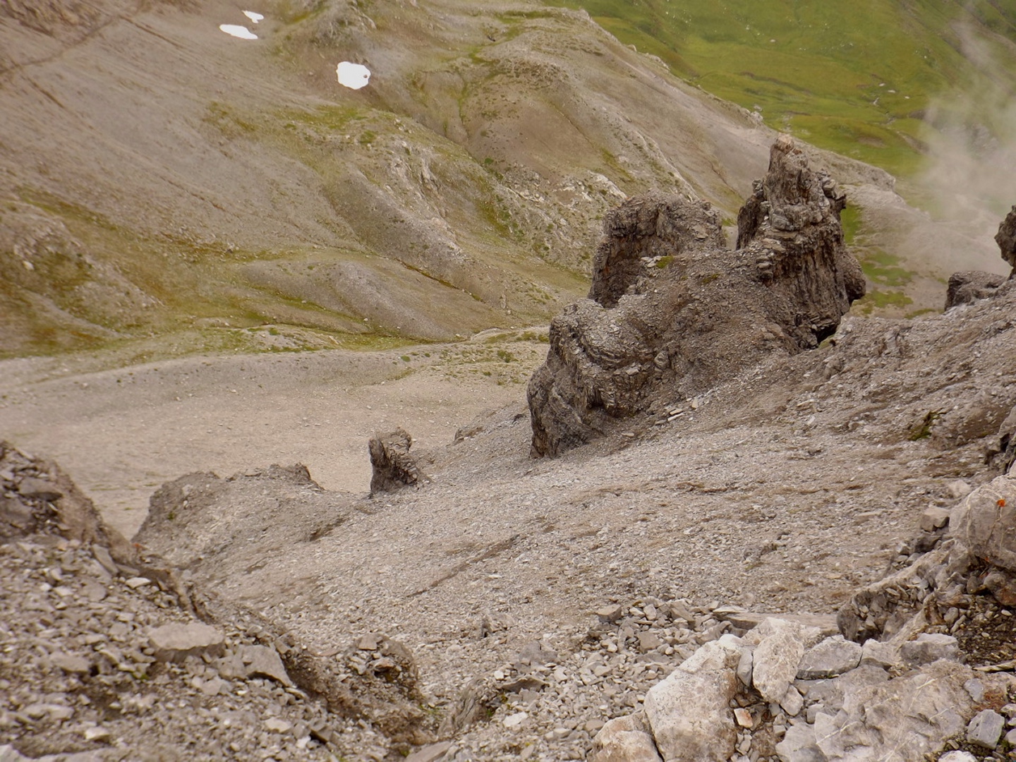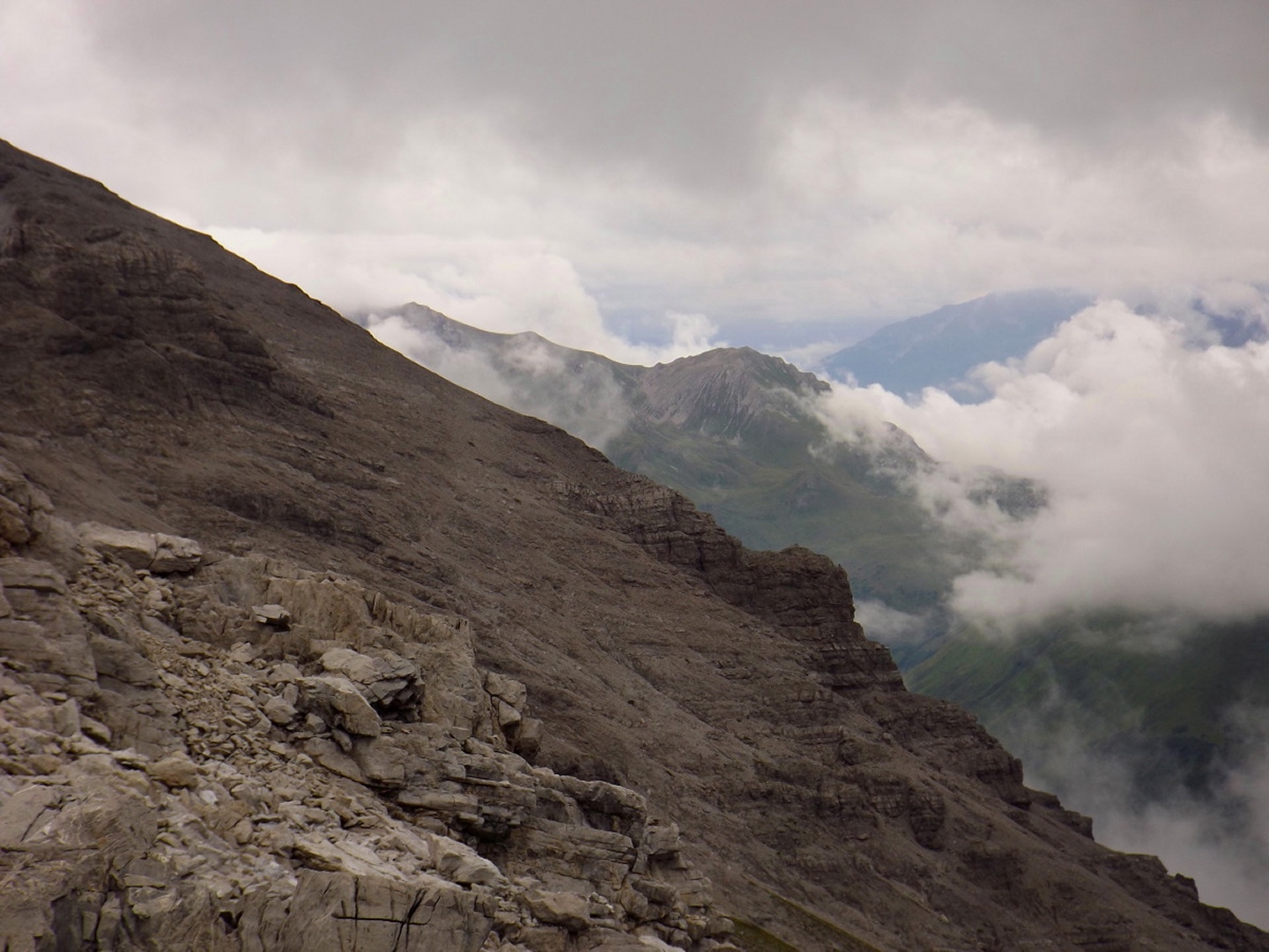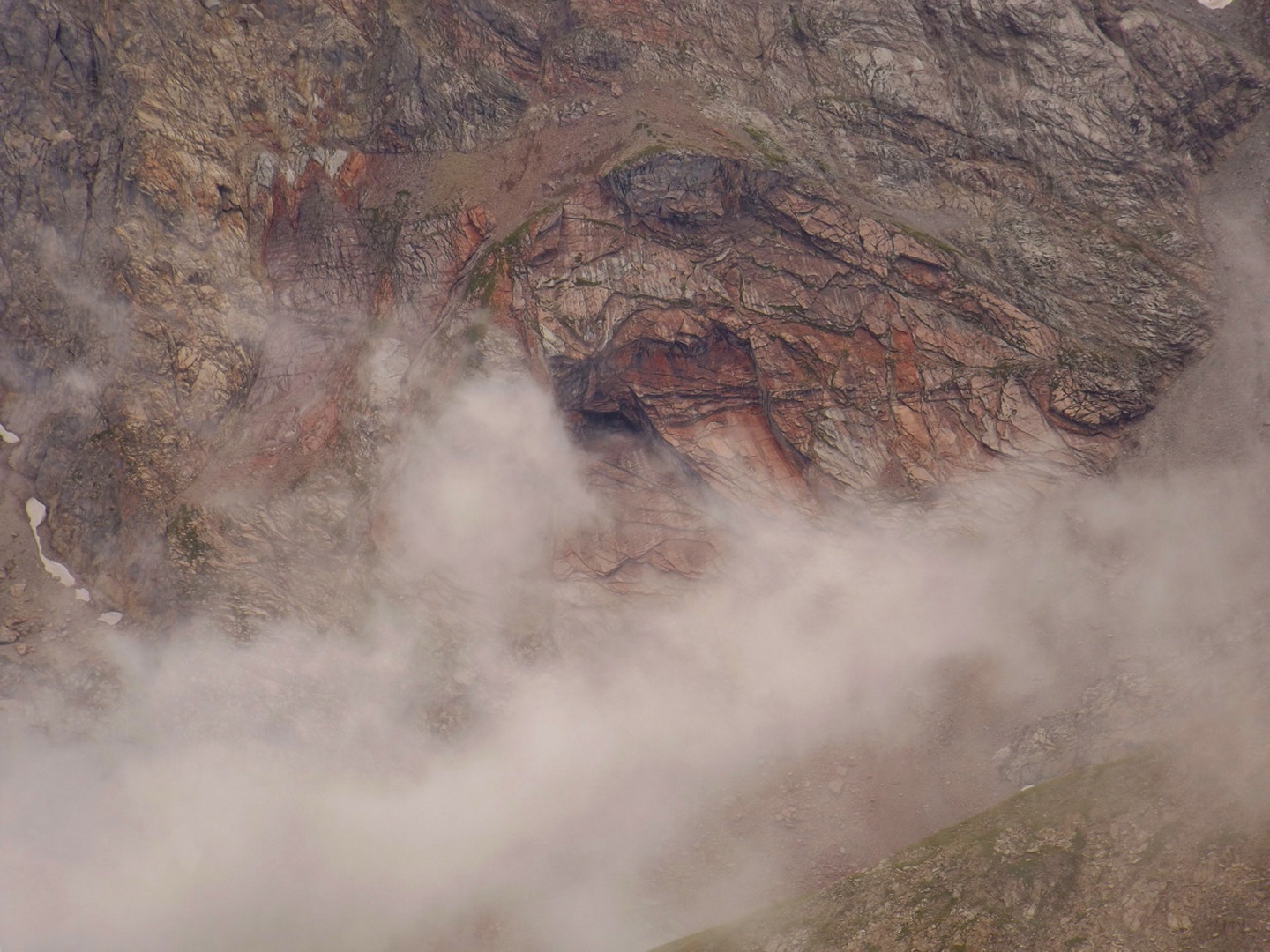 Dummerweise war dieser Start bereits um halb neun und wir gerade mal an der Fassung der Hüttenquelle angekommen. Also nix wie zurück, aber zumindest nicht wie beim Hinweg außen um den Fahnengupf herum, sondern oben drüber. Eine halbe Stunde nach uns kam auch die Vallugagruppe zurück. Kurze Zeit später hörte der Regen wieder auf, aber der Nebel blieb und ein paar Leute versuchten sich am Rauhen Kopf. Wir hingegen bestellten uns einen Liter Teewasser und warteten darauf, dass der Nebel sich vielleicht nach oben verziehen würde. Es wurde Mittag und der Nebel blieb und ich genehmigte mir eine Suppe. Den ganzen Tag nur Apfelvierterln ist doch etwas wenig. Die Geologiestudenten, die auf der Hütte auf Exkursion waren, kamen teilweise tropfnass von ihren Aufträgen zurück und besprachen ihre Erkenntnisse mit dem Professor, der es sich mit seinem Laptop im Gastraum gemütlich gemacht hatte. Zwischenurch gab es immer wieder Nebelinspektionen oder Streicheleinheiten für Lili. Um halb drei entschieden Wolfgang und Günther, dass der Nebel sich noch etwas lichten würde und wir es doch noch auf die Fanggekarspitze versuchen könnten. Auch dieses Mal gibt es wenig über den Weg zu schreiben, wir folgten dem Übergang Richtung Leutkircher Hütte bis zum Erlijoch, wo wir über der Wolke waren, und bogen dort links ab hinauf zum Gipfel. Kurz unterhalb eines Vorgipfels auf etwa 2500 Meter war eine kurze Felsquerung mit einer etwas rilligen Schrofe, an der sich Eugen nicht mehr weitergehen traute und zurückblieb. Kann passieren, wenn man zum ersten Mal in den Bergen unterwegs ist, und es ist in jedem Fall besser, abzubrechen als abzustürzen. Doris blieb ebenfalls zurück, um ihm Gesellschaft zu leisten. Ansonsten ist der Weg technisch unschwierig, allerdings kann der oberste Teil bei Nebel etwas haarig werden, weil es links fast senkrecht 400 Meter hinuntergeht und die eine oder andere Rinne recht knapp am Pfad beginnt. Oben gab es ein paar Fotos und einen Gruppeneintrag ins Gipfelbuch, bei dem mich Günther zur Simone machte. Naja, wer sich meinen ersten Vornamen nicht merken kann, der darf den zweiten verwenden… Zurück ging es auf dem gleichen Weg, der Nebel lichtete sich auch weiter und es gibt ein paar schöne Bilder. Siehe unten. Als Bergsteigeressen gab es dieses Mal Schweinegeschnetzeltes, sehr lecker, aber wieder etwas wenig. Pläne für den Sonntag wurden nicht gemacht, weil wir erst das Wetter abwarten wollten. Die Nacht war dann etwas unruhiger als die letzte, weil sich auf einmal ein paar Leute im Lager als Sägewerke entpuppten.