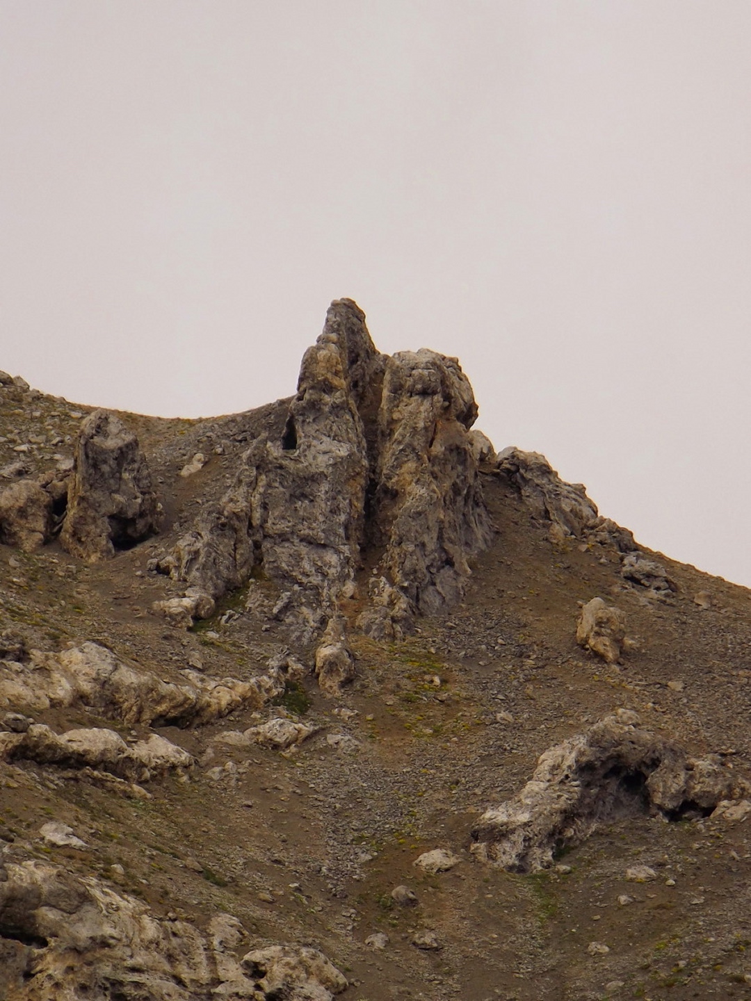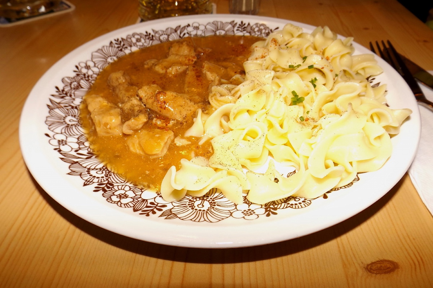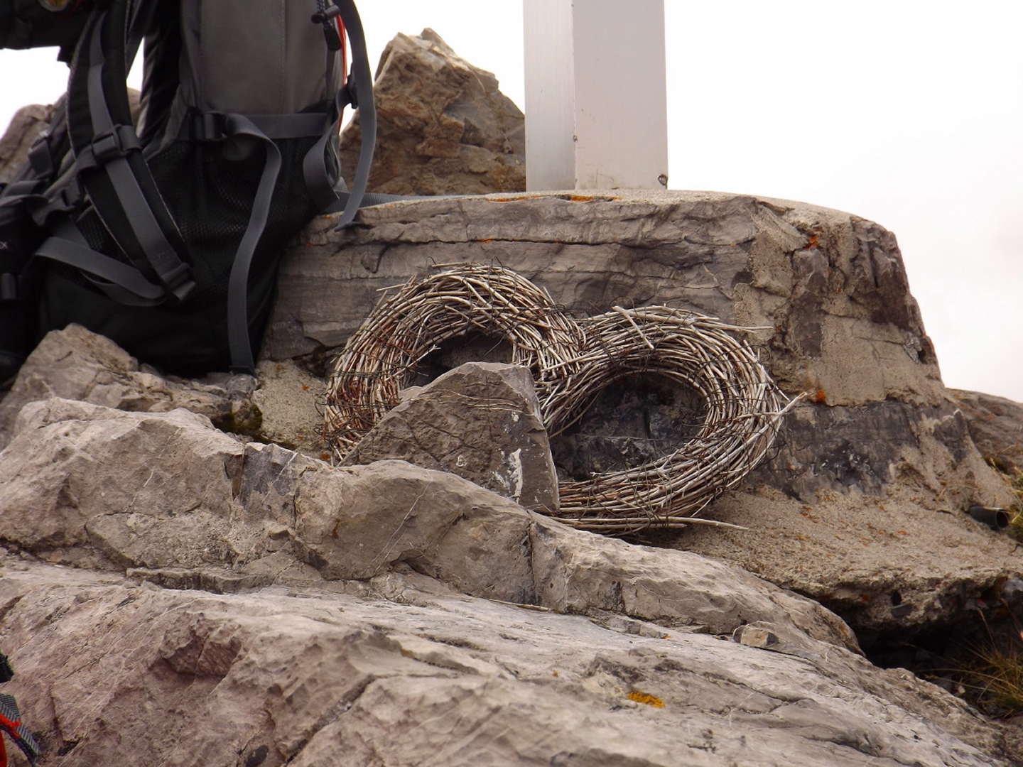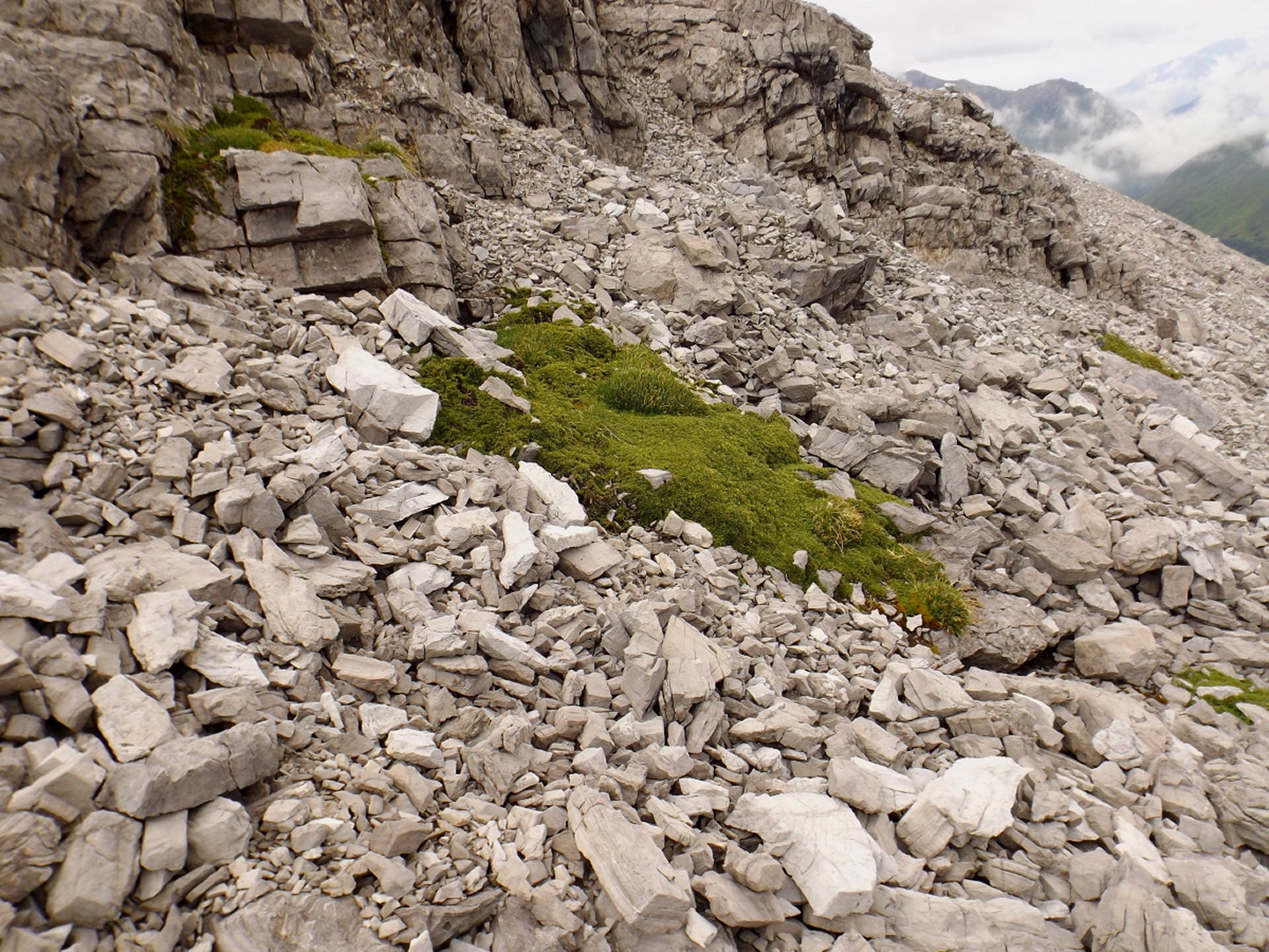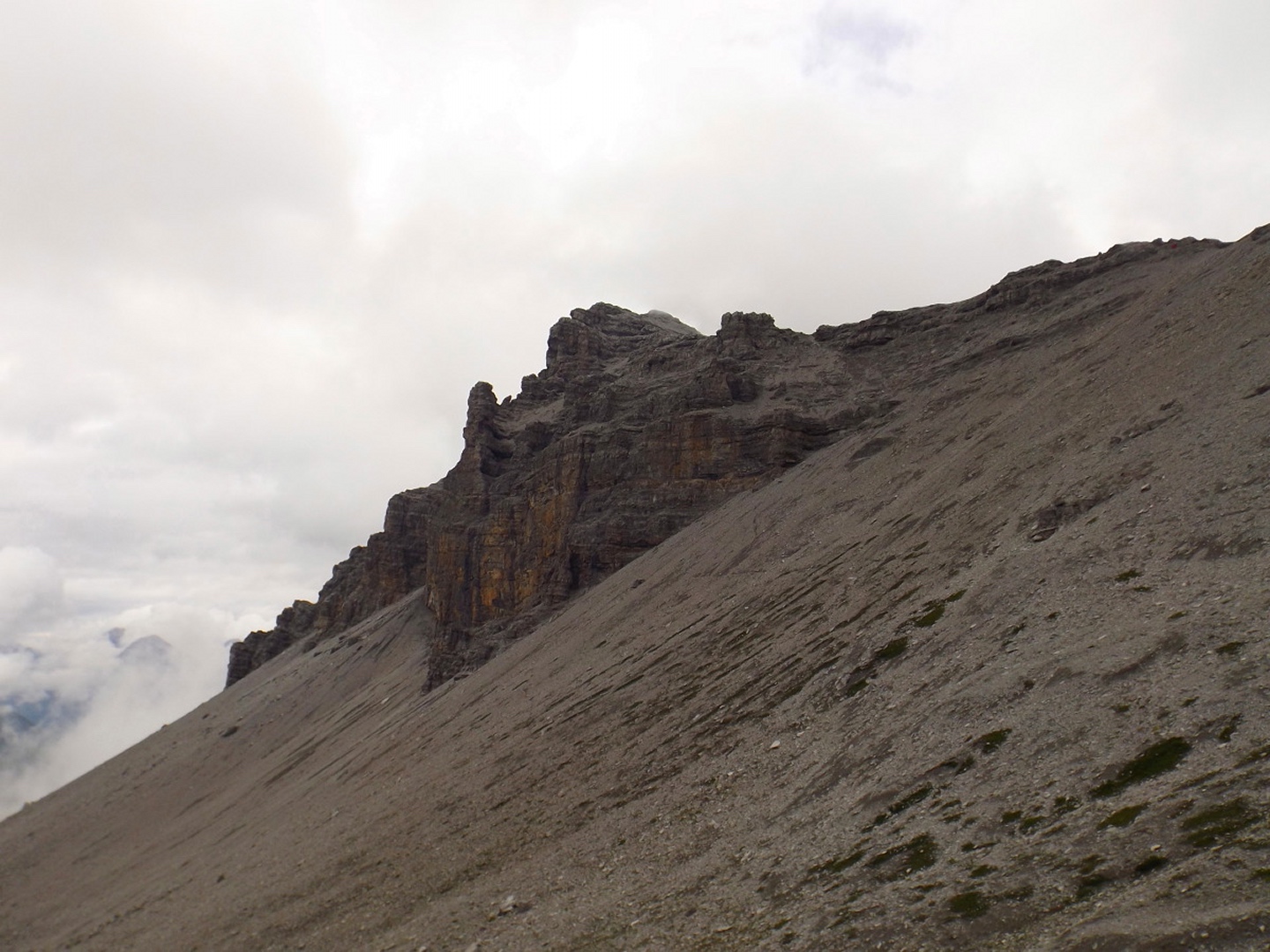 Dummerweise war dieser Start bereits um halb neun und wir gerade mal an der Fassung der Hüttenquelle angekommen. Also nix wie zurück, aber zumindest nicht wie beim Hinweg außen um den Fahnengupf herum, sondern oben drüber. Eine halbe Stunde nach uns kam auch die Vallugagruppe zurück. Kurze Zeit später hörte der Regen wieder auf, aber der Nebel blieb und ein paar Leute versuchten sich am Rauhen Kopf. Wir hingegen bestellten uns einen Liter Teewasser und warteten darauf, dass der Nebel sich vielleicht nach oben verziehen würde. Es wurde Mittag und der Nebel blieb und ich genehmigte mir eine Suppe. Den ganzen Tag nur Apfelvierterln ist doch etwas wenig. Die Geologiestudenten, die auf der Hütte auf Exkursion waren, kamen teilweise tropfnass von ihren Aufträgen zurück und besprachen ihre Erkenntnisse mit dem Professor, der es sich mit seinem Laptop im Gastraum gemütlich gemacht hatte. Zwischenurch gab es immer wieder Nebelinspektionen oder Streicheleinheiten für Lili. Um halb drei entschieden Wolfgang und Günther, dass der Nebel sich noch etwas lichten würde und wir es doch noch auf die Fanggekarspitze versuchen könnten. Auch dieses Mal gibt es wenig über den Weg zu schreiben, wir folgten dem Übergang Richtung Leutkircher Hütte bis zum Erlijoch, wo wir über der Wolke waren, und bogen dort links ab hinauf zum Gipfel. Kurz unterhalb eines Vorgipfels auf etwa 2500 Meter war eine kurze Felsquerung mit einer etwas rilligen Schrofe, an der sich Eugen nicht mehr weitergehen traute und zurückblieb. Kann passieren, wenn man zum ersten Mal in den Bergen unterwegs ist, und es ist in jedem Fall besser, abzubrechen als abzustürzen. Doris blieb ebenfalls zurück, um ihm Gesellschaft zu leisten. Ansonsten ist der Weg technisch unschwierig, allerdings kann der oberste Teil bei Nebel etwas haarig werden, weil es links fast senkrecht 400 Meter hinuntergeht und die eine oder andere Rinne recht knapp am Pfad beginnt. Oben gab es ein paar Fotos und einen Gruppeneintrag ins Gipfelbuch, bei dem mich Günther zur Simone machte. Naja, wer sich meinen ersten Vornamen nicht merken kann, der darf den zweiten verwenden… Zurück ging es auf dem gleichen Weg, der Nebel lichtete sich auch weiter und es gibt ein paar schöne Bilder. Siehe unten. Als Bergsteigeressen gab es dieses Mal Schweinegeschnetzeltes, sehr lecker, aber wieder etwas wenig. Pläne für den Sonntag wurden nicht gemacht, weil wir erst das Wetter abwarten wollten. Die Nacht war dann etwas unruhiger als die letzte, weil sich auf einmal ein paar Leute im Lager als Sägewerke entpuppten.