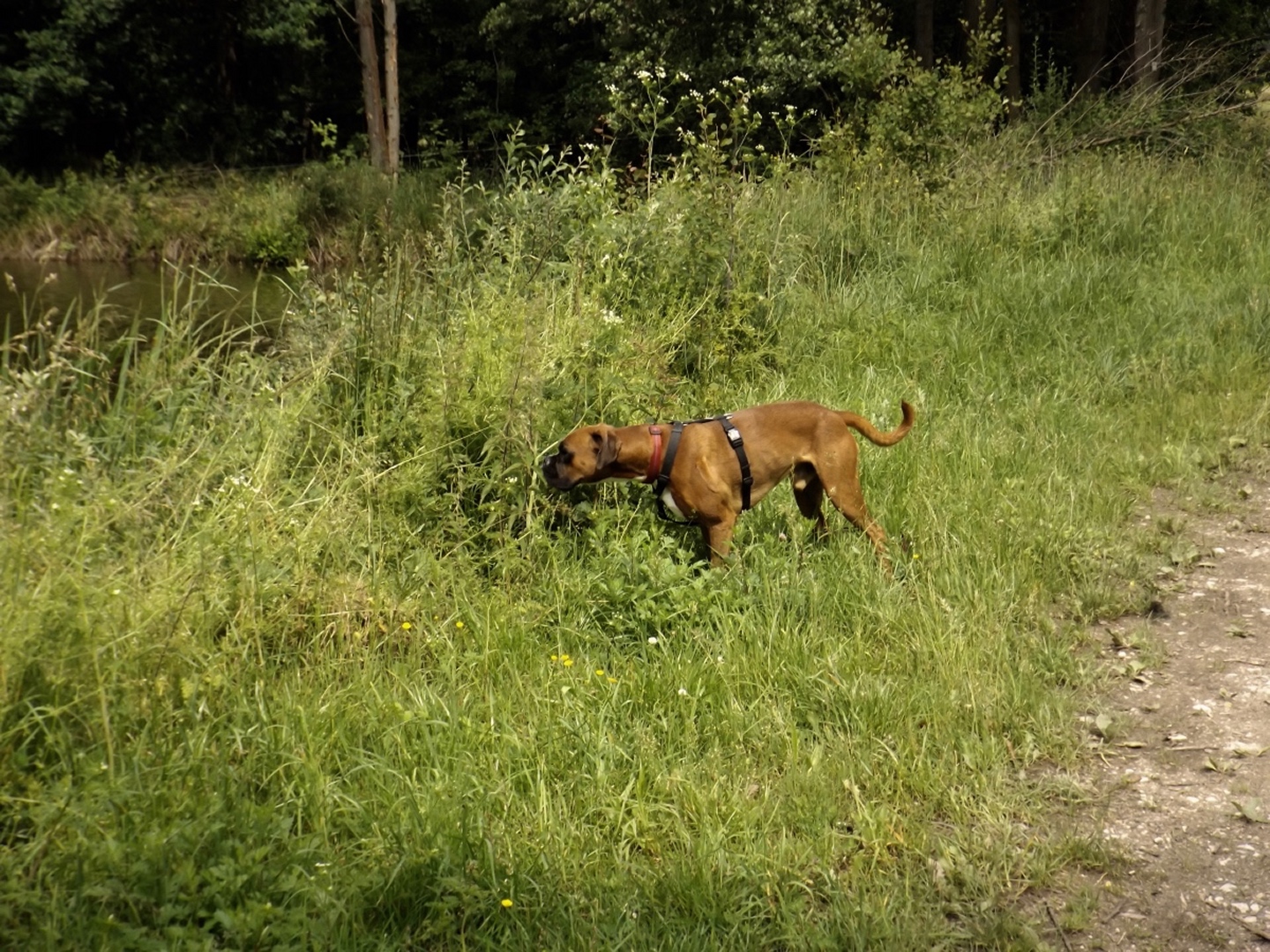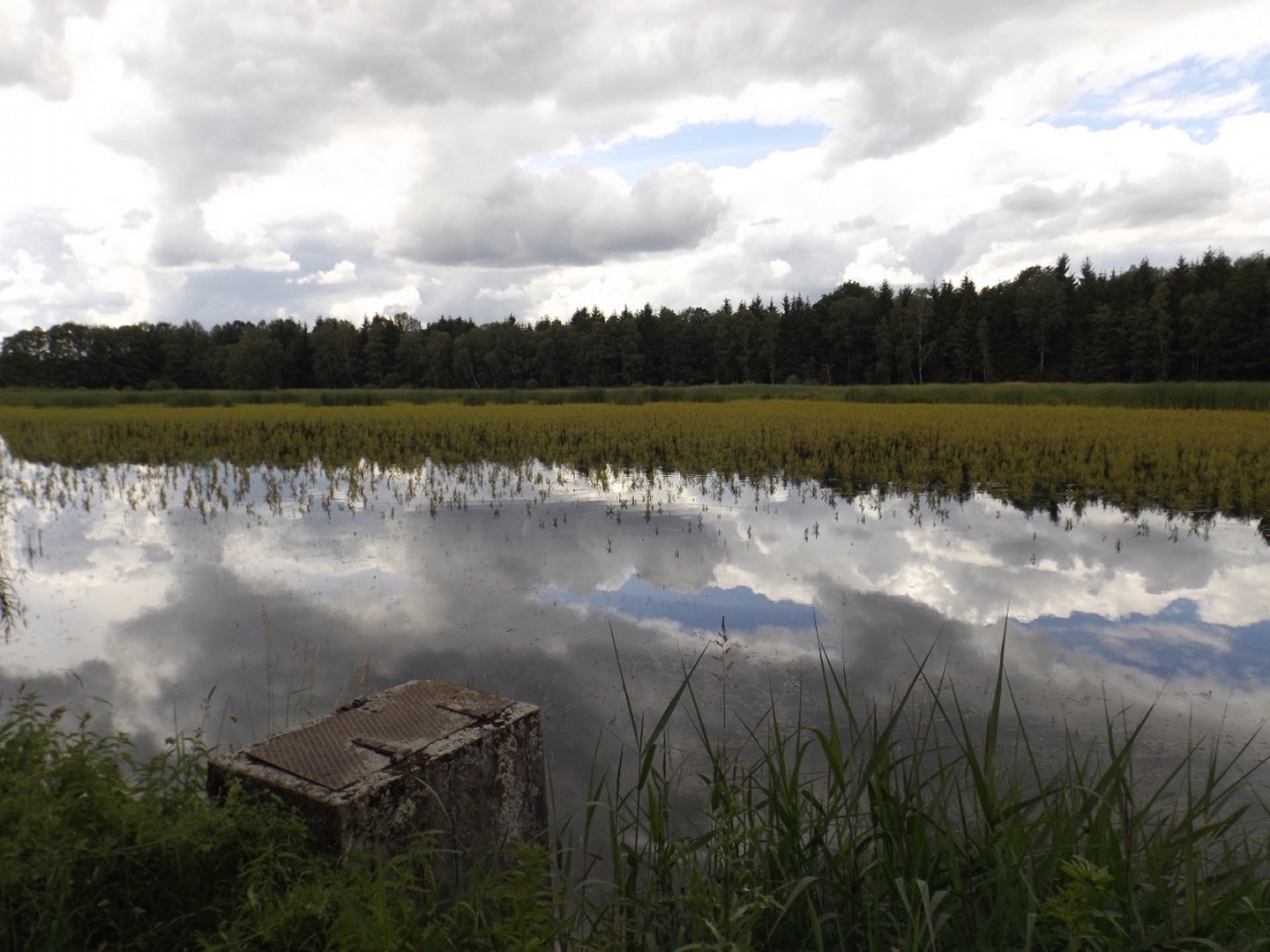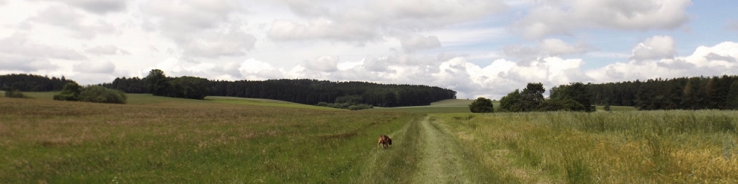 Ein weiterer Pluspunkt der IVV-Wandertage ist, dass ich Karlie mitnehmen kann, was ich natürlich tat. Das verleitete eine einheimische Gruppe, die mich schon öfter (offensichtlich immer ohne Karlie) gesehen hat, zur Frage, ob ich denn jetzt auch auf den Hund gekommen wäre. Zur Streckenführung schreibe ich nichts, weil sie aus Grafik und GPS-Track klar ersichtlich ist. Nicht ersichtlich sind die vielen Pfützen am Weg, in denen sich Karlie freudigst wälzen und erfrischen konnte, also erwähne ich sie nicht nur, sondern mache ich sie gleich zur Überschrift. Wer sich hier auch sehr wohlgefühlt hätte, wären die FAV-Rennsemmeln gewesen, denn als ich kurz vor 14 Uhr am letzten Stempelstand ankam, war dieser schon fast komplett abgebaut und man teilte mir mit, dass die Besatzung noch auf mich gewartet hatte, weil sie informiert worden war, dass eine Frau mit Hund als Letzte kommen würde. Da hatte ich zwar einen anderen Eindruck, weil die Gruppe vom zweiten Satz kurz nach der zweiten Stempelstelle den Weg Richtung Norden verlassen hatte und meiner Meinung nach hinter mir sein müsste, aber egal. Was das mit den Rennsemmeln zu tun hat? Ganz einfach, ich bin um zehn Uhr und damit eine Stunde vor Startschluss losgegangen, was beweist, mit welchem Stundenschnitt beim IVV kalkuliert wird. Trotz des Hinweises, dass jeder, der nach mir noch hier vorbeikäme, sicher das Ziel nicht mehr rechtzeitig erreichen würde, blieb ich bei meiner etwas gemächlicheren Geschwindigkeit und gönnte mir auch noch eine weitere Apfelvierterlpause. Diese erfolgte ganz nebenbei auf der Goldenen Straße, auf der die Strecke etwa drei Kilometer lang verlief, allerdings in der aus OWV-Sicht Gegenrichtung. Als Folge meiner Weigerung, mich hetzen zu lassen, wurde bei meiner Rückkehr zum Bauhof bereits alles abgebaut, was mir aber egal war, Hauptsache ich konnte noch rausfahren und die Buchberghütte ansteuern.
