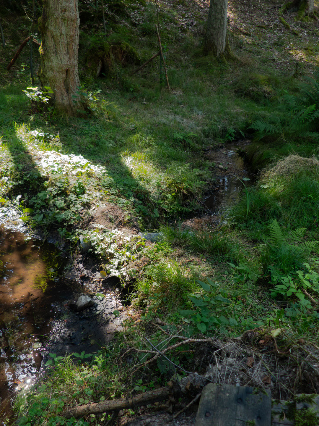 Im Steinbachtal habe ich den größten Stausee der Welt entdeckt (Vorsicht, Satire!). Er misst unglaubliche neun Quadratmeter und ist gefühlt 23 Zentimeter tief. Immer hin steht an seinem Ufer ein Banker, das ich nicht nur für ein Apfelvierterl nutzte, sondern auch für Fotos, die ich aber leider fast alle unverständlicherweise verwackelt habe. Da der Bach komplett durchfließt, ist es definitiv kein Hüle! Der Fuchs vom März war leider nicht zu sehen, dafür ist unten in Brennthal ein Pferdehof und ein Weide mit sehr neugierigen und scheulosen Kühen inclusive drei Kälbern. Bis auf die Fotos war ich brav und habe Abstand gehalten. Angst hatte ich hier erst Recht nicht, da war ja ein Elektrozaun dazwischen. Beim Mittagessen hatte ich die Qual der Wahl zwischen Schaschliktopf (also schon vom Spieß gelöst) und Kaiserschmarrn, diesen Luxus gibt es in der Eckert-Mensa nicht immer. Ist halt kein Sternerestaurant, dafür wird das Essen von der DRV gesponsert.
