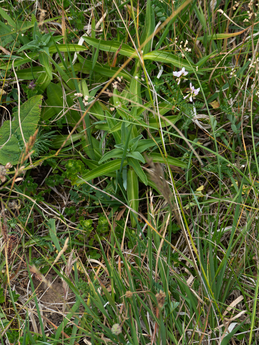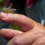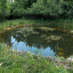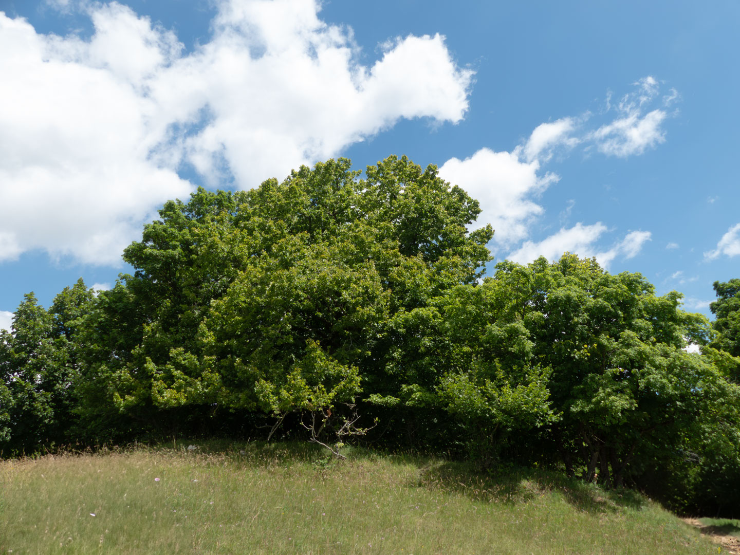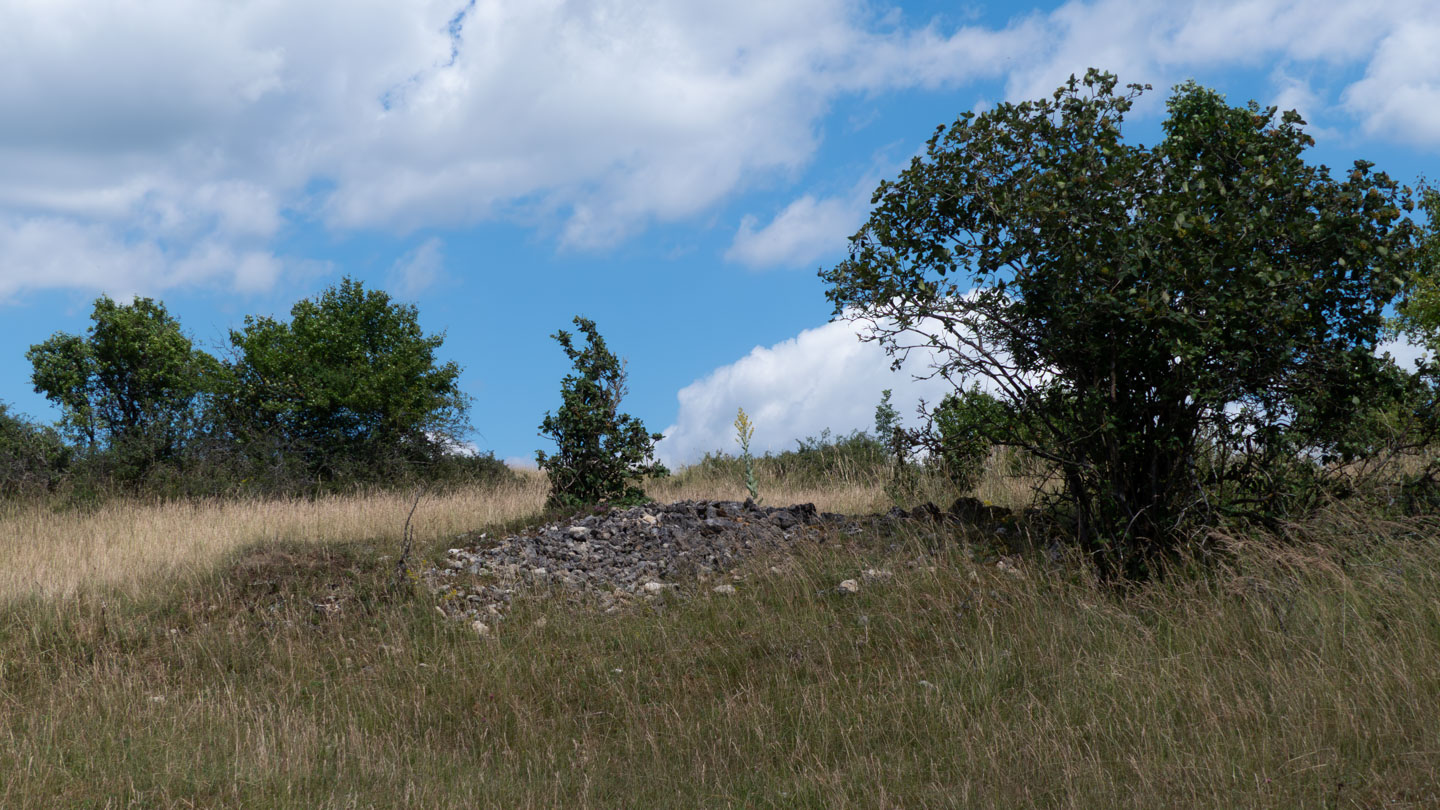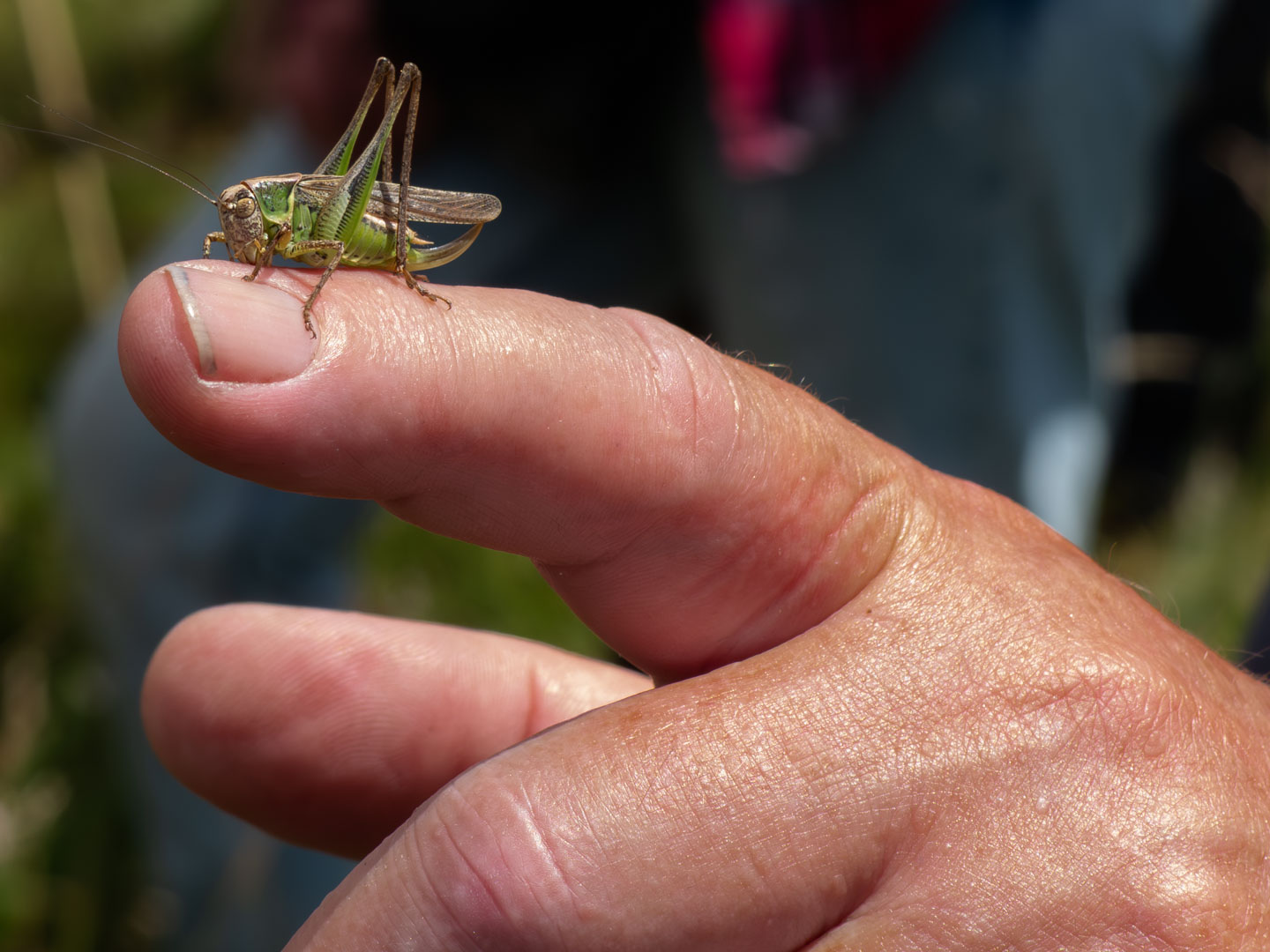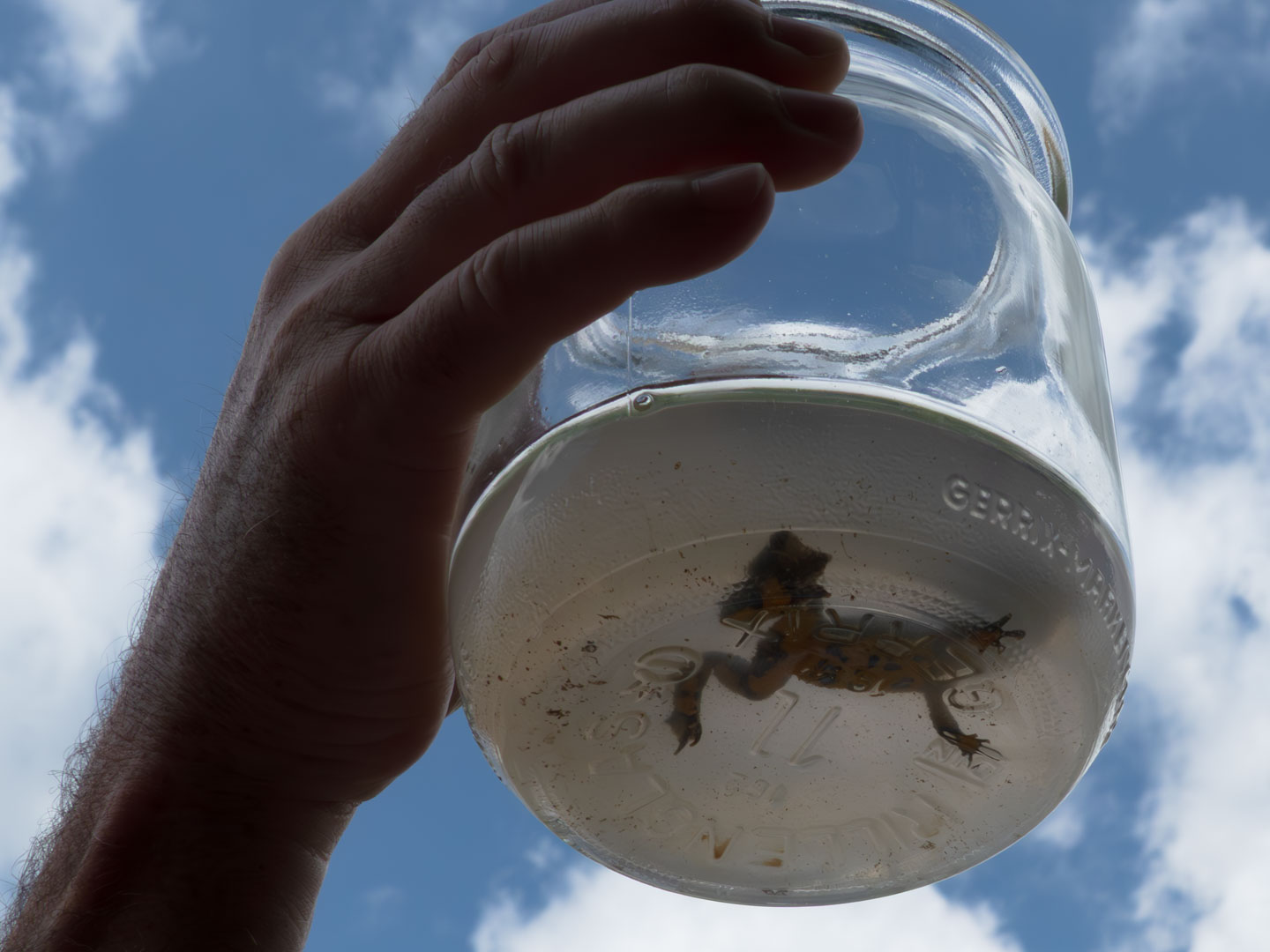 Zum Weg schreibe ich nur, dass es teilweise sehr sonnig und ungeschützt war, aber damit muss man im Jura immer rechnen. Bergheim zählte mal fast zwanzig Häuser und wurde schon bei der ersten Einrichtung des Übungsplatzes 1938 durch die Wehrmacht abgesiedelt. Die Kirche blieb stehen und wurde irgendwann von den Fledermäusen in Beschlag genommen. Kann sein, dass ich da etwas verkehrt verstanden habe und es ein bisserl anders passiert ist. Jedenfalls sind jetzt Fledermäuse drin und das wurde bei der Sanierung auch berücksichtigt. Auch der Rest der Runde war sehr stark auf die Besonderheiten der Natur ausgerichtet. So bekamen wir zu hören, wie arg die Kiefern in Mitleidenschaft gezogen werden und was man dagegen zu tun gedenkt. Oder wie viele Pflanzen es in ganz Bayern nur in diesem Bereich gibt. Oder auch Tiere. Einige dieser seltenen Dinge bekamen wir auch gezeigt, zum Beispiel einen Enzian, auf dessen Blättern eine Schmetterlingsart ihre Eier ablegt, oder eine Gelbbauchunke.