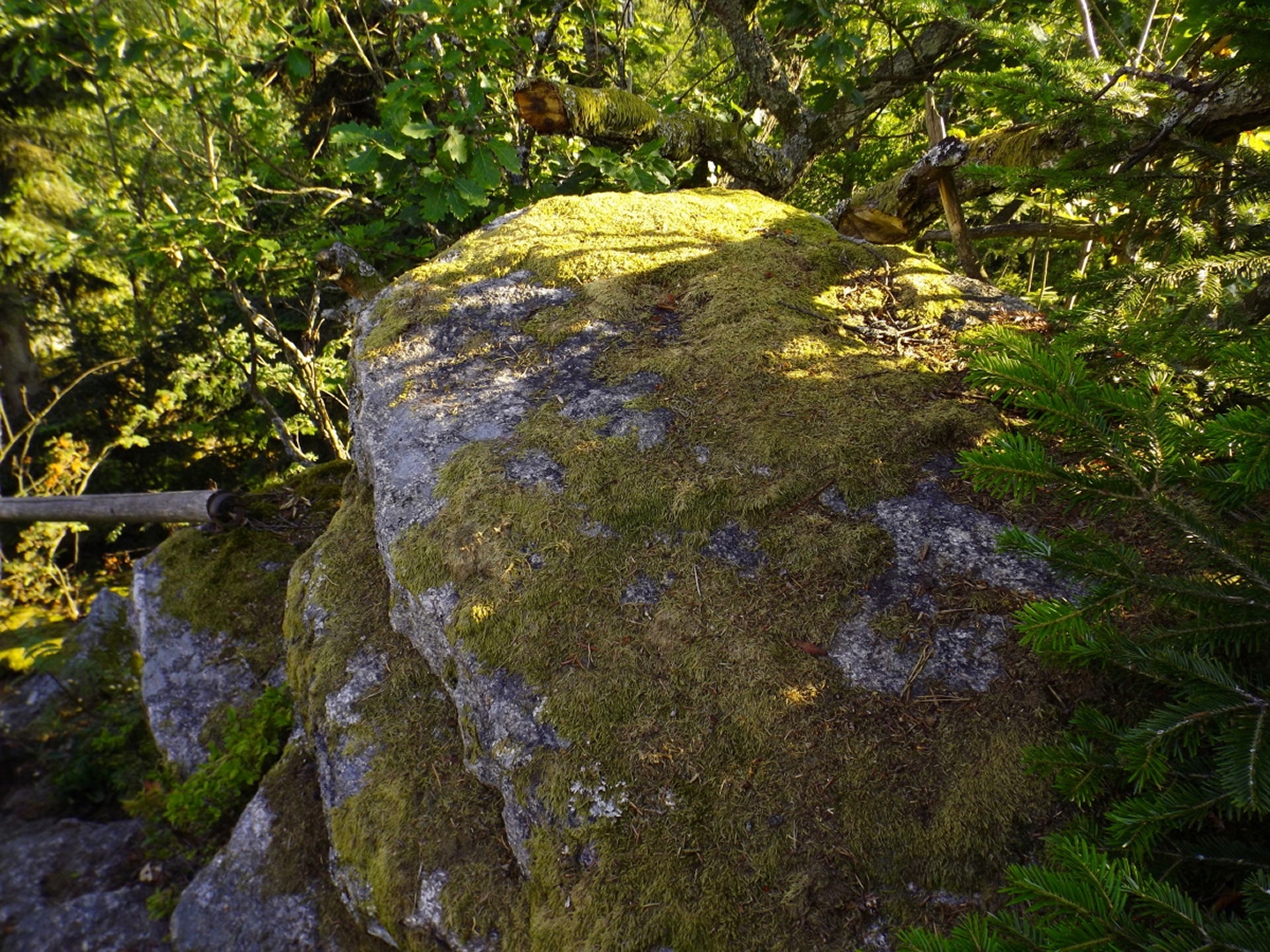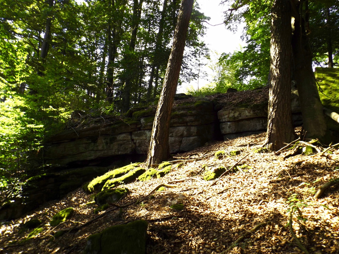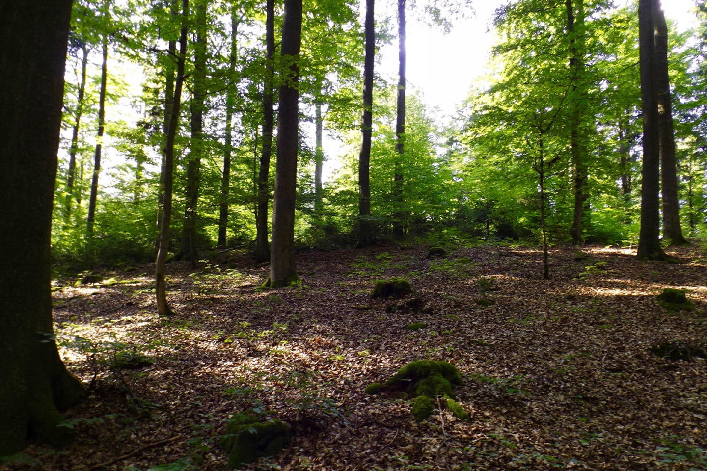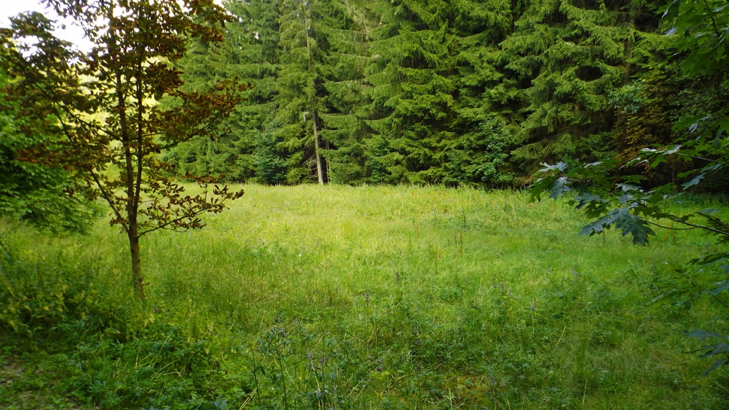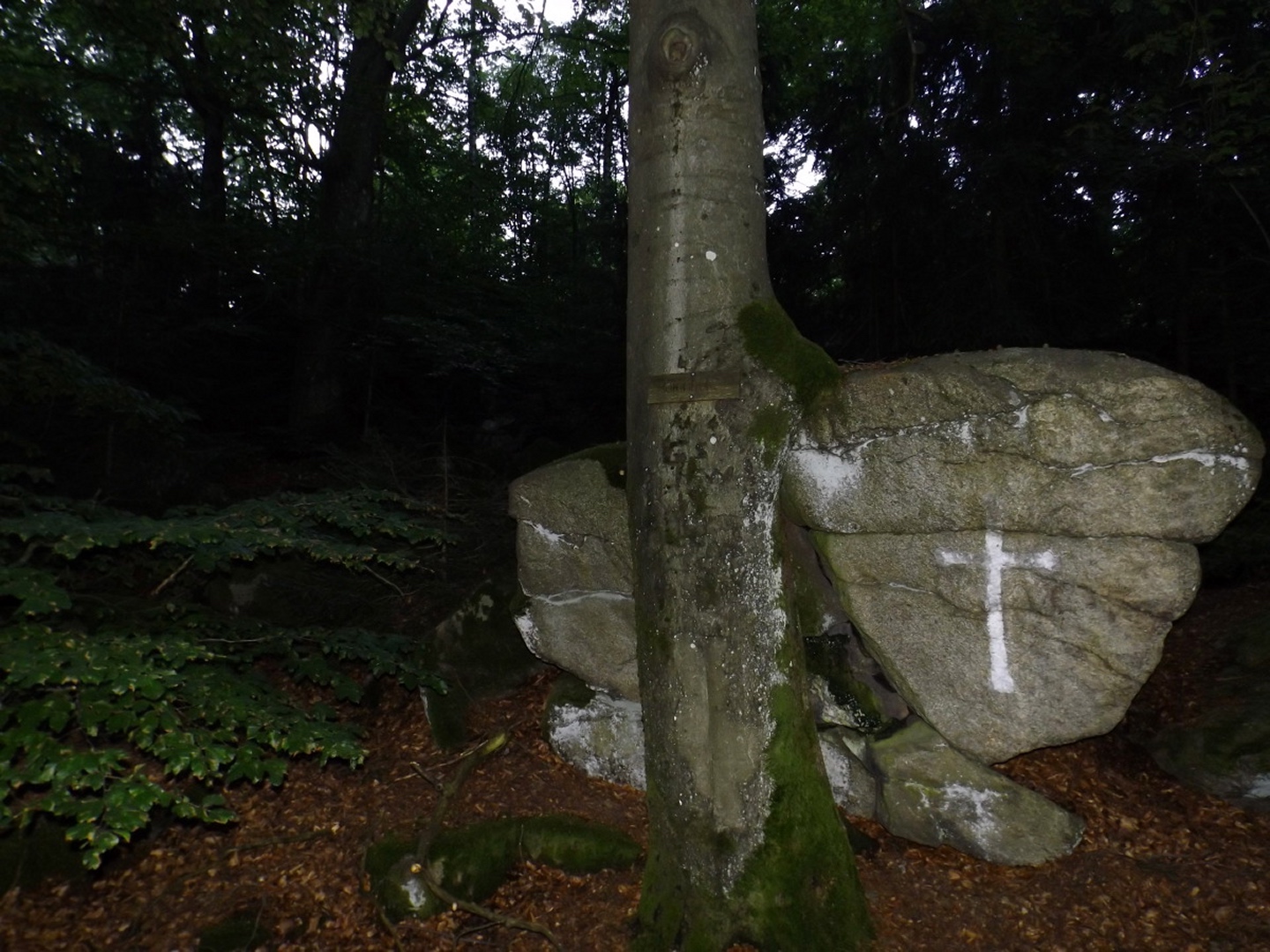 Die Wahl fiel auf Stockarn am Eixendorfer See, weil es im Vergleich mit Thanstein ein paar Kilometer weniger Anfahrt bedeutete und mir außerdem die Option offenhielt, neben dem Unteren Eibenstein, der auch von Thanstein aus gut erreichbar ist, noch den Rotherberg mit einzubauen. Die offene Frage war hierbei die Gestrüppkampfklasse, die sich vor Ort entscheiden würde. Ich stellte mein Auto also um 16 Uhr in Stockarn an einem schattigen Fleckerl auf der Dorfstraße ab und überquerte sogleich die gefährlichste Stelle der Runde, die Staatsstraße nach Rötz. Zwei beschilderte Abzweigungen nach links ließ ich aus und wählte stattdessen kurz nach der zweiten einen Harvesterweg steil nach oben. Dieser verliert sich bald im Wald, quert zwei quer zum Hang verlaufende Fahrwege, deren Unterseite etwas Kampf mit herumliegendem Geäst fordert, aber sonst steigt der jetzt weglose Aufstieg nicht wirklich nennenswert in die GKKs ein. So war ich nach gerade mal einer halben Stunde am ersten Gipfel, dem Rotherberg, und ärgerte mich, dass ich vor der Abfahrt nicht nachgeschaut hatte, ob meine Mutter die zweite Apfelhälfte vom Frühstück gegessen hatte oder sie mir als Wegzehrung zur Verfügung stand. Vom Gipfel war eine weitere Harvesterspur nach Westen erkennbar, die aber im oberen Teil nicht mit kurzer Hose begehbar ist, es sei denn man ist immun gegen Brennesseln. Man kann aber problemlos oberhalb parallel absteigen und auch die Brennesseln hören irgendwo auf, so dass der zweite Teil der Spur problemlos bis zur Forststraße zur Taubenwiese begehbar ist, die an einem Mobilfunkmasten erreicht wird. Hier geht es rechts weiter, vorbei an der Taubenwiese, eine nicht markierte Abzweigung wird links liegen gelassen, bis in einer Linkskurve ein breiter, aber nicht geschotterter Forstweg rechts hinaufzieht und auch diverse Wanderwege diesem entlang markiert sind. Der Weg ist nicht lang, vielleicht 150 Meter und mündet in eine etwas höher parallel verlaufende Forststraße, der ich nach links folgte. In einer Doppelkurve ist auf der linken Seite ein kleiner Gupf zu erkennen, der kaum zehn Meter über die Forststraße hinausragt. Das ist der Untere Eibenstein, der ebenfalls zunächst über einen klar erkennbaren Pfad, dann weglos in zwei Minuten erreicht wird. Ohne wirklichen Aufenthalt verließ ich den Gupf nach Osten, wobei der von oben erkennbare Ausgangspfad nicht der optimale Weg ist (GKK 2 im Mündungsbereich). Besser wäre es, auf der Nordseite einem Fahrweg zu folgen, der allerdings vom Gipfel aus nicht klar auszumachen ist. Kurze Zeit später muss an einer Abzweigung rechts abgebogen werden, wobei fast alle Wanderwege in diese Richtung beschildert sind. In diesem Bereich empfiehlt sich, dem Engelbildweg zu folgen, denn das Engelbild ist der nächste Wegpunkt, an dem es dank Goldsteig sogar ausnahmsweise ein Hinweisschild auf Orte gibt. Nun ist entgegen der scheinbaren Logik Thanstein als Richtung angesagt, nicht die Sattelhütte, an der ich später auch noch vorbeikam, denn der markierte Weg umrundet den Oberen Eibenstein, anstatt ihn zu überschreiten. Um den Weg, der dies tut, zu erreichen, muss bei der nächsten Forststraßenkreuzung, aber nicht schon direkt am Engelbild, rechts abgebogen werden. Ein paar Minuten später kommt von links die Abkürzung aus Thanstein aus dem Wald, ab sofort geht es auf dem Goldsteig und Main-Donau-Weg weiter. Dieser verlässt irgendwann die Forststraßen in den Wald hinein, biegt bei einer Nordic-Walking-Lehrtafel noch einmal rechts ab und steuert direkt über einen höhergelegenen Sattel auf die Sattelhütte zu. An diesem Sattel zweigt dann der in der Einleitung erwähnte Pfad zum Oberen Eibenstein ab. 460 Meter später stand ich vor dem kleinen Gipfelkreuz des höchsten Berges in dieser Gruppe. Jetzt wäre wieder ein Stück Apfel gut gewesen, aber ich hatte ja nicht nachgeschaut. Also genoss ich ein paar Minuten lang die Ruhe und Einsamkeit sowie die nicht vorhandene Rundumsicht, bevor ich auf dem Pfad zum Sattel zurückkehrte und dort weiter zur Sattelhütte abstieg. An dieser ging ich dieses Mal ohne Pause vorbei, wieder hinauf zur Steinernen Wand und weiter zur Burg. Den Weg über die Steinerne Wand habe ich schon zwei Mal beschrieben, dem ist eigentlich nicht viel hinzuzufügen. Eigentlich sollte ich auch einmal die bequeme Umgehung gehen und beschreiben, aber das war mir für diese Tour zu langweilig. Auf der Burg angekommen, stieg ich gleich einmal die 35 Meter auf den Bergfried hinauf und genoss das Panorama. Anschließend kehrte ich zum Hüttenabend ein und blieb dank der netten Tischgesellschaft länger sitzen als geplant. Aus diesem Grund gibt es auch vom restlichen Wegverlauf kaum mehr Fotos, beim Wiederaufbruch um 20.15 Uhr waren die Lichtverhältnisse einfach nicht mehr gut genug für Bilder ohne Stativ. Ich ließ mich aber nicht davon abhalten, noch den Totentruhenweg zu gehen, der vom Burghof aus direkt Richtung Bauhof führt. Nach zehn Minuten erreichte ich die Einmündung in den bereits bekannten Bergpfad, der südlich um die Burg herumführt. Diesen ging ich auch zurück bis kurz vor dem Burgtor, wo ein unmarkierter Pfad hinunter Richtung Staatsstraße und Schellhof abzweigt. Dieser wies deutliche MTB-Spuren auf und war deswegen auch im schwächer werdenden Tageslicht gut erkennbar. Nach knapp einem Kilometer mündet der Pfad in eine Forststraße, der man aber in keine Richtung folgen sollte, weil die nächsten Abzweigungen kurz vor Bauhof bzw. kurz vor der Sattelhütte sind. Vielmehr ging ich weglos durch kaum Gestrüpp geradewegs bergab, bis ich auf einer weiteren Forststraße herauskam, der ich nach rechts (Westen) folgte. An deren Ende 300 Meter weiter geht es entgegen der scheinbaren Logik nach links bis zur Staatsstraße. Ab hier folgte ich der alten Staatsstraße, die zunächst einen großen Bogen um ein kleines Tal macht, dann die neue Staatsstraße unterquert und ihr bis Stockarn mehr oder weniger parallel folgt. Ich durfte noch z
