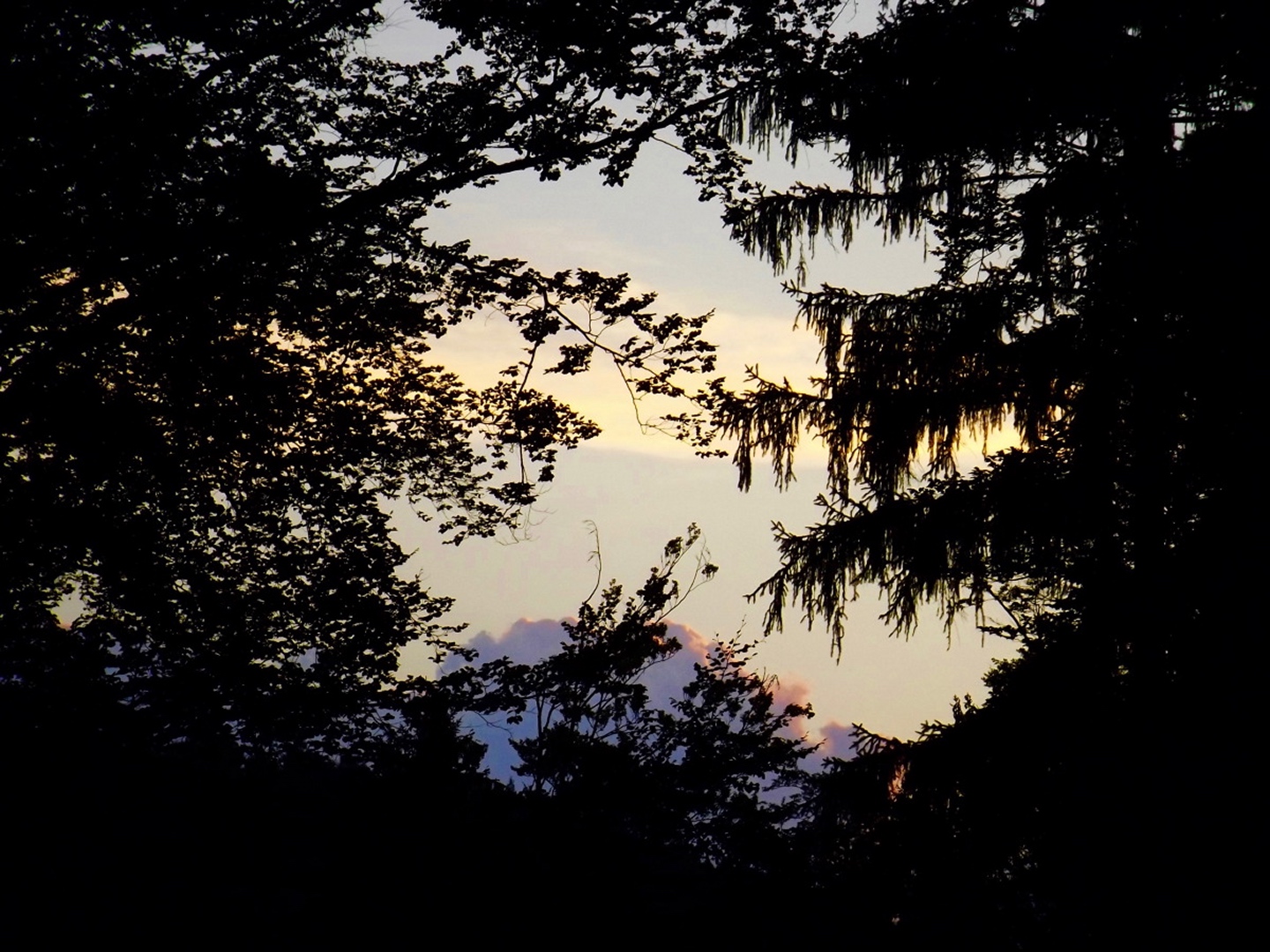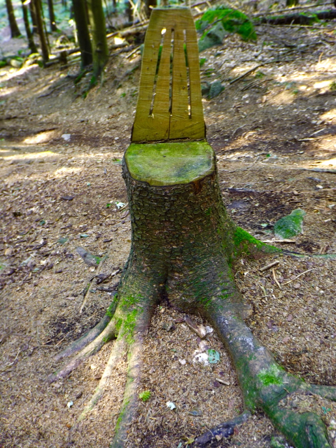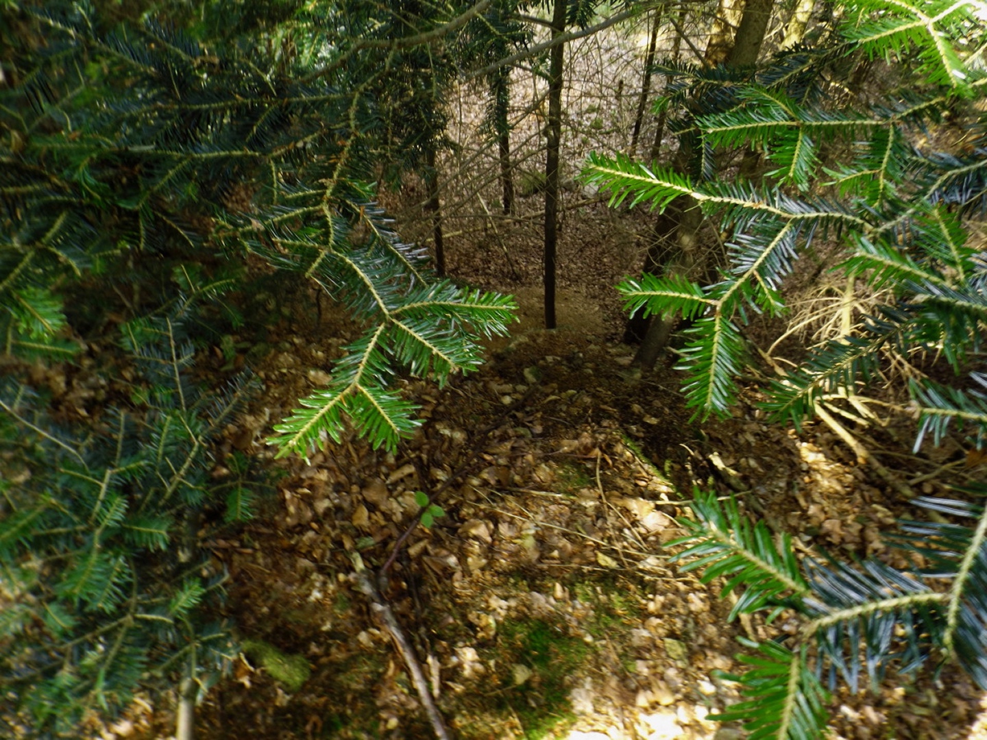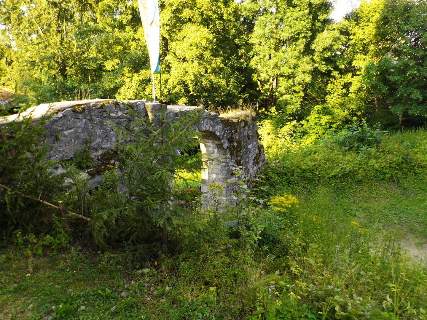 Die Wahl fiel auf Stockarn am Eixendorfer See, weil es im Vergleich mit Thanstein ein paar Kilometer weniger Anfahrt bedeutete und mir außerdem die Option offenhielt, neben dem Unteren Eibenstein, der auch von Thanstein aus gut erreichbar ist, noch den Rotherberg mit einzubauen. Die offene Frage war hierbei die Gestrüppkampfklasse, die sich vor Ort entscheiden würde. Ich stellte mein Auto also um 16 Uhr in Stockarn an einem schattigen Fleckerl auf der Dorfstraße ab und überquerte sogleich die gefährlichste Stelle der Runde, die Staatsstraße nach Rötz. Zwei beschilderte Abzweigungen nach links ließ ich aus und wählte stattdessen kurz nach der zweiten einen Harvesterweg steil nach oben. Dieser verliert sich bald im Wald, quert zwei quer zum Hang verlaufende Fahrwege, deren Unterseite etwas Kampf mit herumliegendem Geäst fordert, aber sonst steigt der jetzt weglose Aufstieg nicht wirklich nennenswert in die GKKs ein. So war ich nach gerade mal einer halben Stunde am ersten Gipfel, dem Rotherberg, und ärgerte mich, dass ich vor der Abfahrt nicht nachgeschaut hatte, ob meine Mutter die zweite Apfelhälfte vom Frühstück gegessen hatte oder sie mir als Wegzehrung zur Verfügung stand. Vom Gipfel war eine weitere Harvesterspur nach Westen erkennbar, die aber im oberen Teil nicht mit kurzer Hose begehbar ist, es sei denn man ist immun gegen Brennesseln. Man kann aber problemlos oberhalb parallel absteigen und auch die Brennesseln hören irgendwo auf, so dass der zweite Teil der Spur problemlos bis zur Forststraße zur Taubenwiese begehbar ist, die an einem Mobilfunkmasten erreicht wird. Hier geht es rechts weiter, vorbei an der Taubenwiese, eine nicht markierte Abzweigung wird links liegen gelassen, bis in einer Linkskurve ein breiter, aber nicht geschotterter Forstweg rechts hinaufzieht und auch diverse Wanderwege diesem entlang markiert sind. Der Weg ist nicht lang, vielleicht 150 Meter und mündet in eine etwas höher parallel verlaufende Forststraße, der ich nach links folgte. In einer Doppelkurve ist auf der linken Seite ein kleiner Gupf zu erkennen, der kaum zehn Meter über die Forststraße hinausragt. Das ist der Untere Eibenstein, der ebenfalls zunächst über einen klar erkennbaren Pfad, dann weglos in zwei Minuten erreicht wird. Ohne wirklichen Aufenthalt verließ ich den Gupf nach Osten, wobei der von oben erkennbare Ausgangspfad nicht der optimale Weg ist (GKK 2 im Mündungsbereich). Besser wäre es, auf der Nordseite einem Fahrweg zu folgen, der allerdings vom Gipfel aus nicht klar auszumachen ist. Kurze Zeit später muss an einer Abzweigung rechts abgebogen werden, wobei fast alle Wanderwege in diese Richtung beschildert sind. In diesem Bereich empfiehlt sich, dem Engelbildweg zu folgen, denn das Engelbild ist der nächste Wegpunkt, an dem es dank Goldsteig sogar ausnahmsweise ein Hinweisschild auf Orte gibt. Nun ist entgegen der scheinbaren Logik Thanstein als Richtung angesagt, nicht die Sattelhütte, an der ich später auch noch vorbeikam, denn der markierte Weg umrundet den Oberen Eibenstein, anstatt ihn zu überschreiten. Um den Weg, der dies tut, zu erreichen, muss bei der nächsten Forststraßenkreuzung, aber nicht schon direkt am Engelbild, rechts abgebogen werden. Ein paar Minuten später kommt von links die Abkürzung aus Thanstein aus dem Wald, ab sofort geht es auf dem Goldsteig und Main-Donau-Weg weiter. Dieser verlässt irgendwann die Forststraßen in den Wald hinein, biegt bei einer Nordic-Walking-Lehrtafel noch einmal rechts ab und steuert direkt über einen höhergelegenen Sattel auf die Sattelhütte zu. An diesem Sattel zweigt dann der in der Einleitung erwähnte Pfad zum Oberen Eibenstein ab. 460 Meter später stand ich vor dem kleinen Gipfelkreuz des höchsten Berges in dieser Gruppe. Jetzt wäre wieder ein Stück Apfel gut gewesen, aber ich hatte ja nicht nachgeschaut. Also genoss ich ein paar Minuten lang die Ruhe und Einsamkeit sowie die nicht vorhandene Rundumsicht, bevor ich auf dem Pfad zum Sattel zurückkehrte und dort weiter zur Sattelhütte abstieg. An dieser ging ich dieses Mal ohne Pause vorbei, wieder hinauf zur Steinernen Wand und weiter zur Burg. Den Weg über die Steinerne Wand habe ich schon zwei Mal beschrieben, dem ist eigentlich nicht viel hinzuzufügen. Eigentlich sollte ich auch einmal die bequeme Umgehung gehen und beschreiben, aber das war mir für diese Tour zu langweilig. Auf der Burg angekommen, stieg ich gleich einmal die 35 Meter auf den Bergfried hinauf und genoss das Panorama. Anschließend kehrte ich zum Hüttenabend ein und blieb dank der netten Tischgesellschaft länger sitzen als geplant. Aus diesem Grund gibt es auch vom restlichen Wegverlauf kaum mehr Fotos, beim Wiederaufbruch um 20.15 Uhr waren die Lichtverhältnisse einfach nicht mehr gut genug für Bilder ohne Stativ. Ich ließ mich aber nicht davon abhalten, noch den Totentruhenweg zu gehen, der vom Burghof aus direkt Richtung Bauhof führt. Nach zehn Minuten erreichte ich die Einmündung in den bereits bekannten Bergpfad, der südlich um die Burg herumführt. Diesen ging ich auch zurück bis kurz vor dem Burgtor, wo ein unmarkierter Pfad hinunter Richtung Staatsstraße und Schellhof abzweigt. Dieser wies deutliche MTB-Spuren auf und war deswegen auch im schwächer werdenden Tageslicht gut erkennbar. Nach knapp einem Kilometer mündet der Pfad in eine Forststraße, der man aber in keine Richtung folgen sollte, weil die nächsten Abzweigungen kurz vor Bauhof bzw. kurz vor der Sattelhütte sind. Vielmehr ging ich weglos durch kaum Gestrüpp geradewegs bergab, bis ich auf einer weiteren Forststraße herauskam, der ich nach rechts (Westen) folgte. An deren Ende 300 Meter weiter geht es entgegen der scheinbaren Logik nach links bis zur Staatsstraße. Ab hier folgte ich der alten Staatsstraße, die zunächst einen großen Bogen um ein kleines Tal macht, dann die neue Staatsstraße unterquert und ihr bis Stockarn mehr oder weniger parallel folgt. Ich durfte noch z