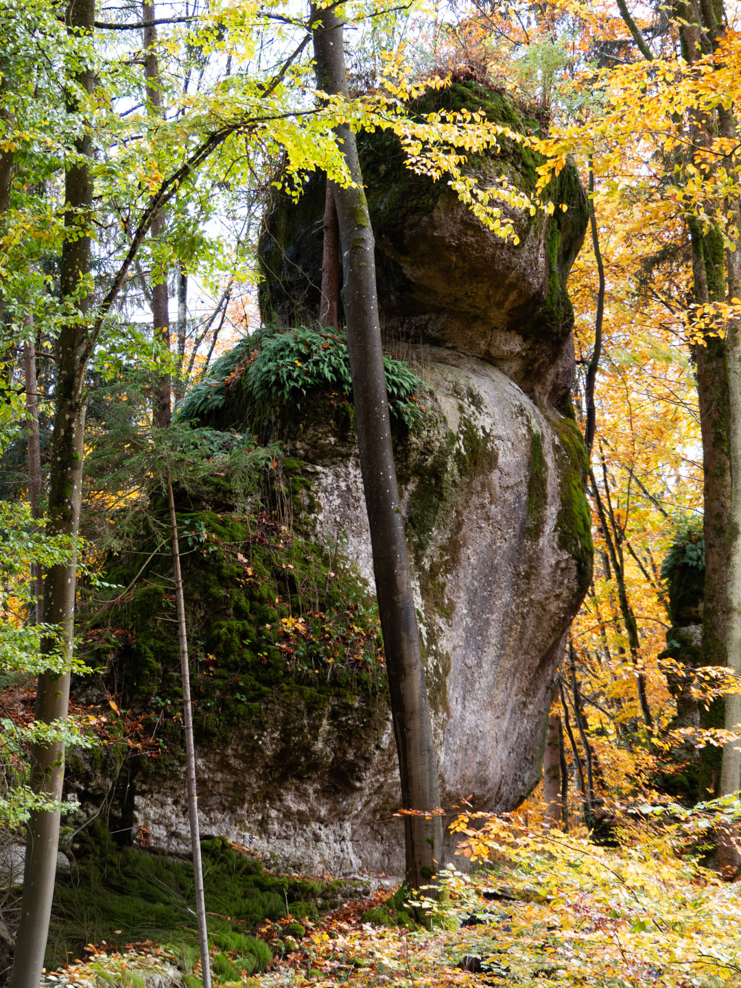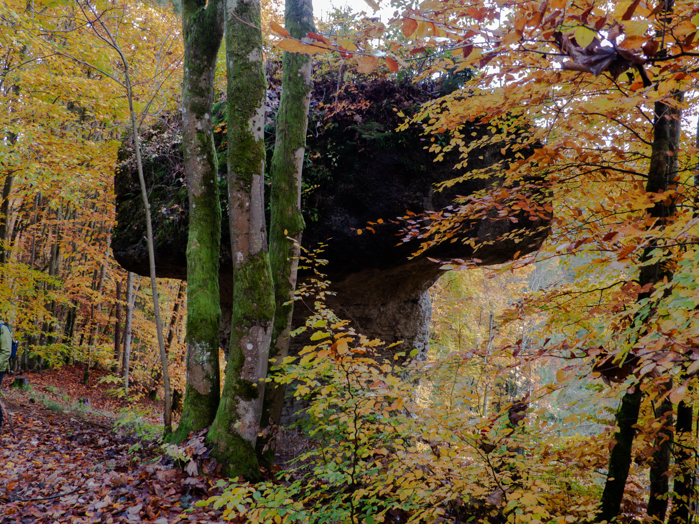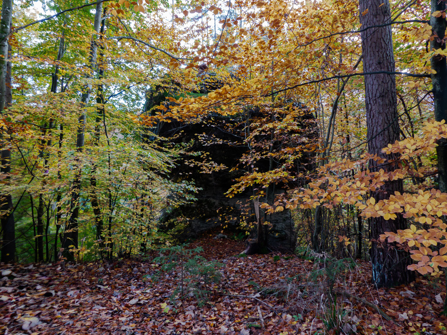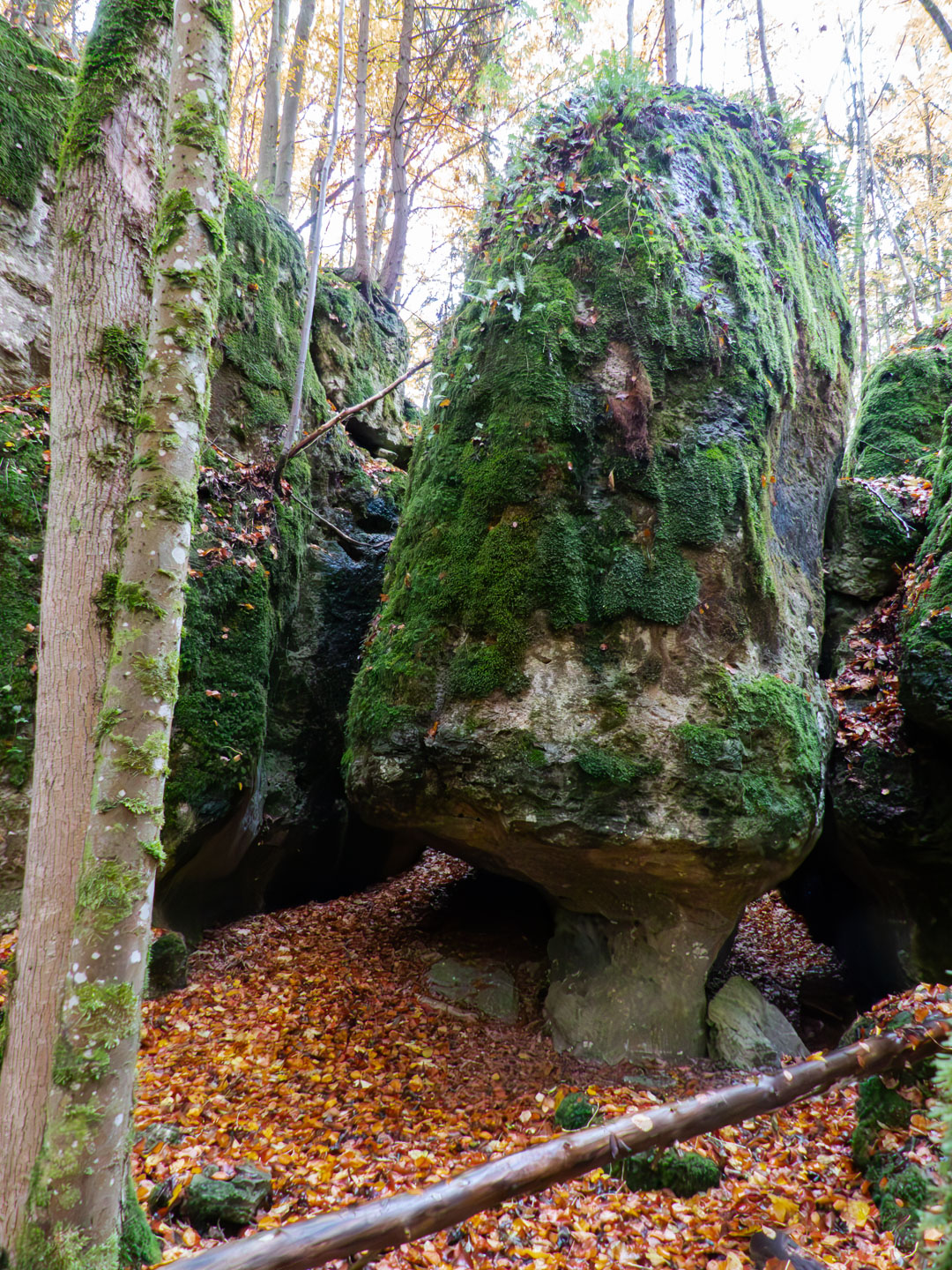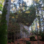 Insgesamt waren wir zu zweit aus Schwandorf und 17 Leute, darunter Gudrun, aus anderen Zweigvereinen. Das sind zwar weniger als sonst, aber für die Verhältnisse mehr als ordentlich. Da hat die Hohe Tanne halt doch gezogen. Außerdem ist das Gebiet einfach grandios, siehe frühere Berichte auf dieser Seite. Im Sackdillinger Felsenlabyrinth war es leider recht rutschig, da machten die Stöcke extrem Sinn. Wir sind aber unfallfrei durchgekommen. Was ich gar nicht mehr in Erinnerung hatte, war die Größe des Schäuferls, das kann aber daran liegen, dass ich bisher in der Hohen Tanne immer etwas Anderes gegessen habe. Jedenfalls ist es dort tatsächlich ein Schäuferl und keine ausgewachsene Schaufel, so dass ich mir vorher eine Kürbissuppe genehmigen konnte. Ich habs nicht bereut. Viel mehr mag ich jetzt gar nicht schreiben, weil sich Gudrun und ich einig waren, dass diese Runde mit kleinen Modifikationen bei besseren Lichtverhältnissen wiederholt werden muss und das ja bei zu erwartenden 350 Fotos von mir (plus 200 von Gudrun) einen weiteren Bericht geben wird. Bleibt noch der Dank an Ursa für Organisation und Führung und der Hinweis auf die Bildergalerie.